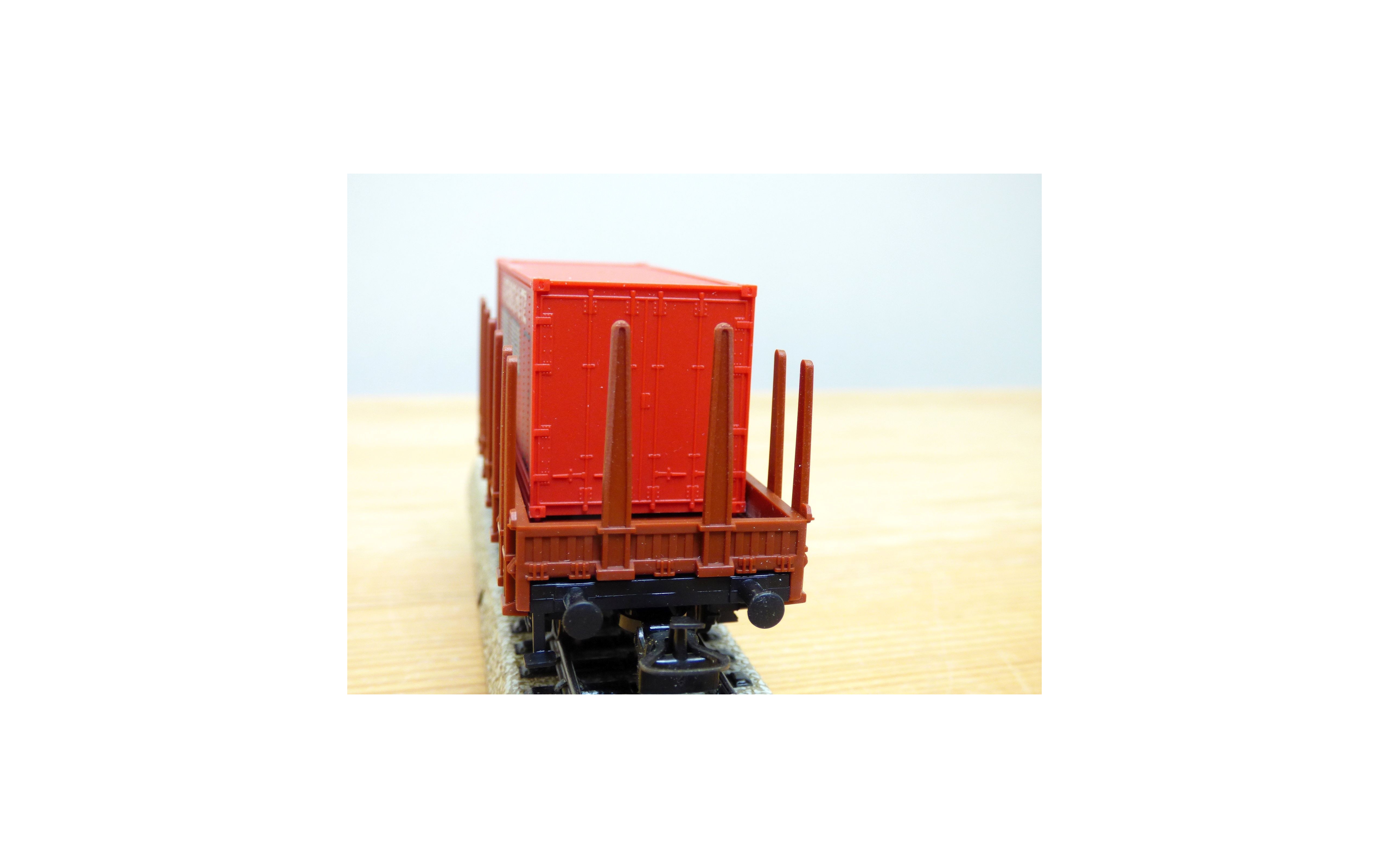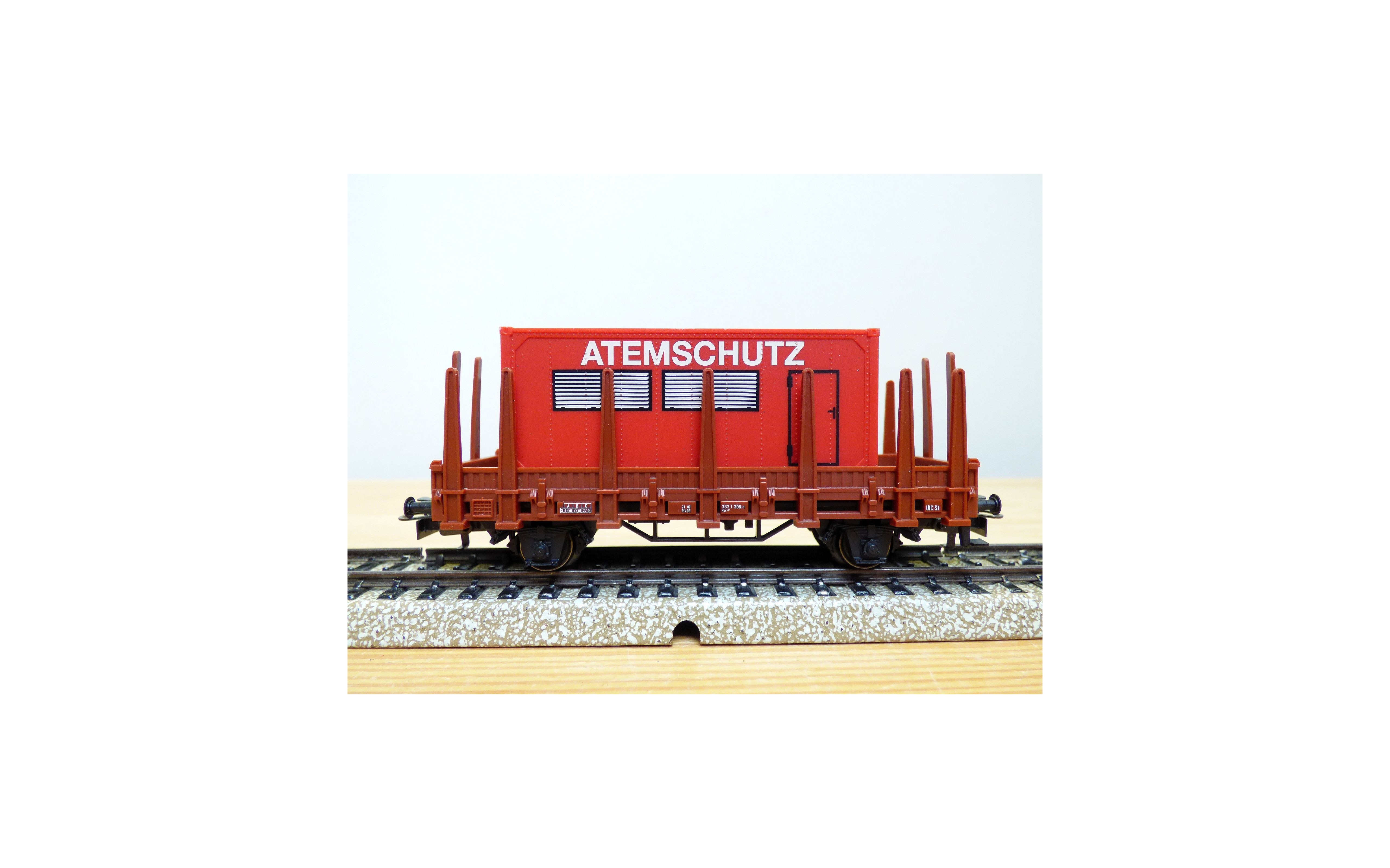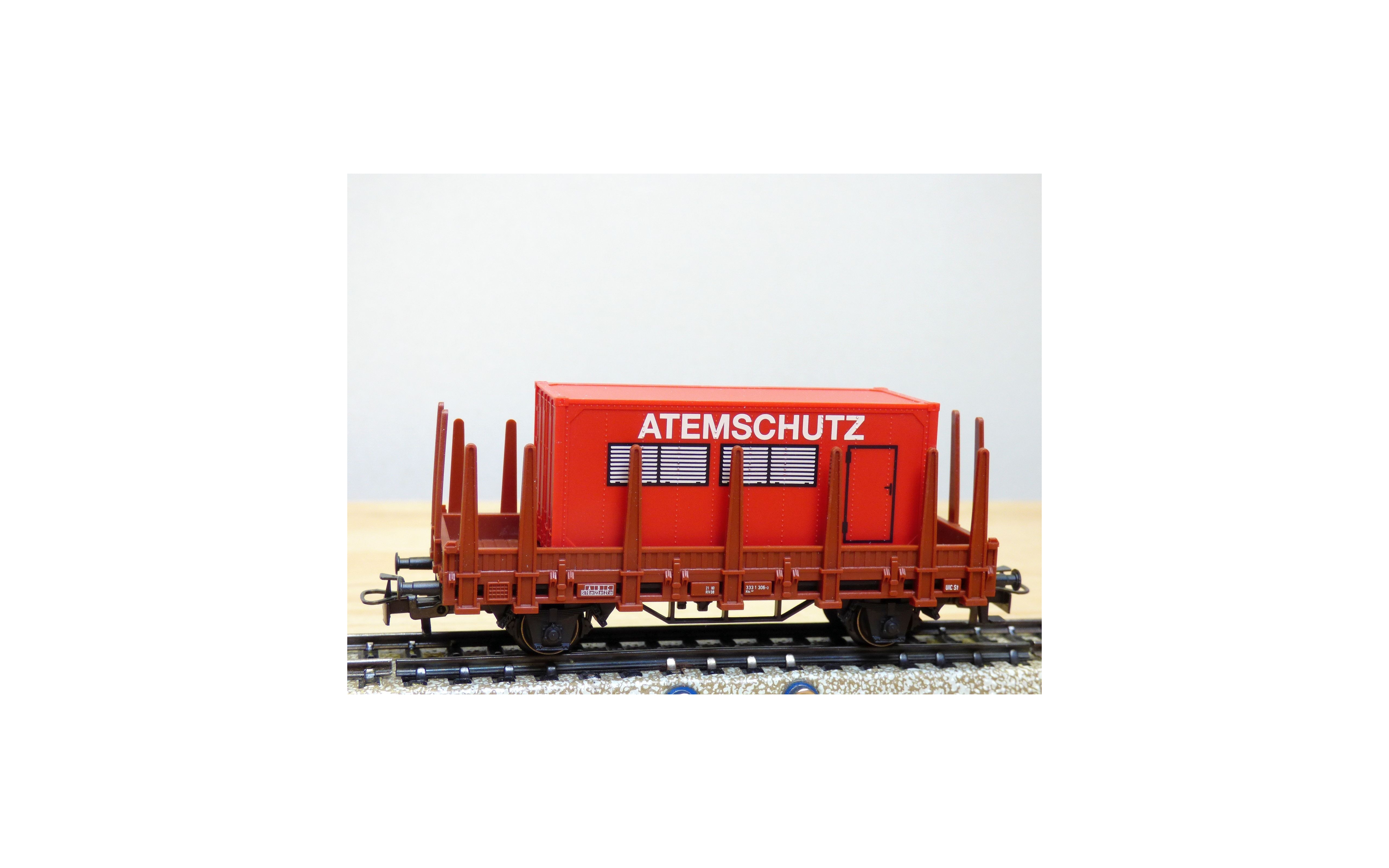 Wagon plat à ranchers à 2 essieux type Kbs 890 des chemins de fer allemands ( DB), livrée marron chargé d' un conteneur amovible avec marquages ATEMSCHUTZ, boîte d'origine " coins piquants ".