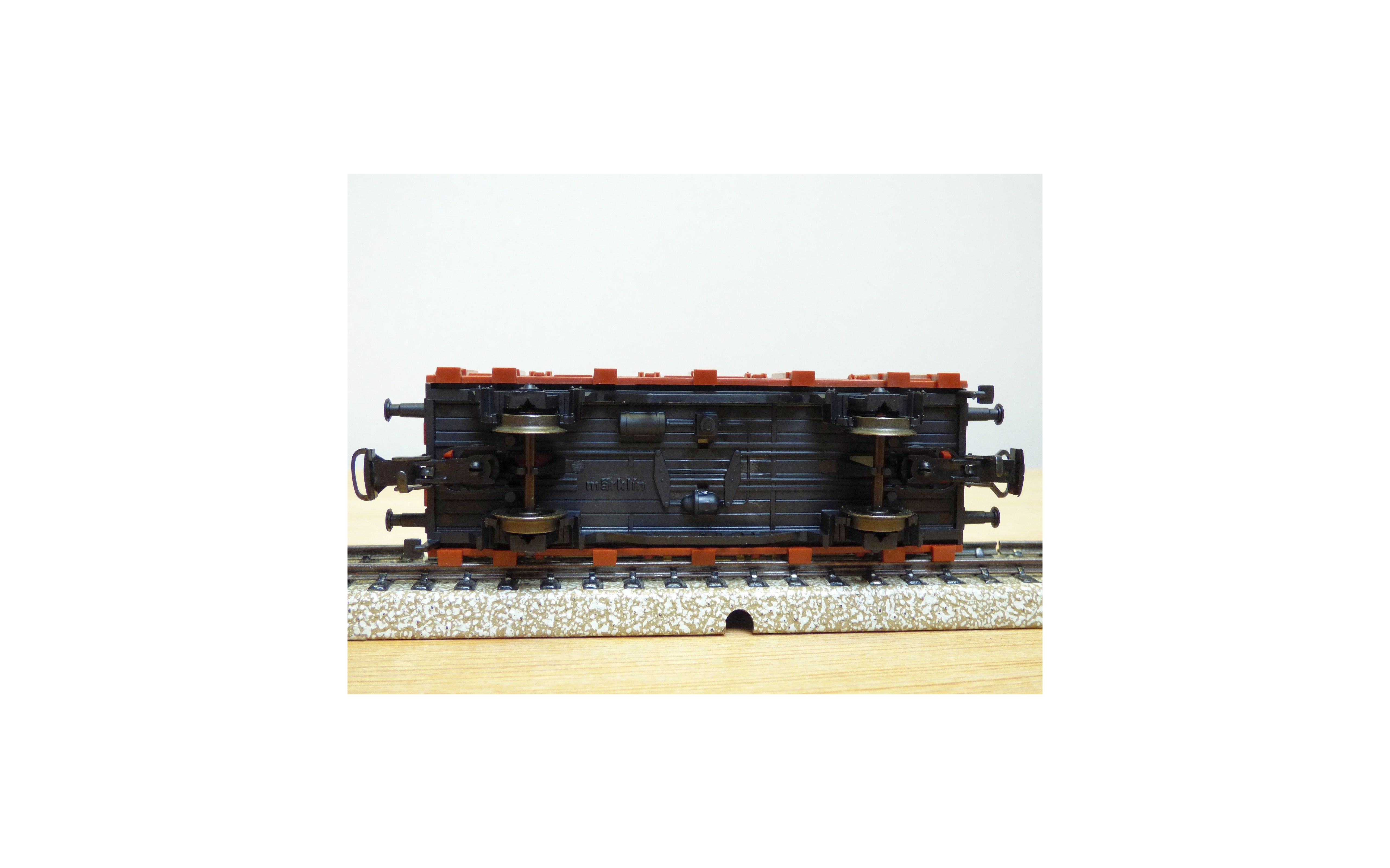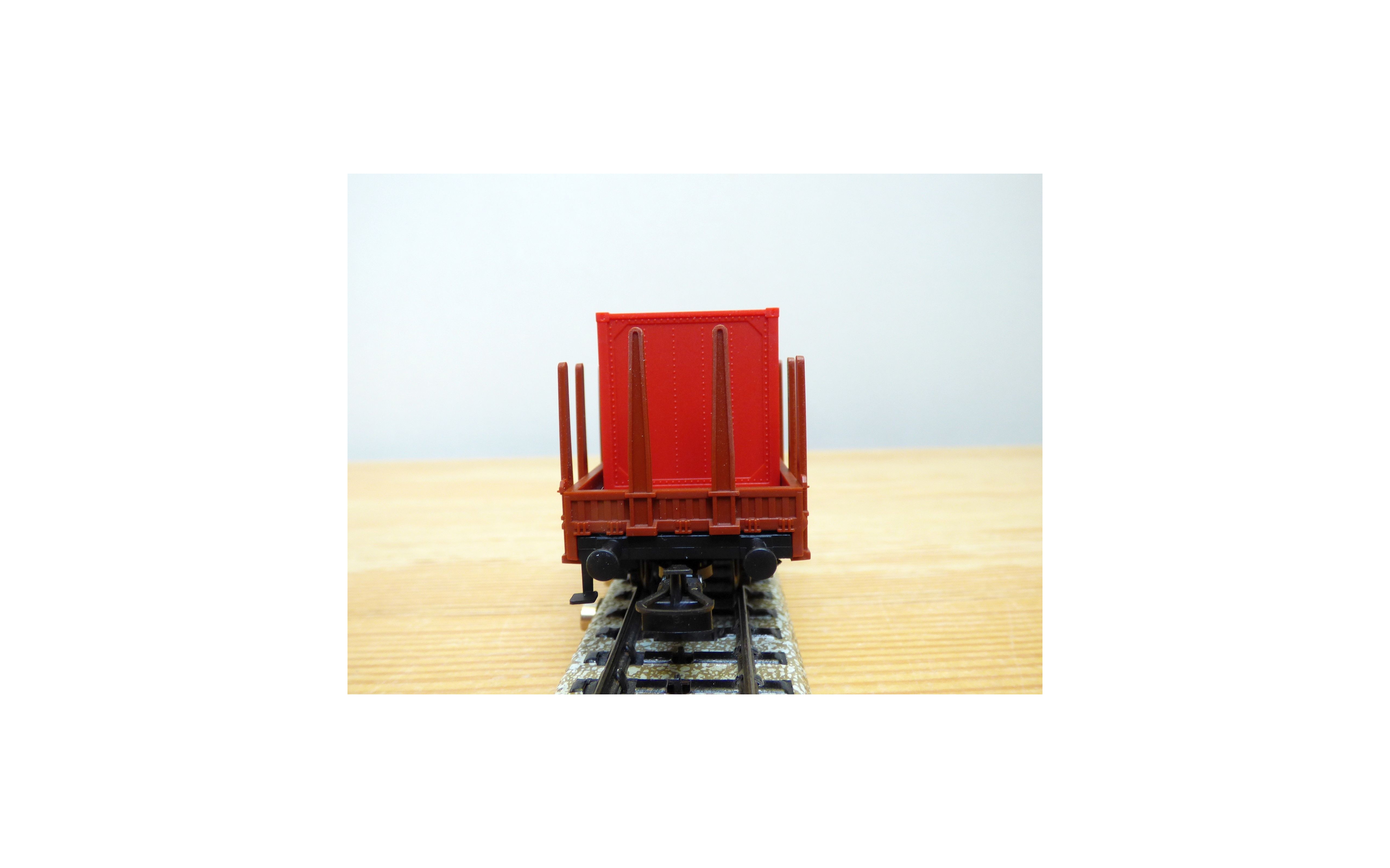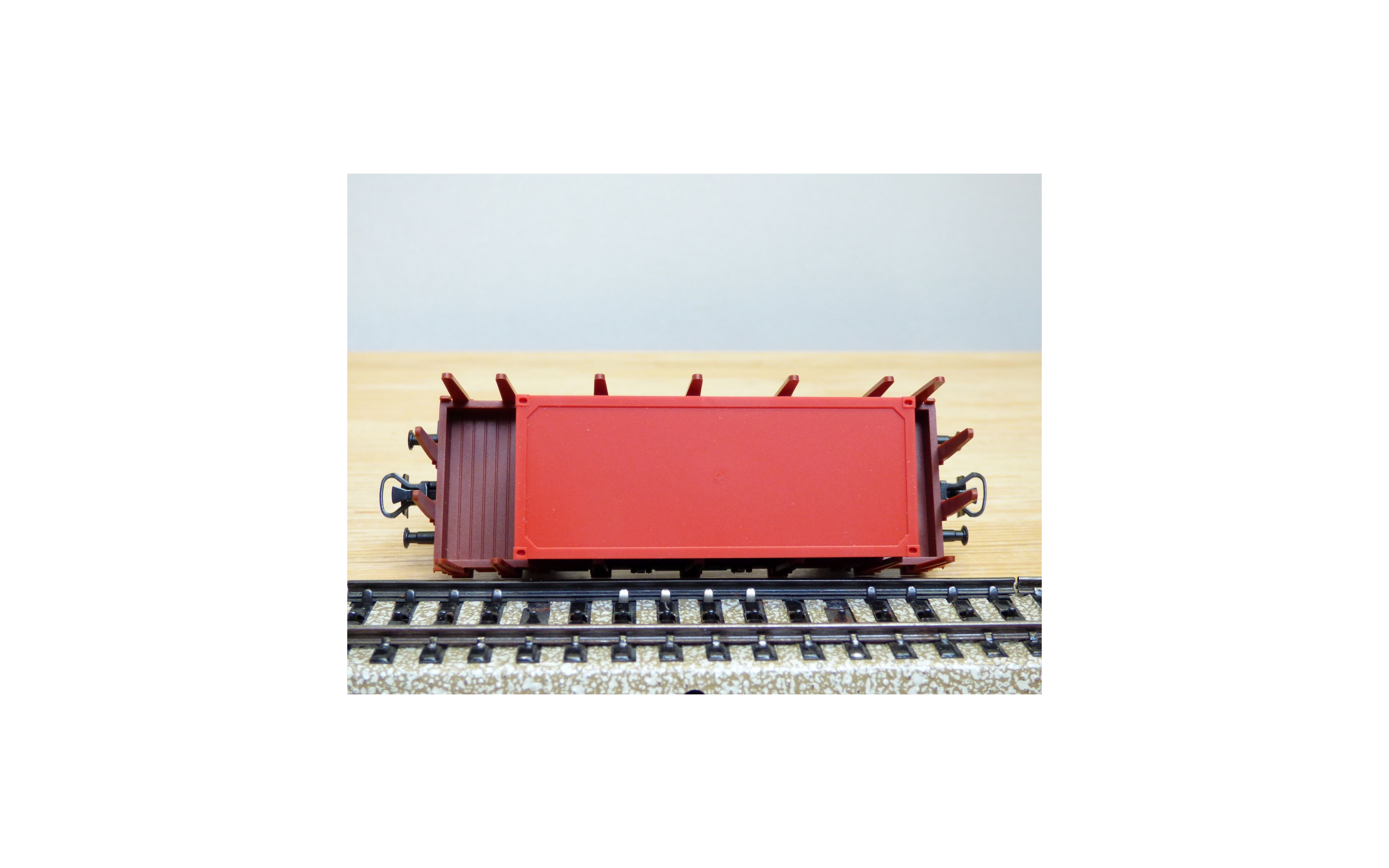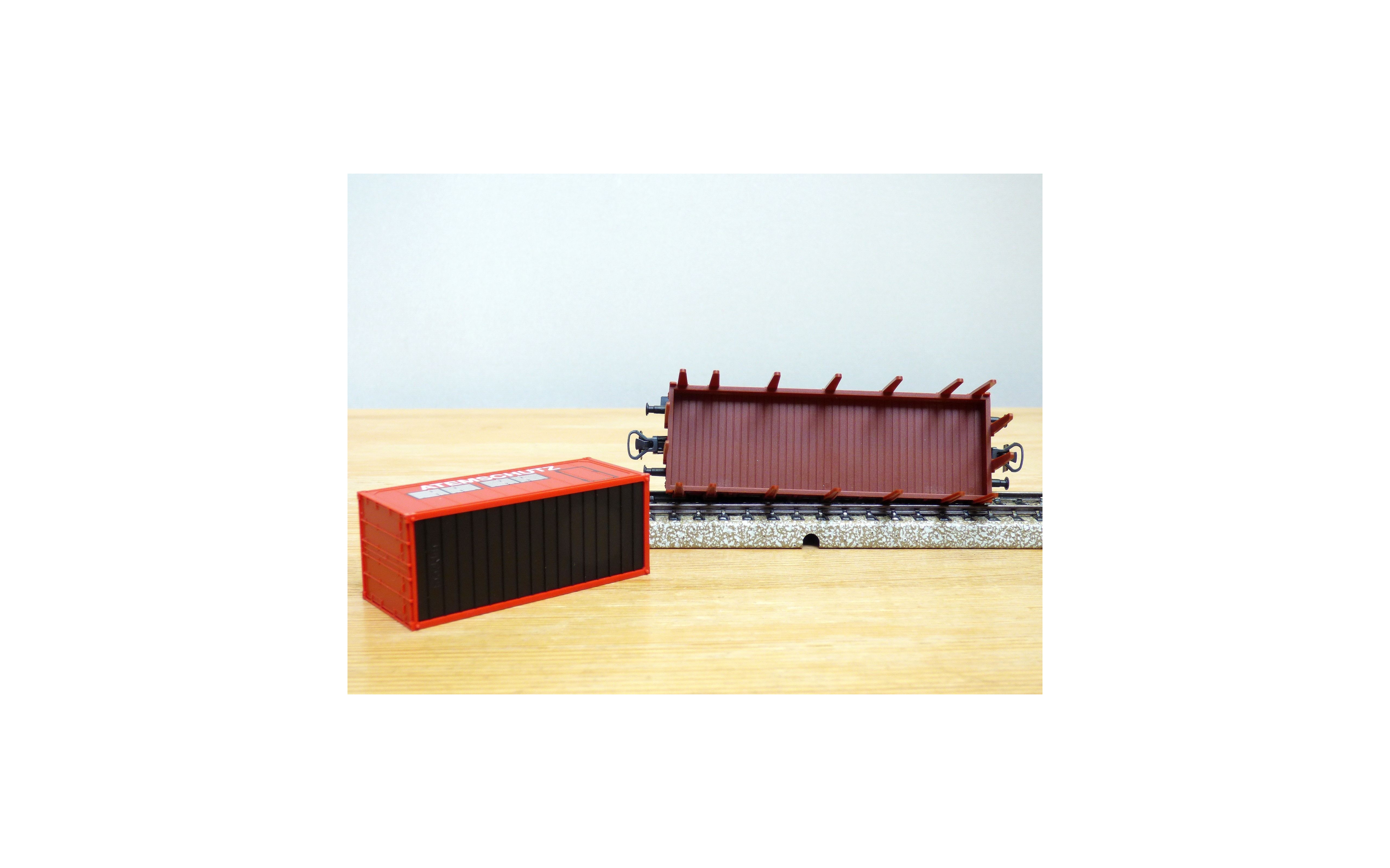 Wagon plat à ranchers à 2 essieux type Kbs 890 des chemins de fer allemands ( DB), livrée marron chargé d' un conteneur amovible avec marquages ATEMSCHUTZ, boîte d'origine " coins piquants ".