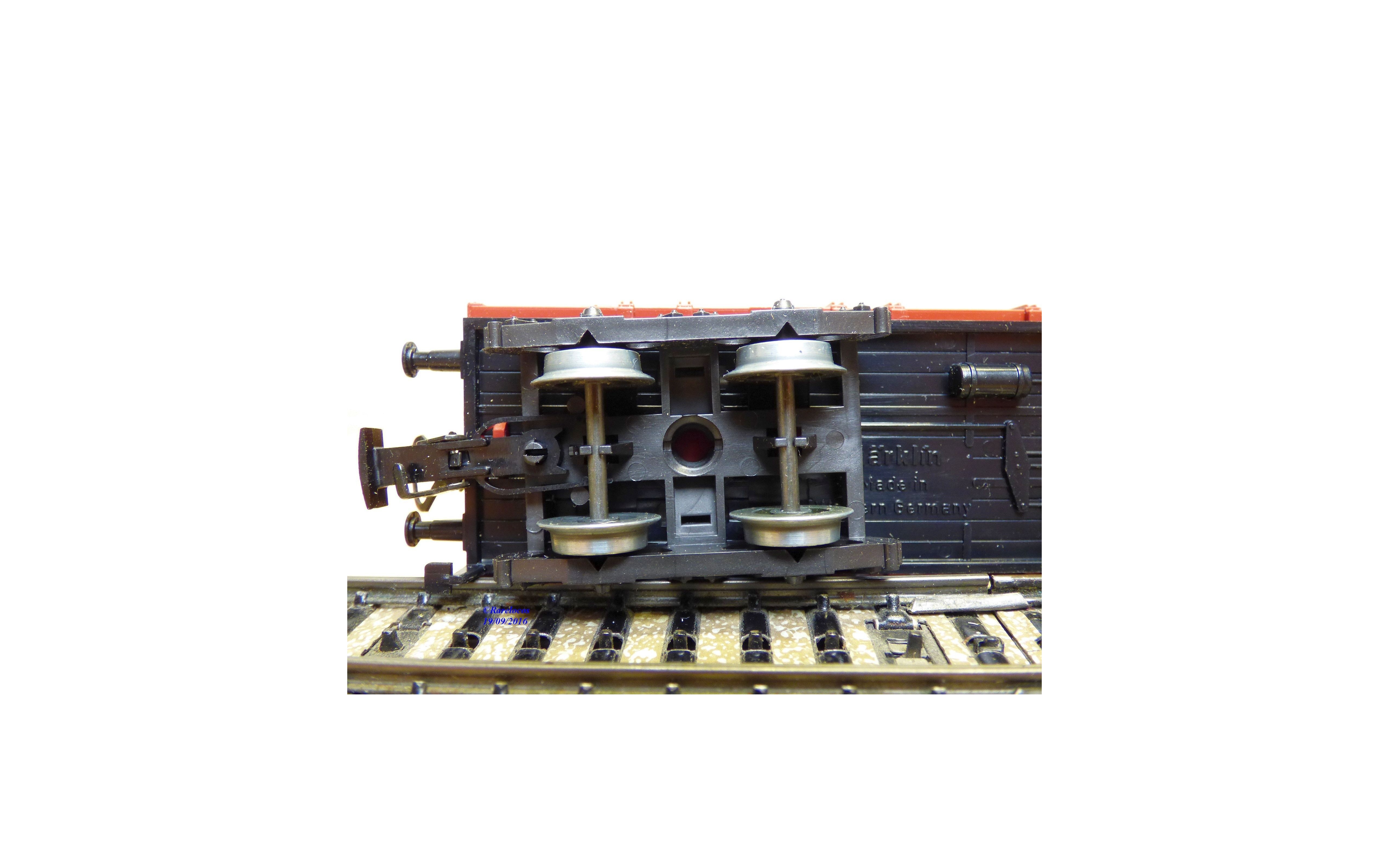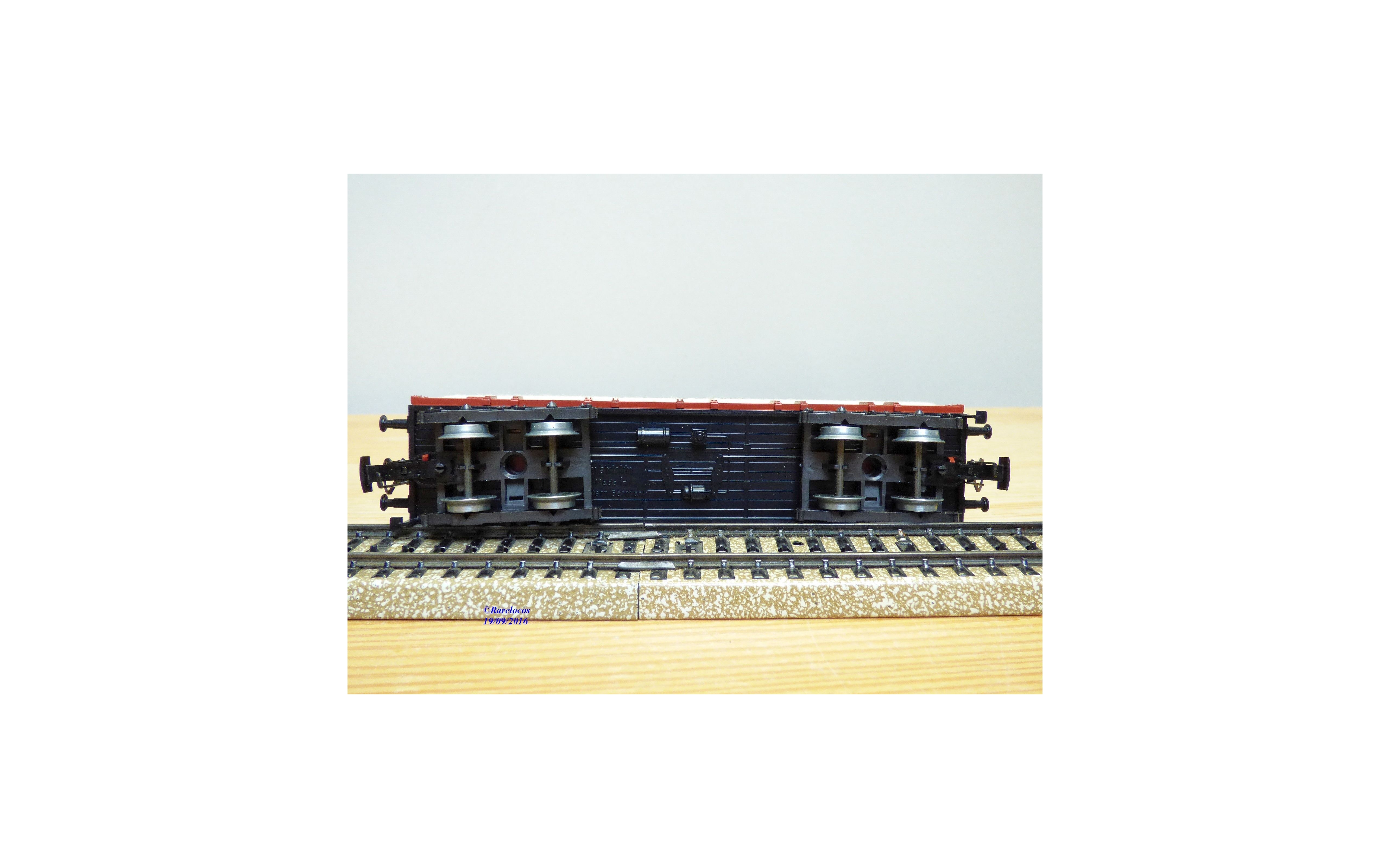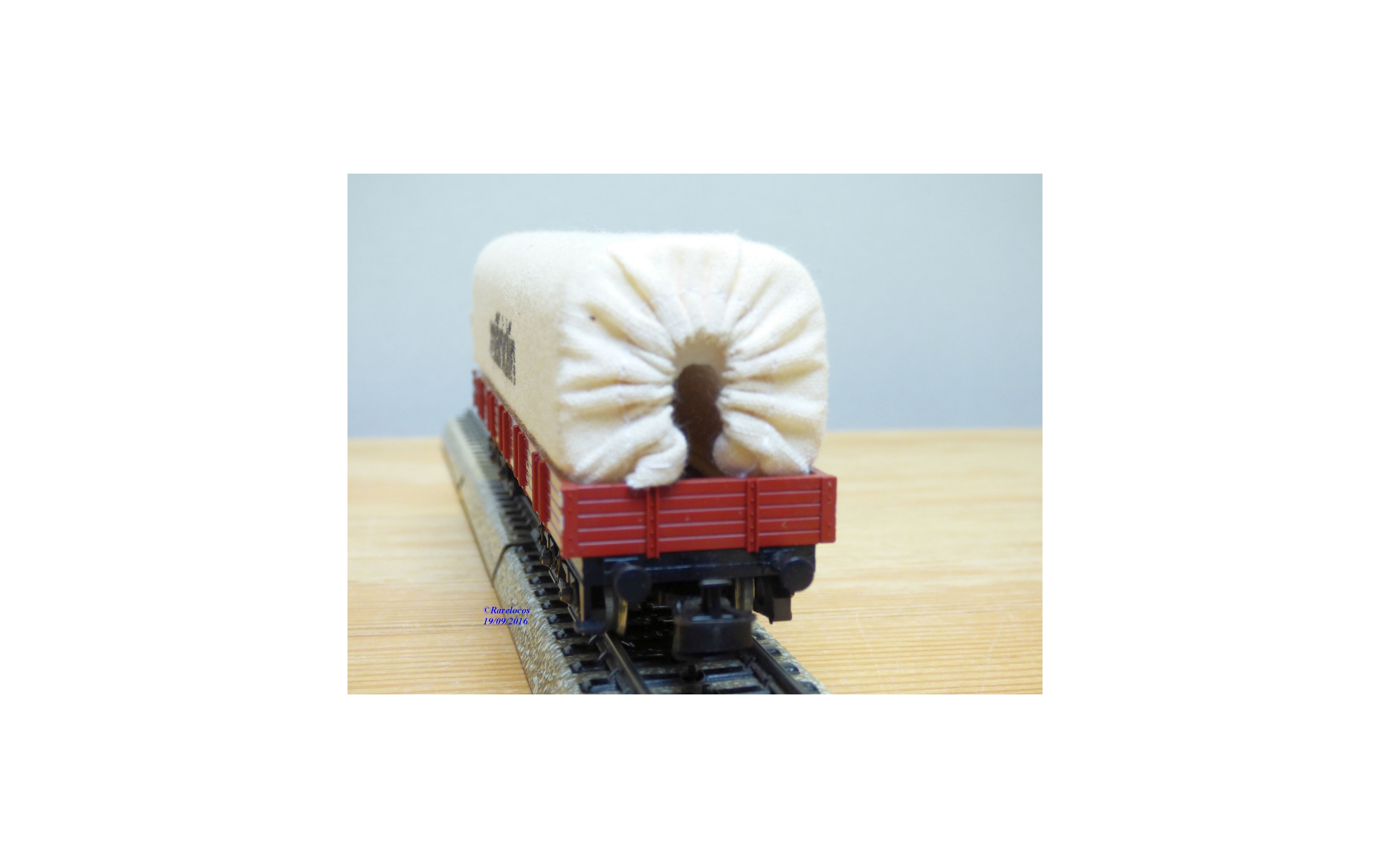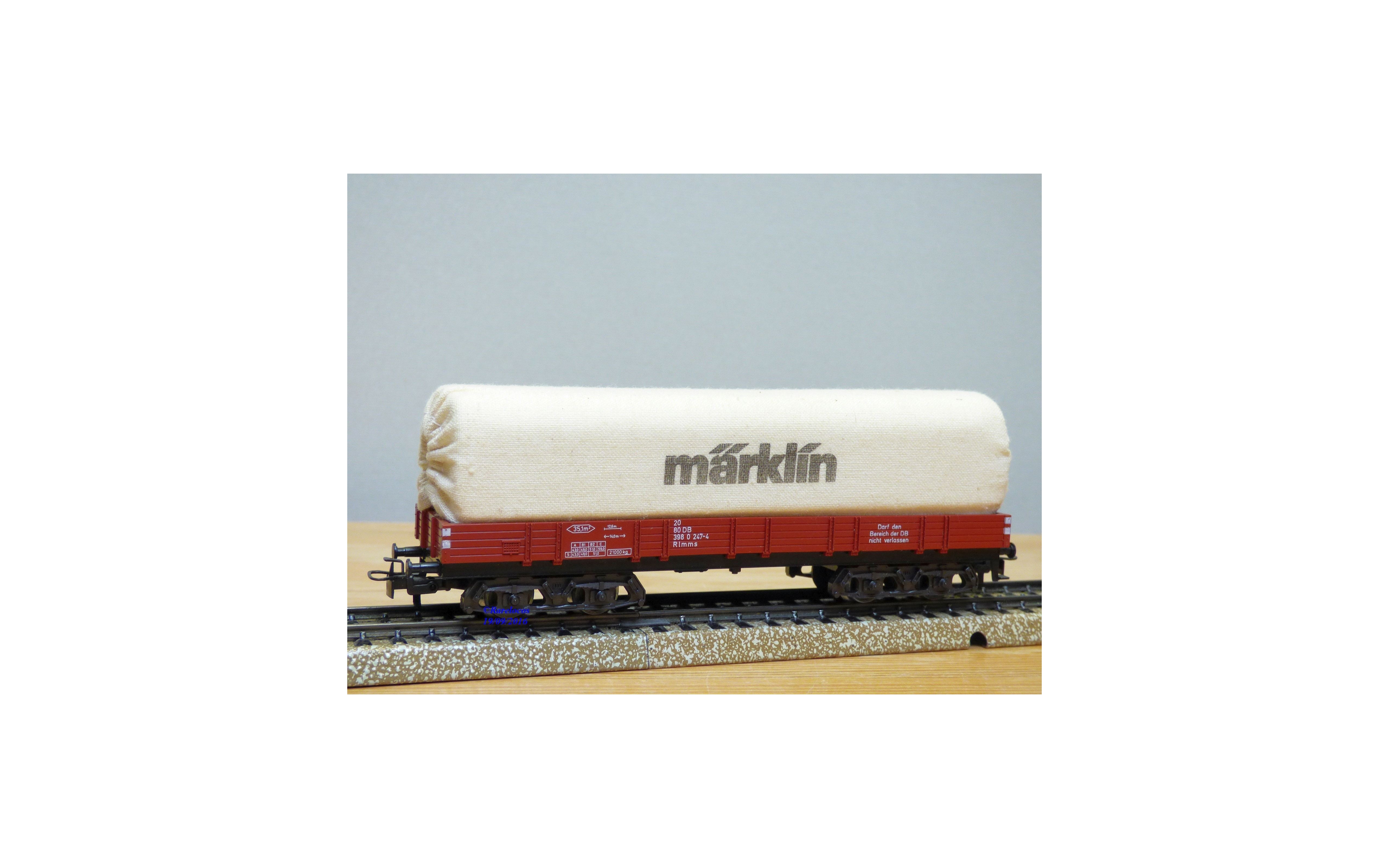 Wagon plat bâché à 2 bogies des chemins de fer allemands ( DB ), tout en métal et toile, bâche marquée Märklin posée sur une armature en polystyrène, boîte d'origine " coins piquants " .