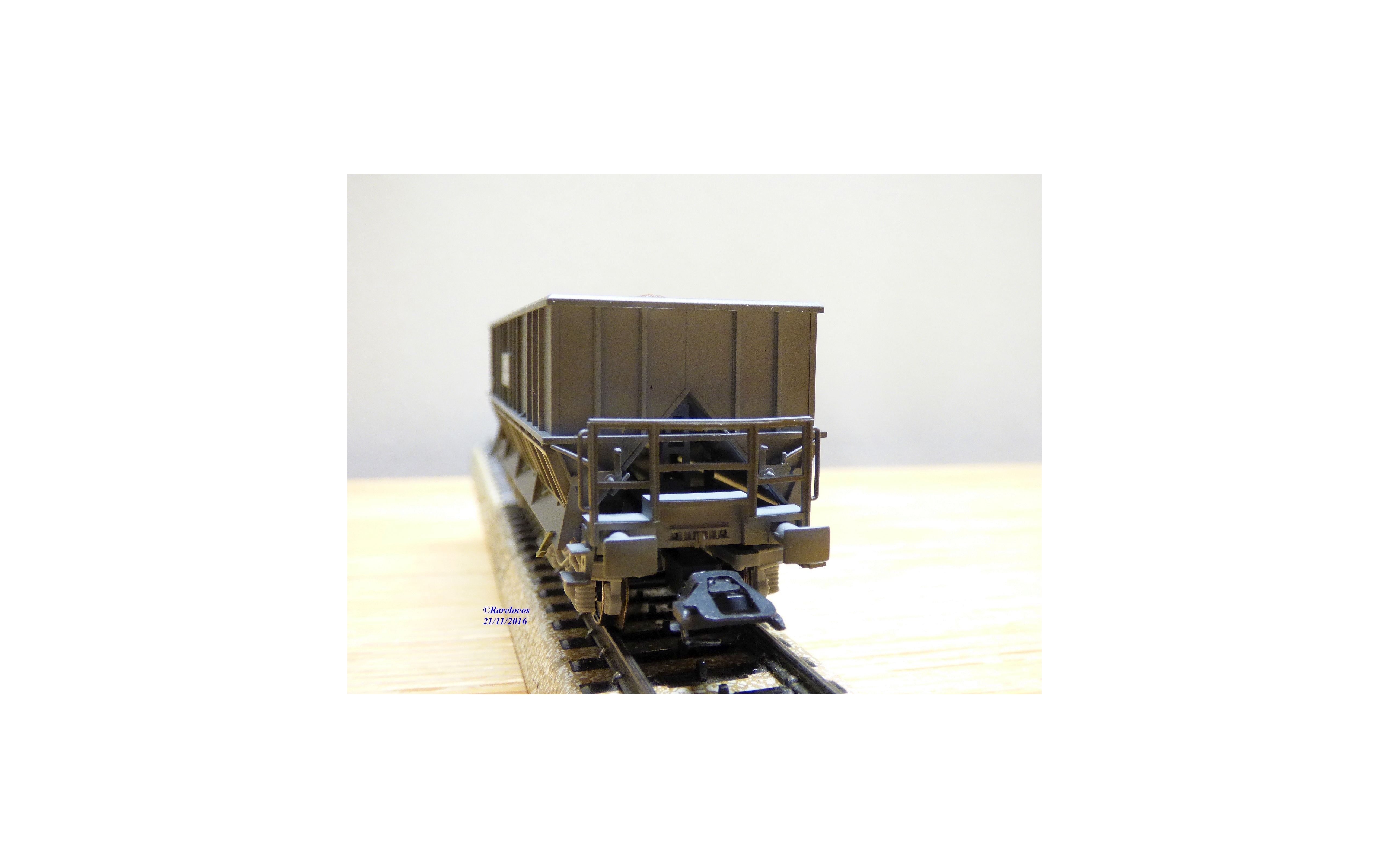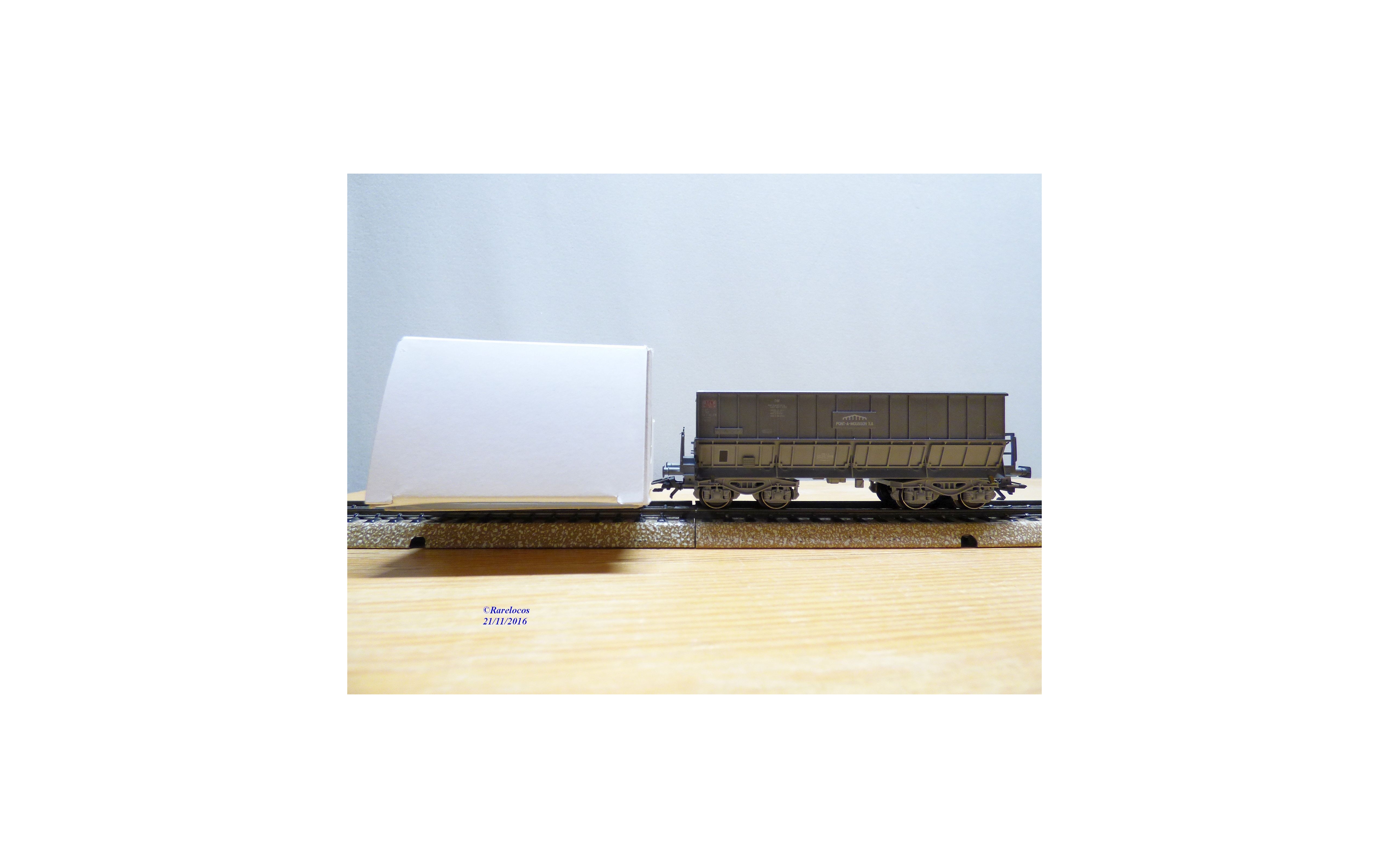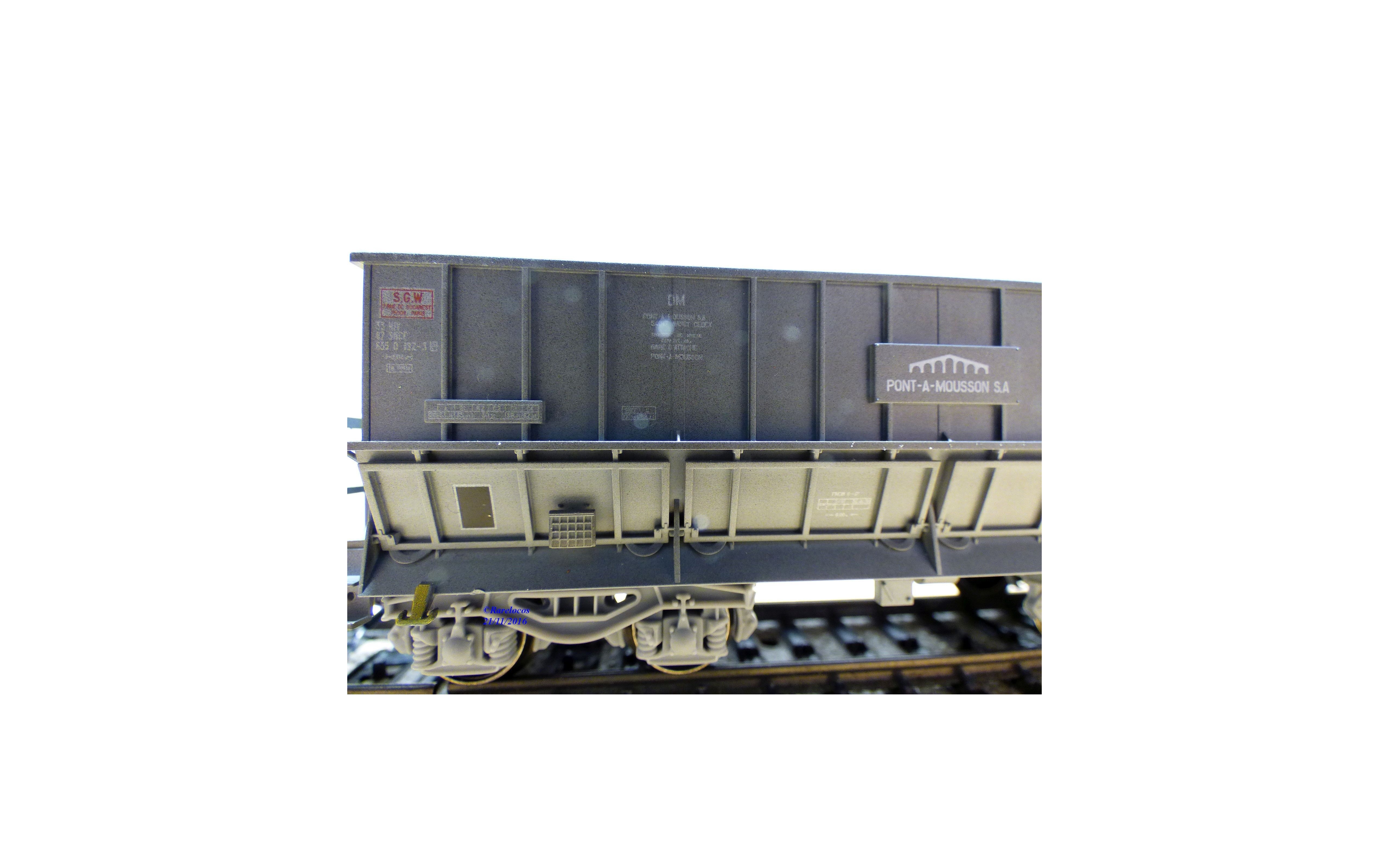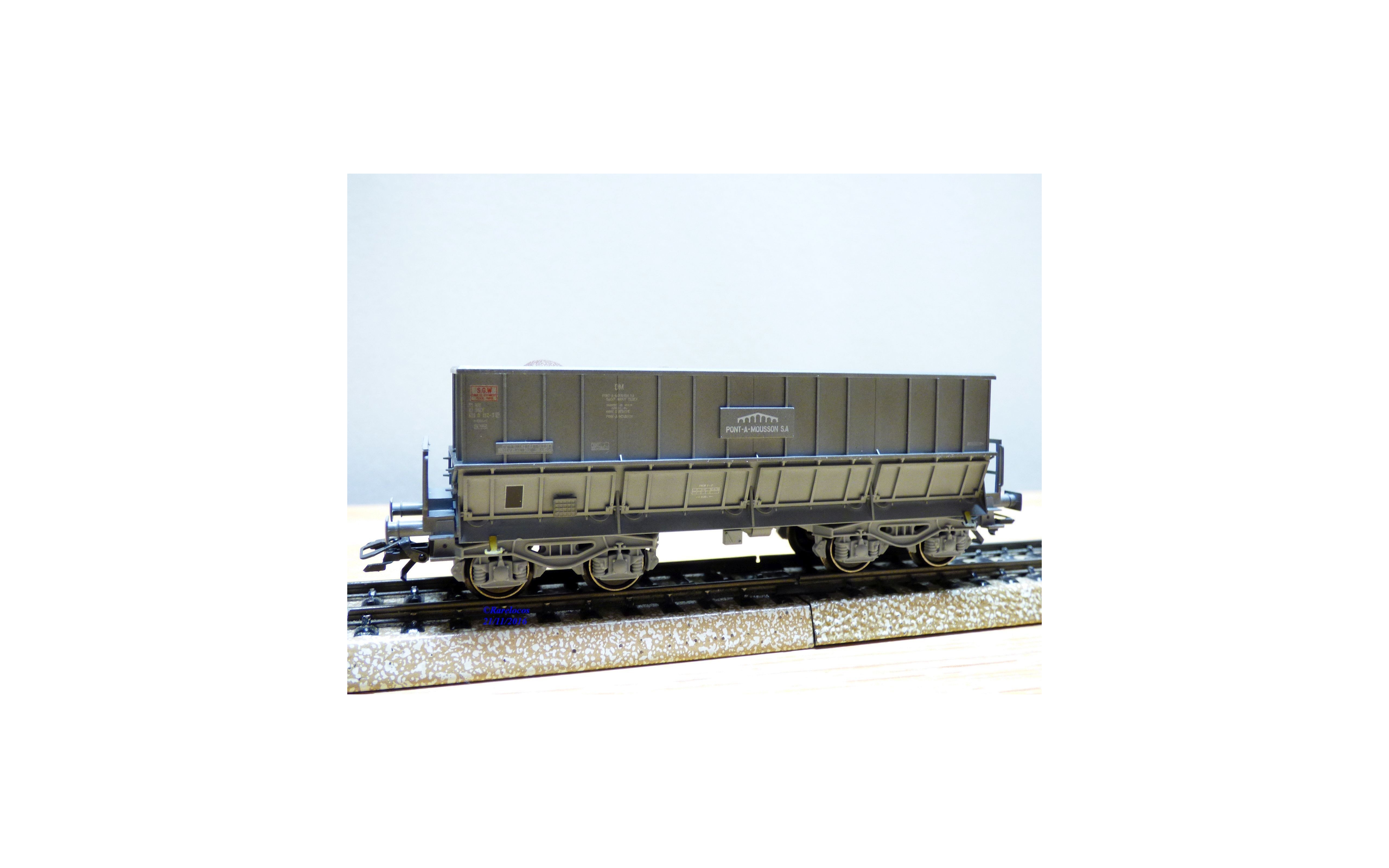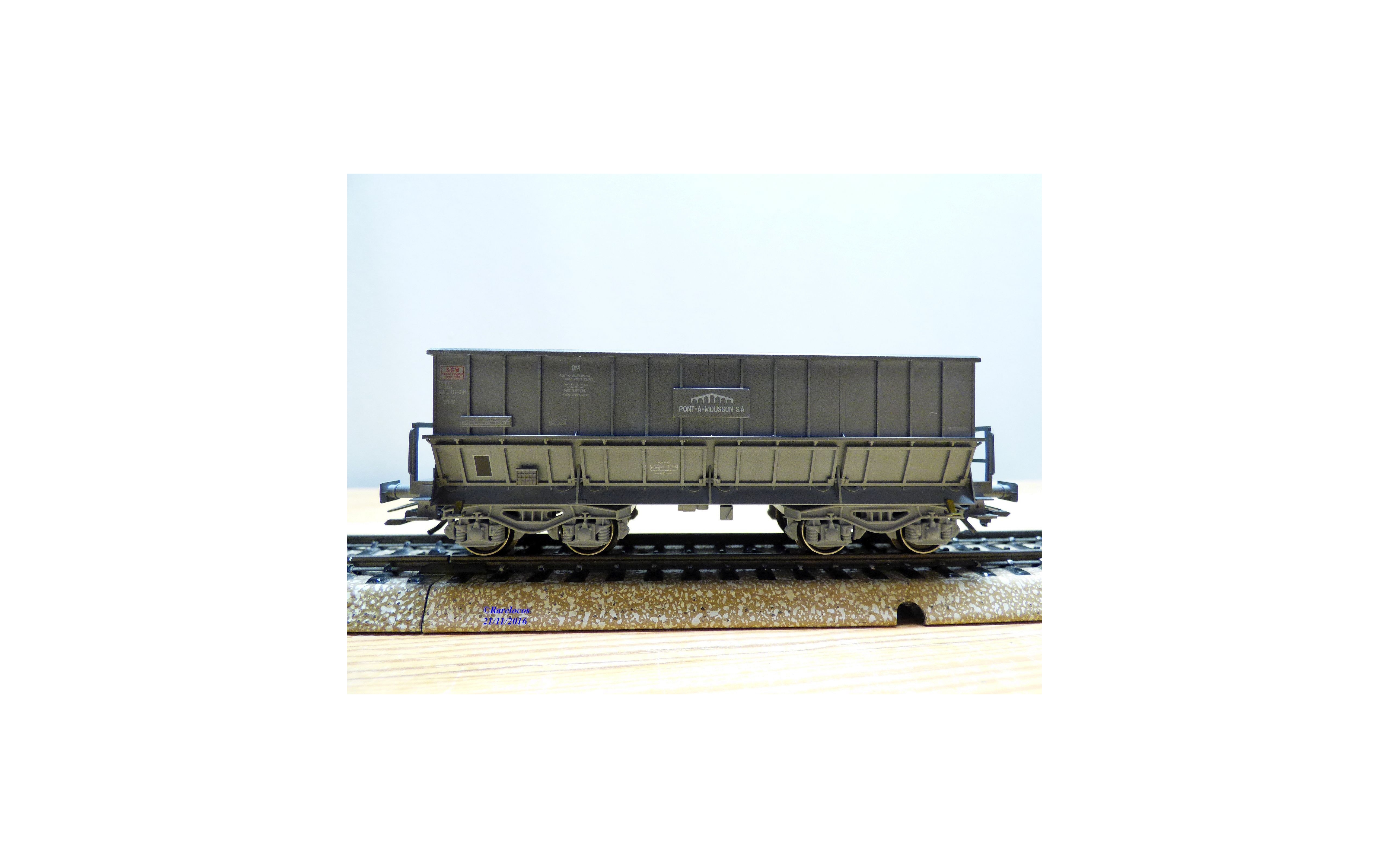 Wagon trémie à déchargement latéral pour transport de minerai type Fad des chemins de fer français ( SNCF ), chargement amovible, livrée grise avec marquages PONT A MOUSSON, boîte d'origine en état neuf.