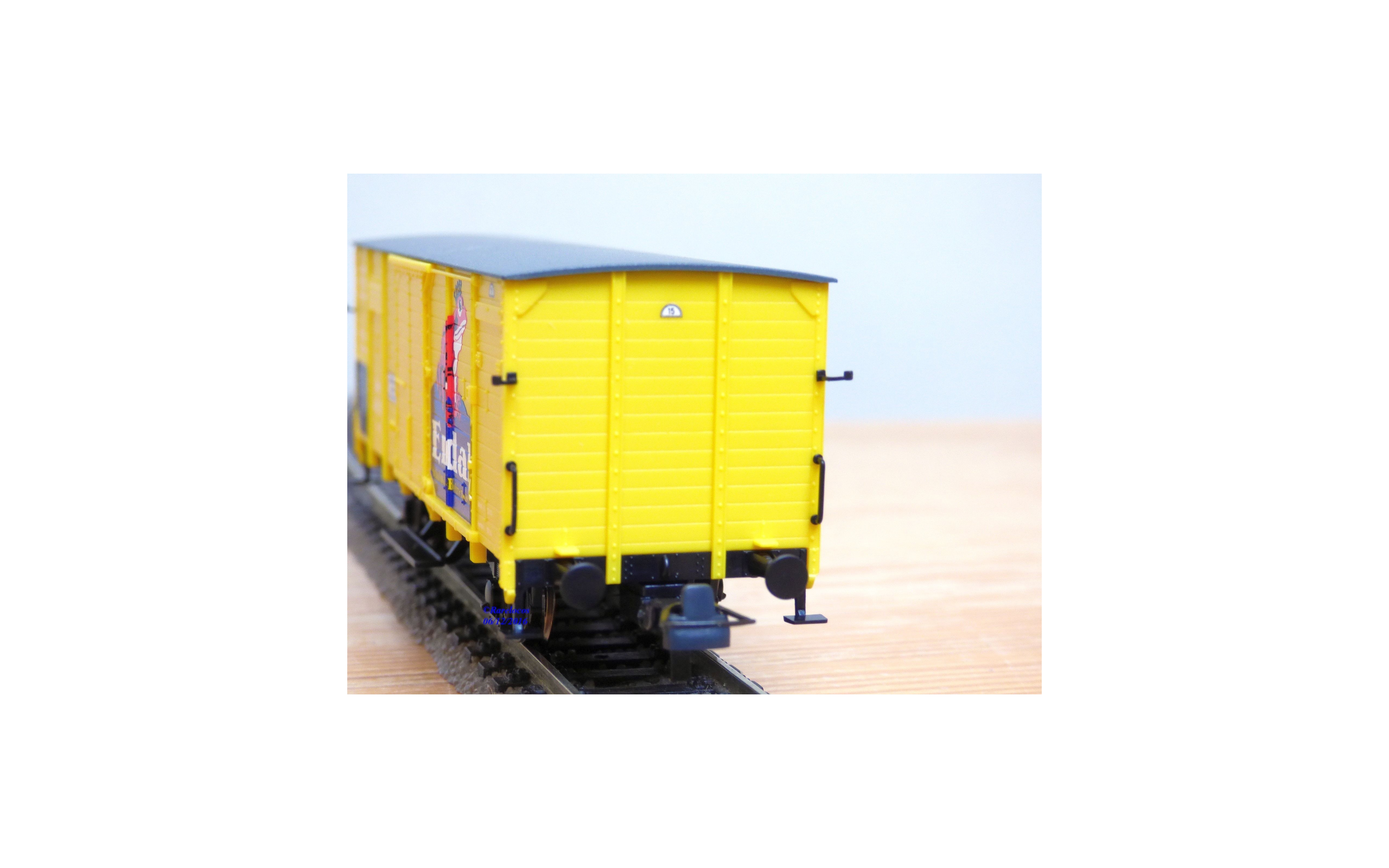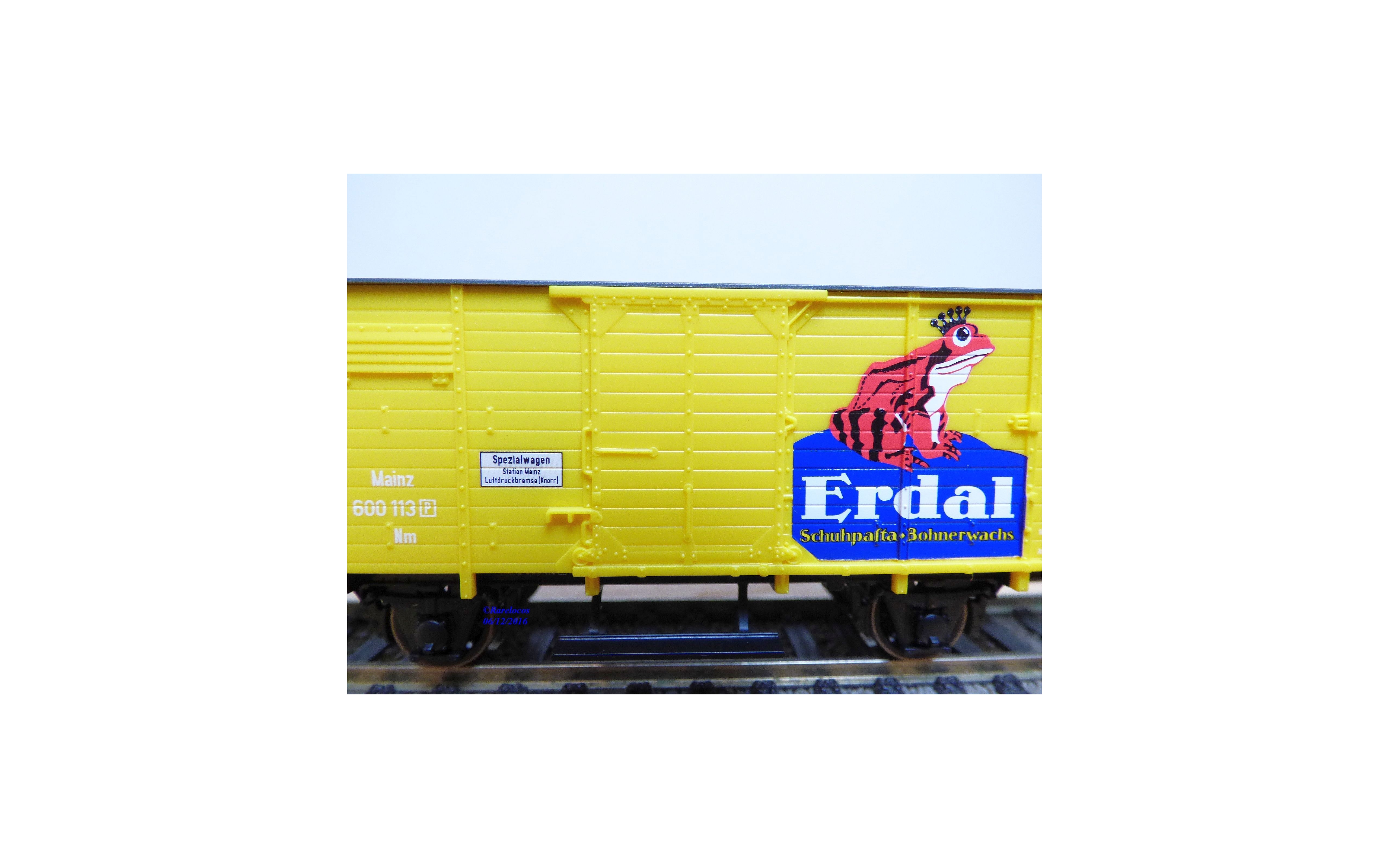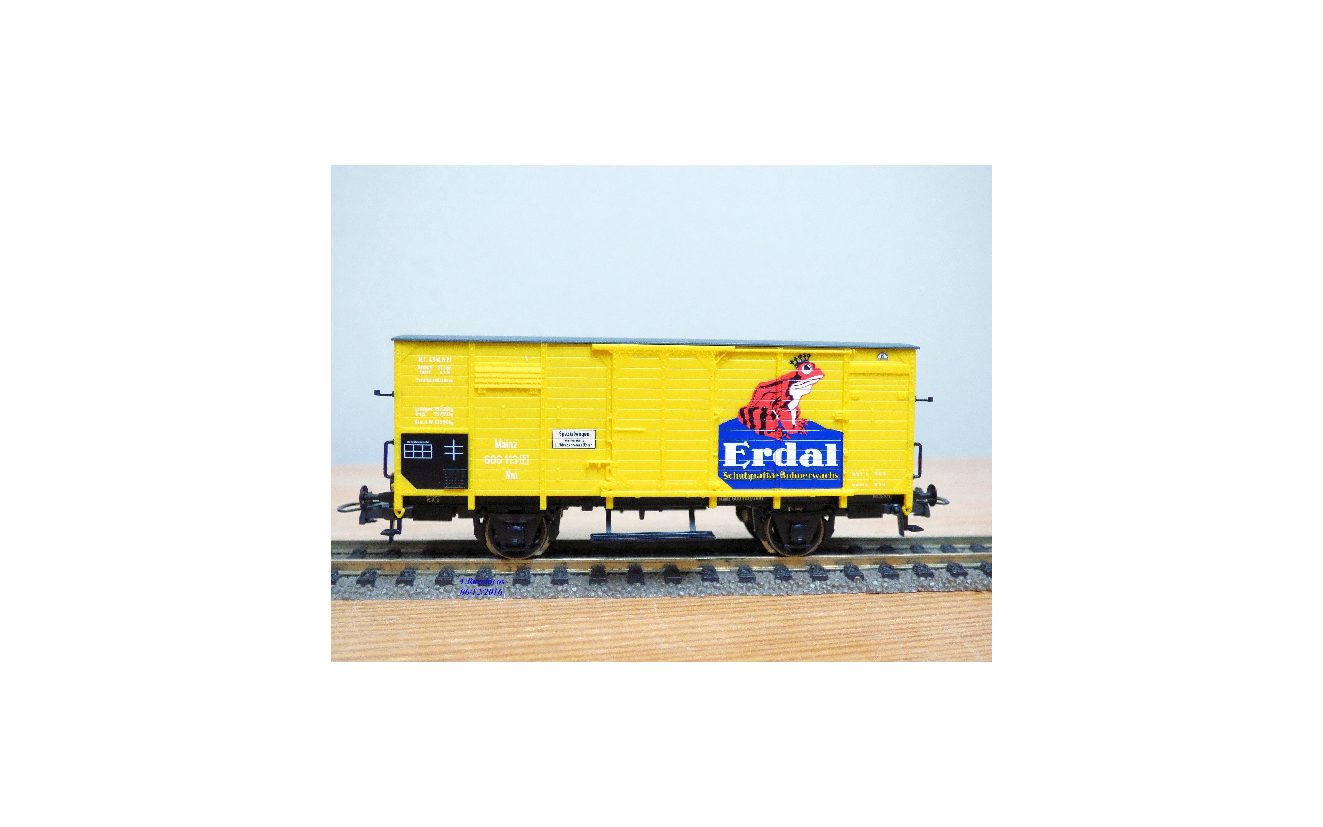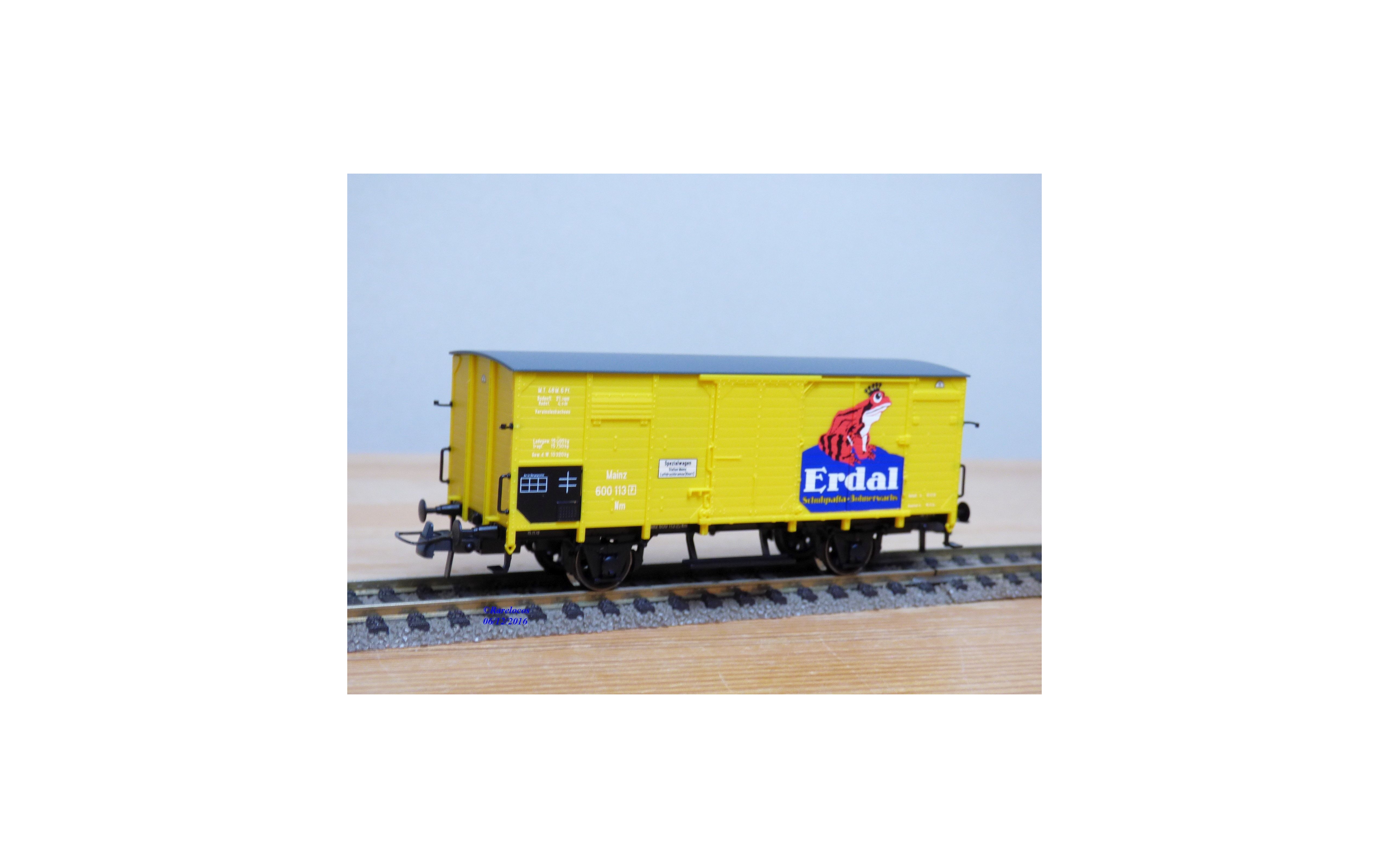 Wagon couvert ancien à 2 essieux type Nm des chemins de fer allemands ( KPEV : chemins de fer prussiens ), livrée jaune vif à toit gris avec marquages ERDAL, notice présente, boîte d'origine en très bon état.