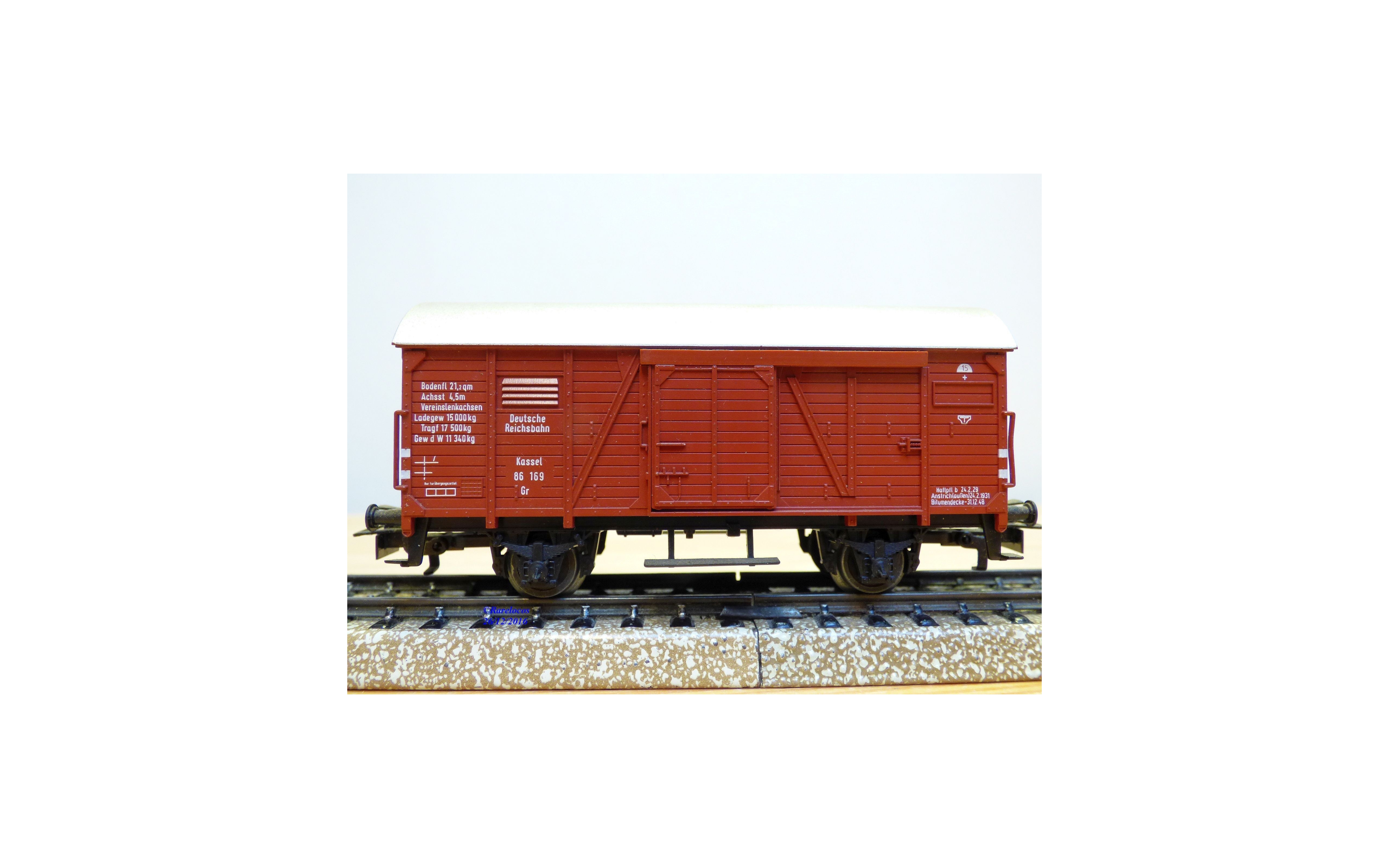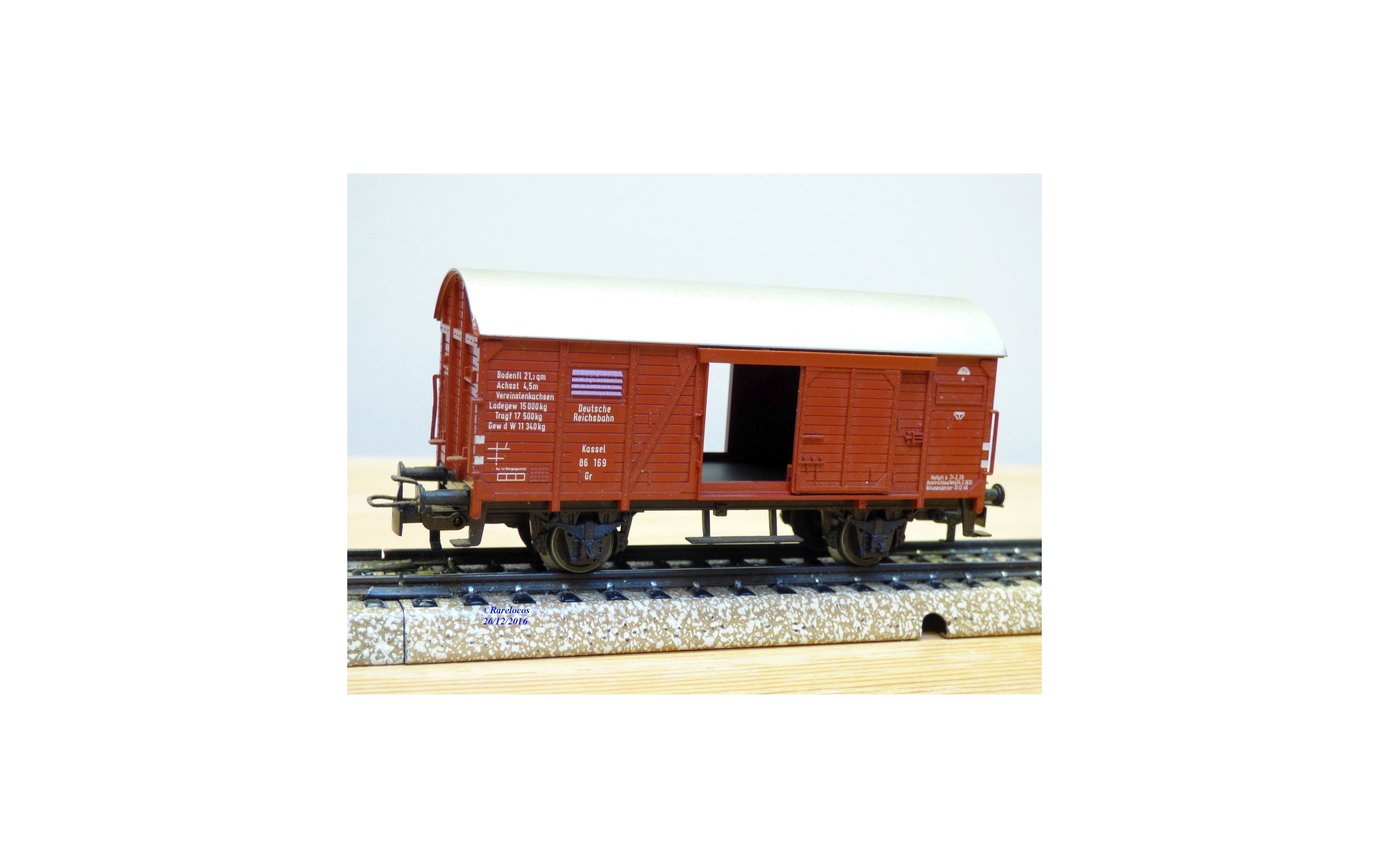 Wagon couvert à 2 essieux type Gr 20 des chemins de fer allemands ( DR ), livrée brune à toit mordoré, portes coulissantes fonctionnelles, attelages à élongation, immatriculation : 86 169, livré avec des figurines et du matériel de manutention ( manque un transpalette ), boîte d'origine en très bon état.