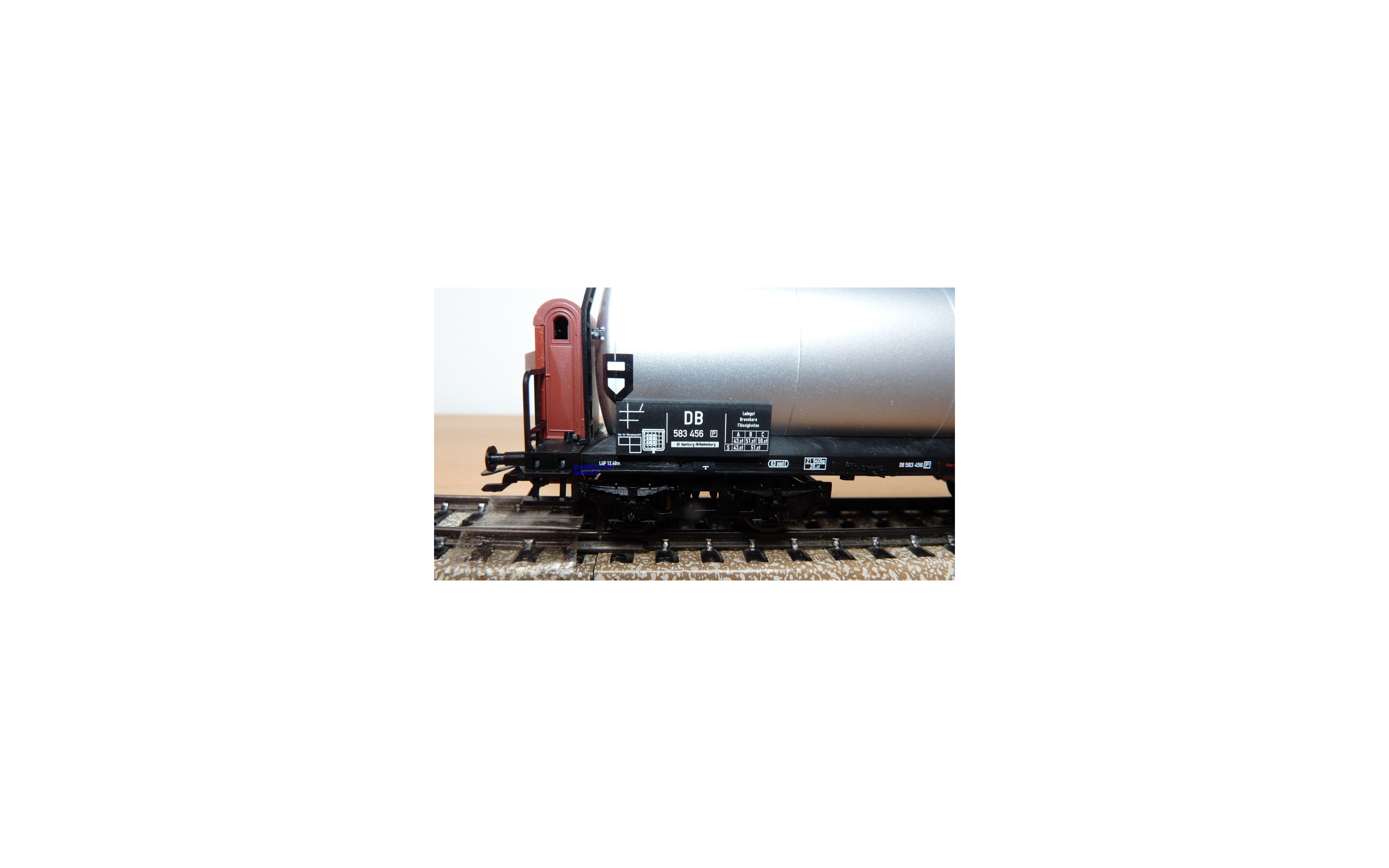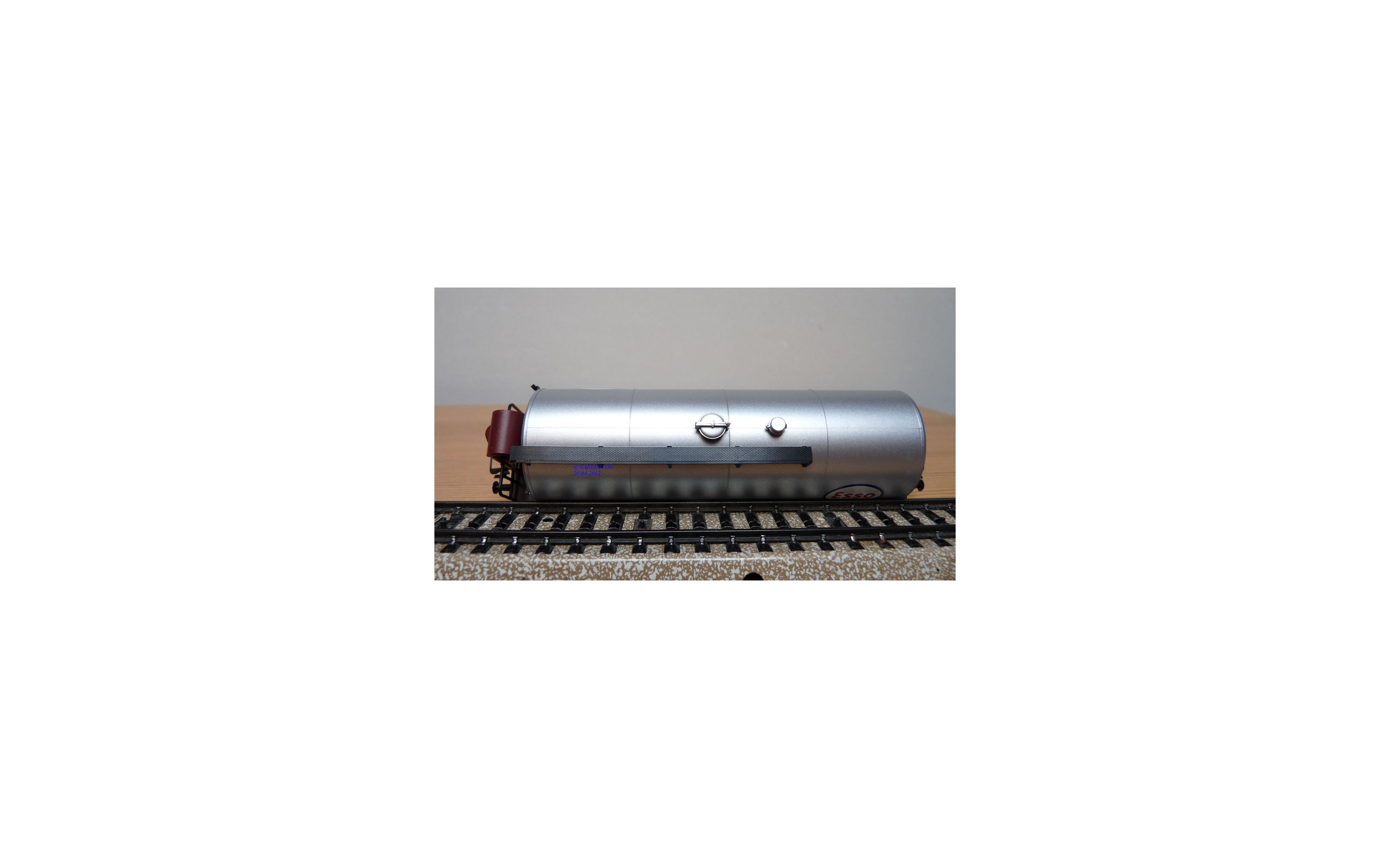 Wagon citerne à cabine de serre freins pour le transport d' essence à 2 bogies des chemins de fer allemands ( DB ), livrée gris argent avec marquages ESSO, emballage d'origine en état neuf.
