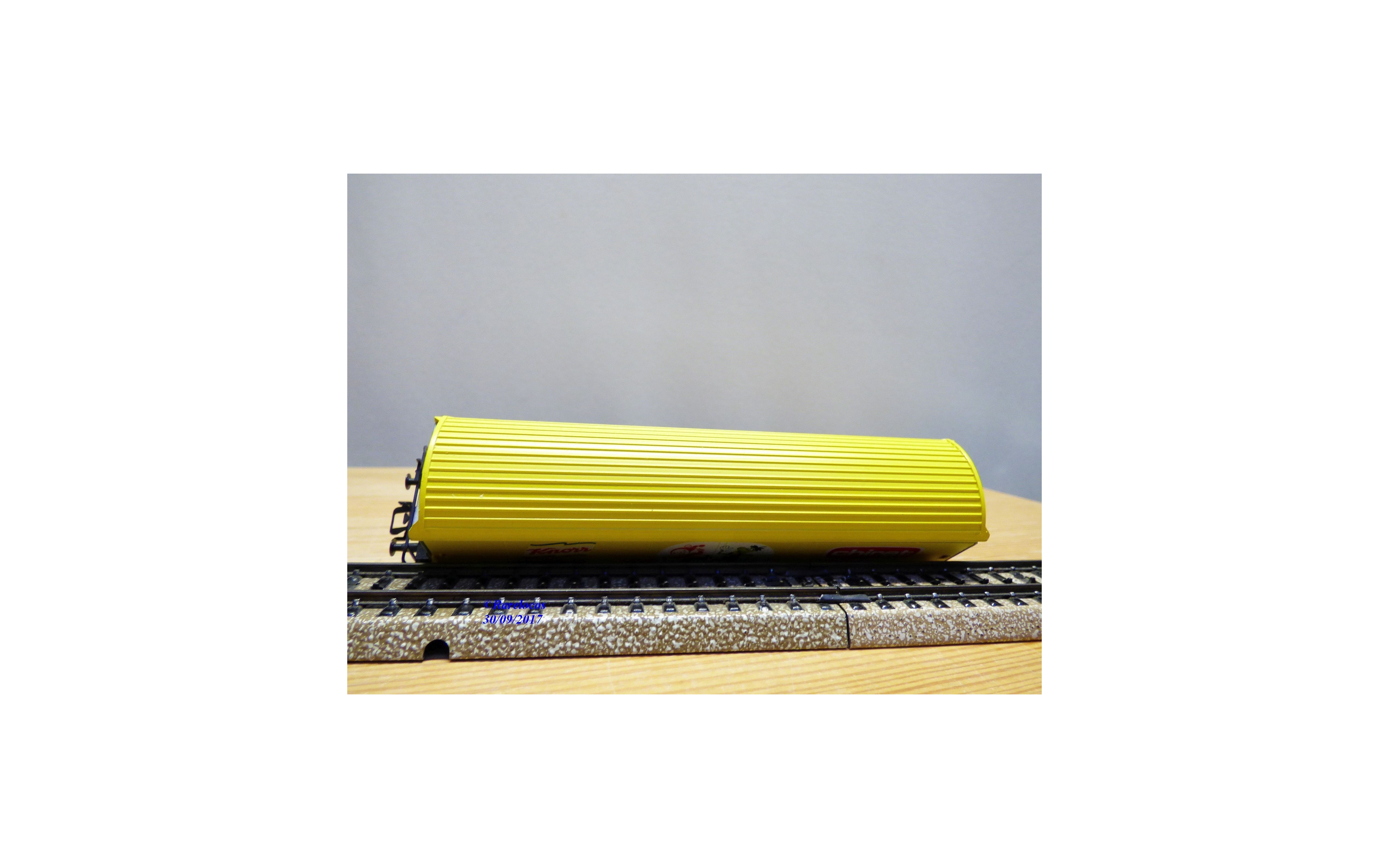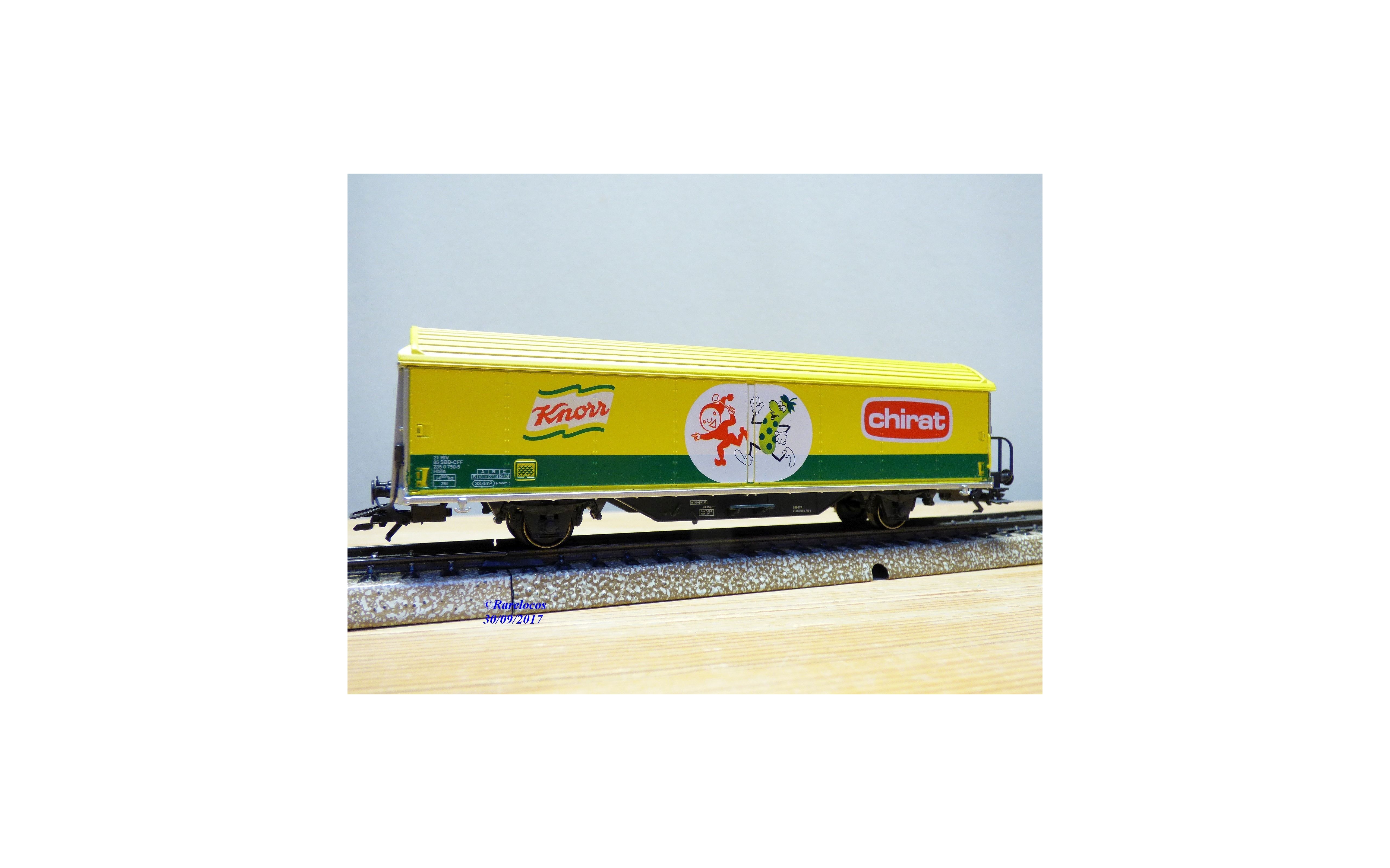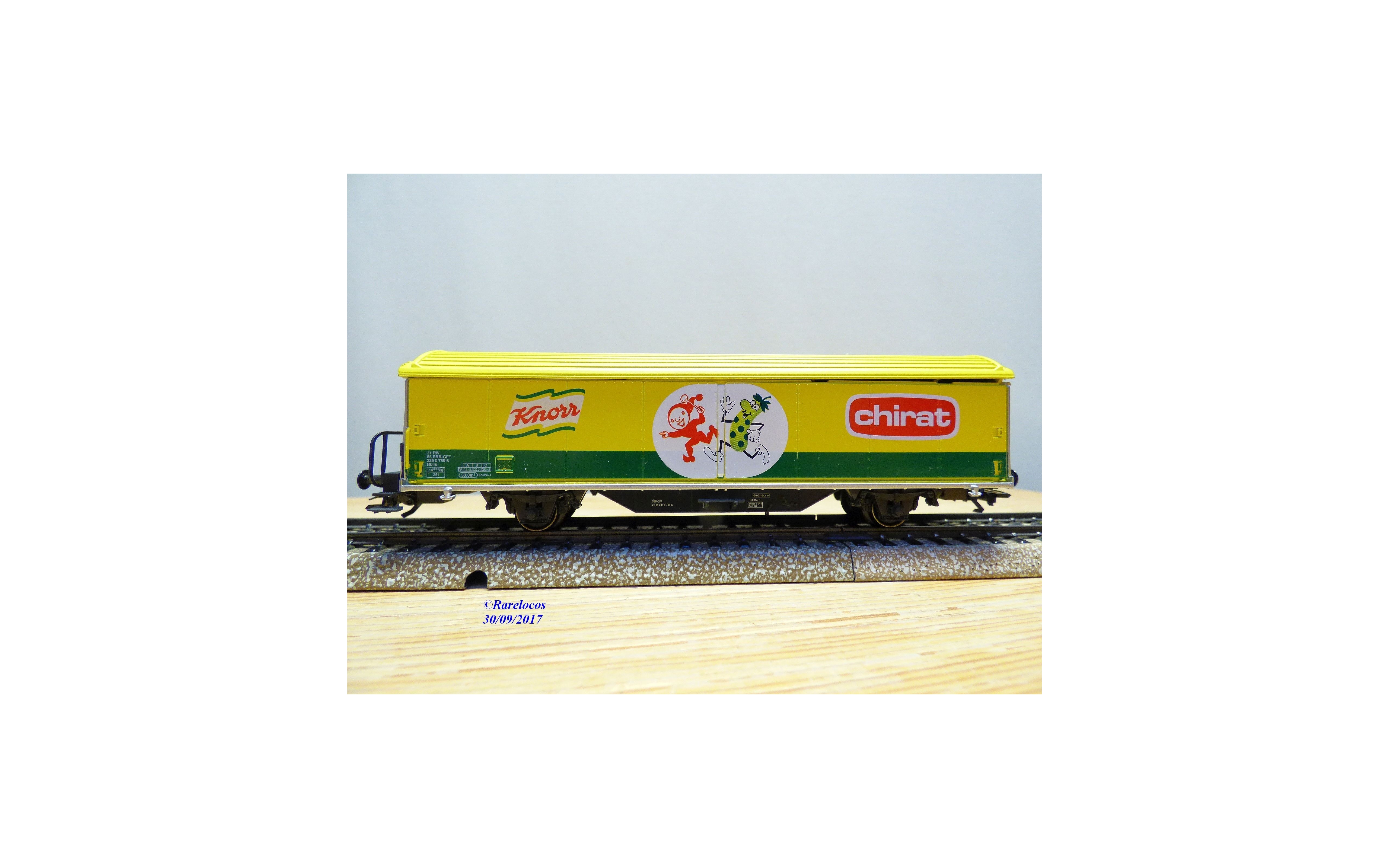 Wagon couvert à 2 essieux type Hbils, livrée jaune et verte avec marquages publicitaires KNORR et CHIRAT, boîte d'origine en état neuf.