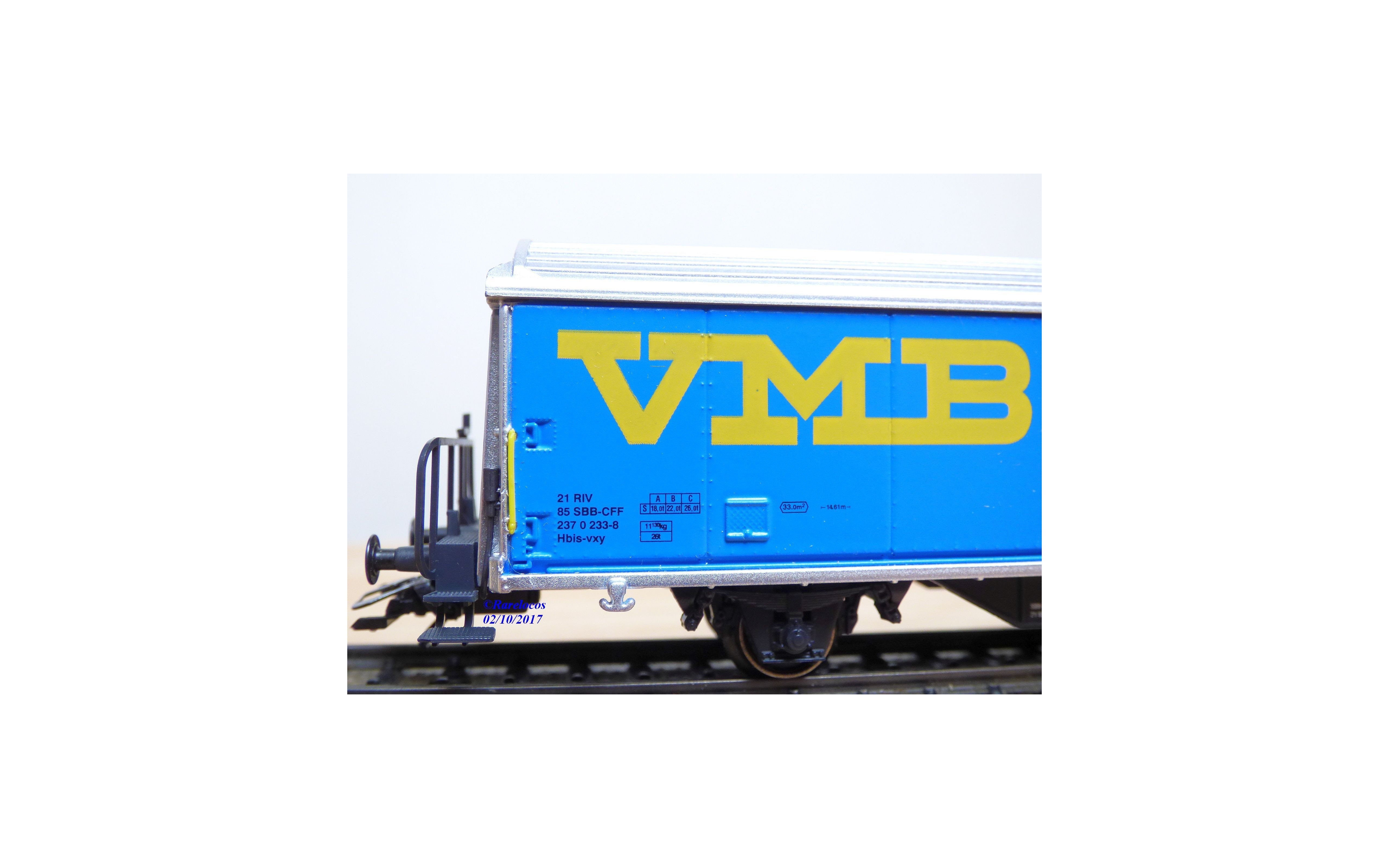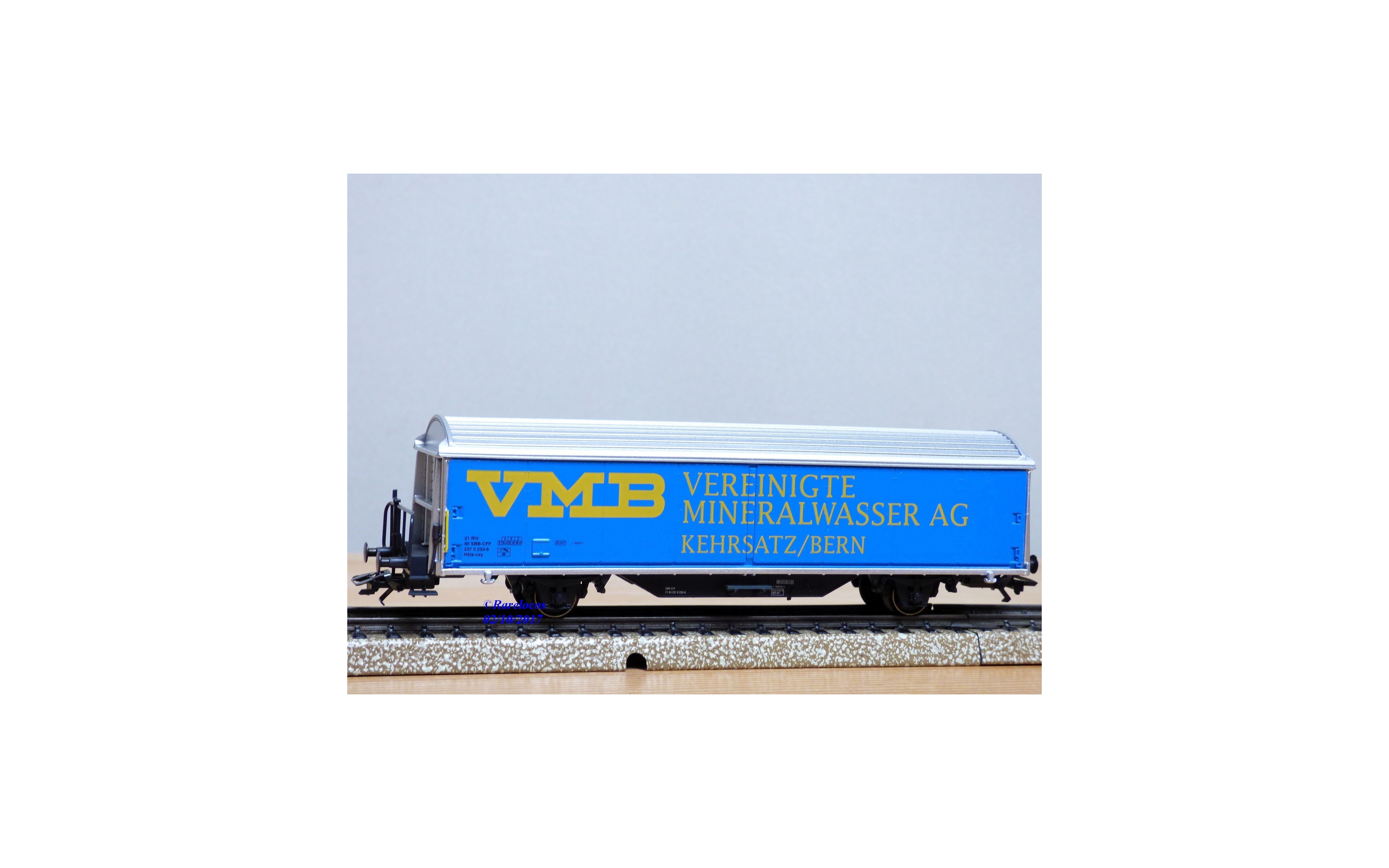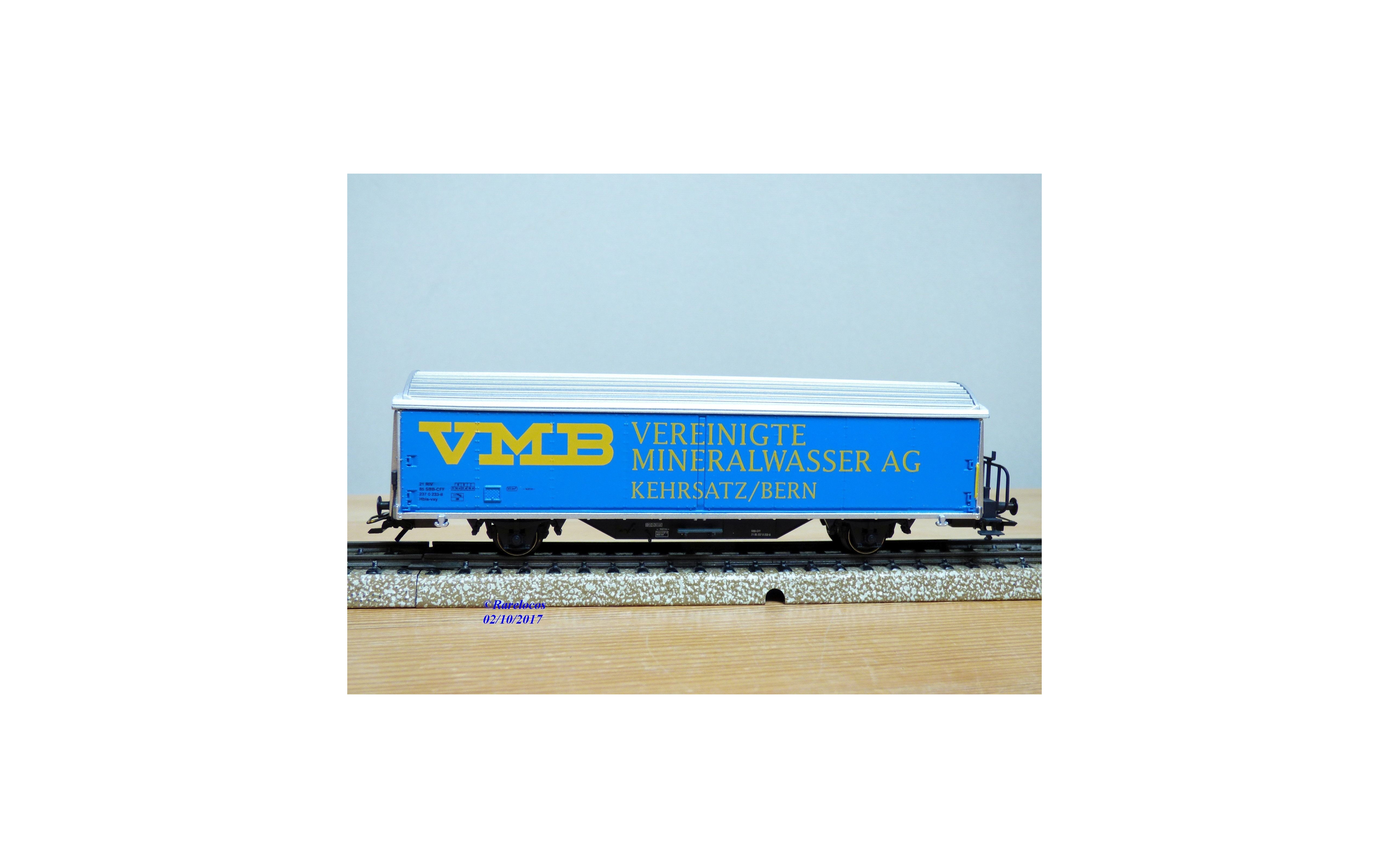 Wagon couvert à 2 essieux type Hbis-vxy des chemins de fer suisses ( SBB / CFF / FFS ), livrée bleue à toit gris argent avec marquages publicitaires VEREINIGTE MINERALWASSER AG VMB, boîte d'origine en état neuf.