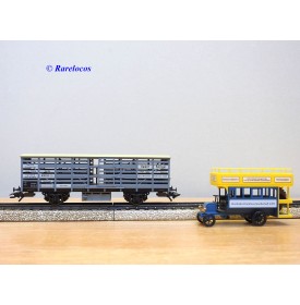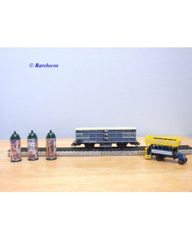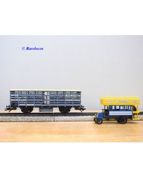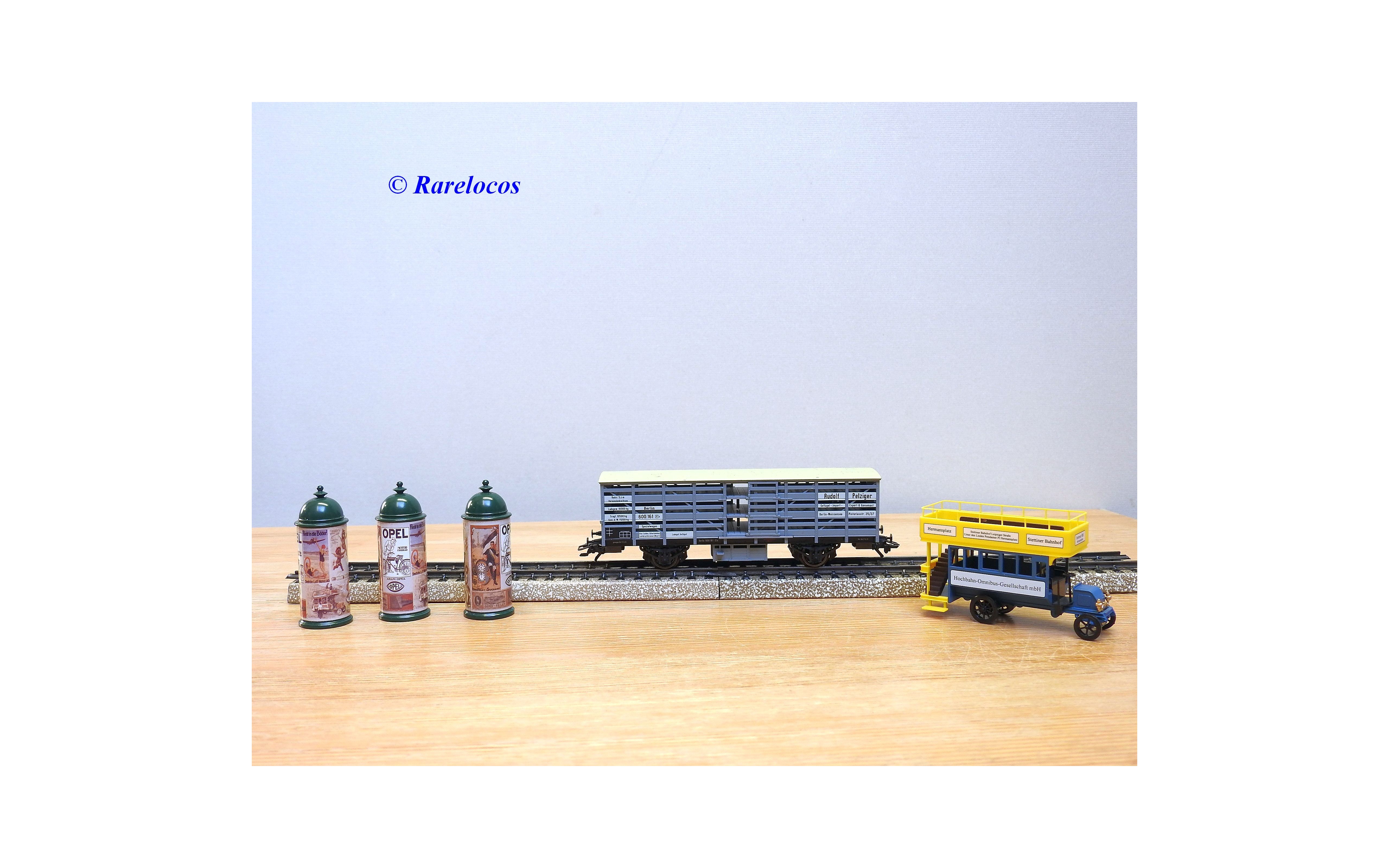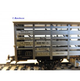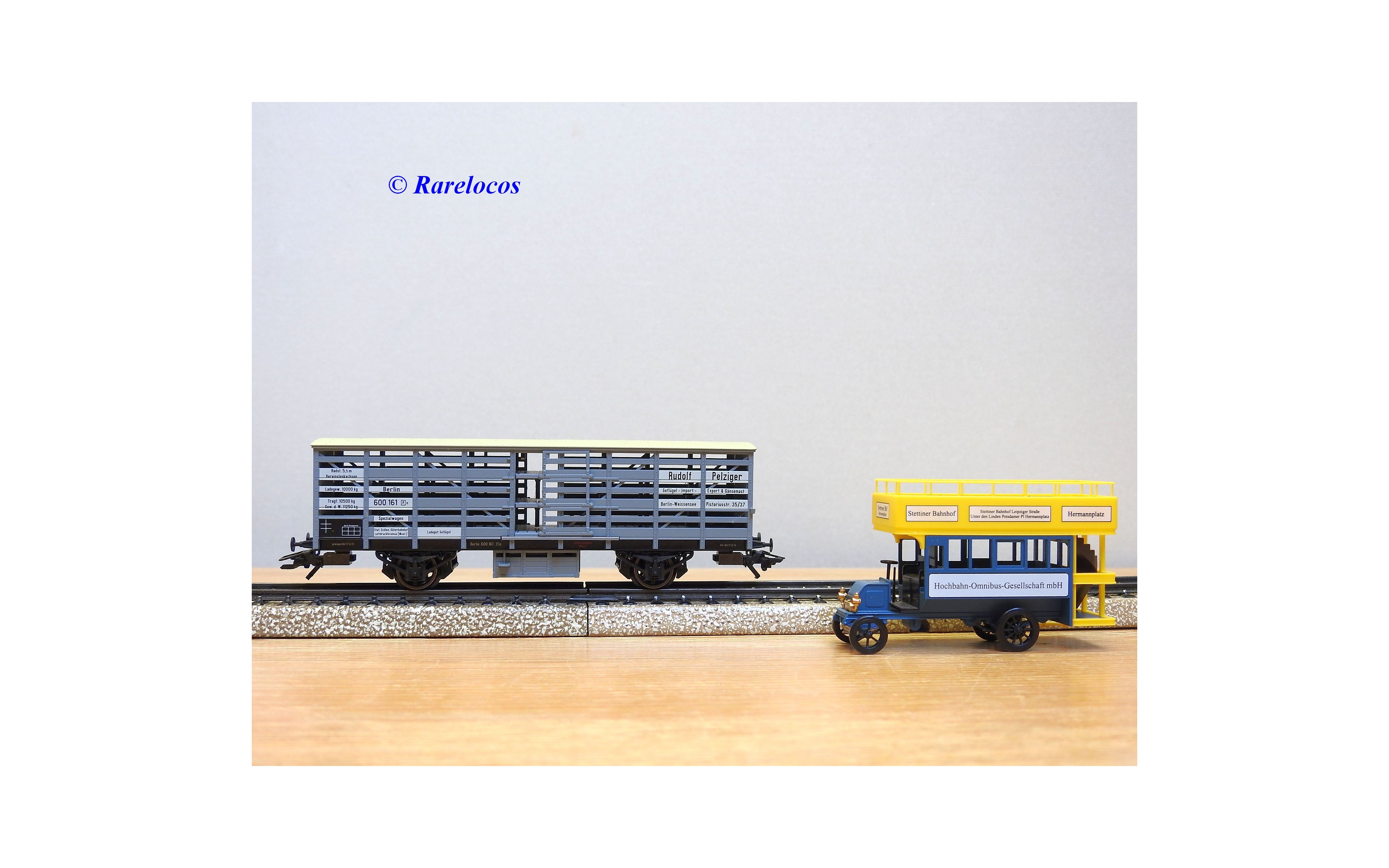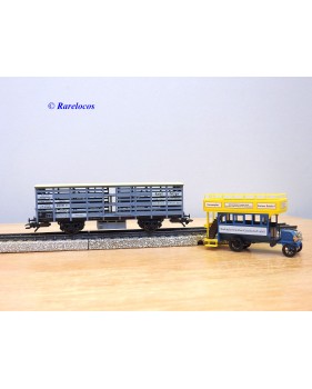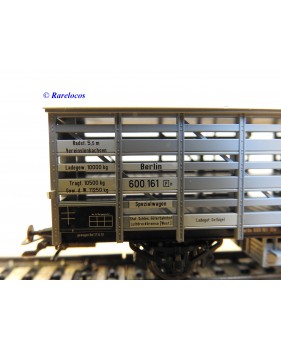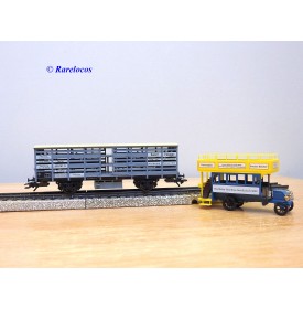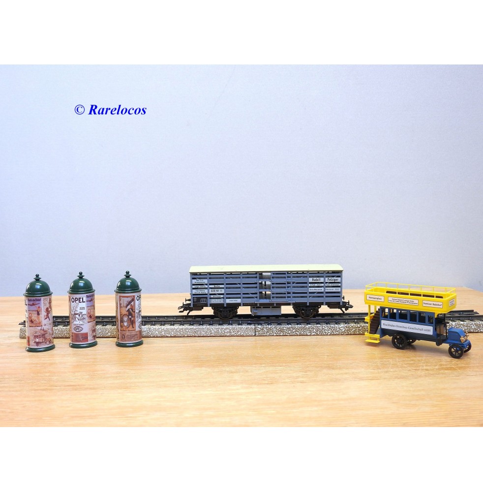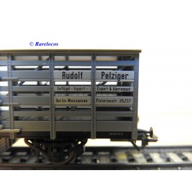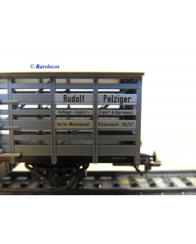Wagon à claire voies pour le transport de petits animaux des chemins de fer allemands ( KPEV ), livrée grise à toit beige avec marquages Rudolf Petziger à Berlin, livré avec 3 colonnes Morris et un autobus Büssing à 2 étages en métal, boîte d'origine en très bon état.