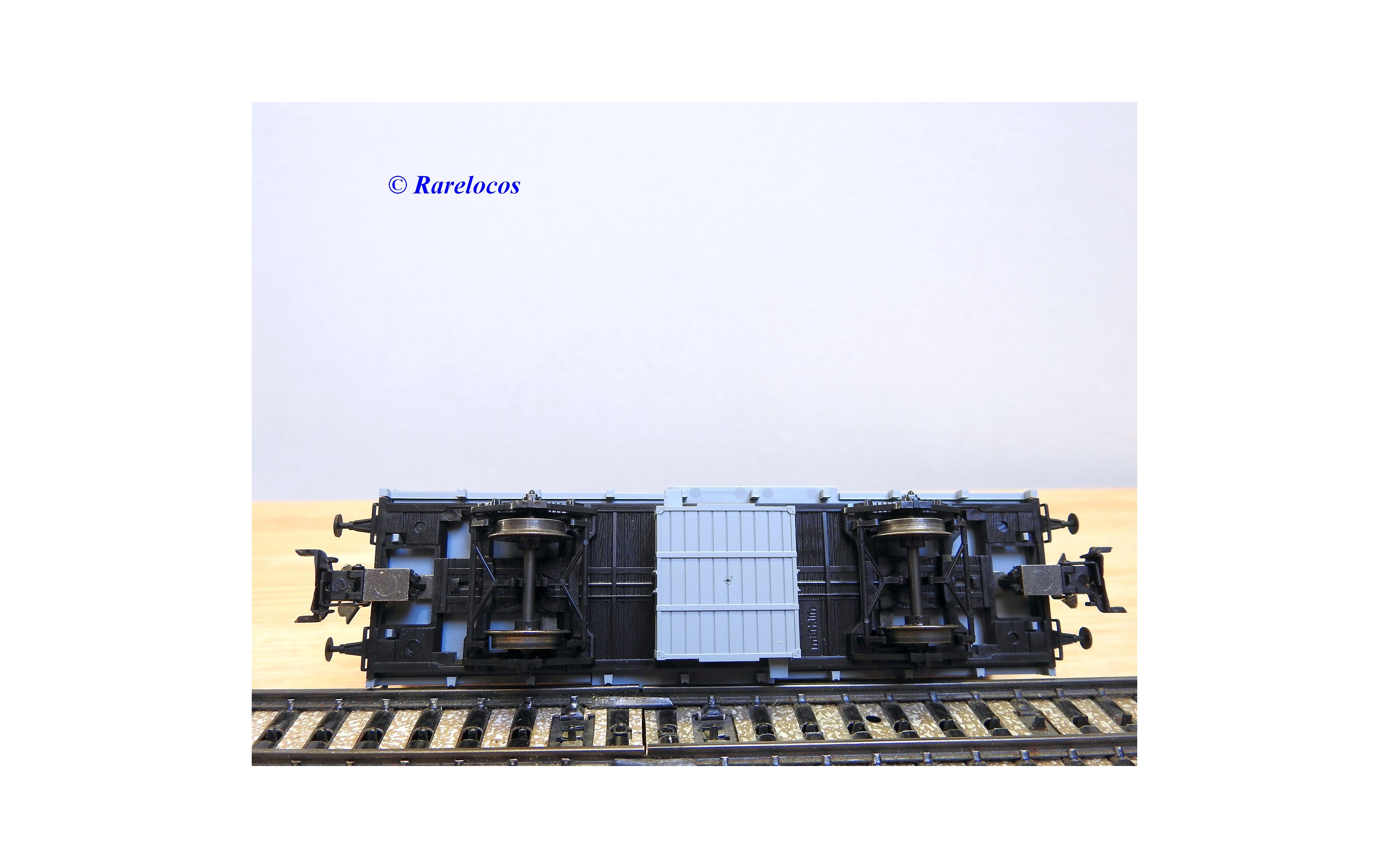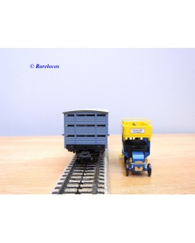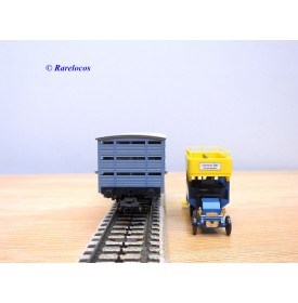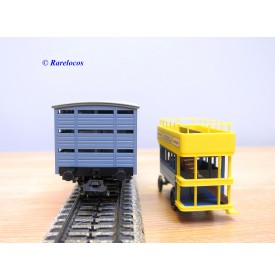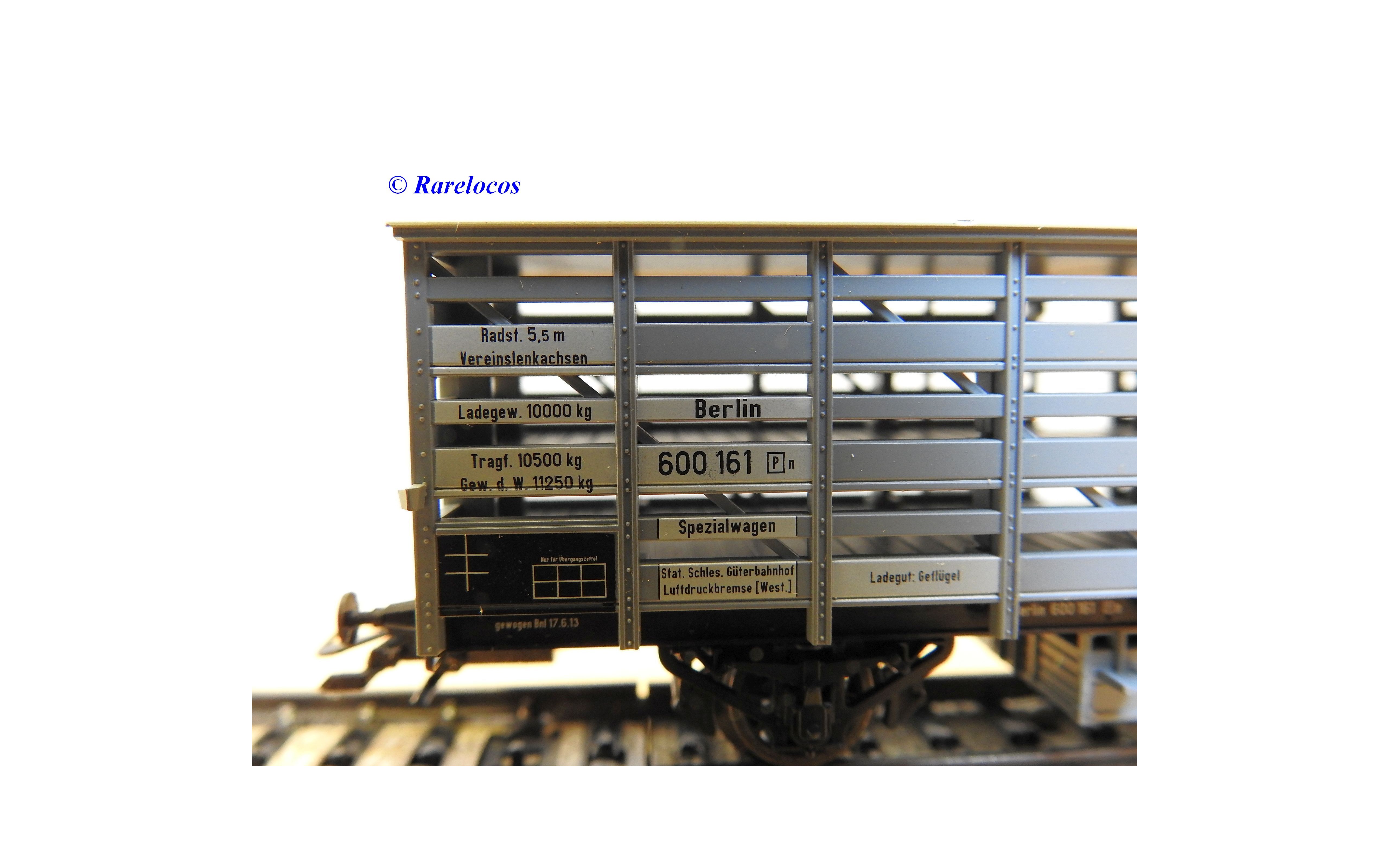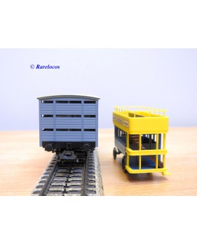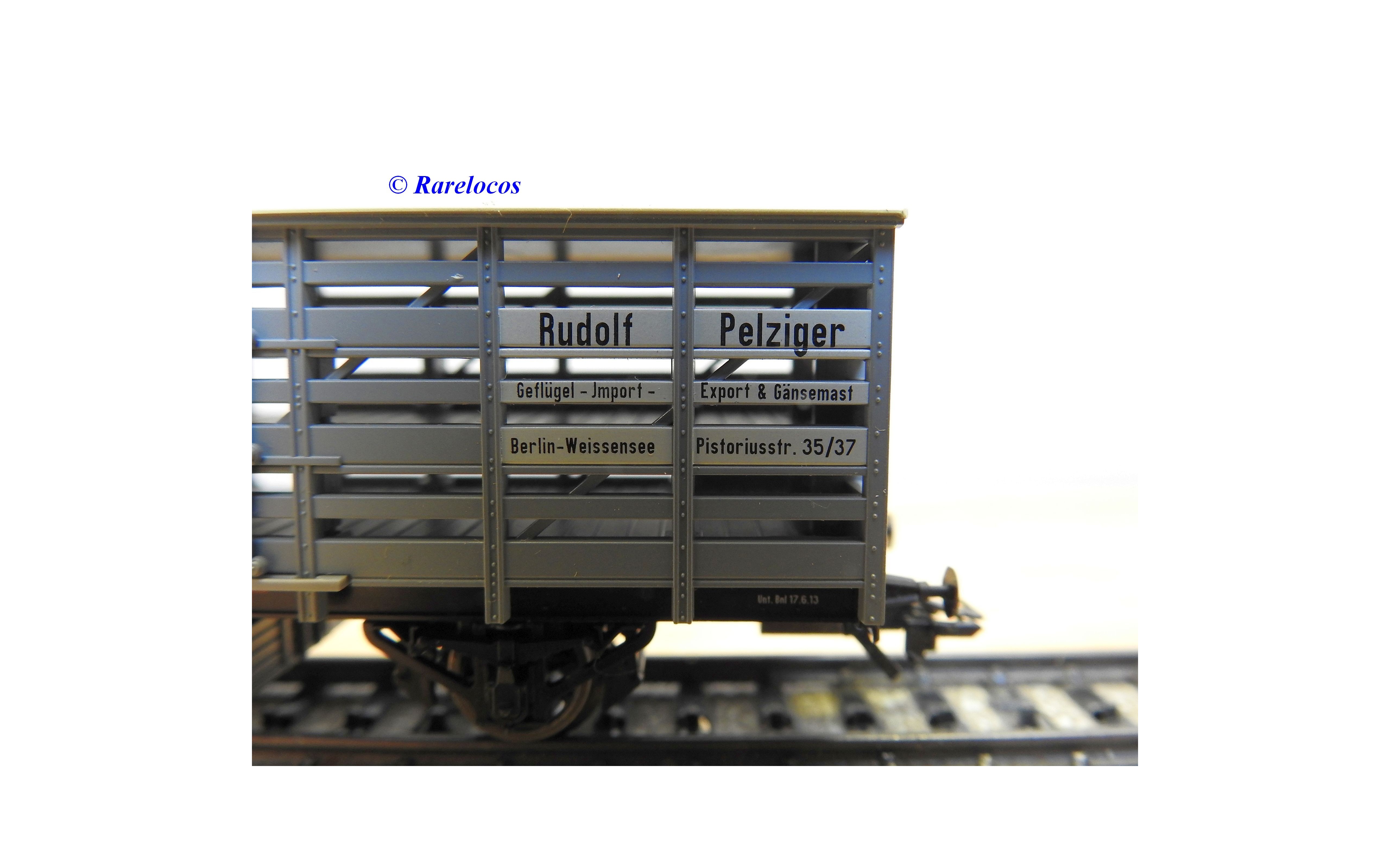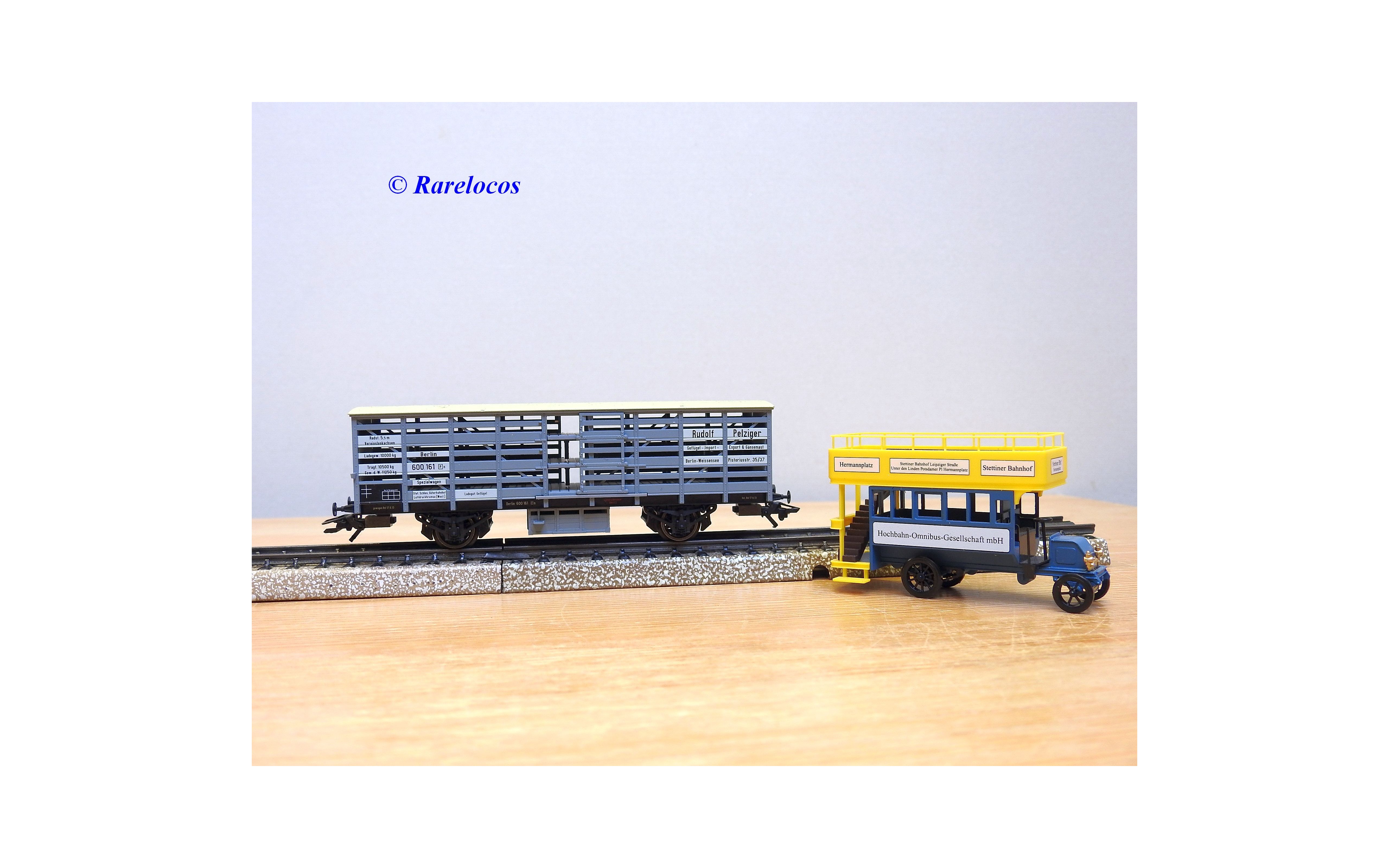 Wagon à claire voies pour le transport de petits animaux des chemins de fer allemands ( KPEV ), livrée grise à toit beige avec marquages Rudolf Petziger à Berlin, livré avec 3 colonnes Morris et un autobus Büssing à 2 étages en métal, boîte d'origine en très bon état.