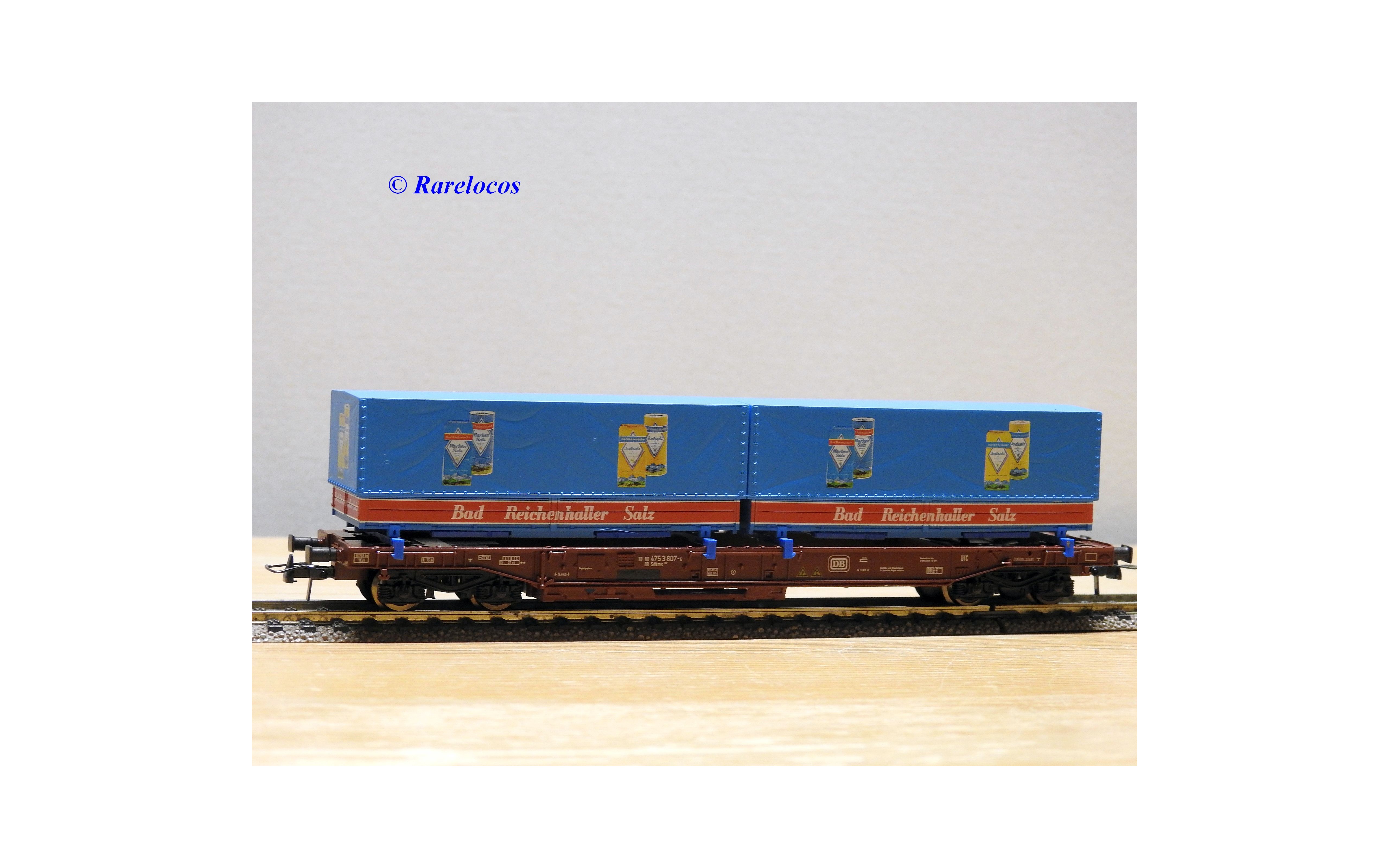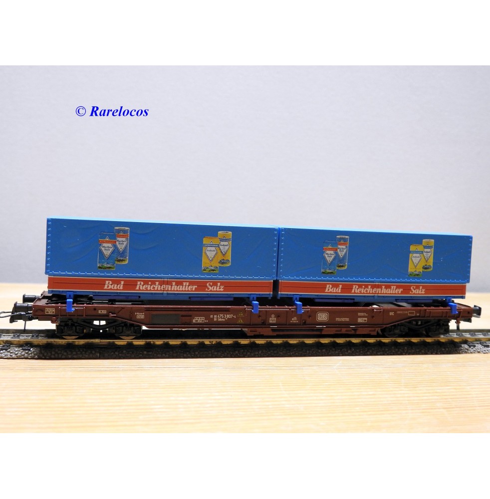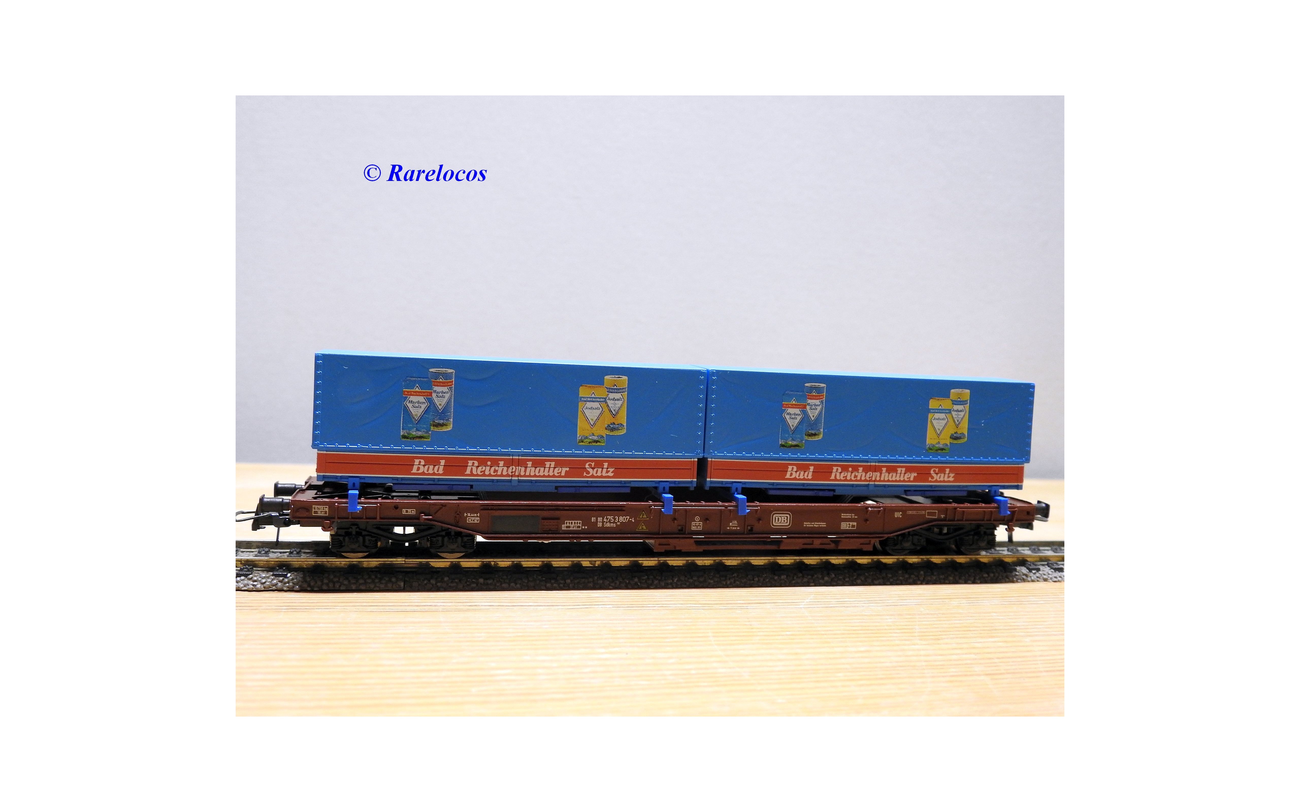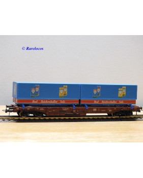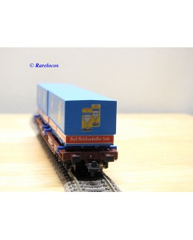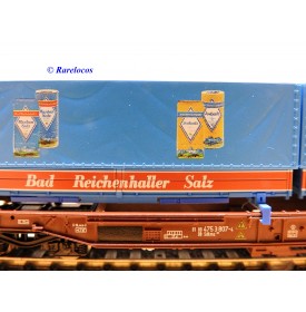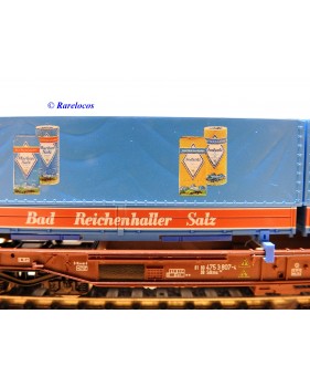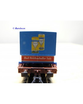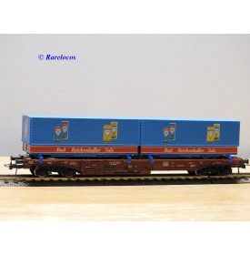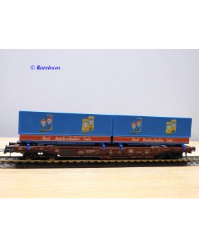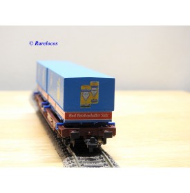 Wagon poche à 2 bogies type Sdkms des chemins de fer allemands ( DB ) , livrée marron, chargé de 2 conteneurs amovible de 20 ' aux couleurs de la société Bad Reichenhaller Salz, attelages à élongation, pièces de détaillage encore scellées, notice présente, boîte d'origine en excellent état.
