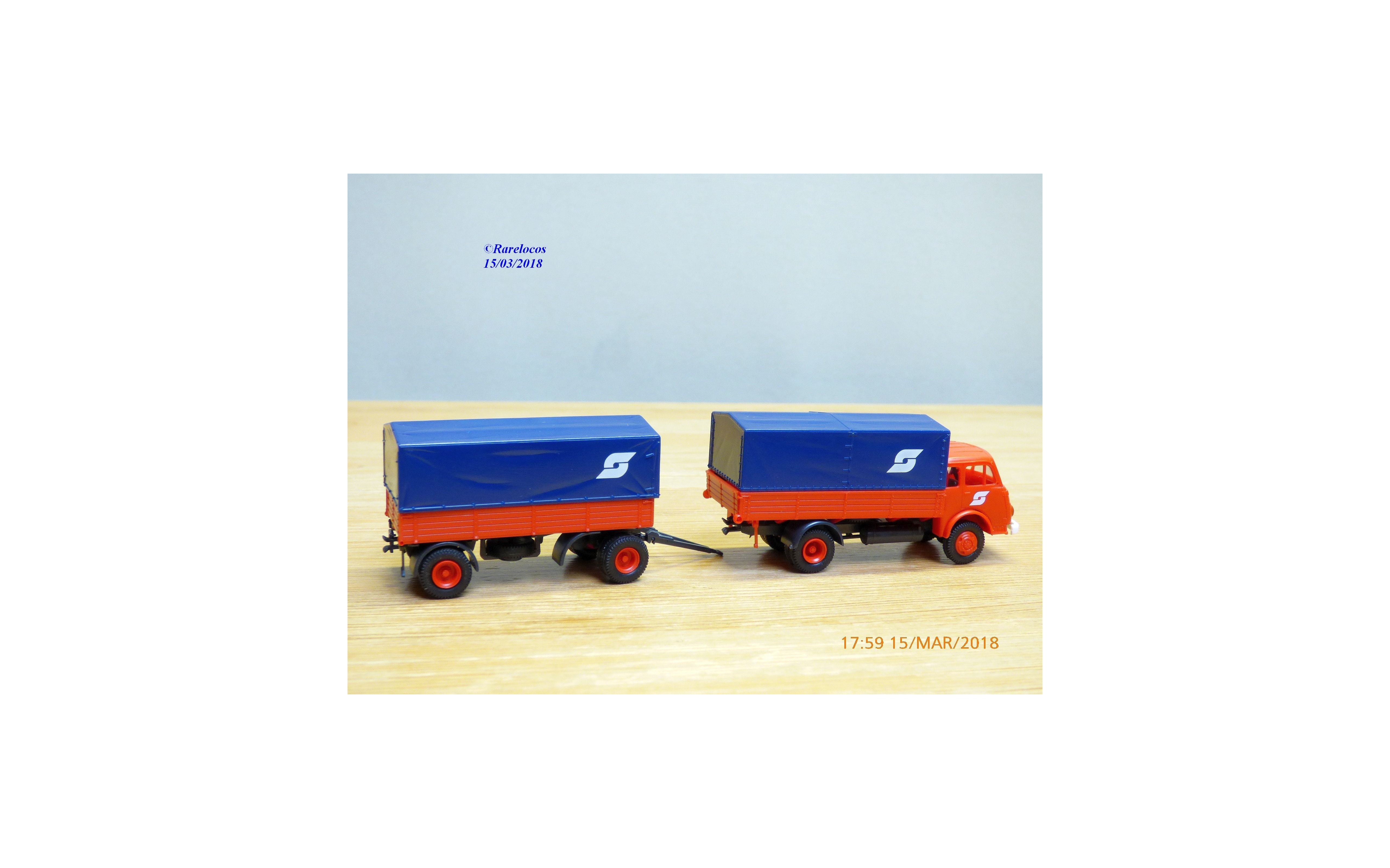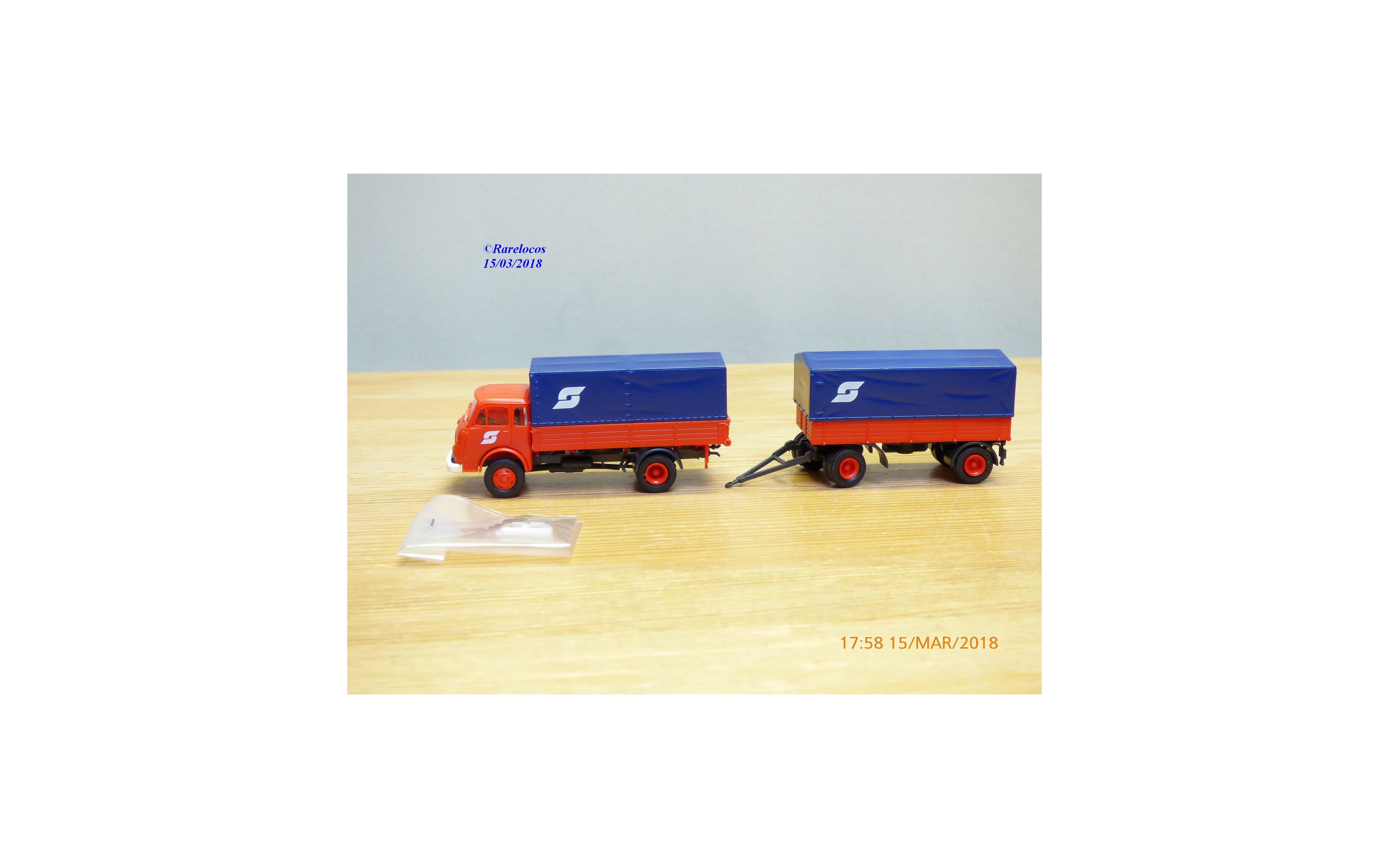 Modèle réduit à l'échelle du 1/87 ( HO ) d'un camion STEYR 680 et d'une remorque bâchés aux couleurs des chemins de fer autrichiens ( ÖBB ), pièces de détaillage encore scellées, notice présente, emballage d'origine état neuf .