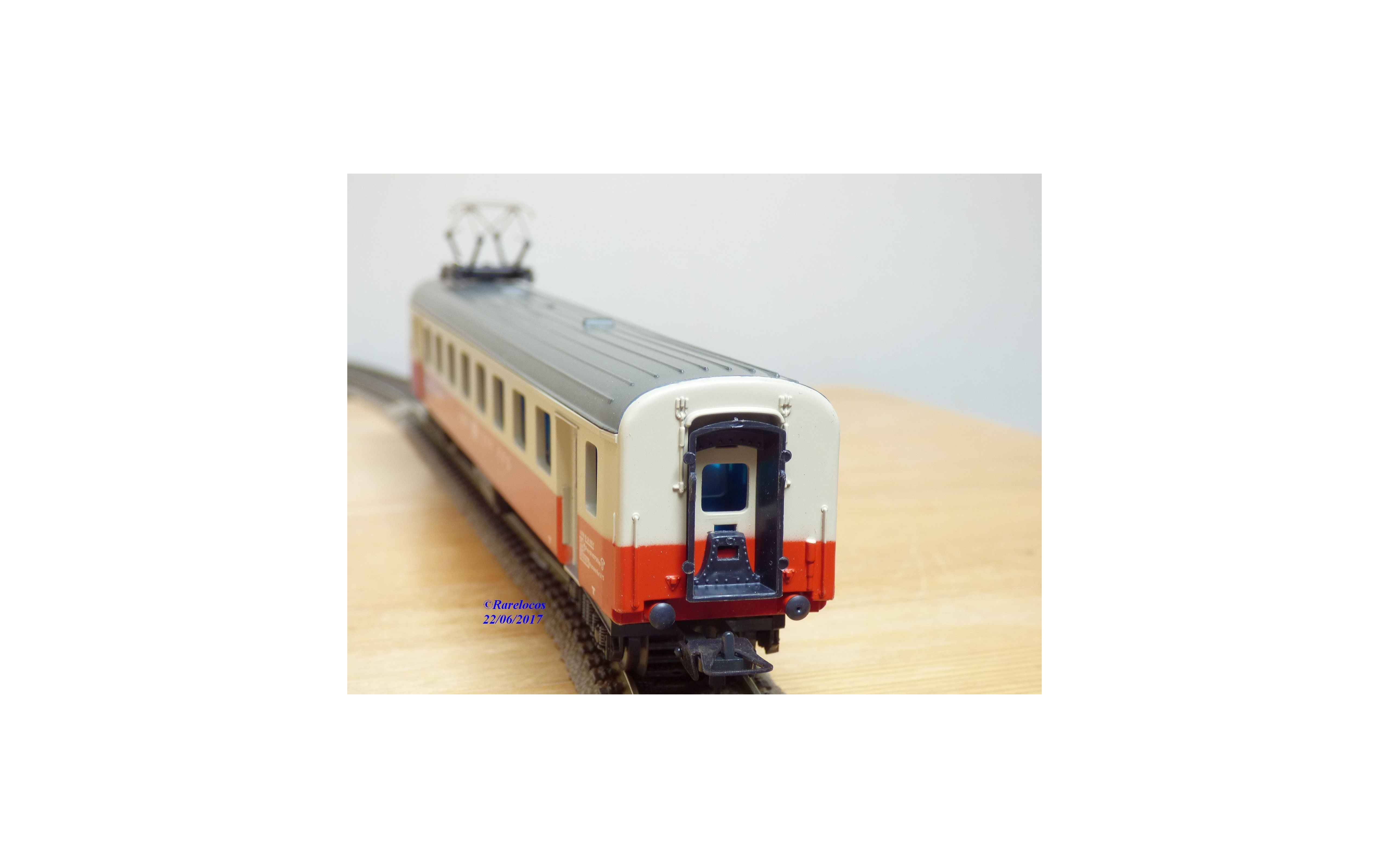 Voiture restaurant à pantographe des chemins de fer suisses (SBB / CFF / FFS ), livrée orange et crême dite Swiss Express, vitres bleutées, , immatriculation : A5085 18-34 000-7, boîte d'origine partielle.