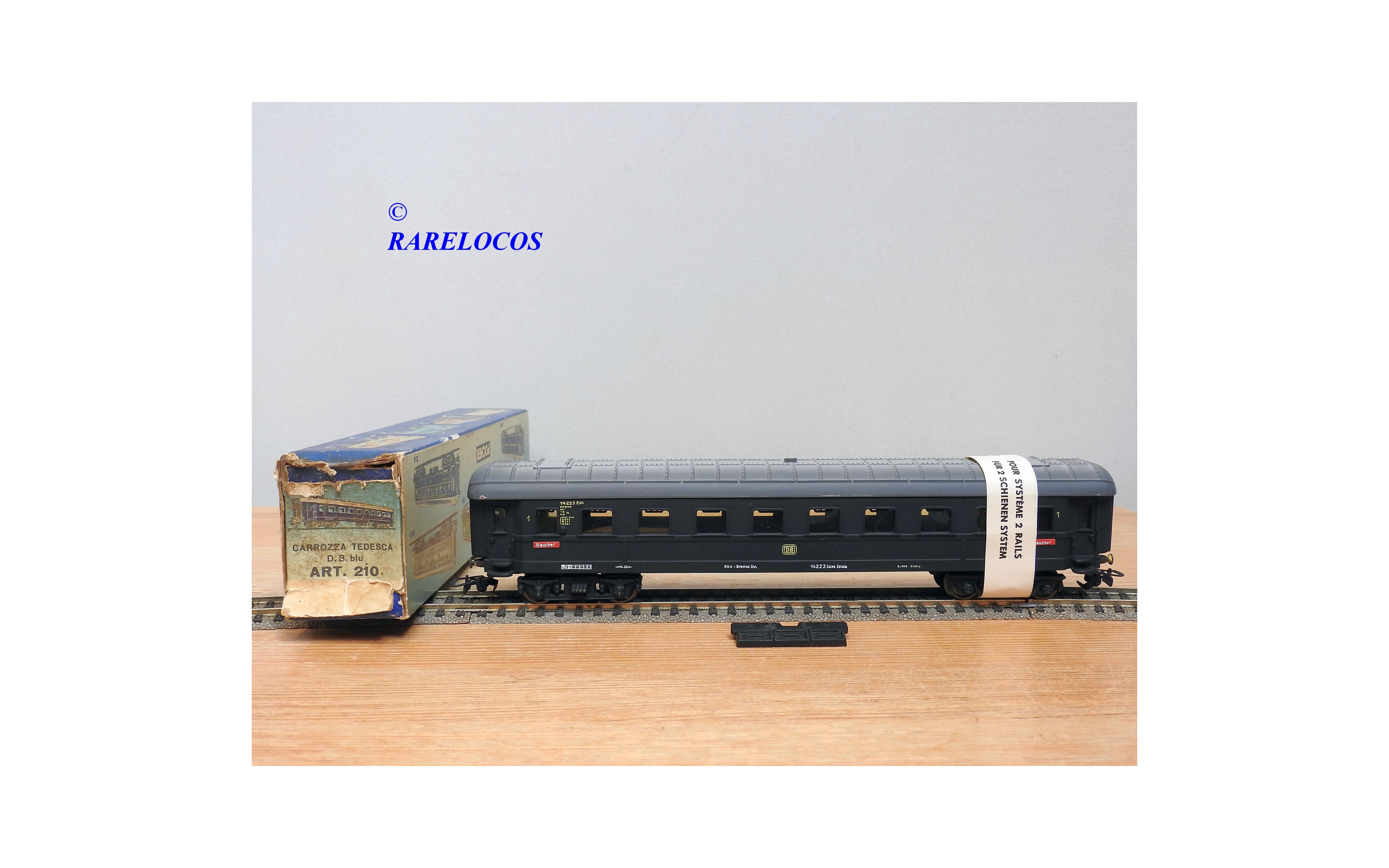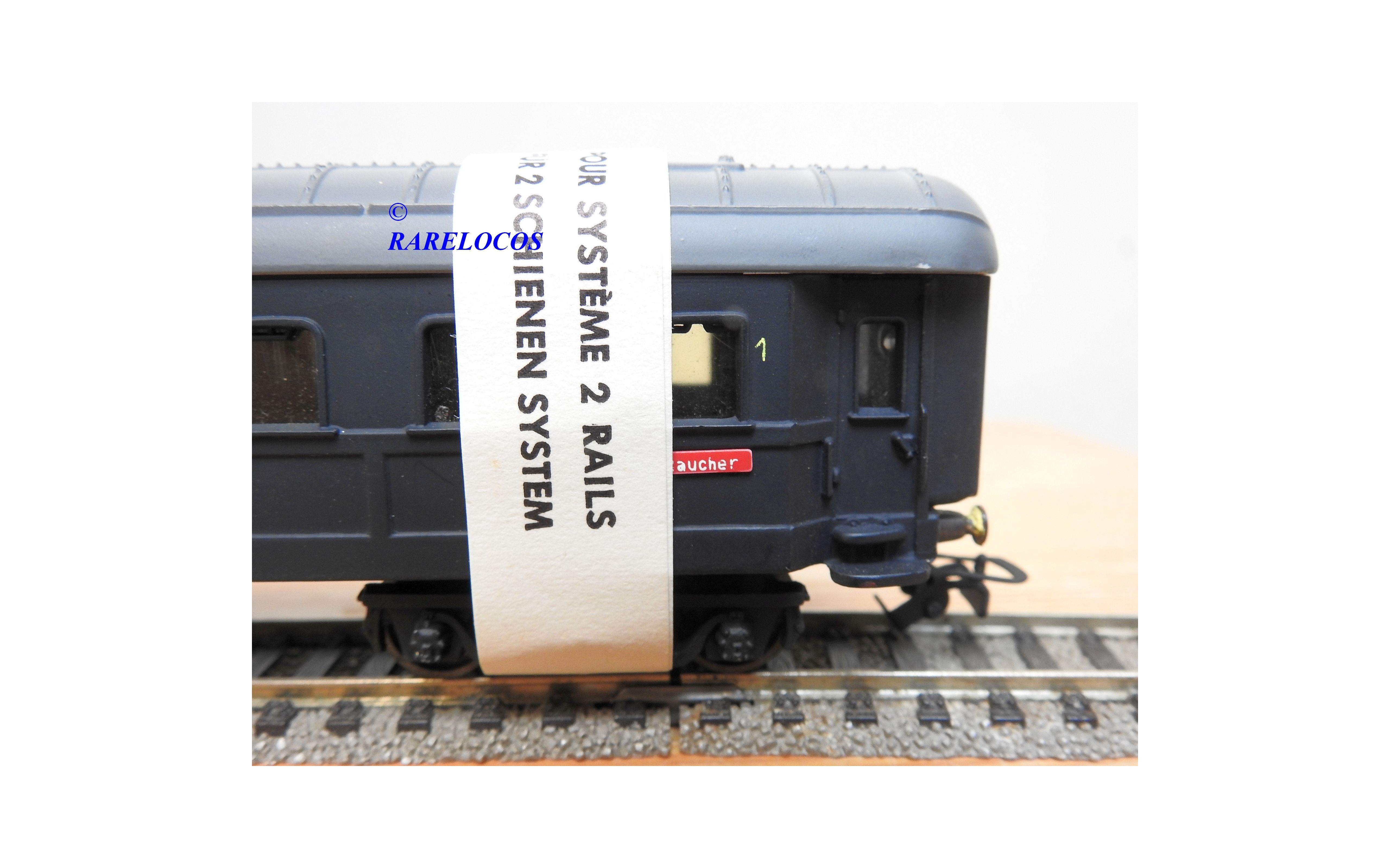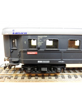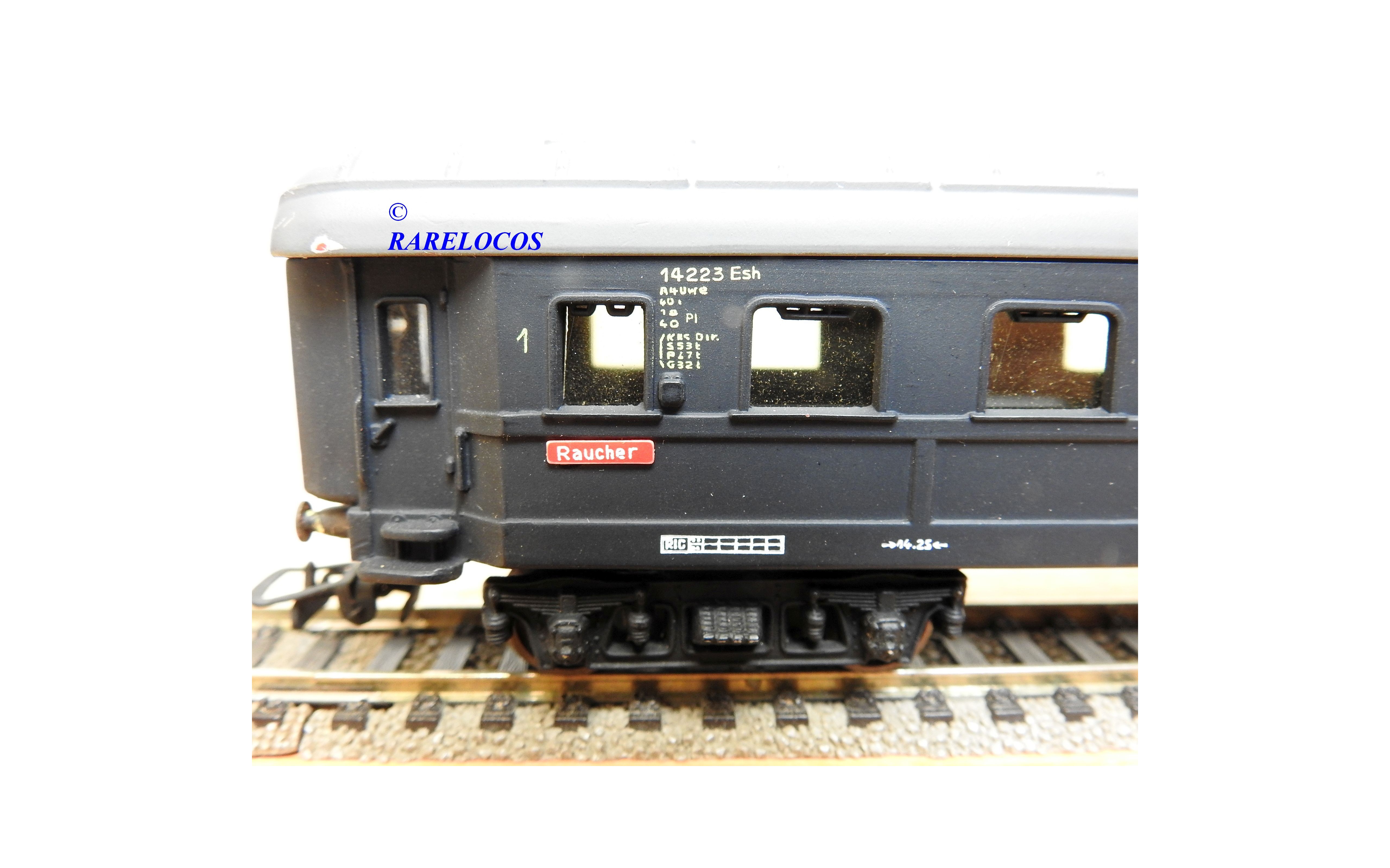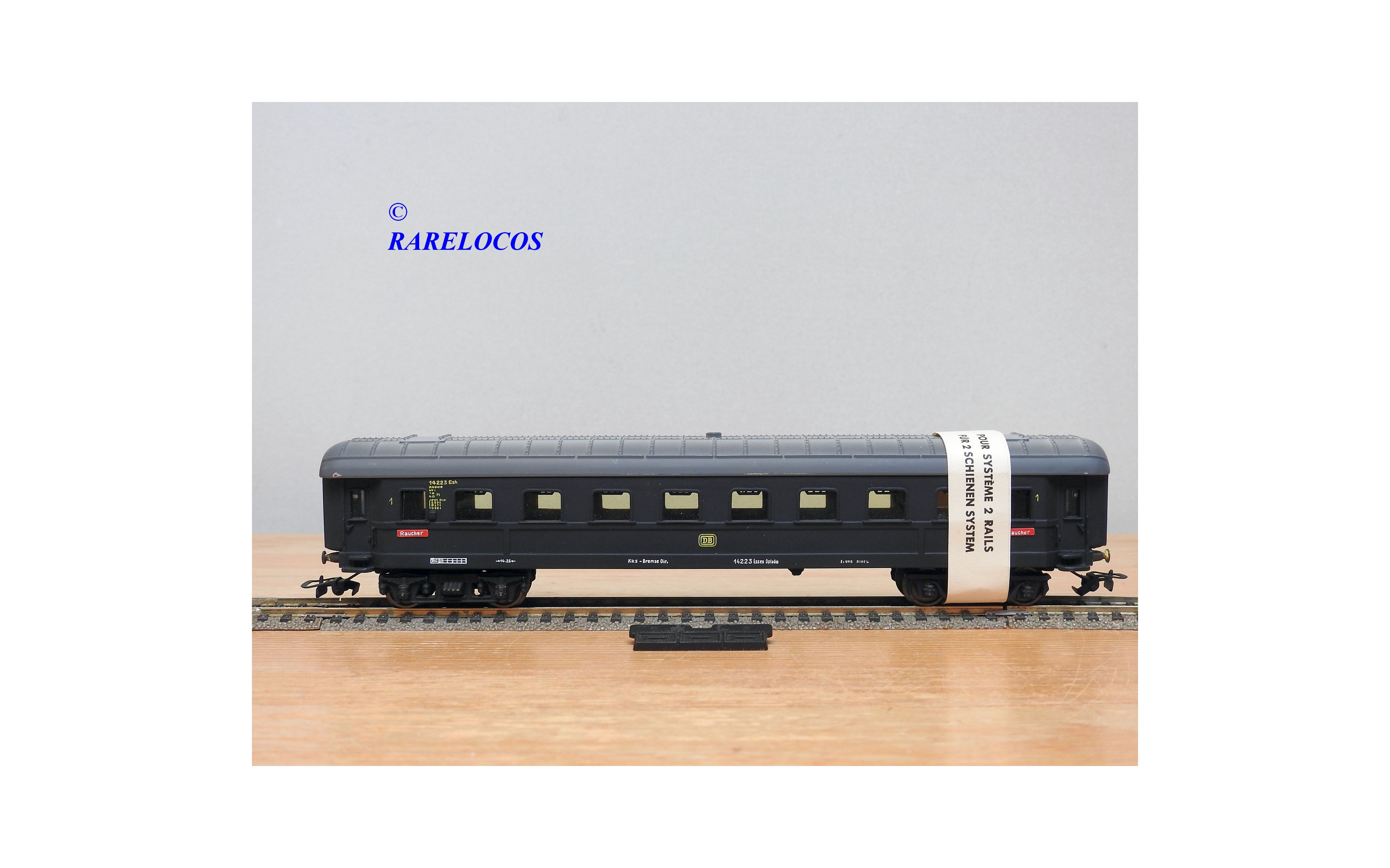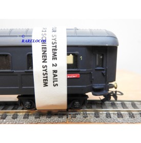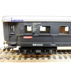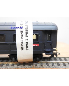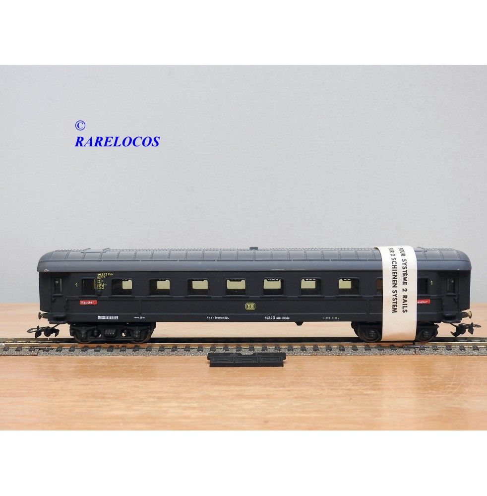 Très rare voiture grandes lignes de 1 ère classe à 2 bogies des chemins de fer allemands (DB ), livrée bleue à toit gris, en fait sur celle ci la couleur est très proche du noir mat ?, immatriculation :14223 Esh, boîte d'origine en état correct.