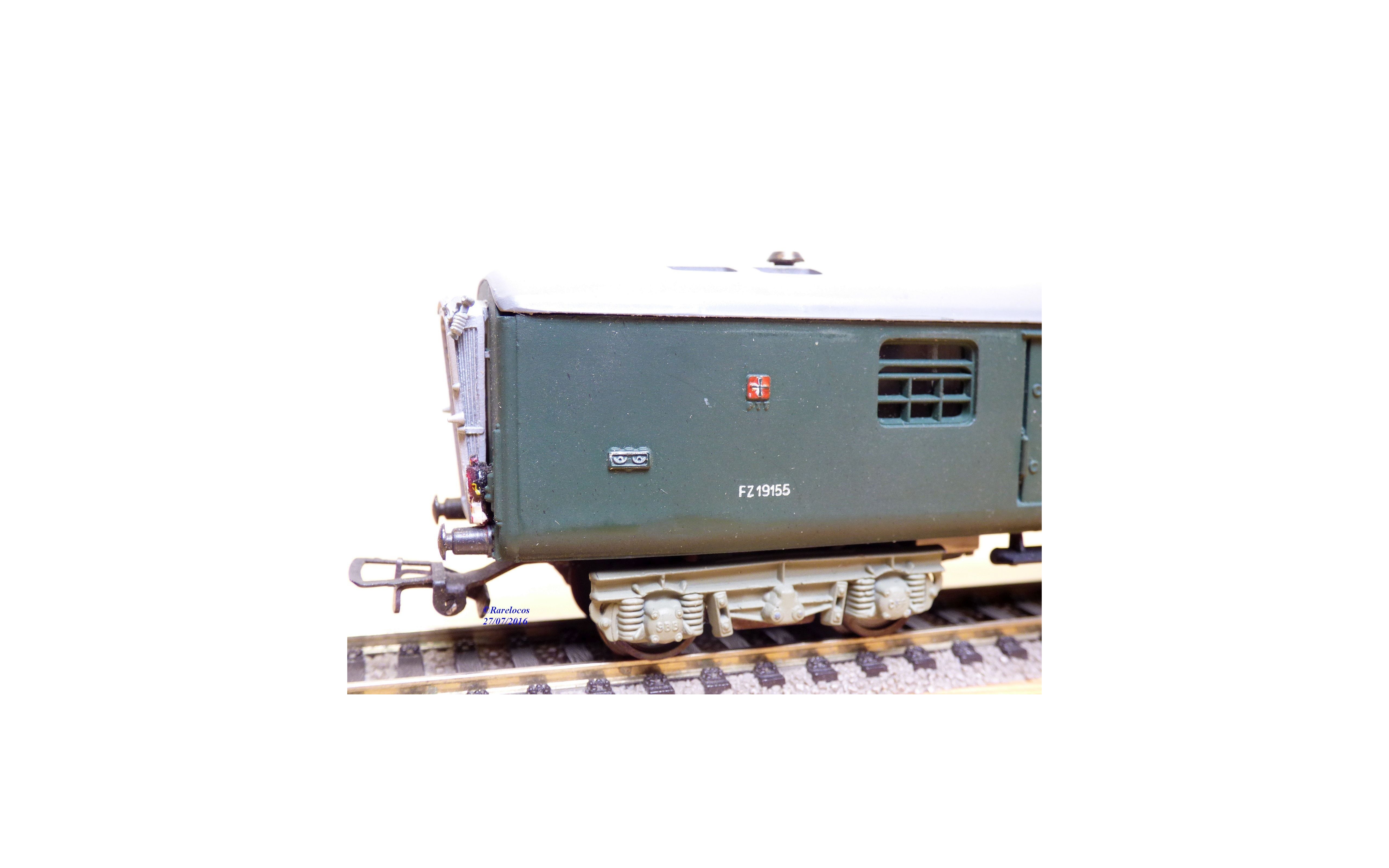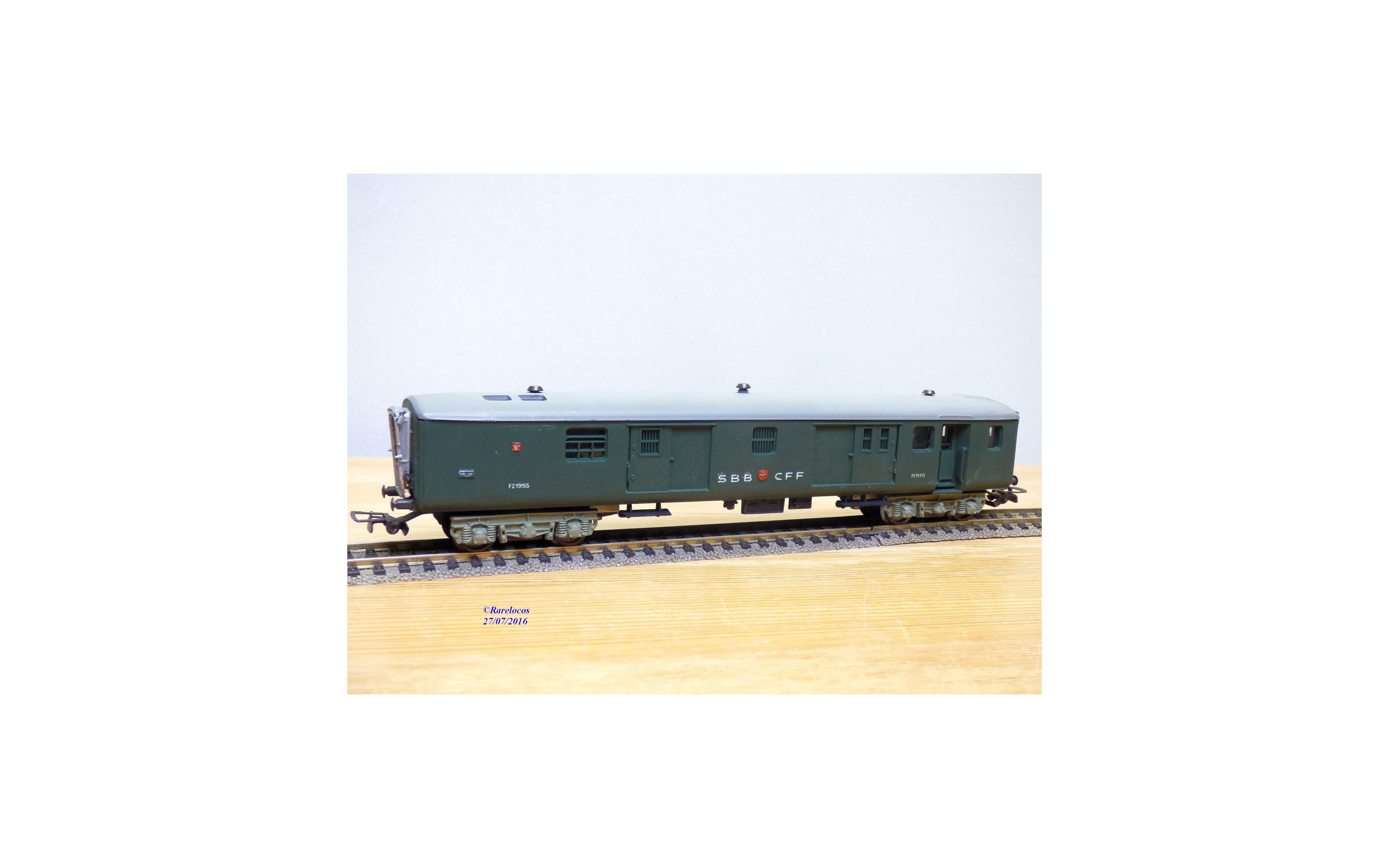 Fourgon à bagages à 2 bogies type Fz 4 ü des chemins de fer suisses ( SBB/CFF/FFS ), livrée vert sapin à toit gris, éclairage intérieur et feu de rouge de fin de convoi ( testé OK avec contact sur les 2 vis fixées aux bogies), immatriculation : Fz 19155, boîte d'origine en très bon état ( un doute sur le rabat d'identification).