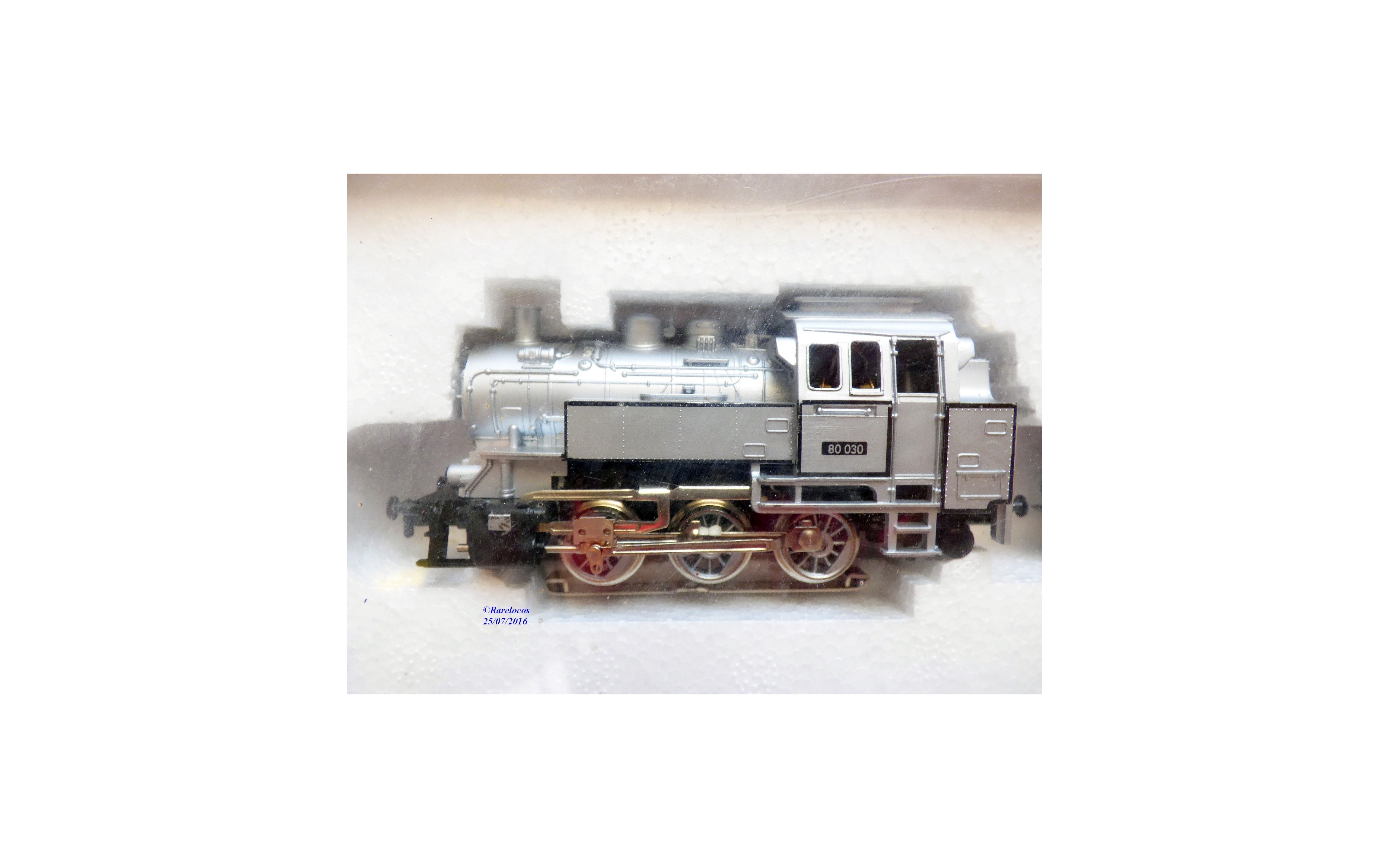 Coffret comprenant une locotender 030T série ( Br ) 80 des chemins de fer allemands ( DB ) en livrée gris argent et 4 voitures dont un fourgon à guérite, boîte d'origine en excellent état encore scellée.