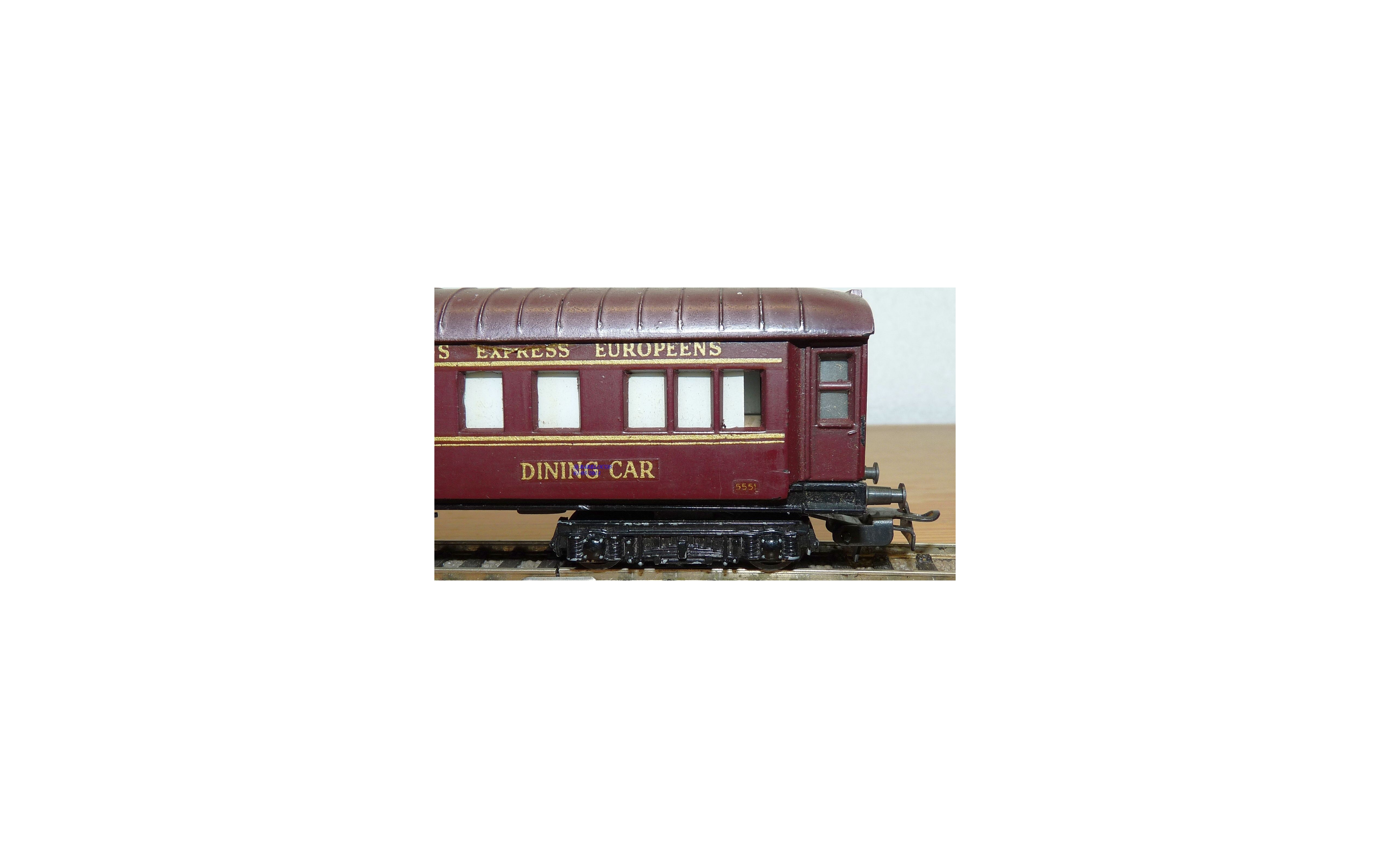 Rarissime voiture restaurant à 2 bogies des chemins de fer suisses et/ou de la CIWL ( SBB/CFF/FFS ), livrée rouge foncé à toit gris / rouge, immatriculation: 5551, boîte d'origine en bon état, mais pas la bonne référence .