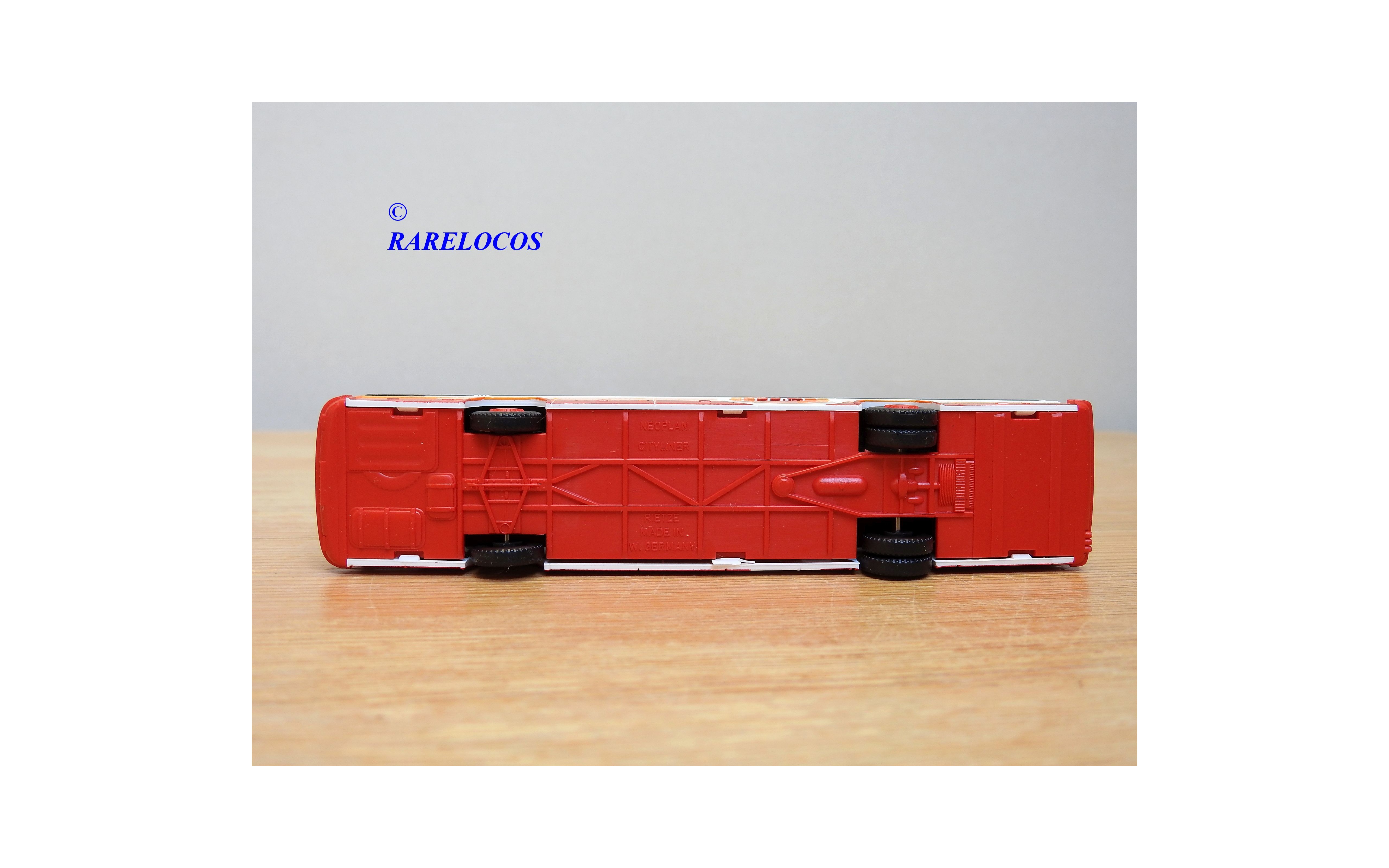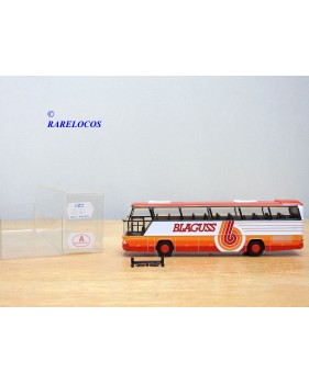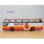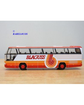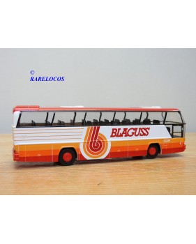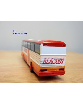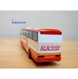 Modèle réduit à l'échelle du 1/87 ème ( échelle HO) de l'autocar NEOPLAN Cityliner N116 , livrée blanche, orange et rouge avec marquage publicitaire BLAGUSS , pièces de détaillage encore en grappes, boîte d'origine en état neuf.