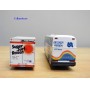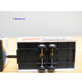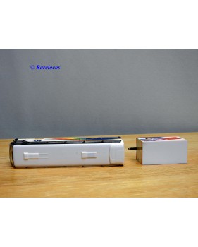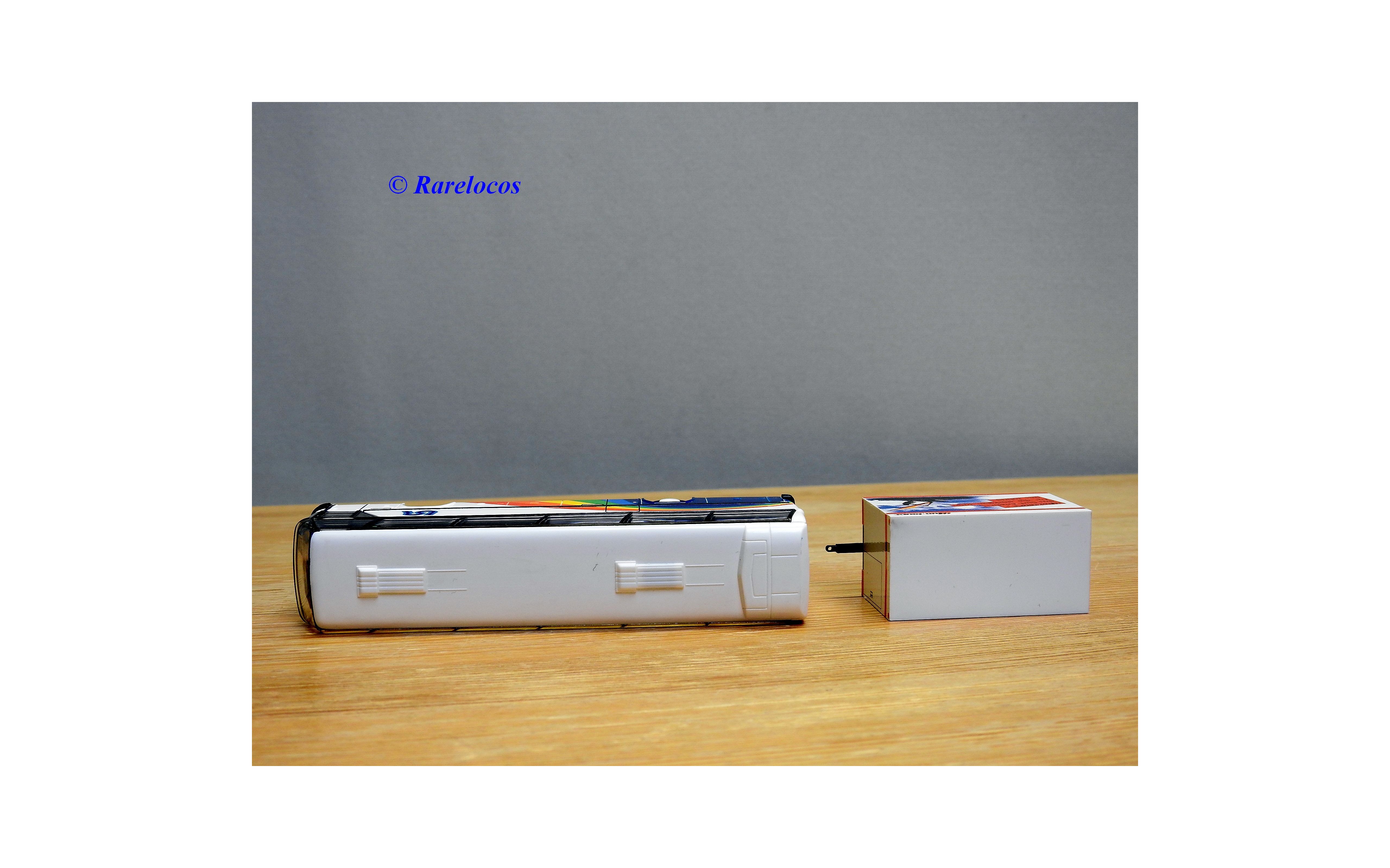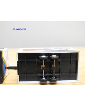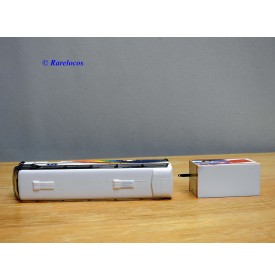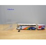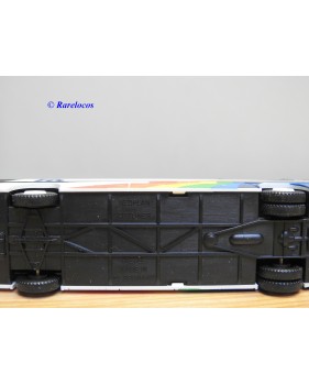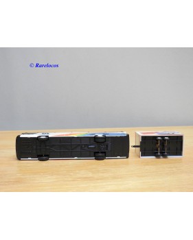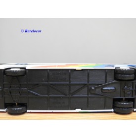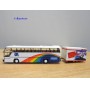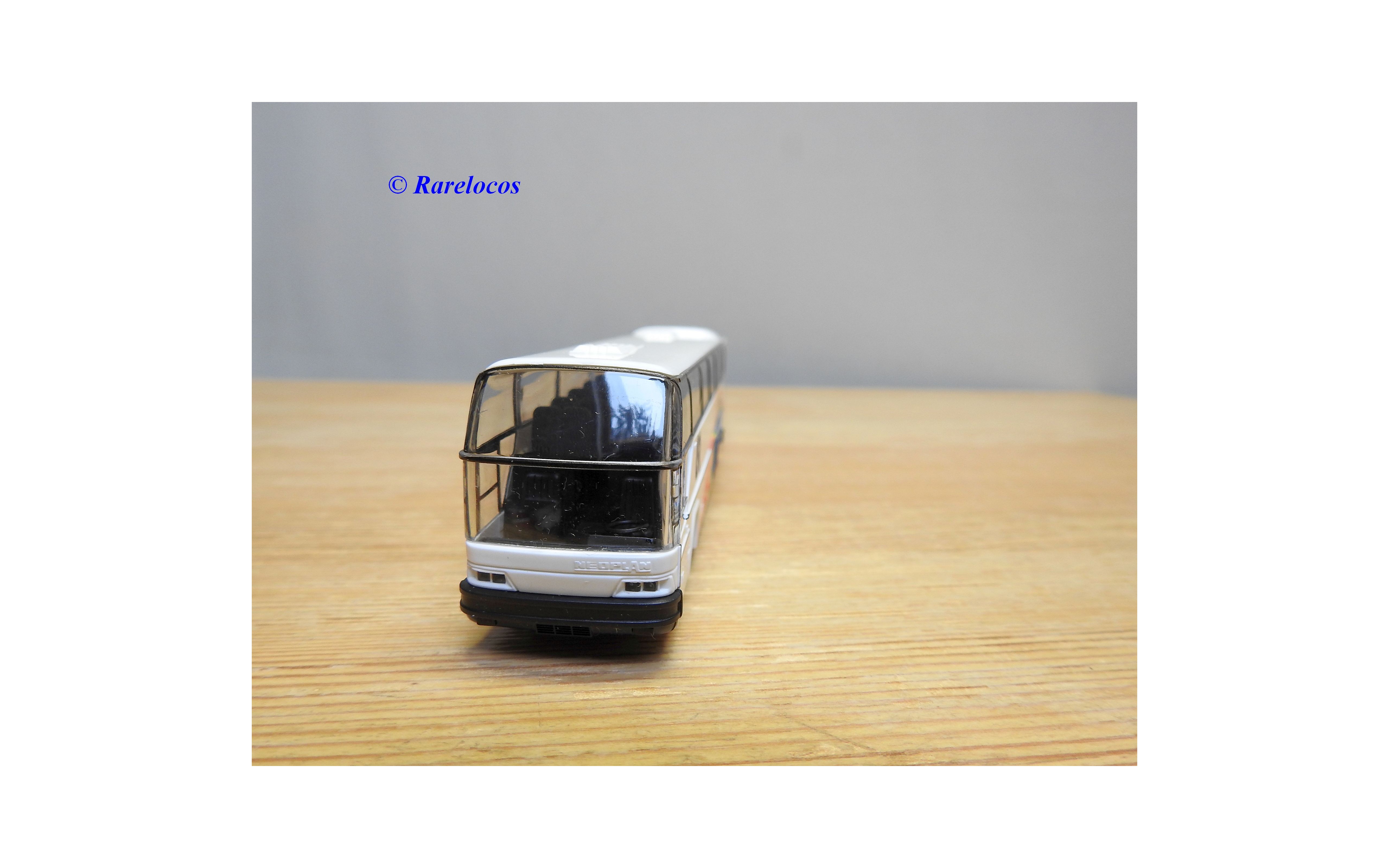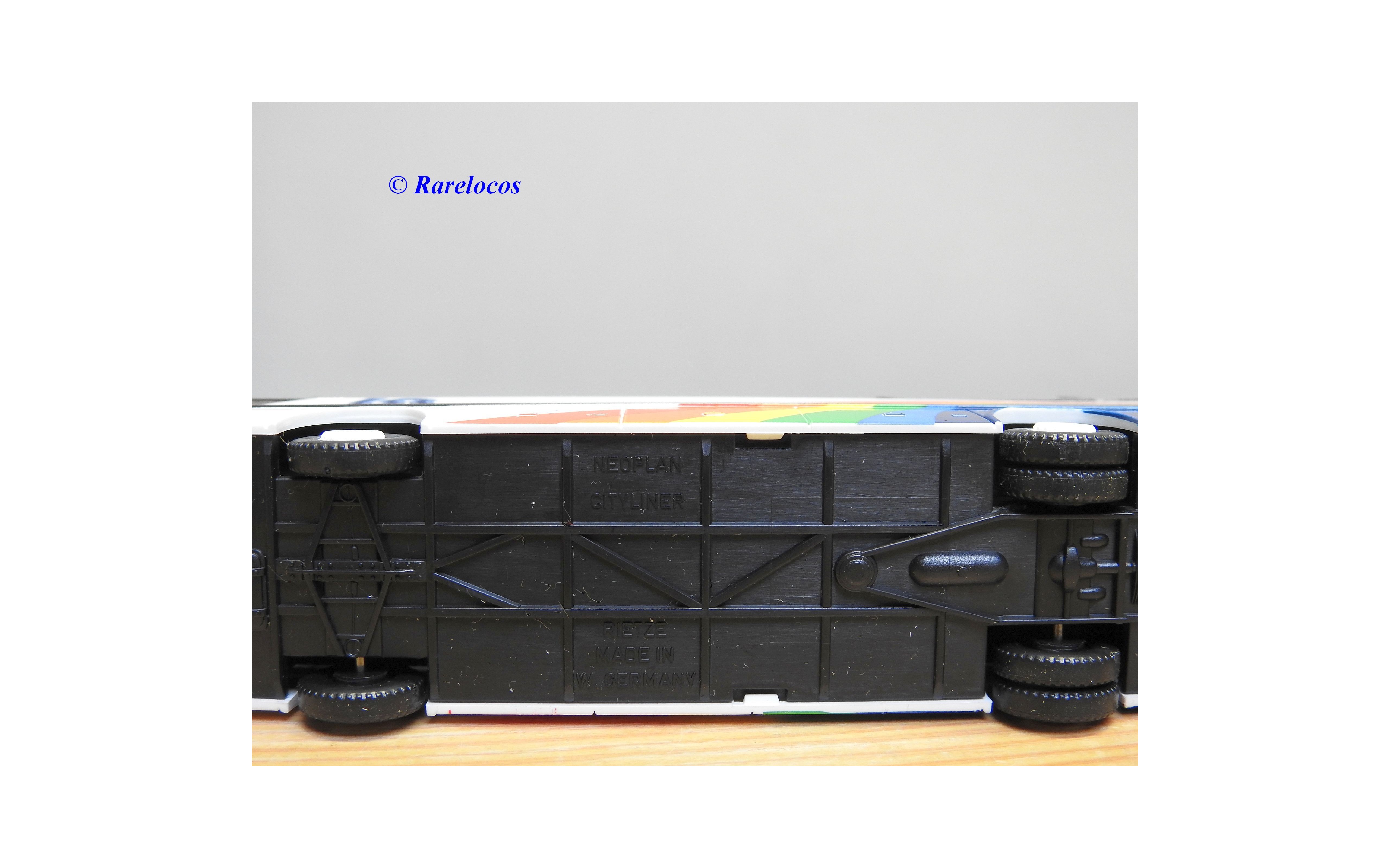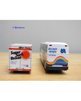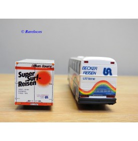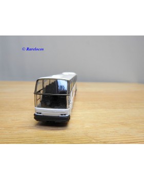 Modèle réduit à l'échelle du 1/87 ème ( échelle HO) de l'autocar NEOPLAN Cityliner N166, livrée blanche à motifs bariolés avec marquage publicitaire Beckinger Reisedienst, pièces de détaillage encore en grappes, boîte d'origine en bon état.