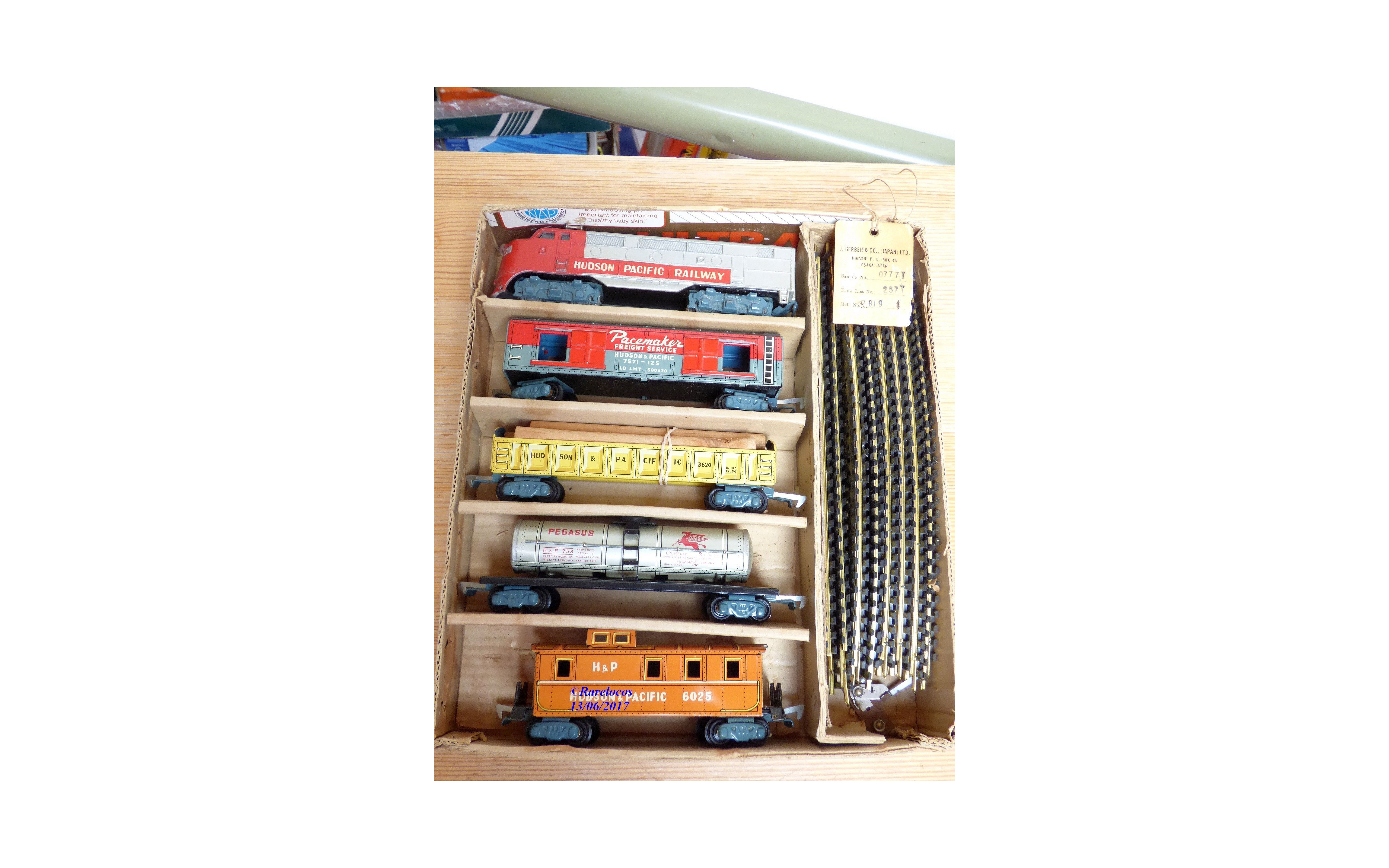 Rare coffret représentant un convoi marchandise des chemins de fer américains ( HUDSON PACIFIC : compagnie inconnue ), tout en métal, boîte d'origine en état correct pour son âge.
