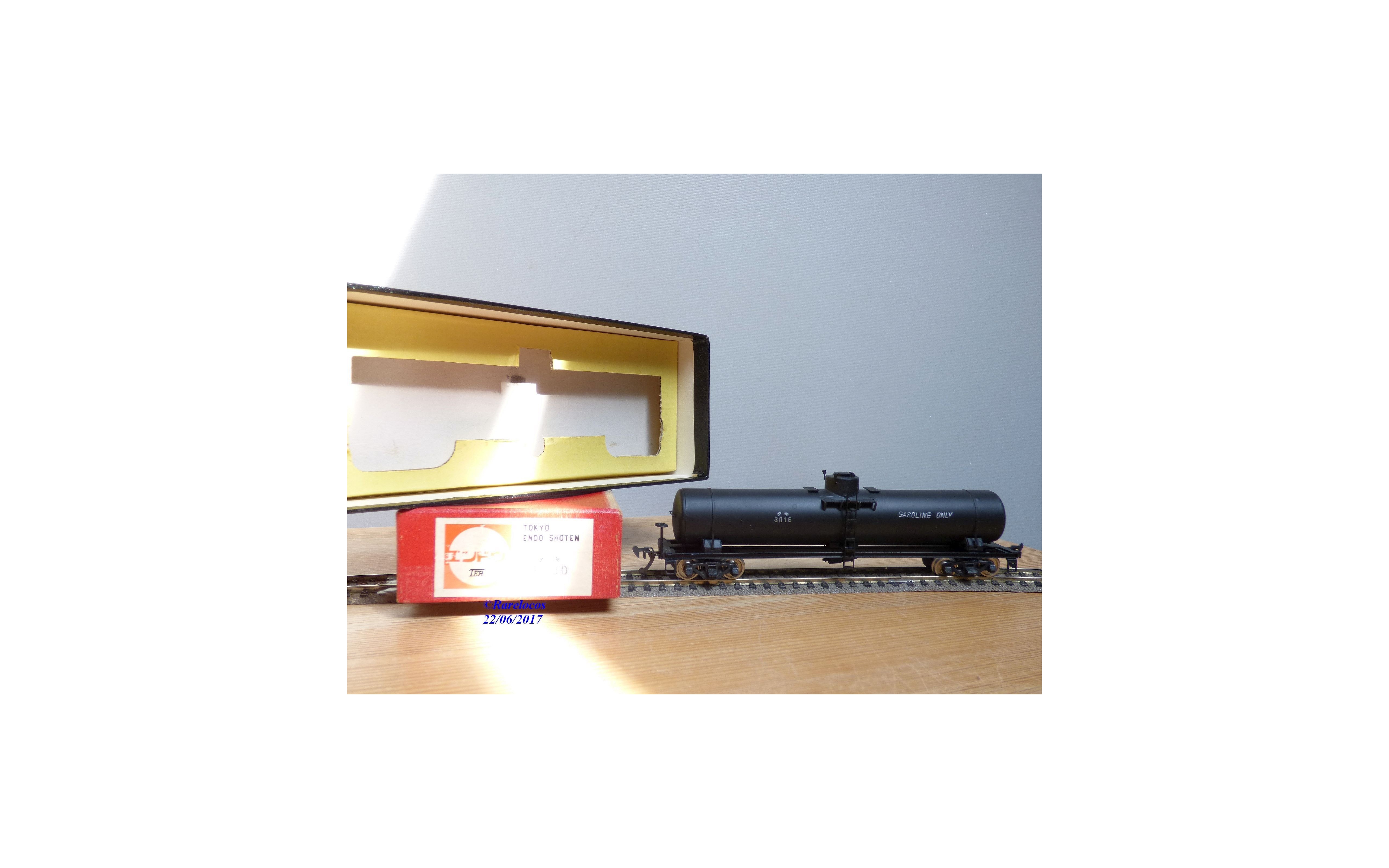 Rare wagon citerne à 2 bogies à plate forme de serre freins des chemins de fer japonais ( JNR ), tout en métal, livrée noir mat avec marquage Gasoline only, immatriculation : 3016, boîte d' origine en excellent état.