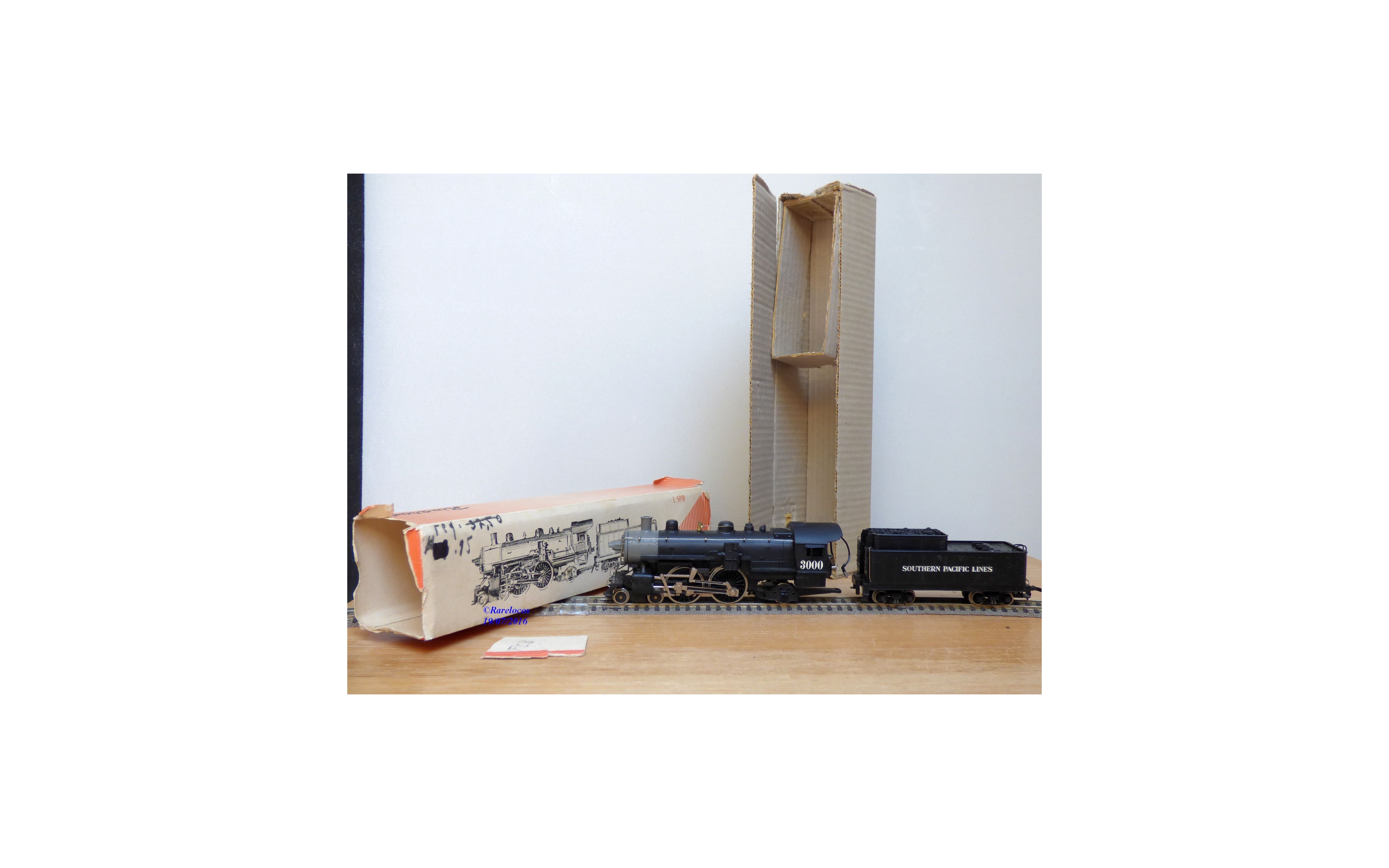 Très rare locomotive à vapeur type Atlantic 4-4-2 ( 221 ) des chemins de fer américains ( SP : Southern Pacific Lines), livrée noire et argent, immatriculation : 3000, boîte d'origine en état correct ( manquent les rabats d' extrémités) .