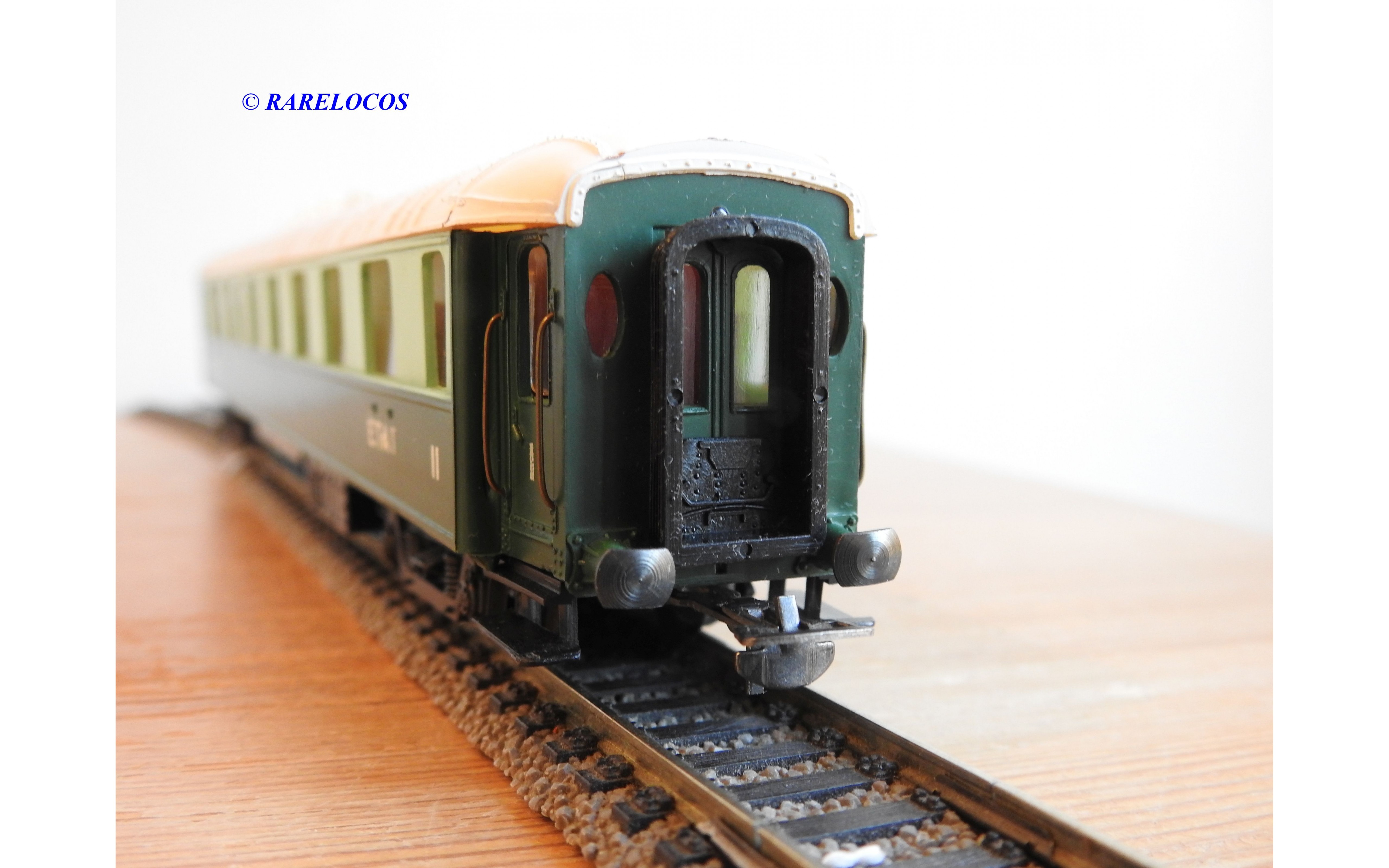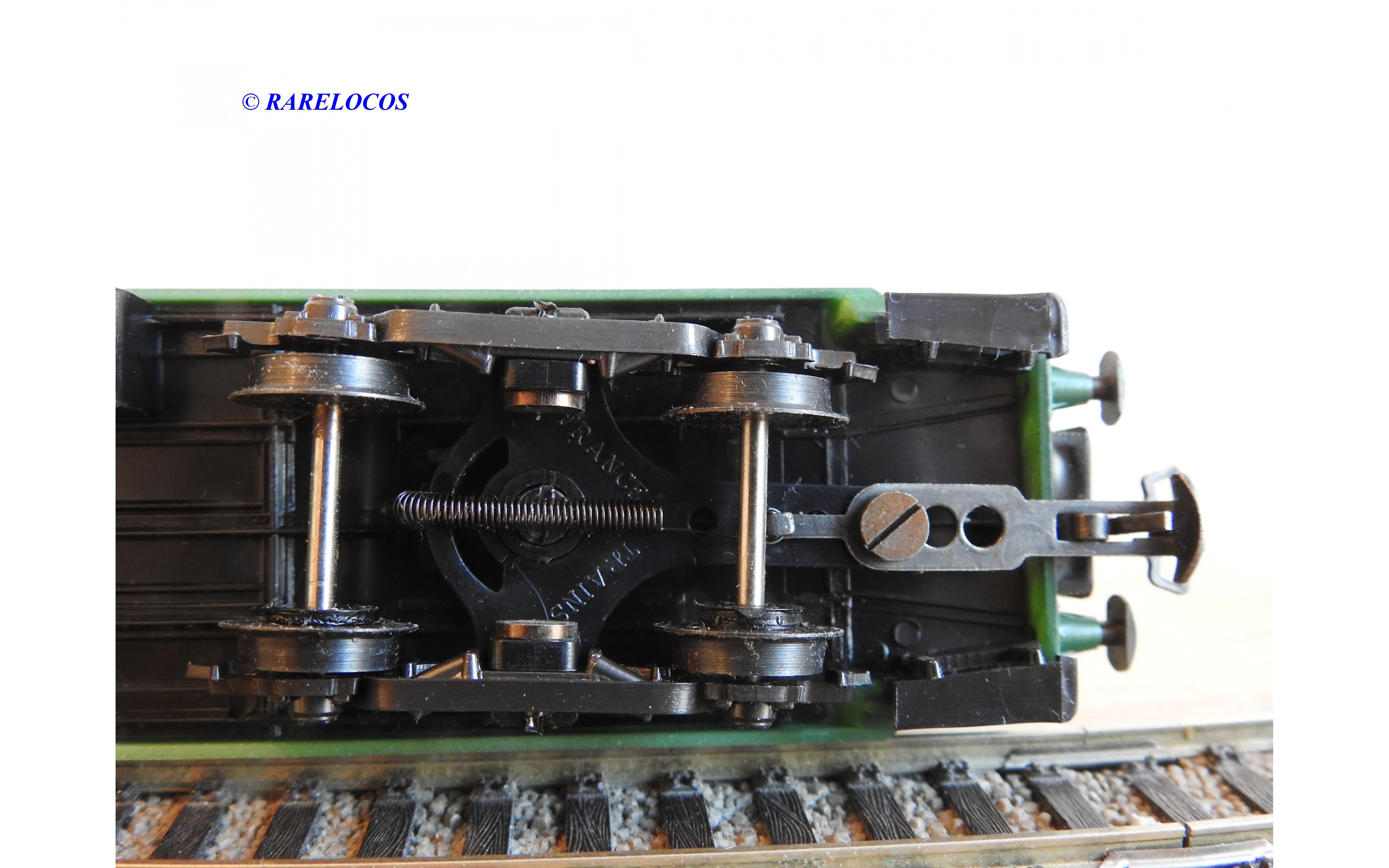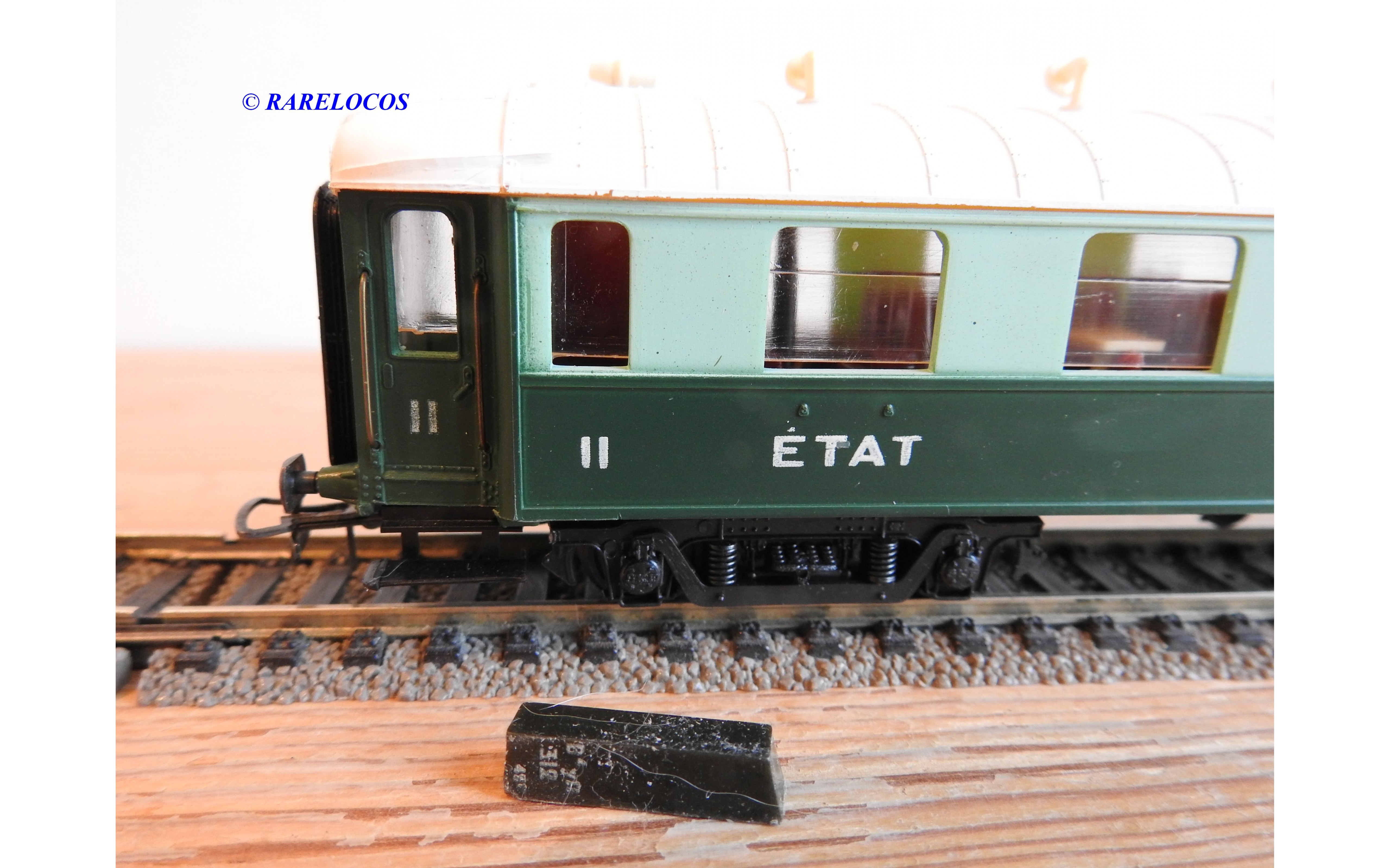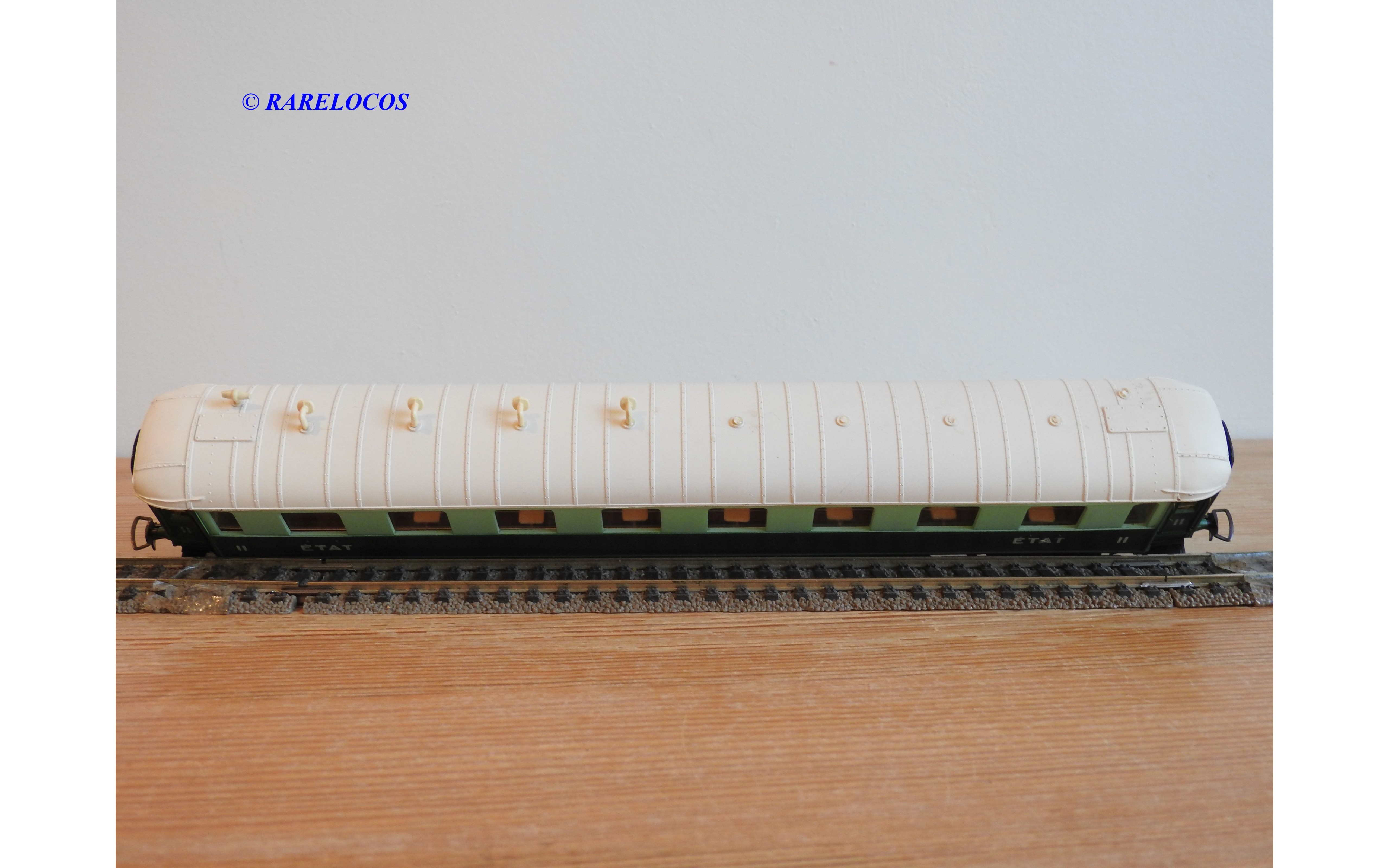 Voiture salon de 2 ème classe à bogies type B4 dite Transatlantique des chemins de fer français ( ETAT ), livrée en 2 tons de vert à toit blanc, aménagements intérieur, immatriculation : B4 yfi 312, notice présente, boîtte d'origine en bon état.