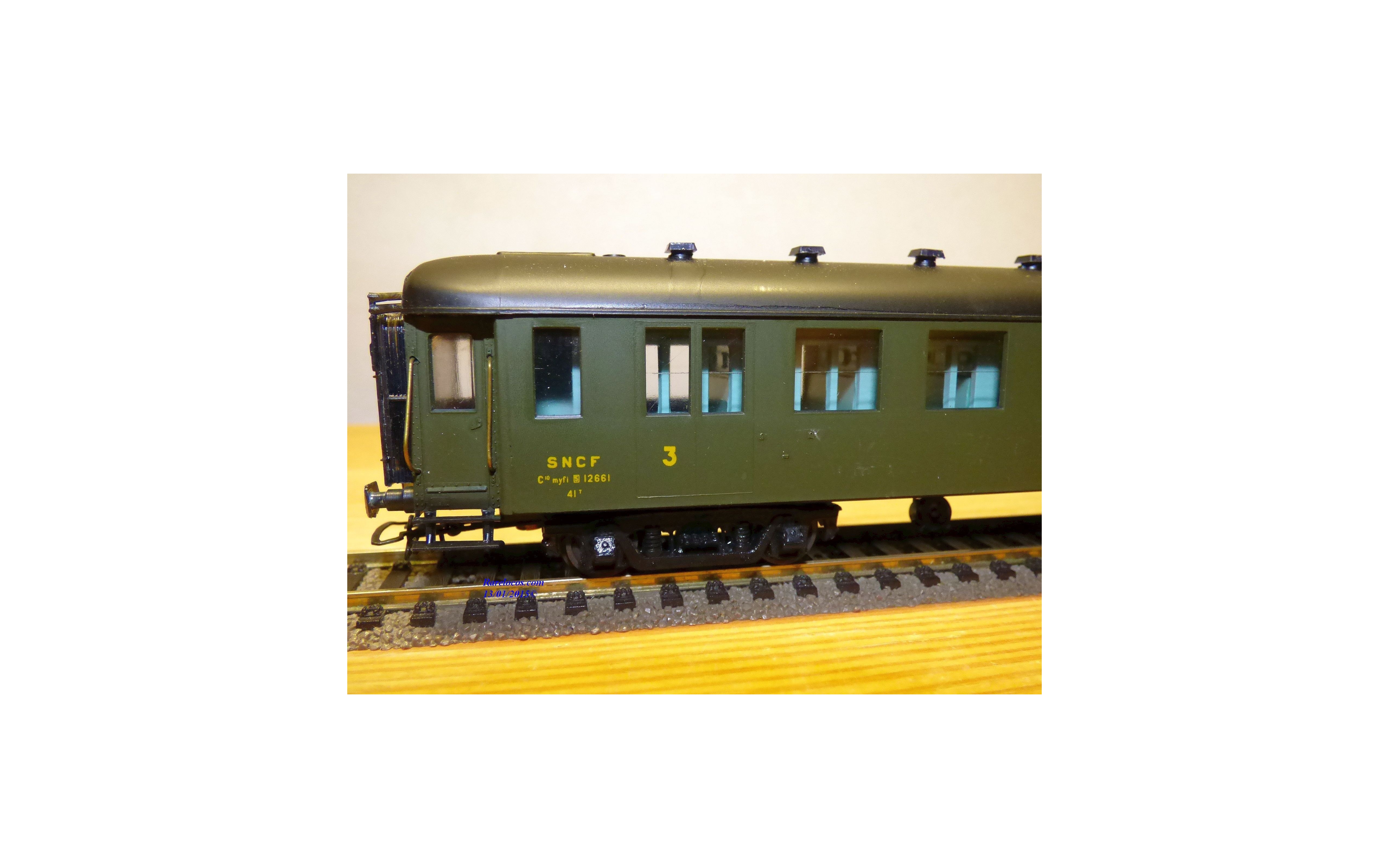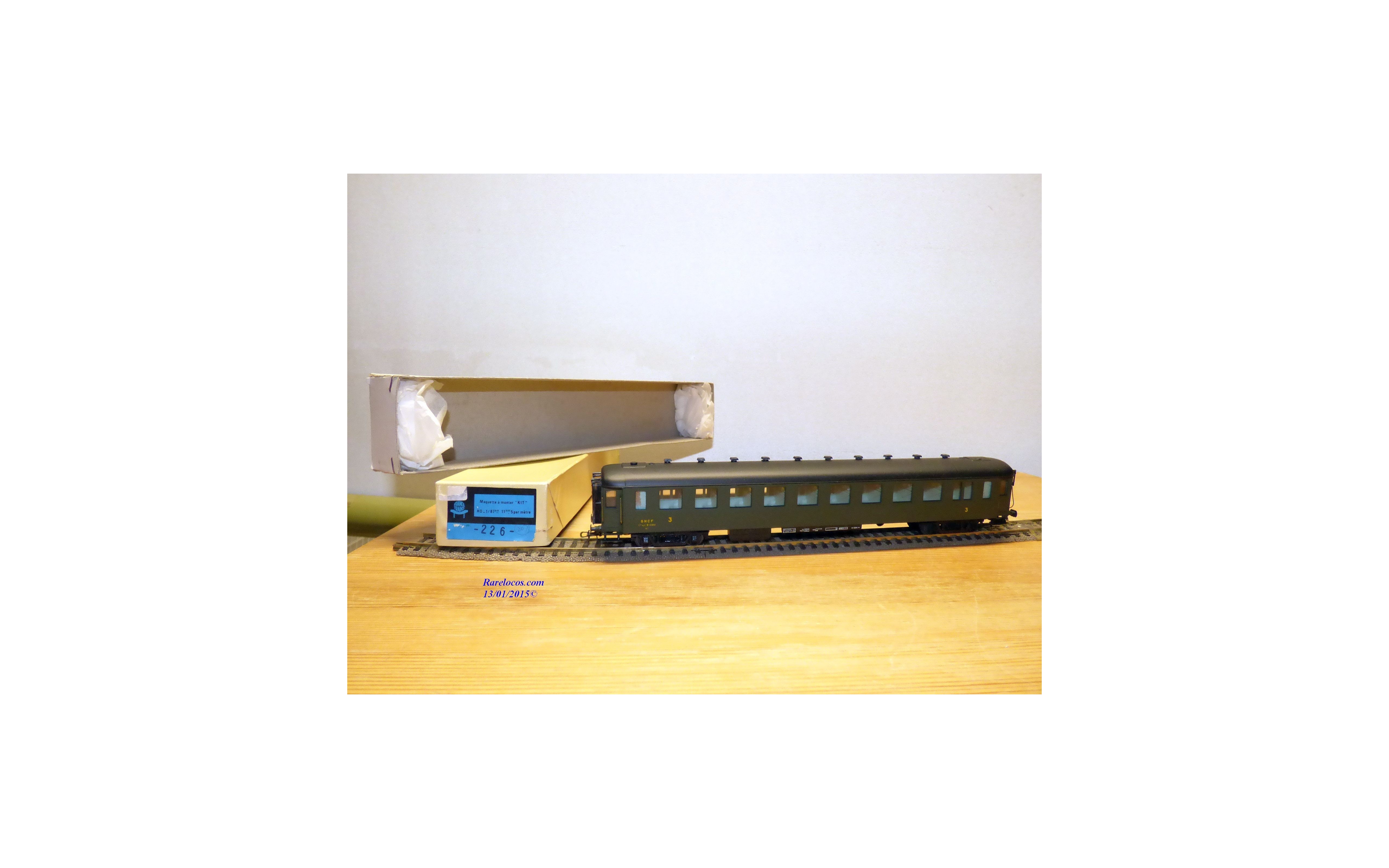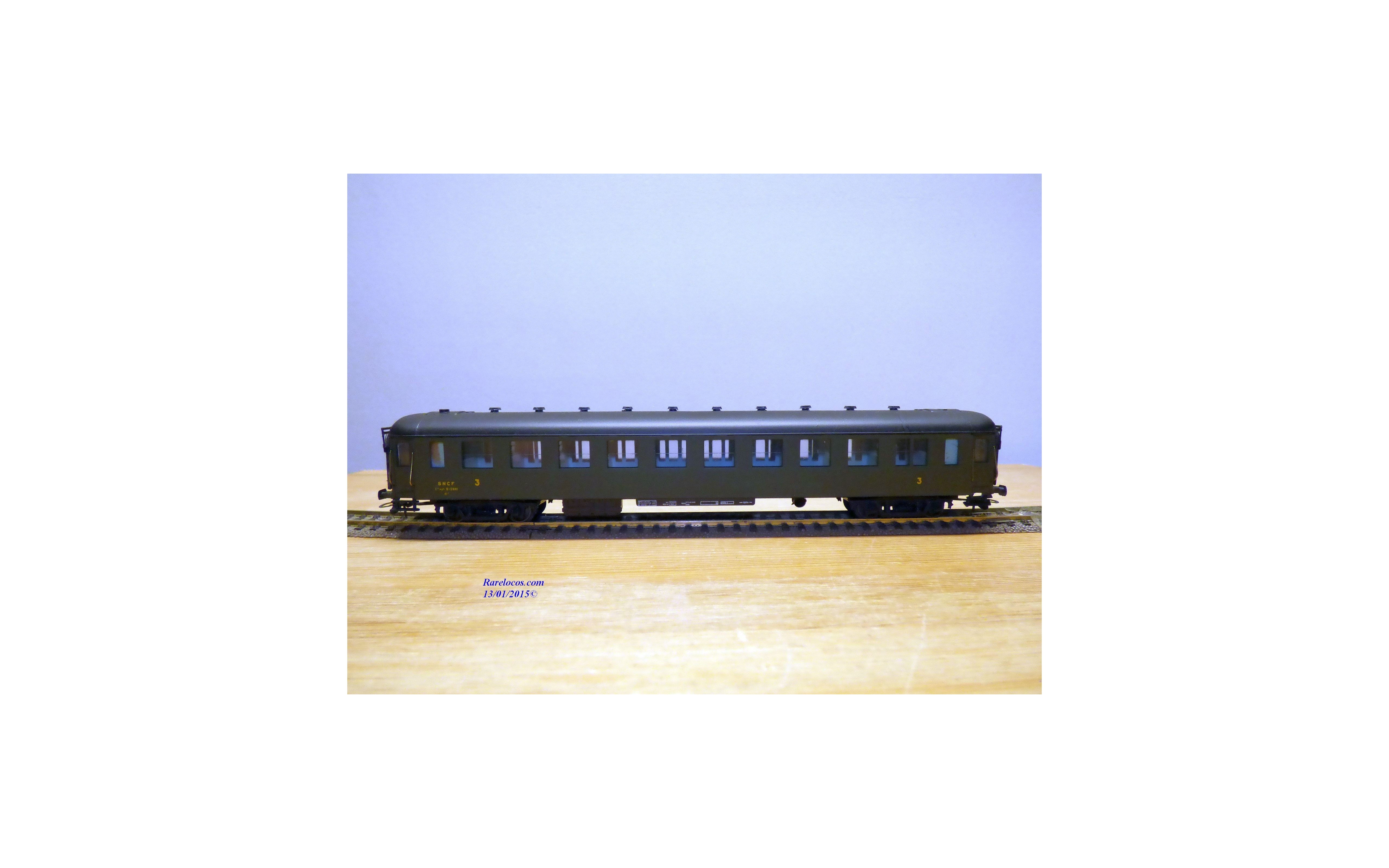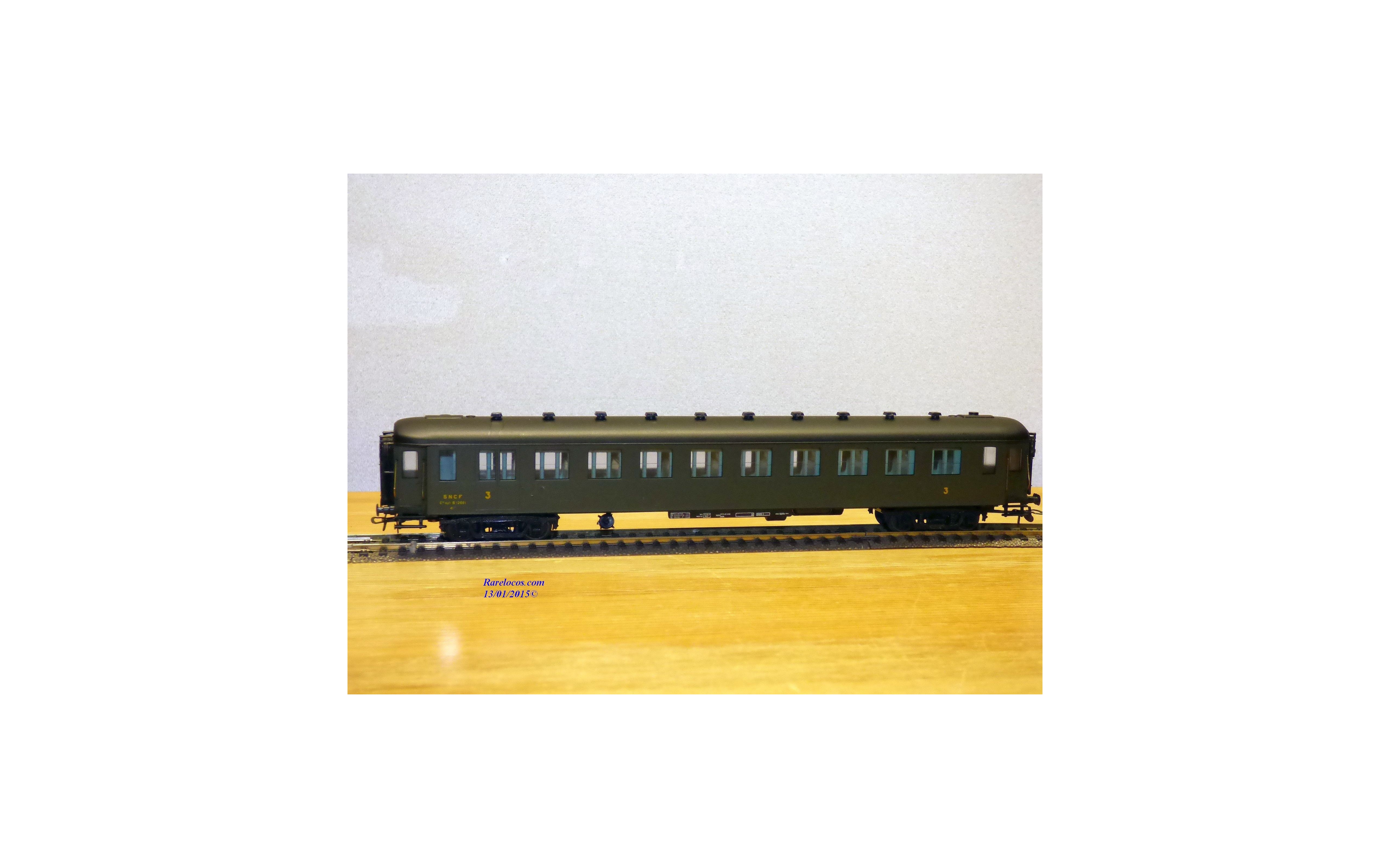 Voiture grandes lignes à bogies OCEM entièrement soudées dite inox de 3 ème classe à portes sanitaires type C10 des chemins de fer français (SNCF ) , livrée vert SNCF à toit noir, aménagements intérieurs, immatriculation: C10 myfi 12661, boîte carton d'origine en excellent état.