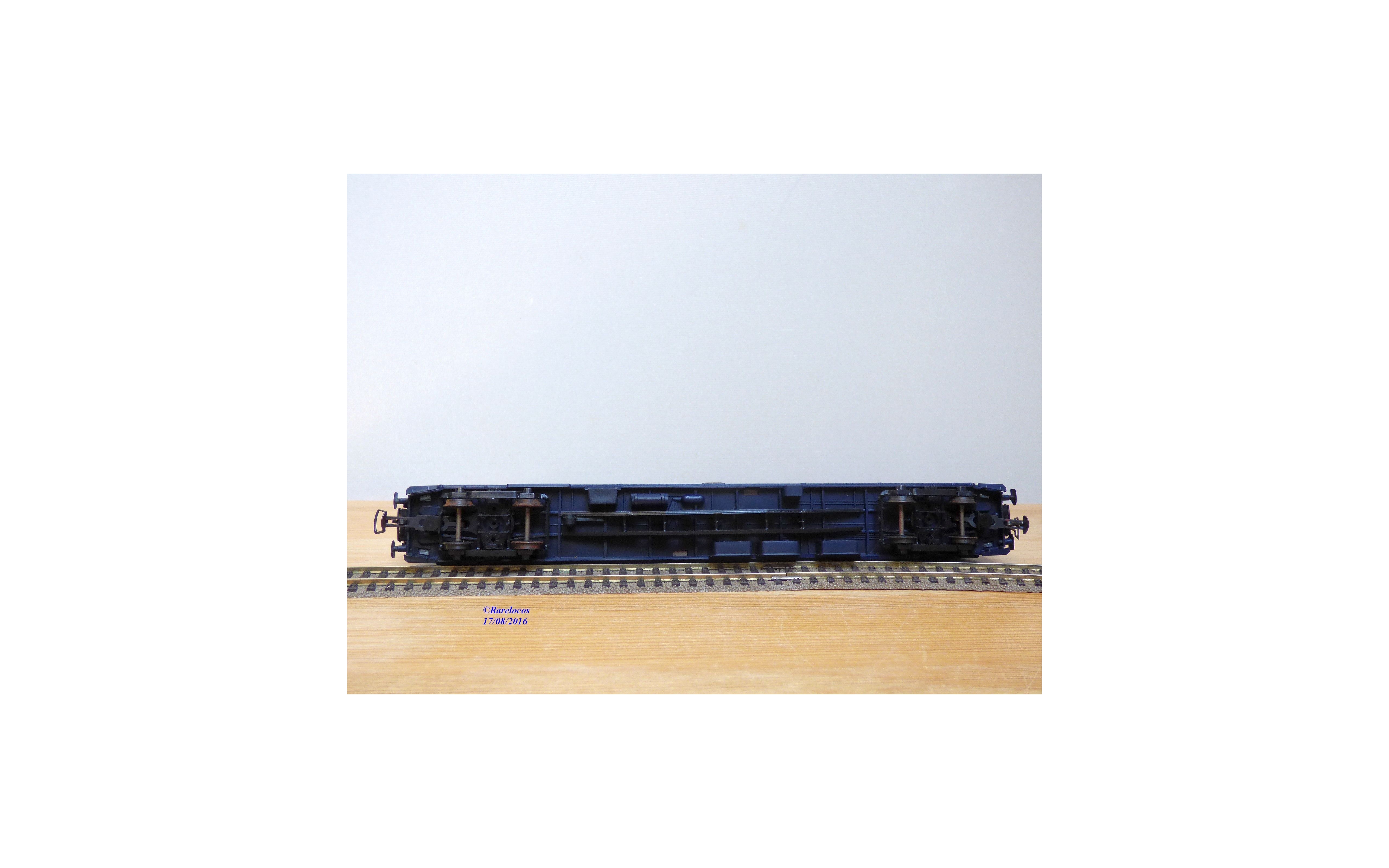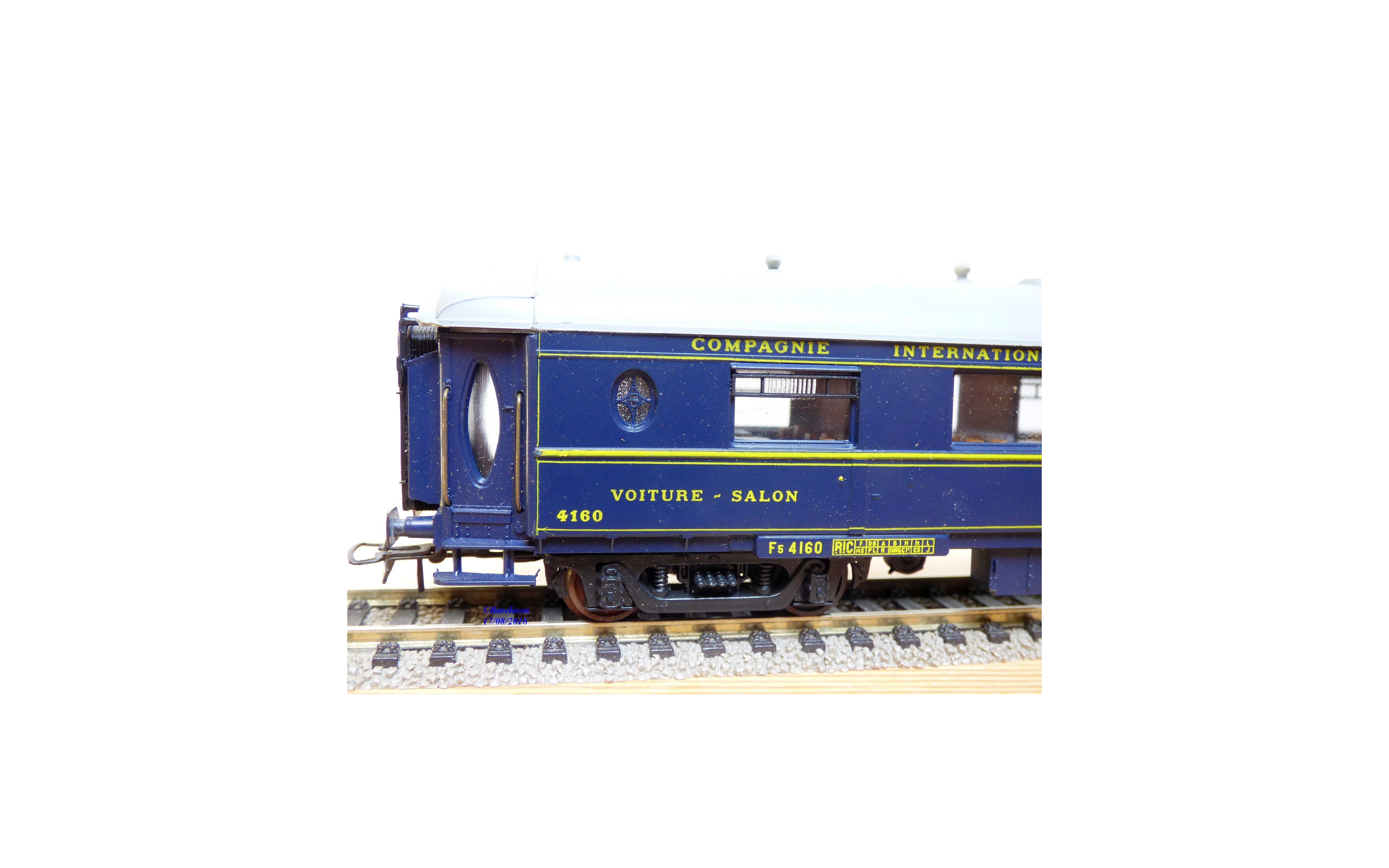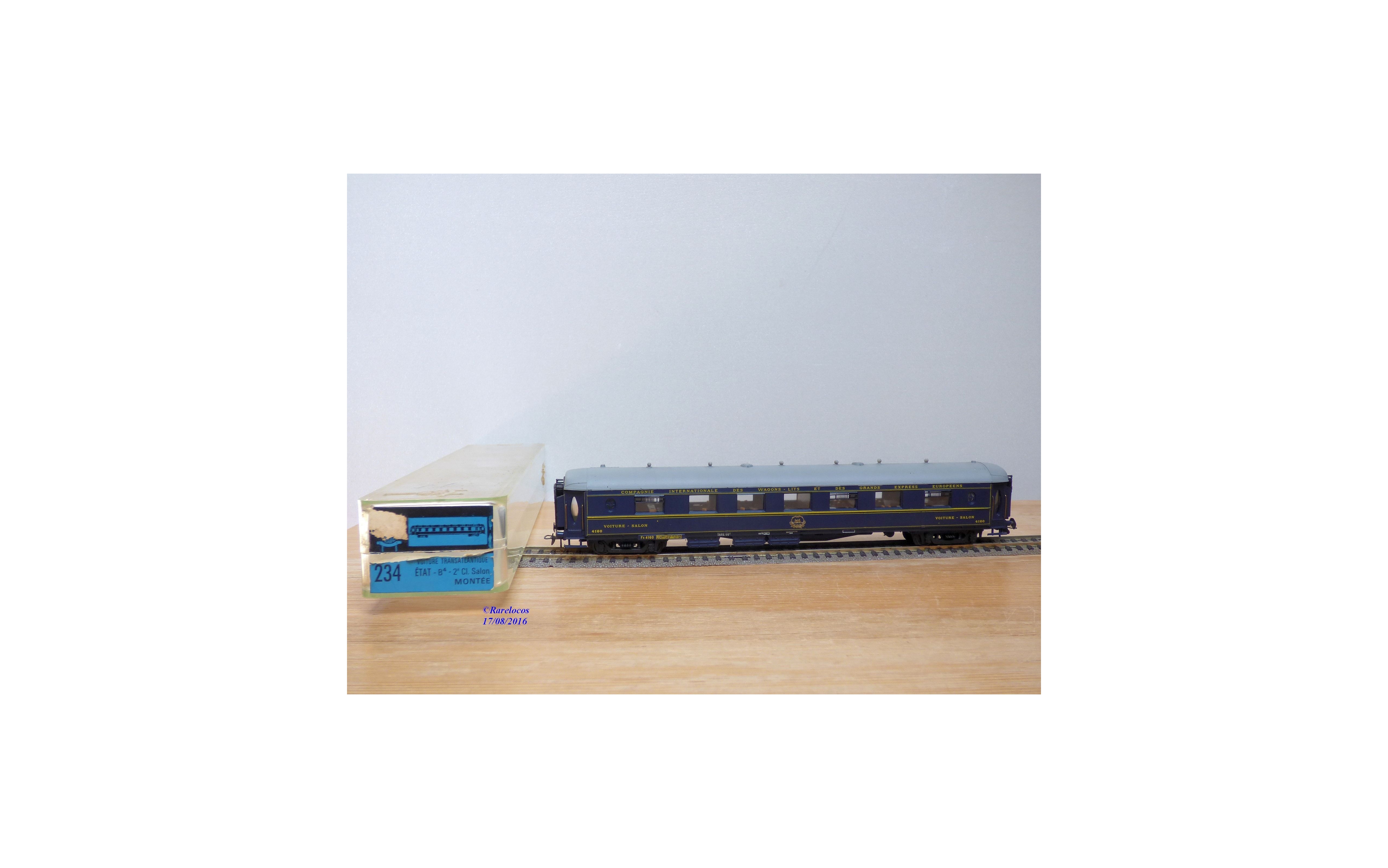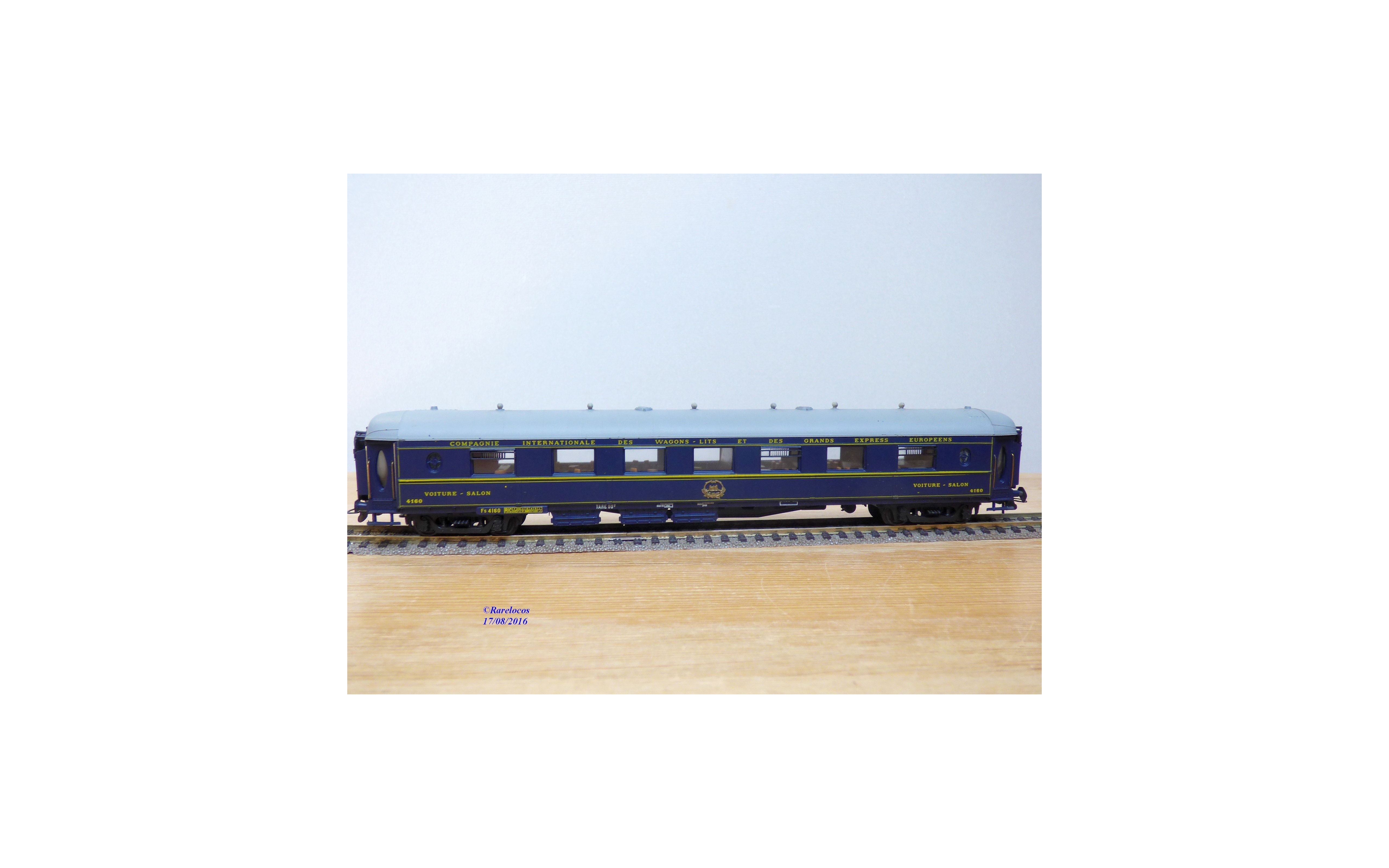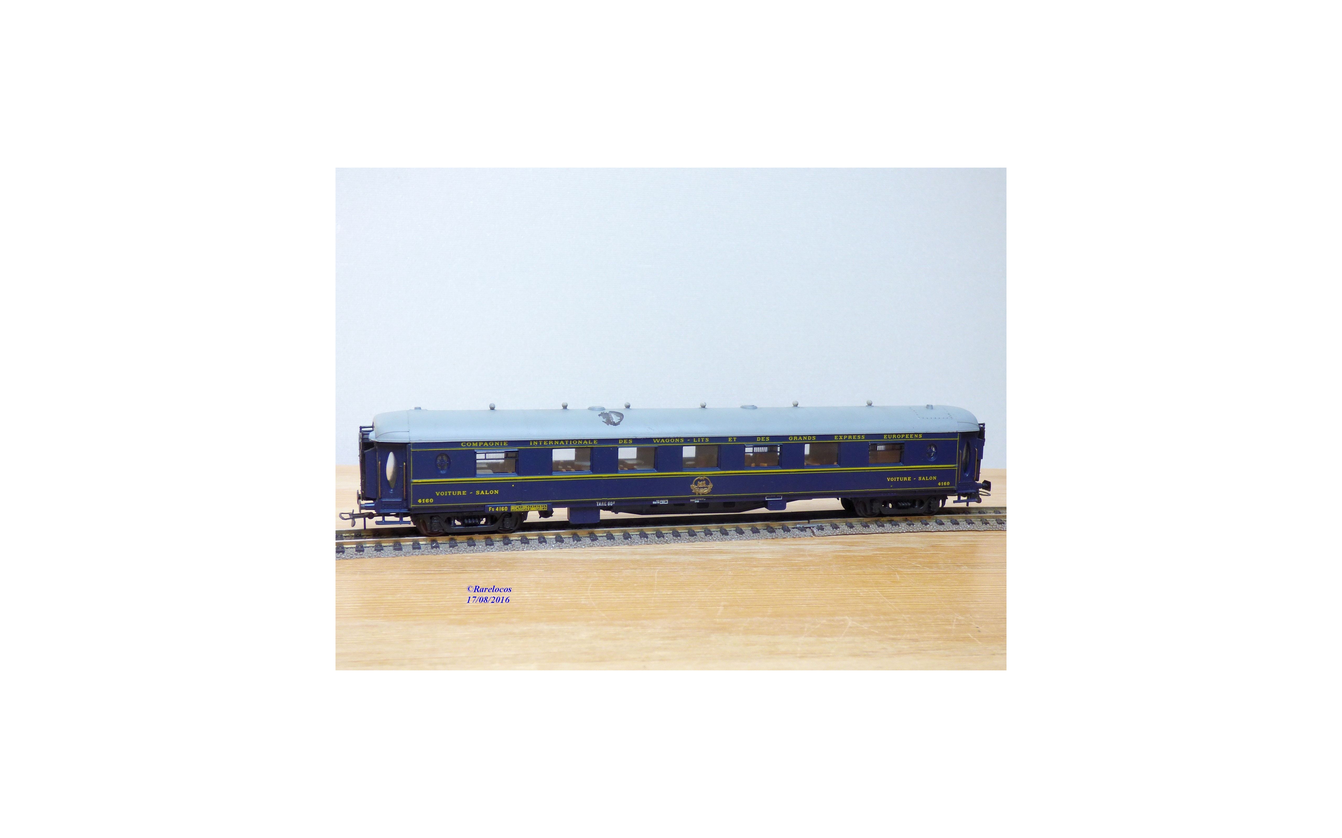 Voiture salon bar à bogies des chemins de fer français ( CIWL) entrant dans la composition du Train Bleu , livrée bleue à liserés jaunes et à toit gris, aménagements intérieurs, immatriculation: 4160, boîte d'origine mais pas la bonne référence.
