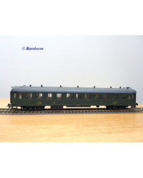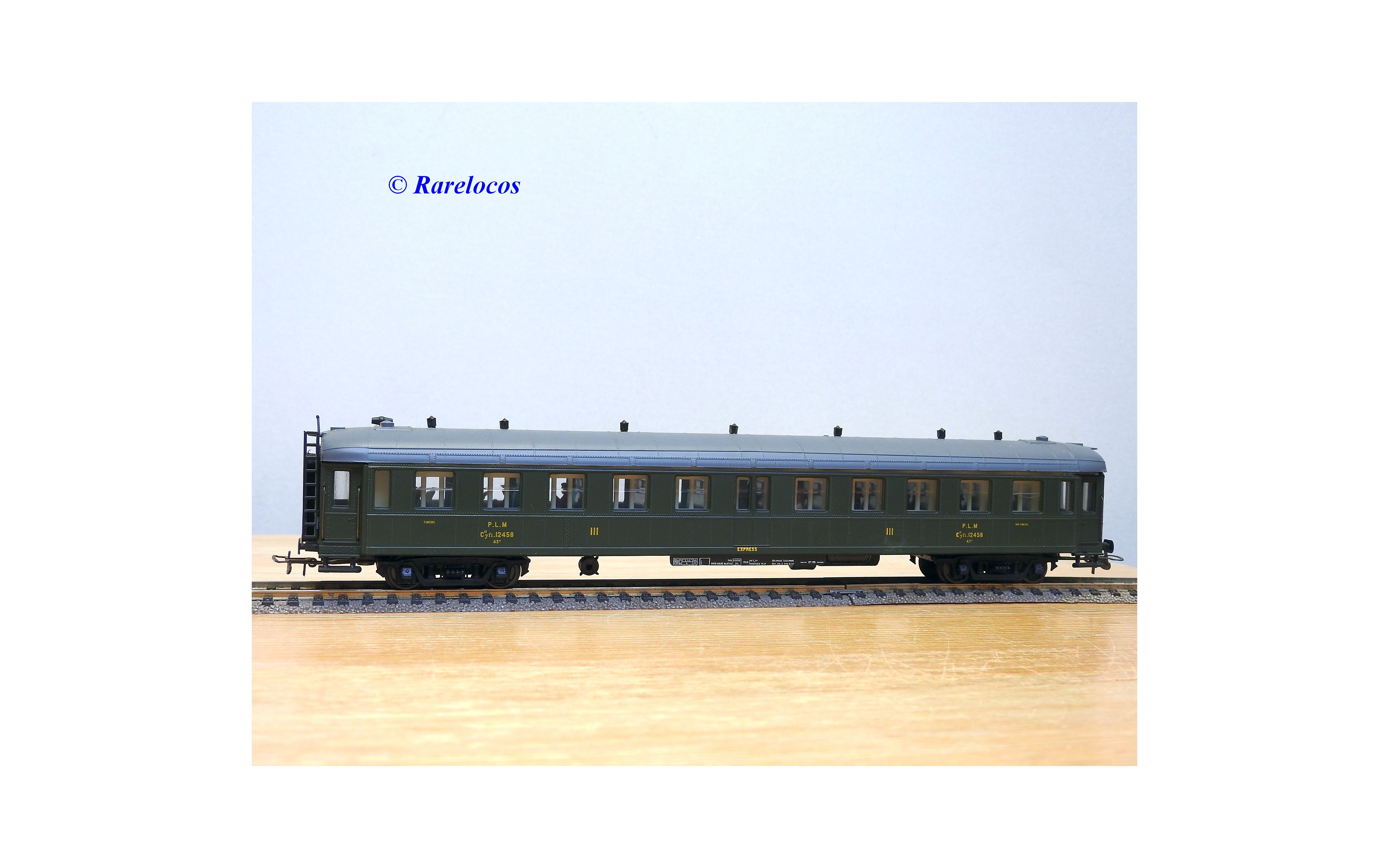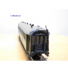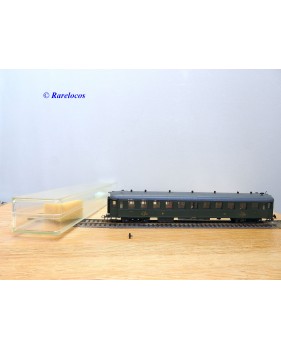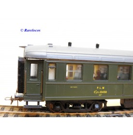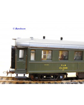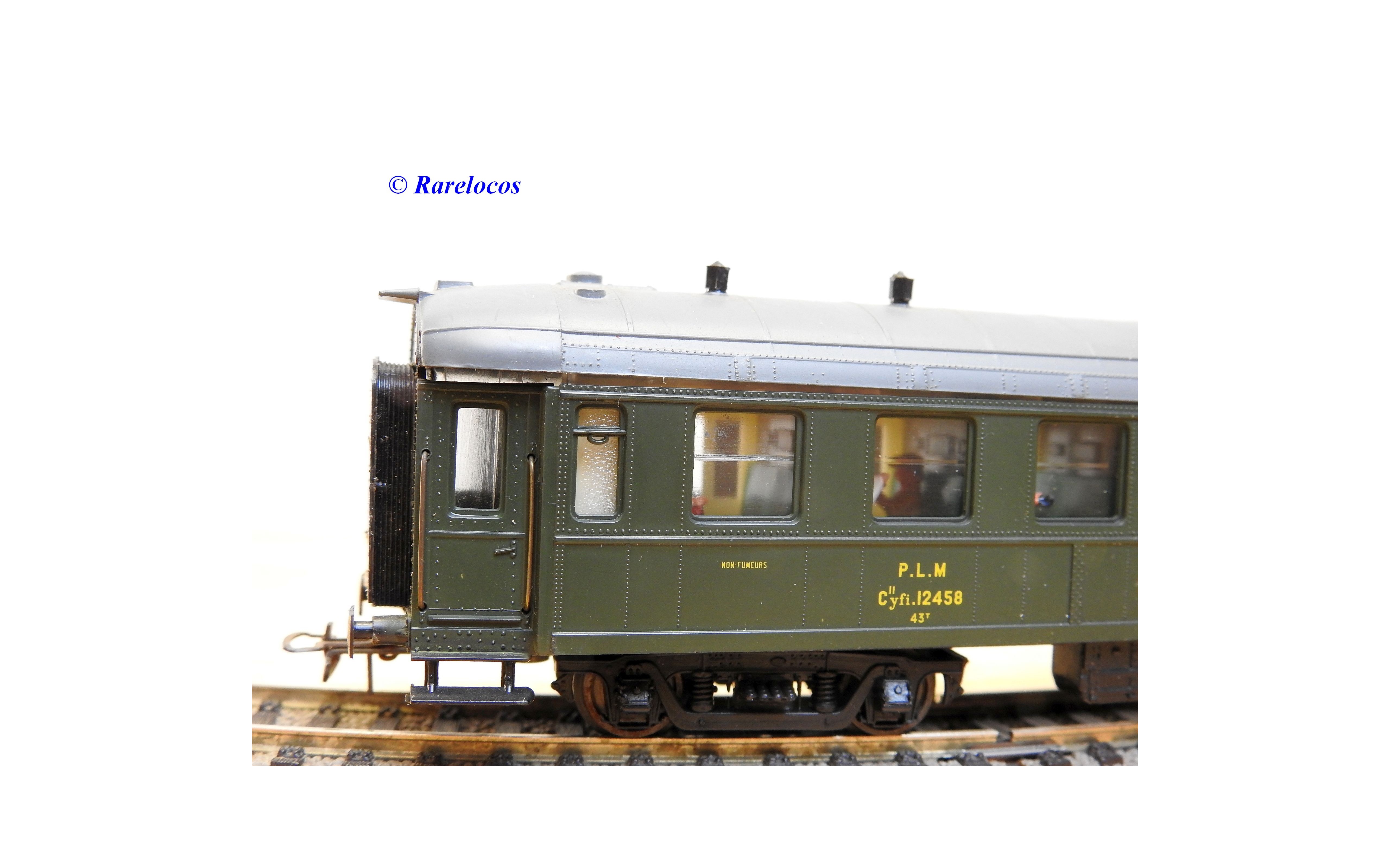 Rare voiture grandes lignes à bogies DYLE et BACALAN à rivets type C 11 des chemins de fer français ( PLM : Paris Lyon Méditerrannée ) , livrée verte à toit gris, aménagements intérieurs, immatriculation: C11 yfi 12458, boîte crystal d'origine en bon état sans étiquette de référence.