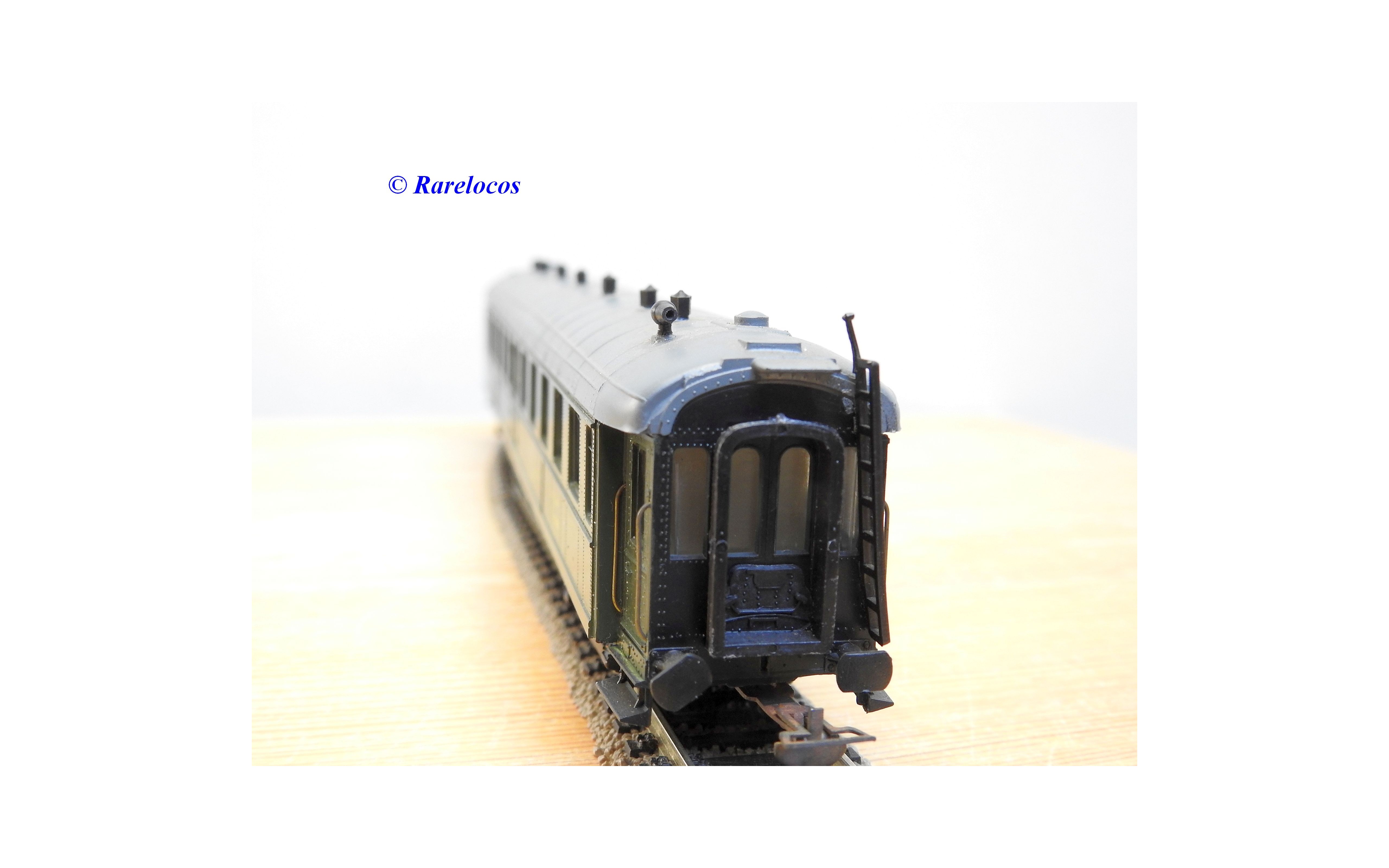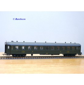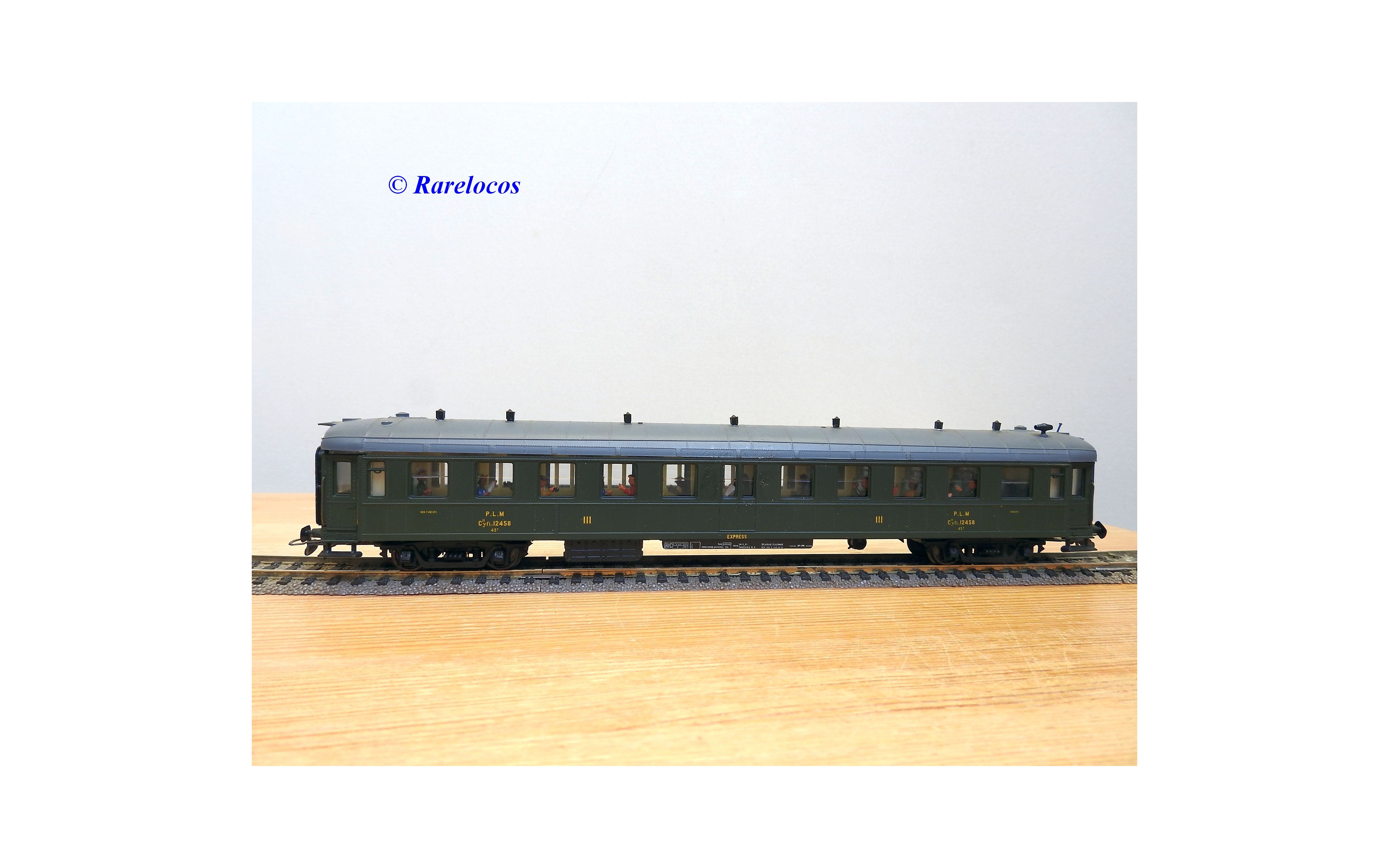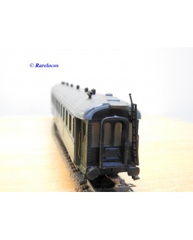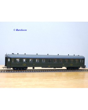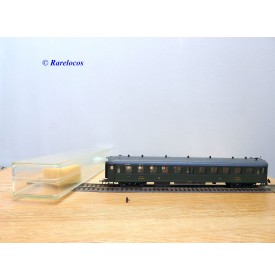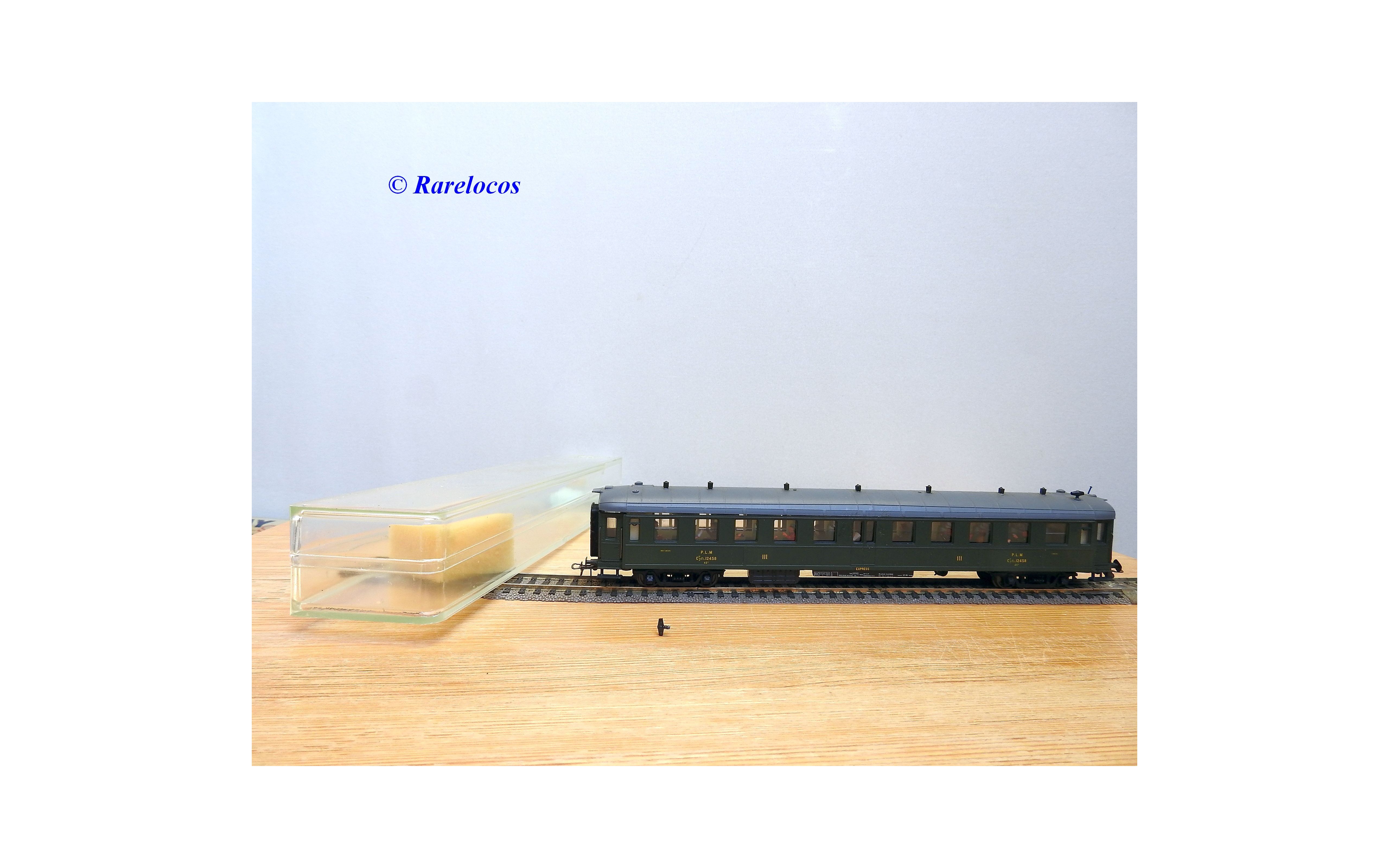 Rare voiture grandes lignes à bogies DYLE et BACALAN à rivets type C 11 des chemins de fer français ( PLM : Paris Lyon Méditerrannée ) , livrée verte à toit gris, aménagements intérieurs, immatriculation: C11 yfi 12458, boîte crystal d'origine en bon état sans étiquette de référence.