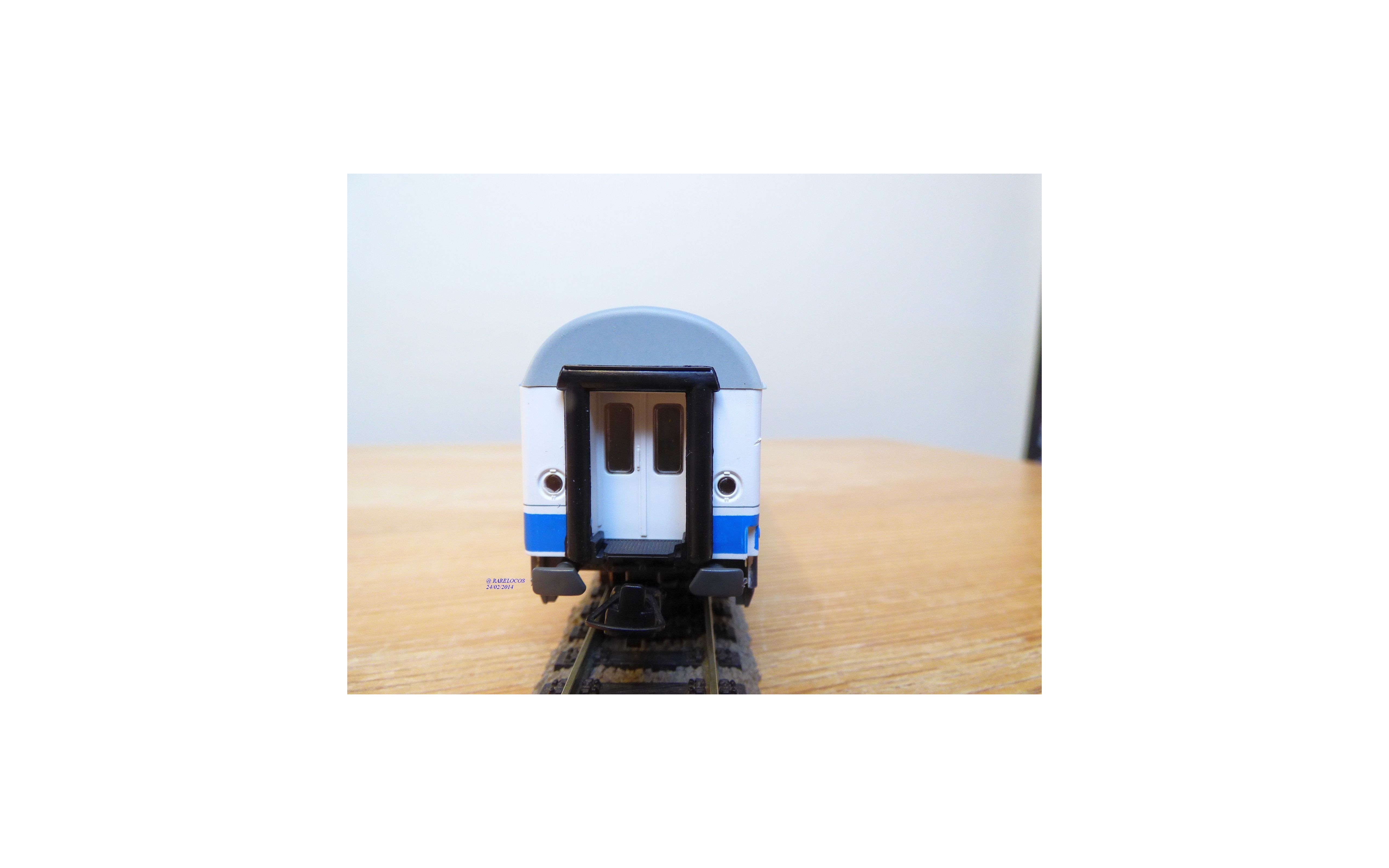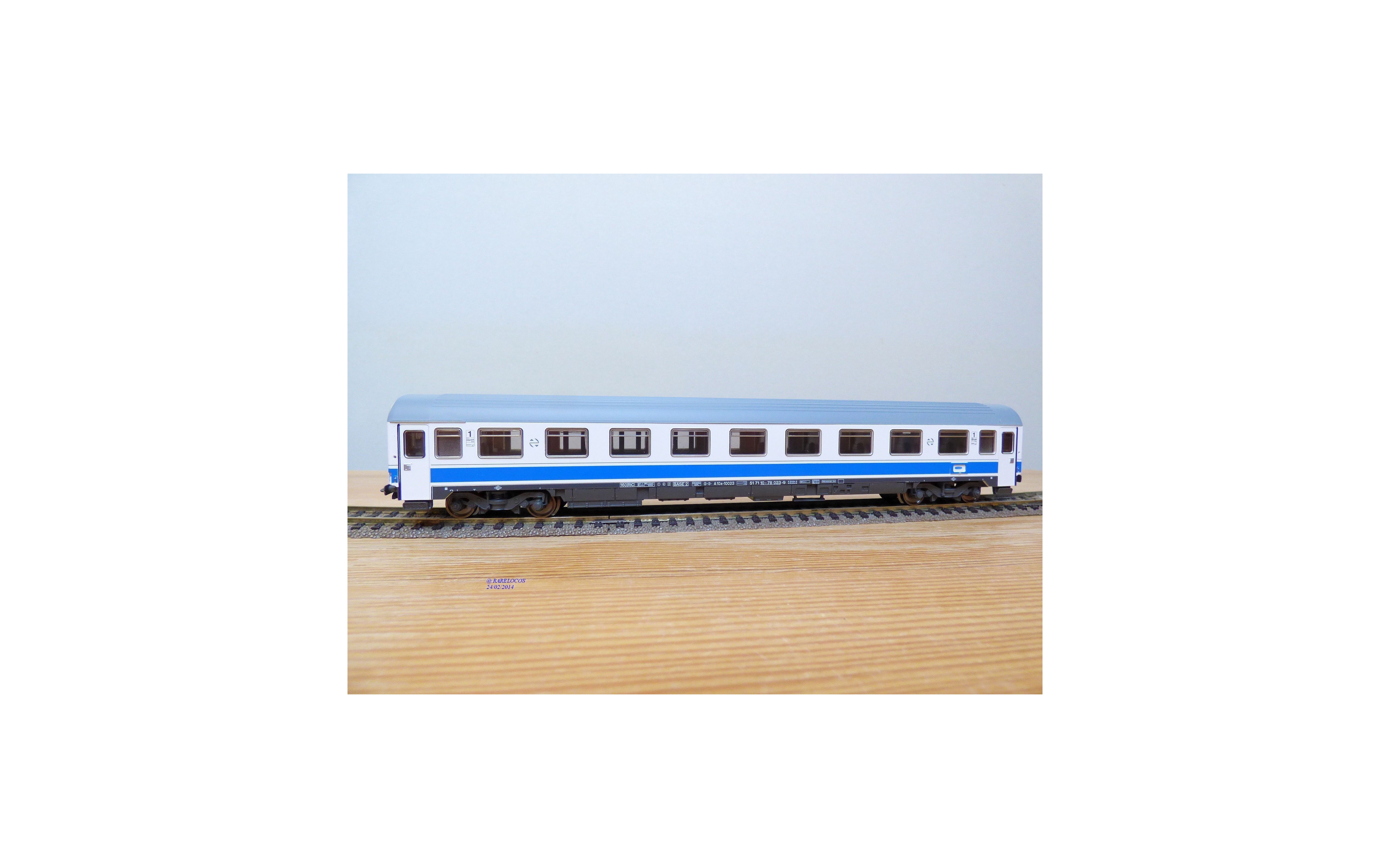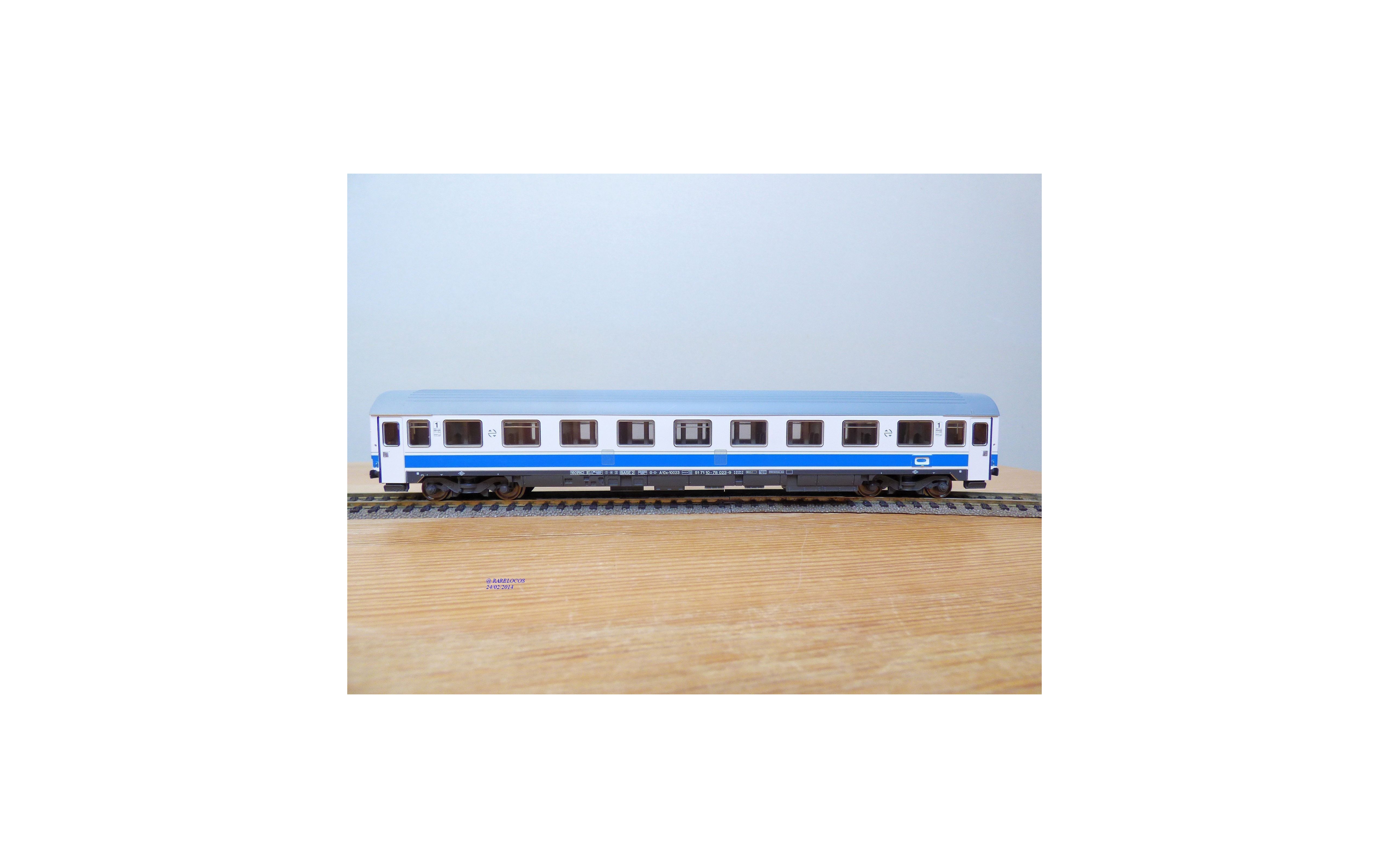 Voiture grandes lignes EUROFIMA de 1 ère classe type A 10x des chemins de fer espagnols ( RENFE ), livrée blanc à bande bleue et toit gris, aménagements intérieurs, attelages à élongation, pièces de détaillage scellées, notice présente, emballage d'origine en excellent état.