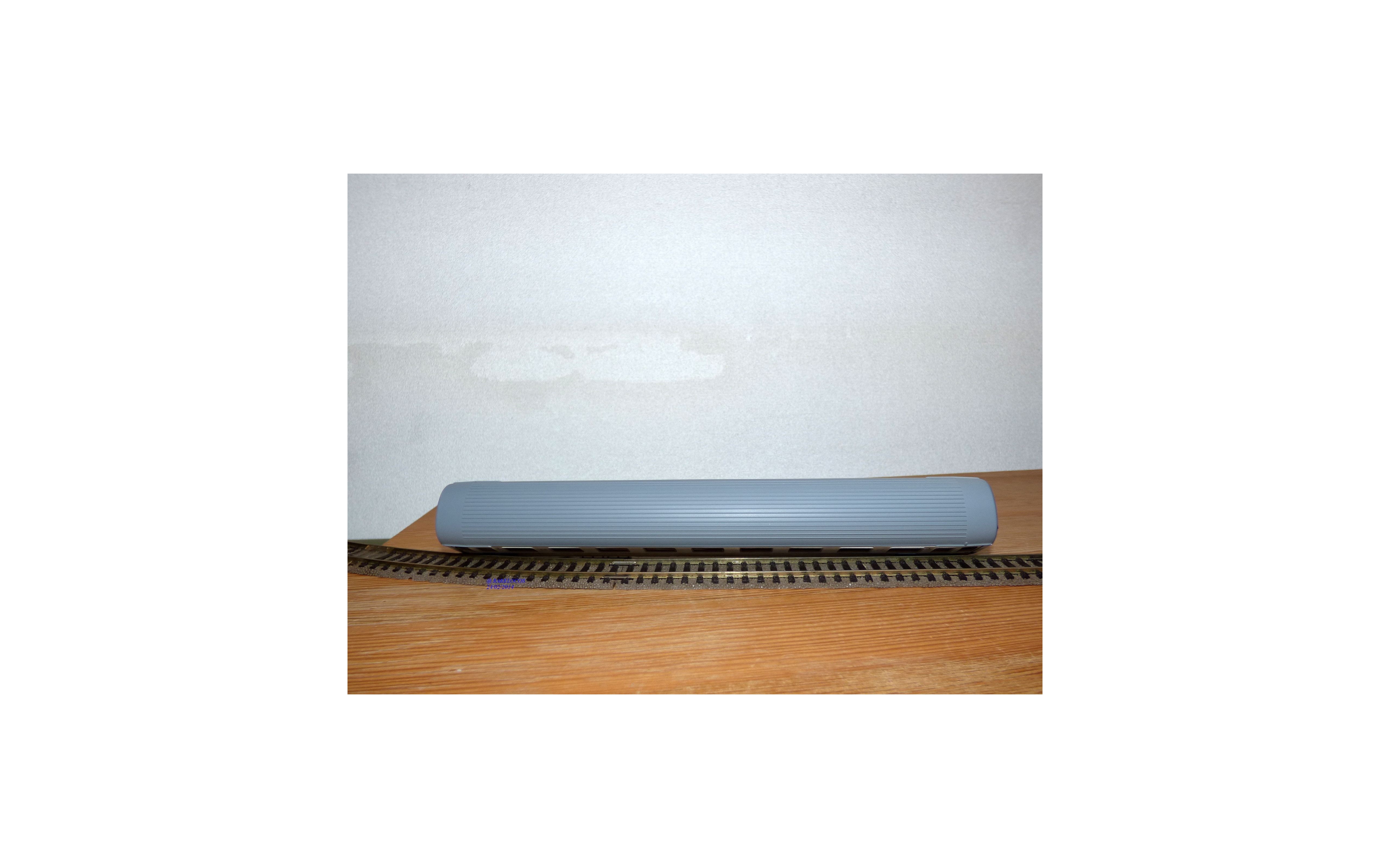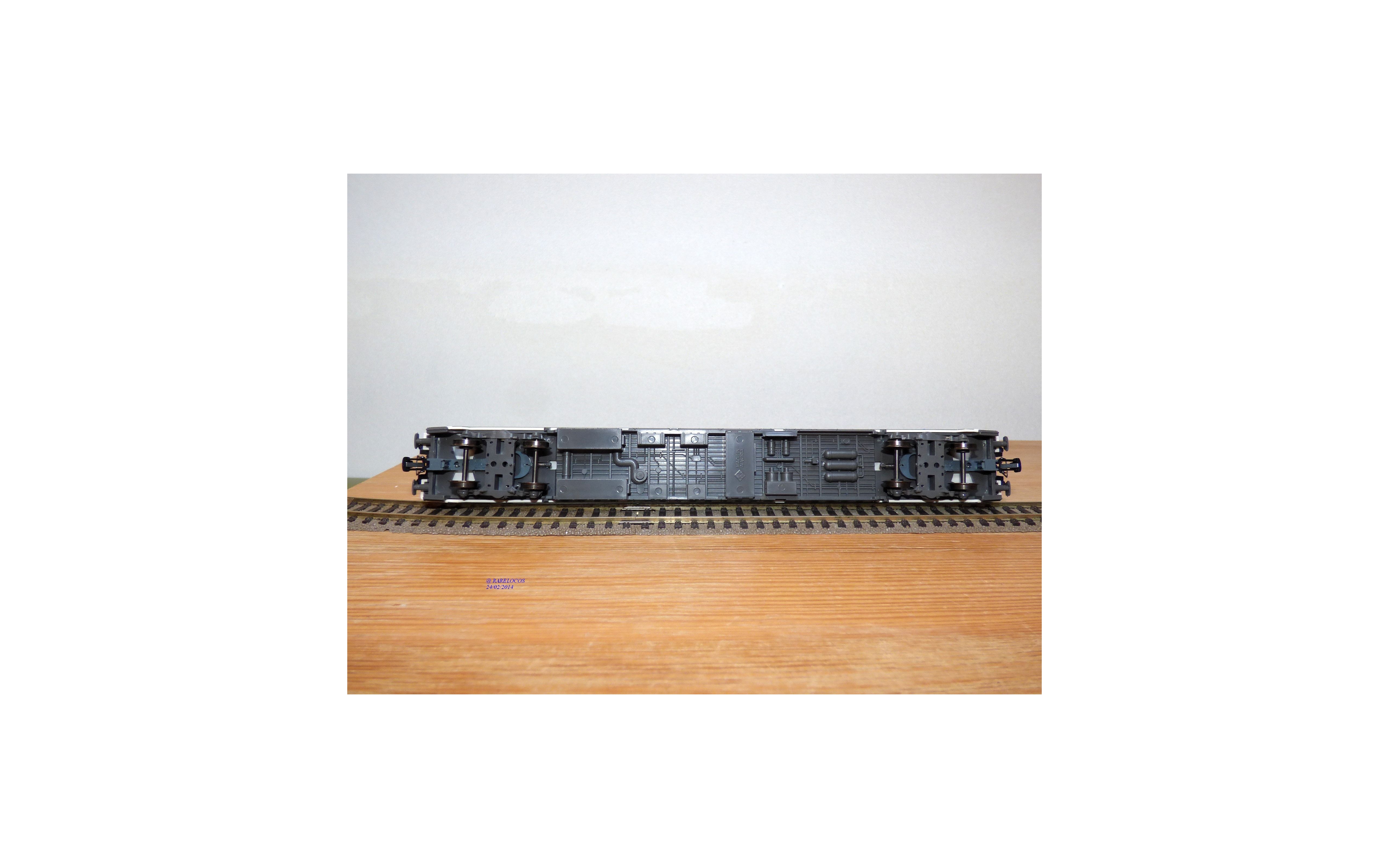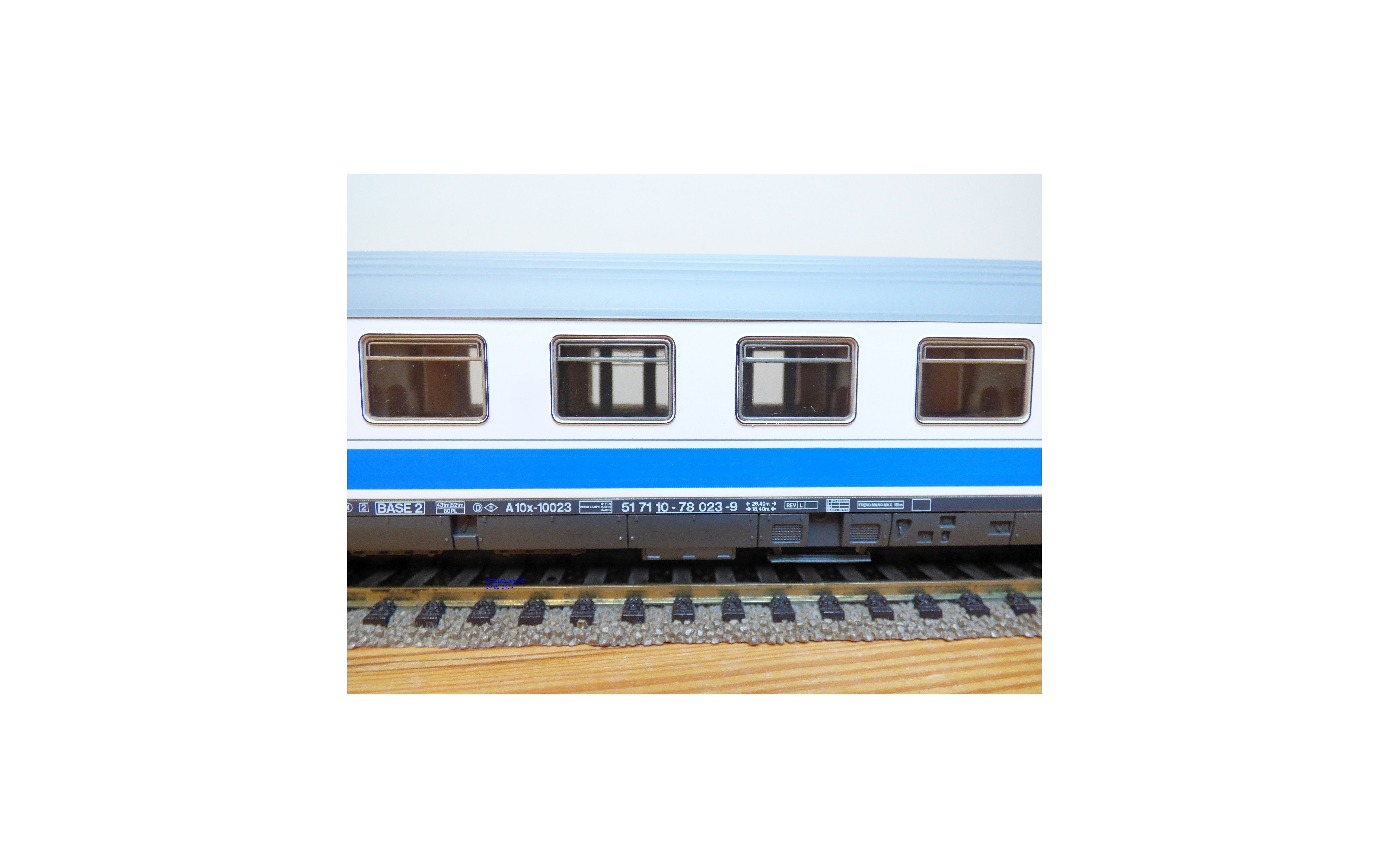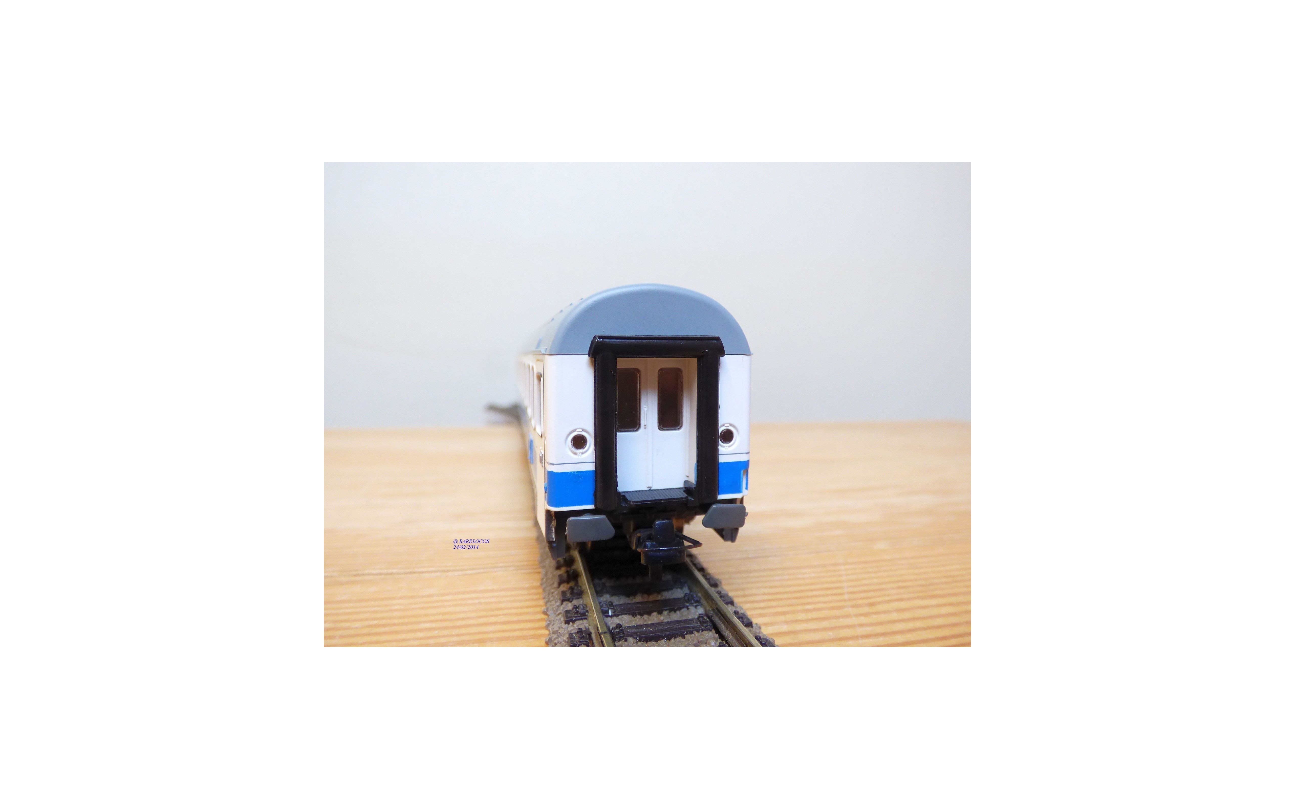 Voiture grandes lignes EUROFIMA de 1 ère classe type A 10x des chemins de fer espagnols ( RENFE ), livrée blanc à bande bleue et toit gris, aménagements intérieurs, attelages à élongation, pièces de détaillage scellées, notice présente, emballage d'origine en excellent état.
