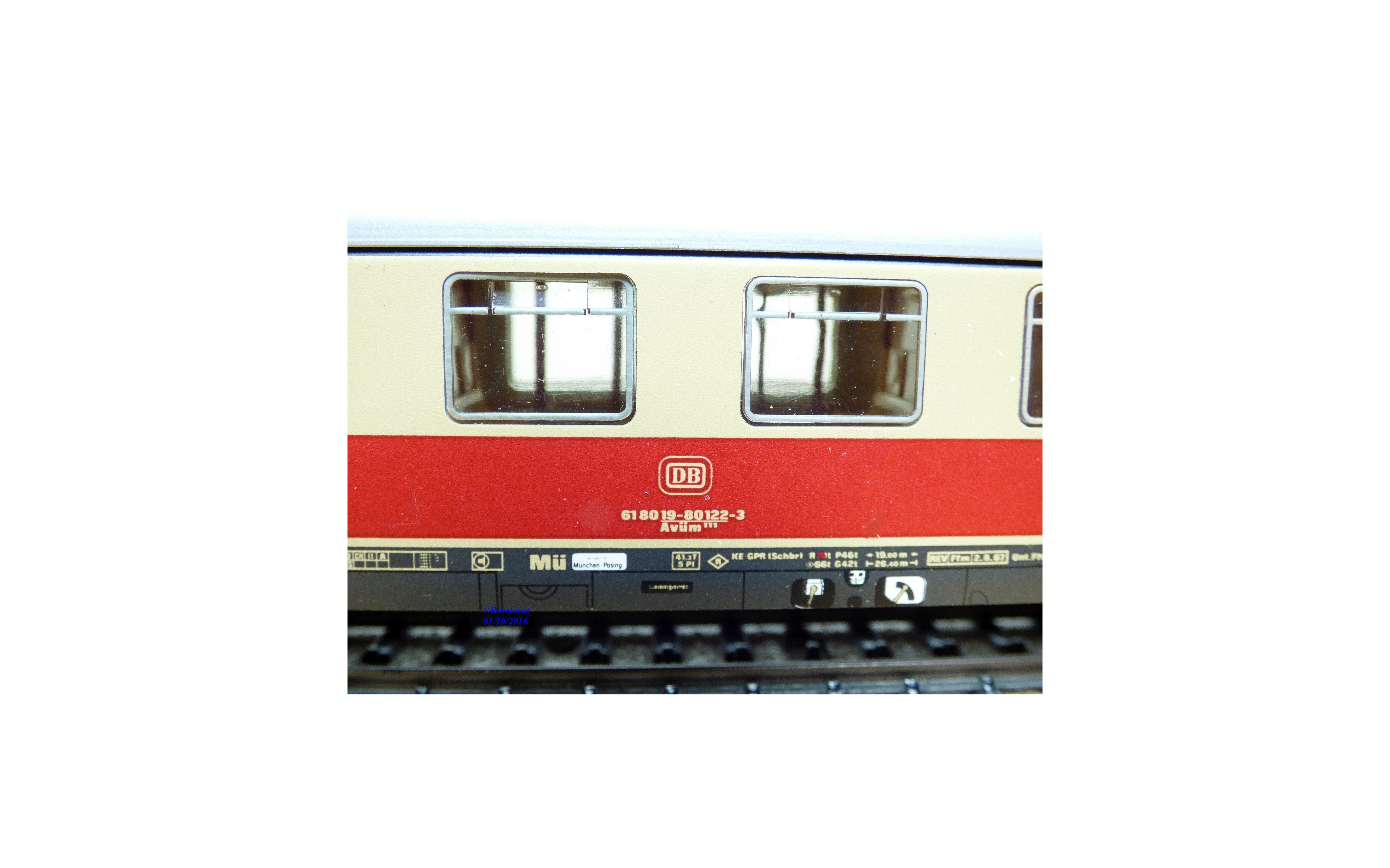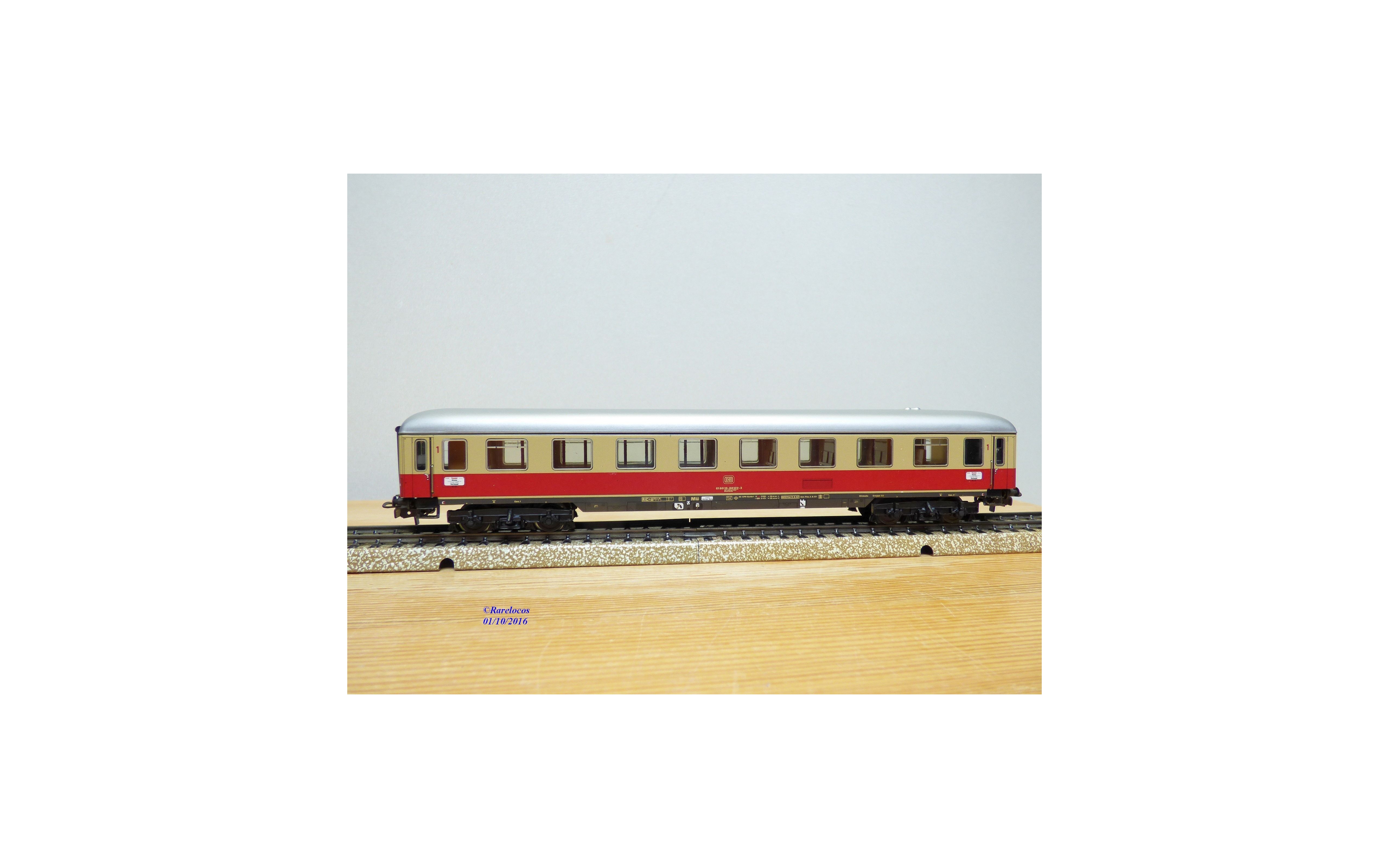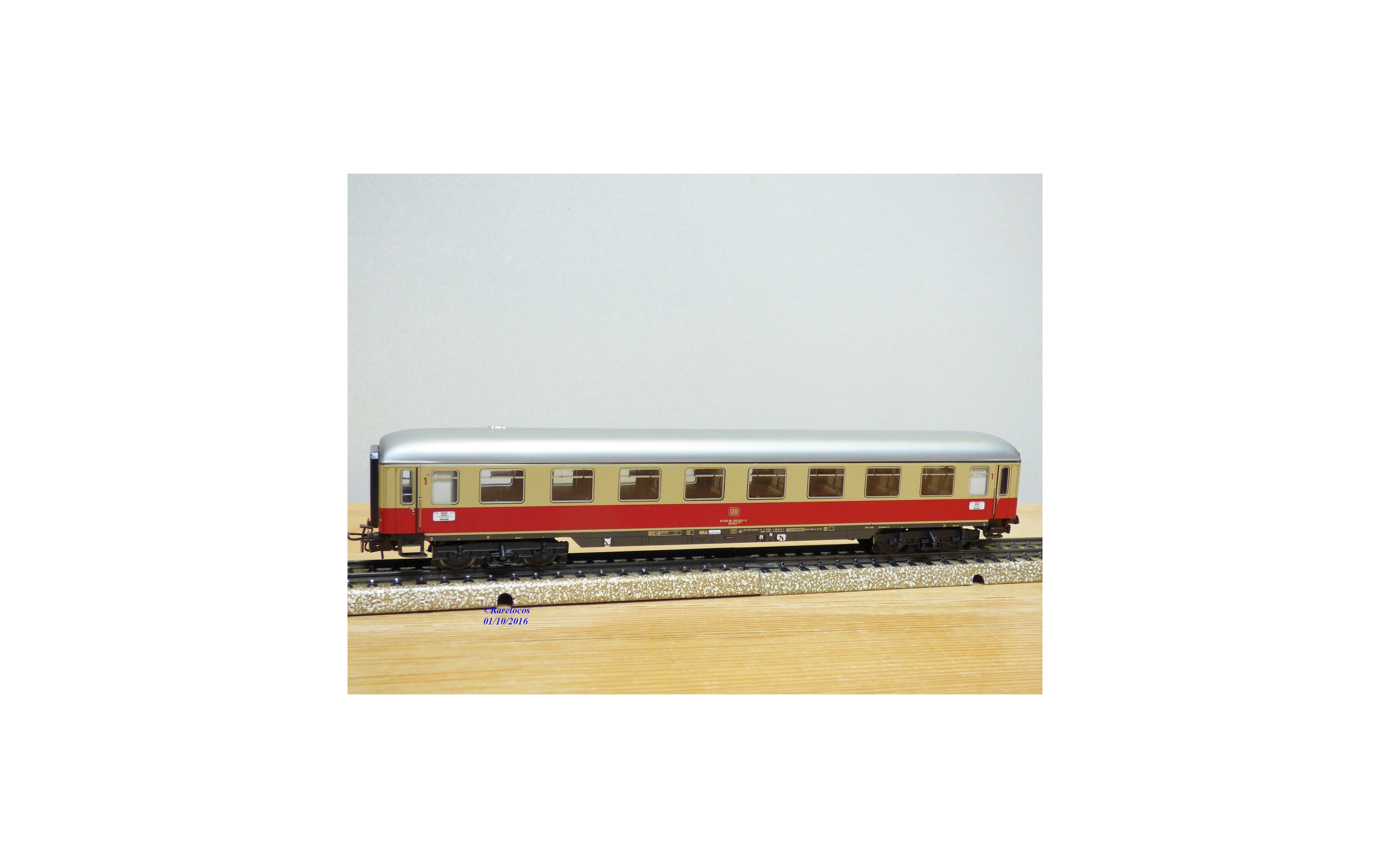 Voiture grandes lignes à compartiment à bogies type Avüm 111 des chemins de fer allemands ( DB ), tout en métal, livrée TEE/IC rouge et crême à toit gris argent, boîte d'origine " coins piquants ".