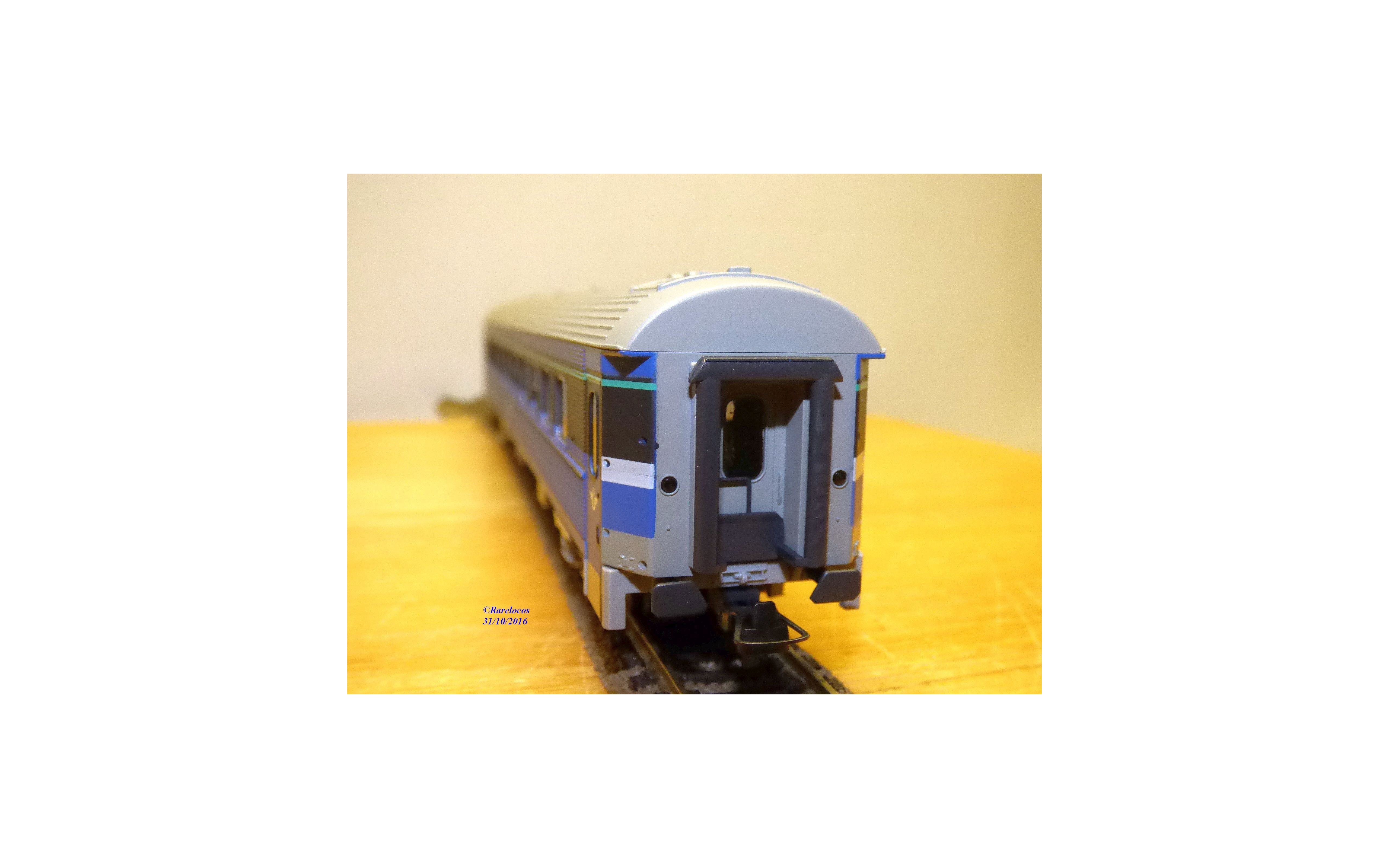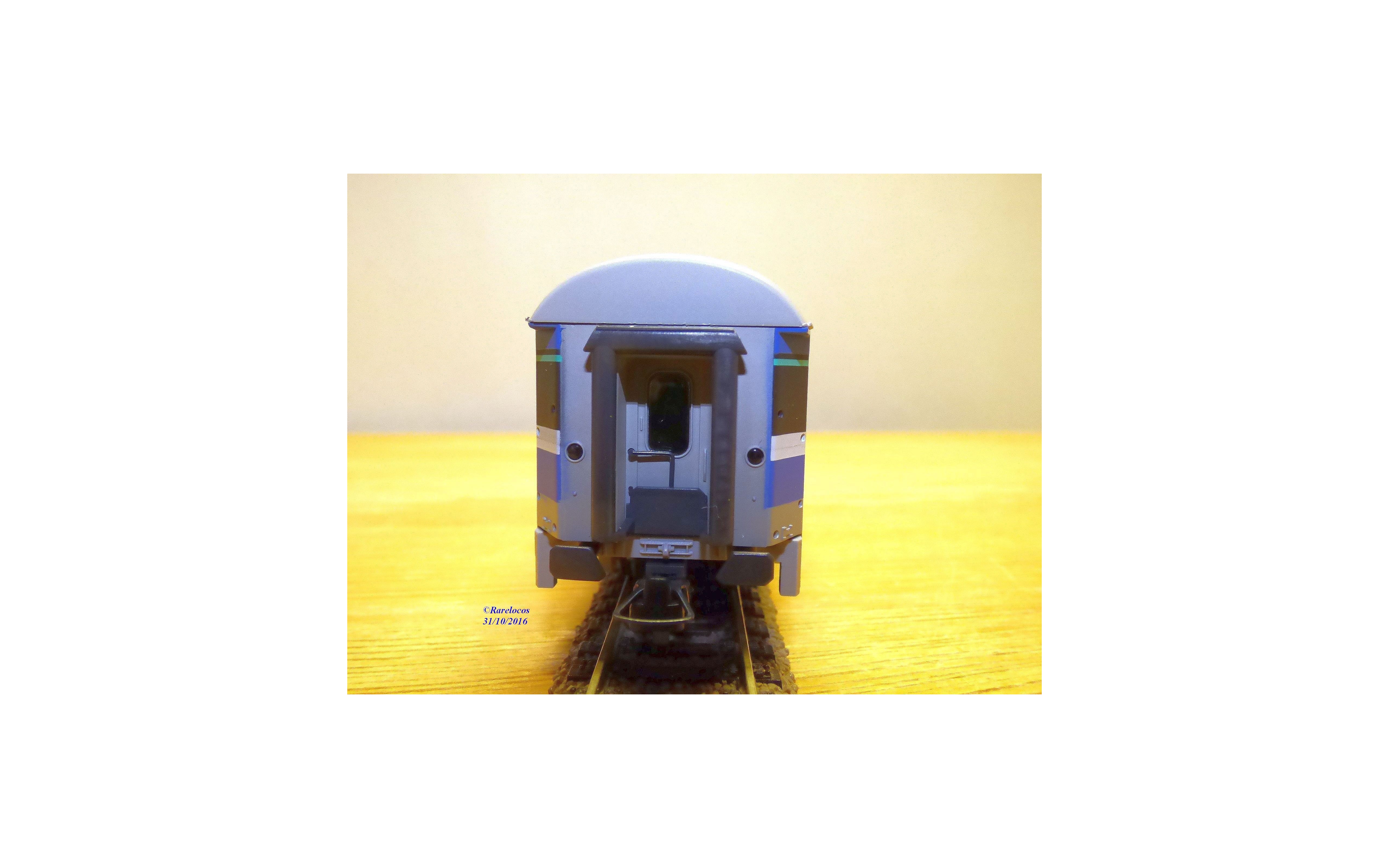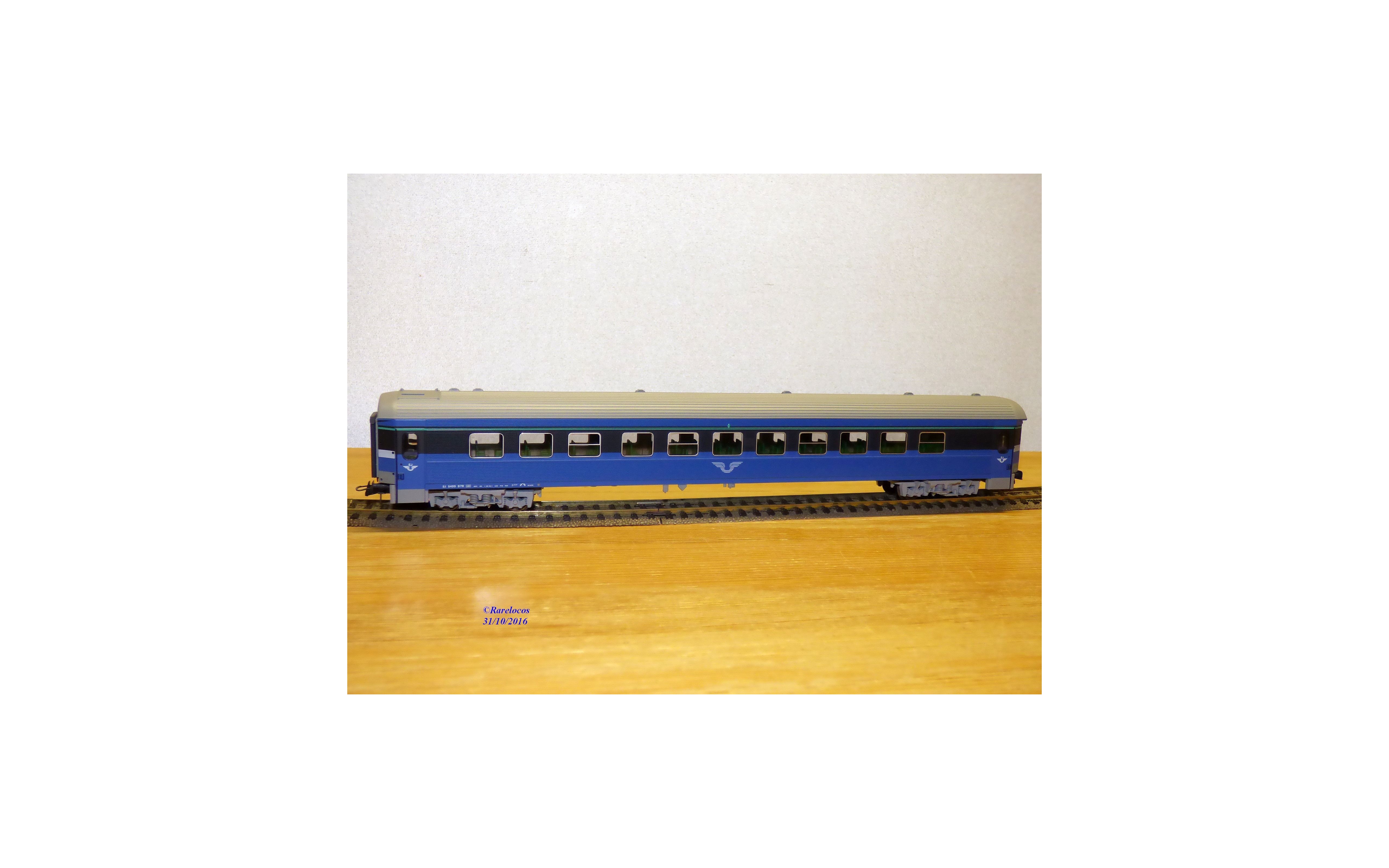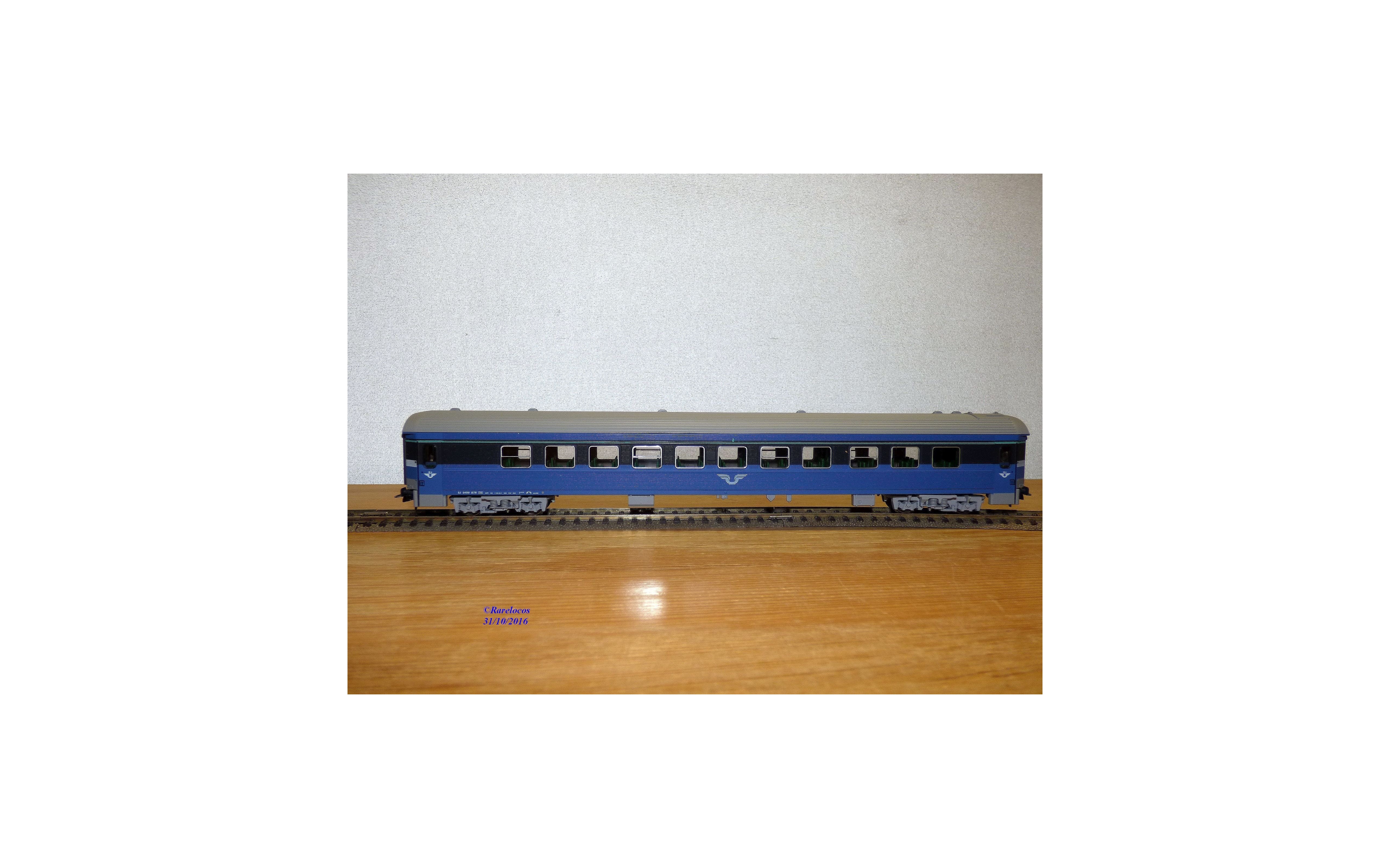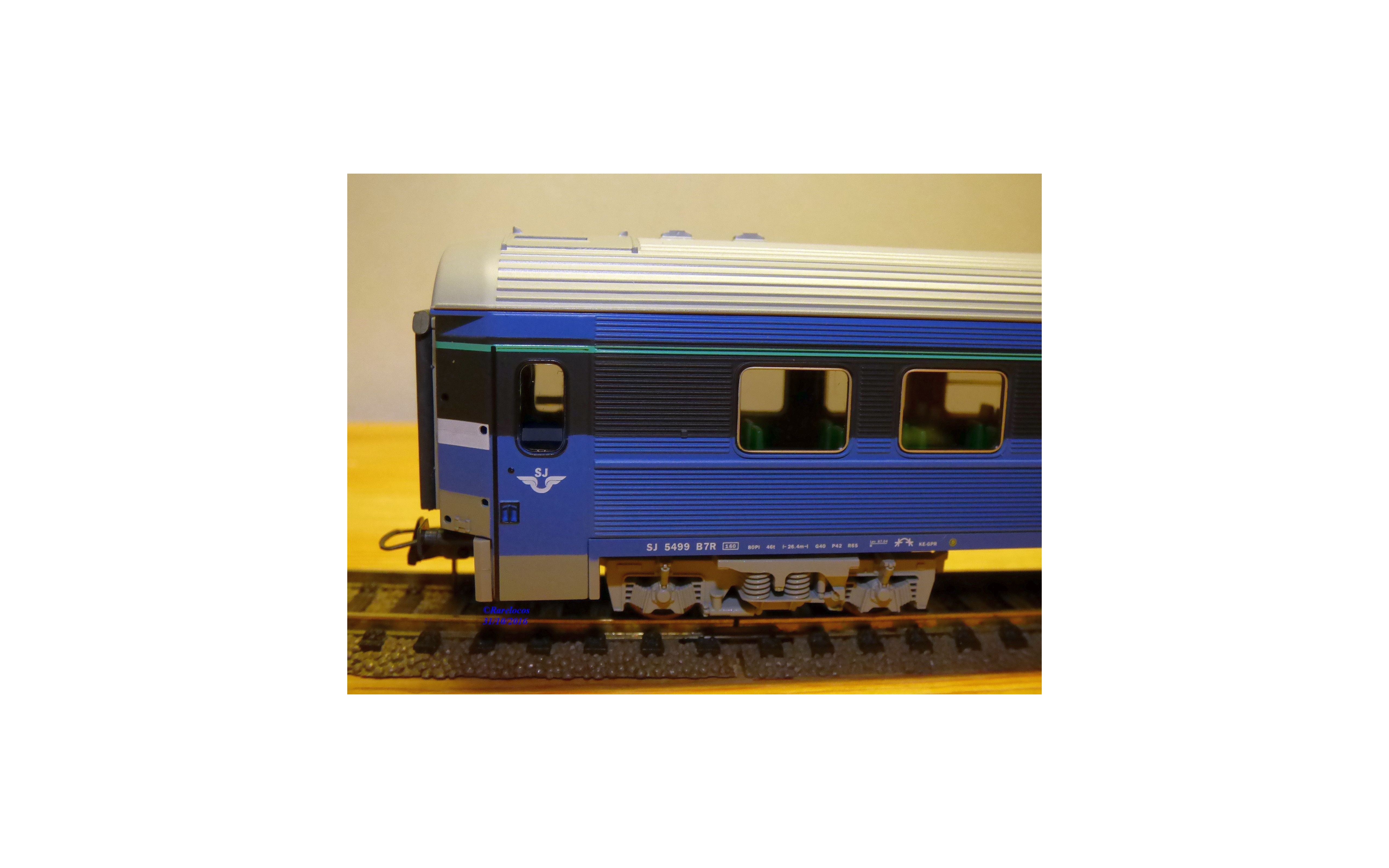 Voiture grandes lignes de 2 ème classe type B7R des chemins de fer suédois ( SJ ), livrée bleue et noire, aménagements intérieurs, attelages à élongation, pièces de détaillage encore scellées, immatriculation : 5499 B7R, notice présente, boîte d'origine en excellent état.