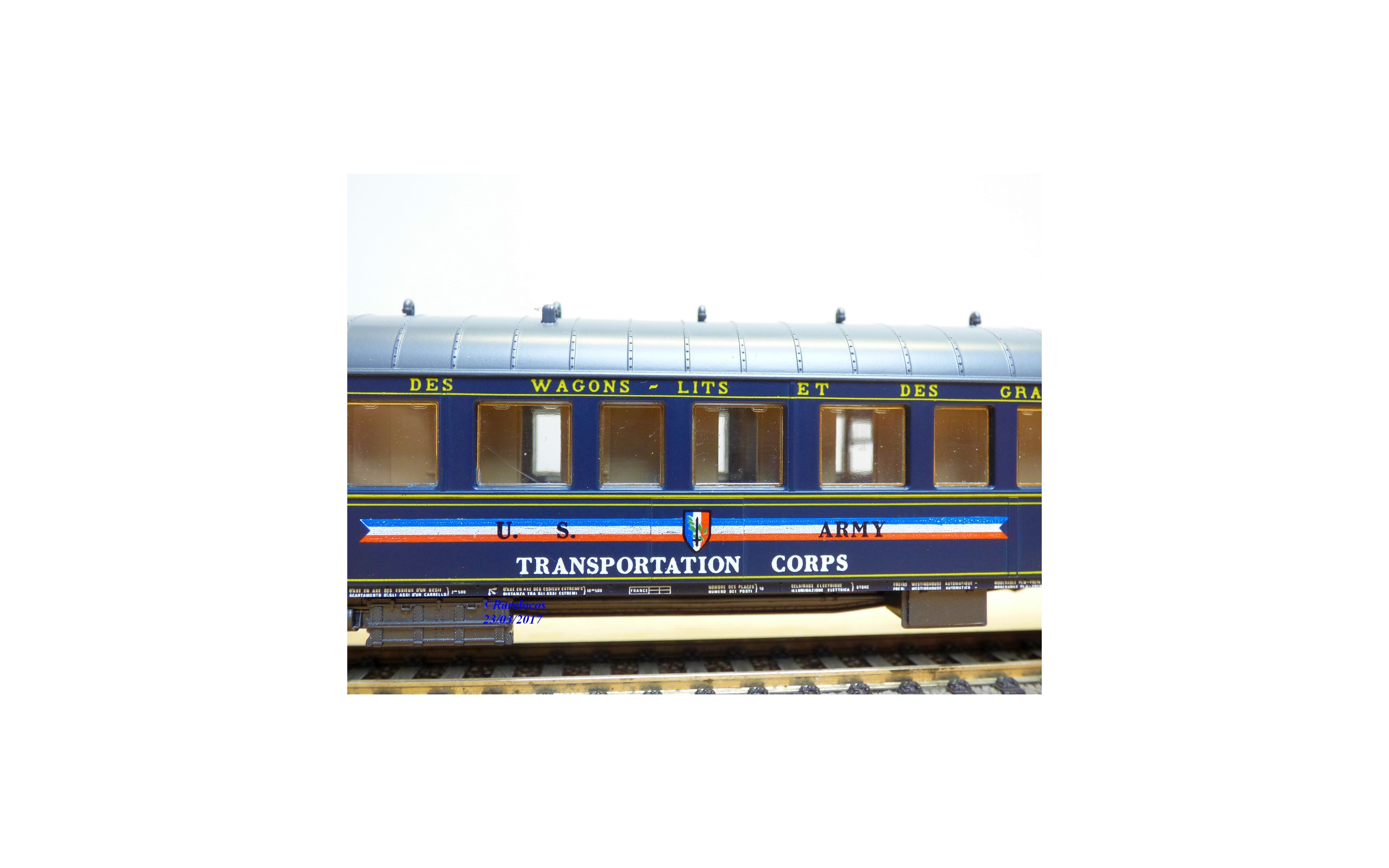 Rare voiture lits type Lx à 2 bogies des chemins de fer français ( CIWL), livrée bleu marine à toit gris avec marquages US ARMY Transportation Corps, aménagements intérieurs, immatriculation :3531A , notice présente, boîte d'origine en très bon état.