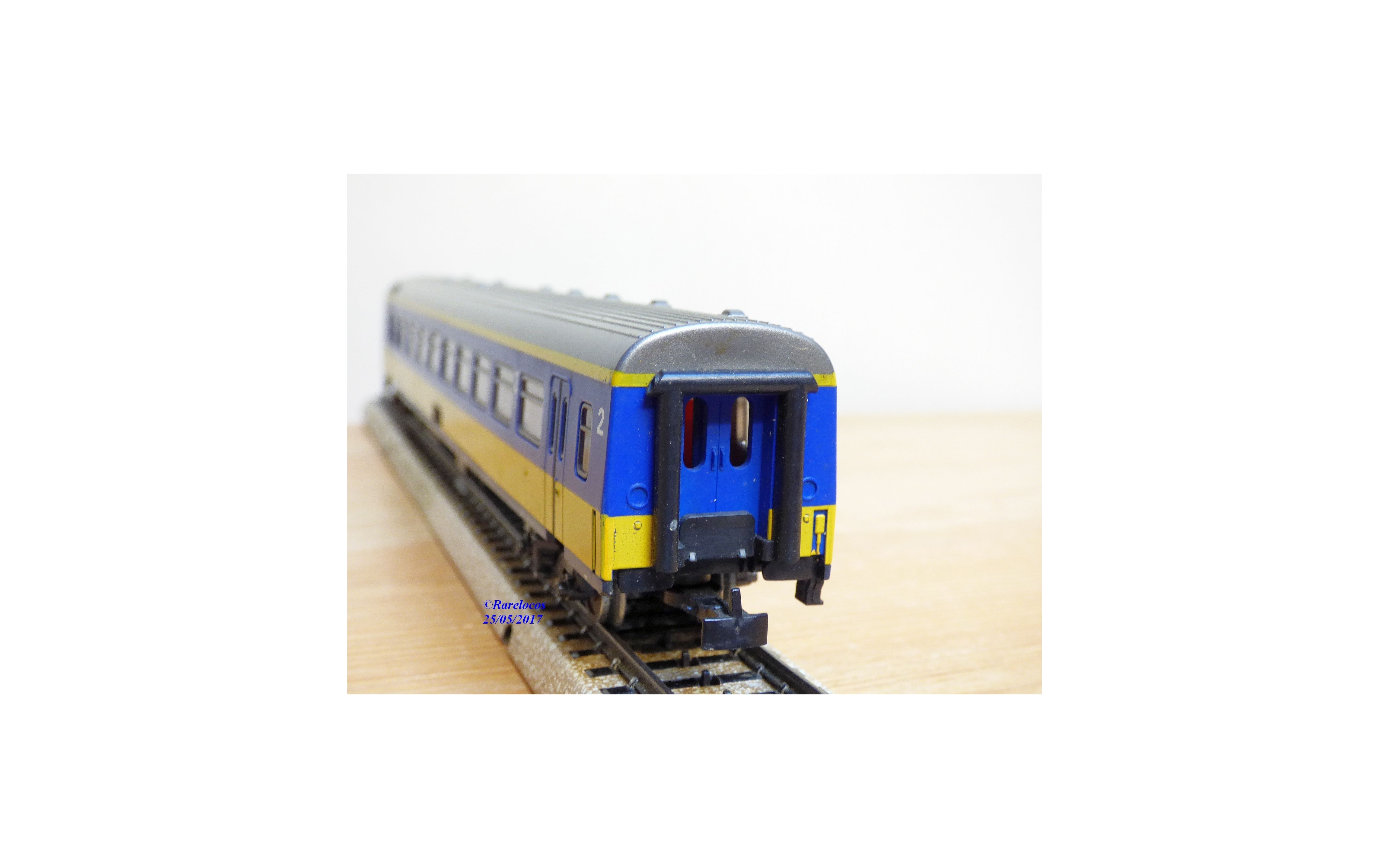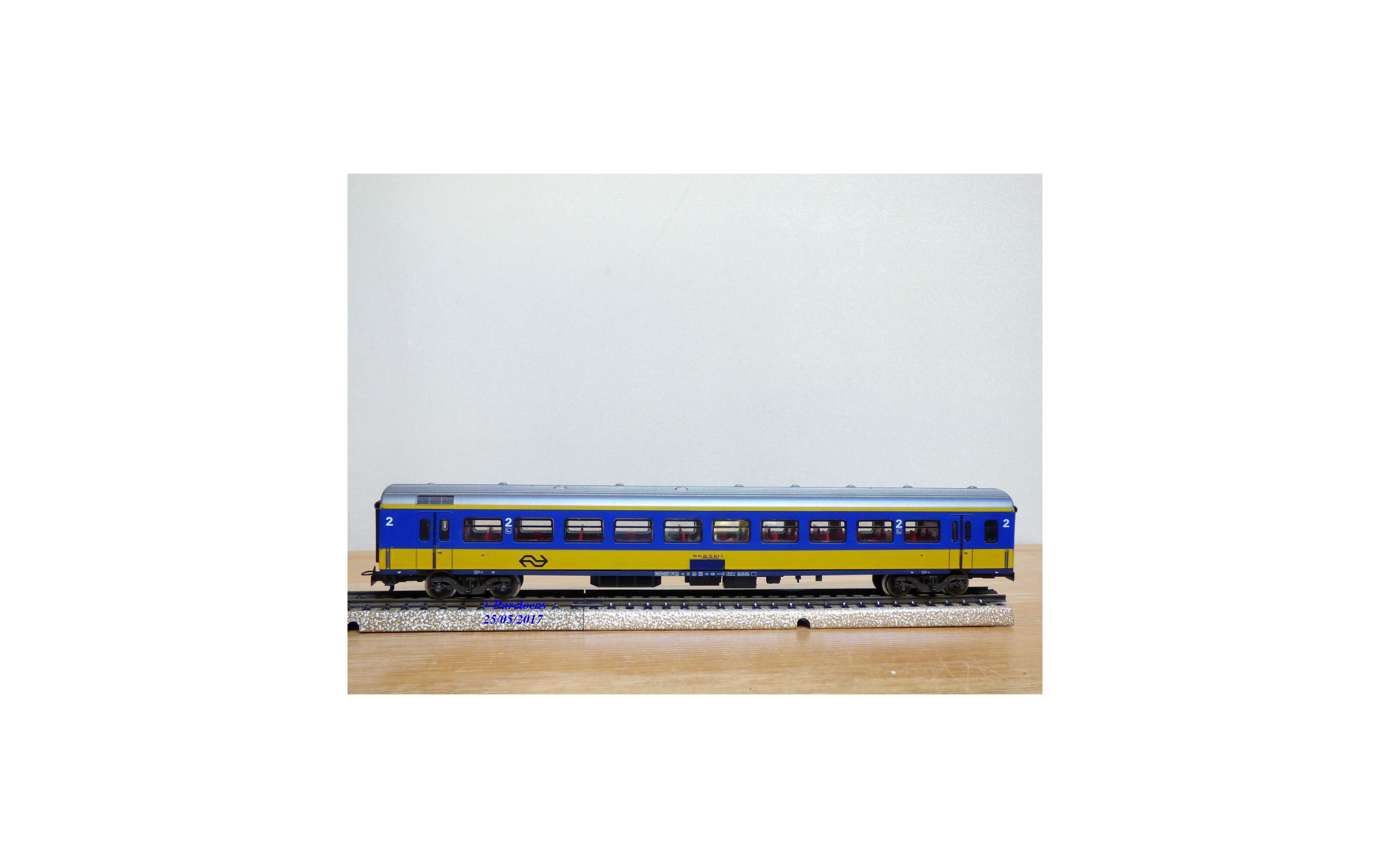 Assez rare voiture grandes lignes Intercity de 2 ème classe à 2 bogies des chemins de fer hollandais ( NS ), livrée bleu roi et jaune à toit gris argent, notice présente, boîte d'origine état très moyen.