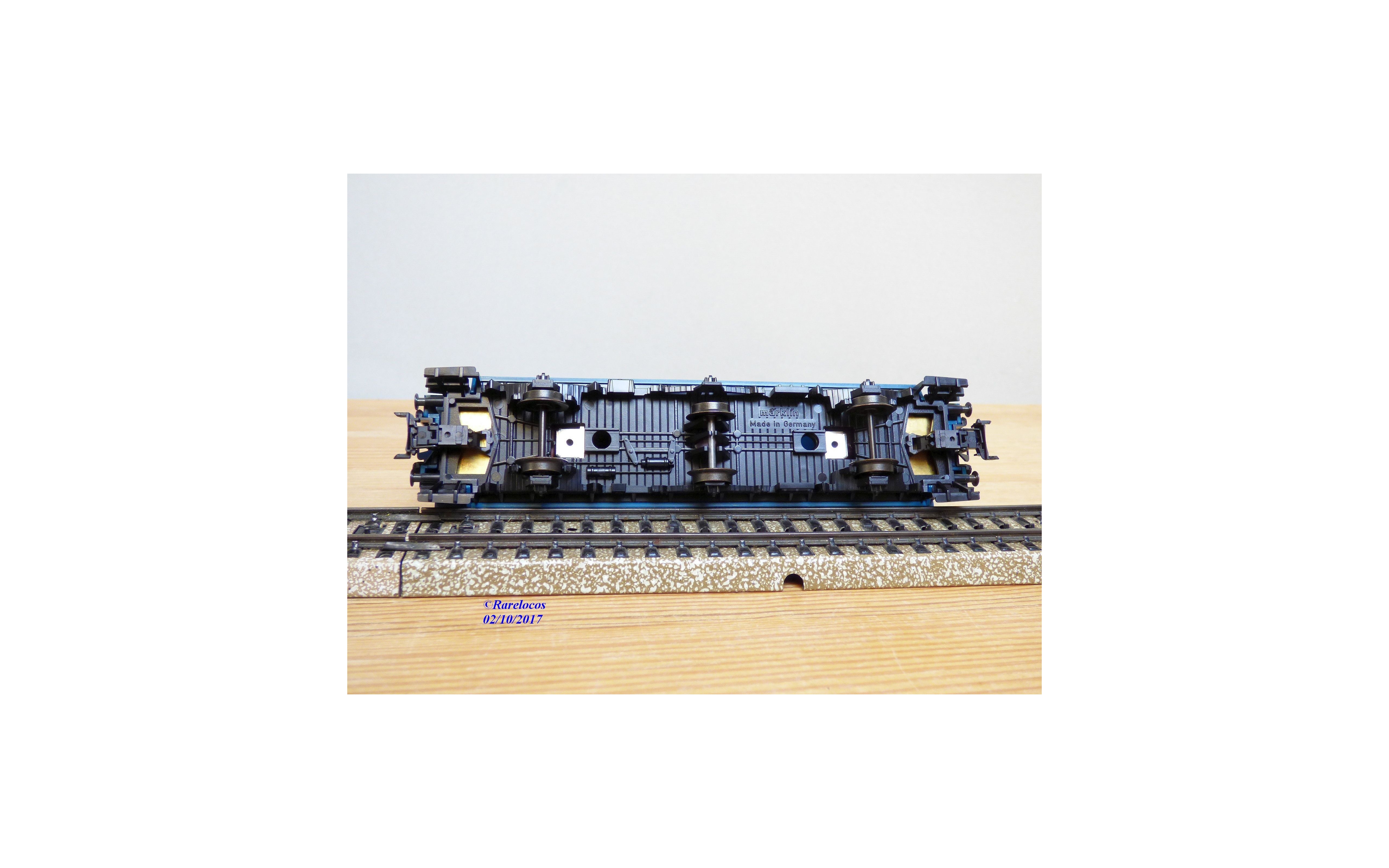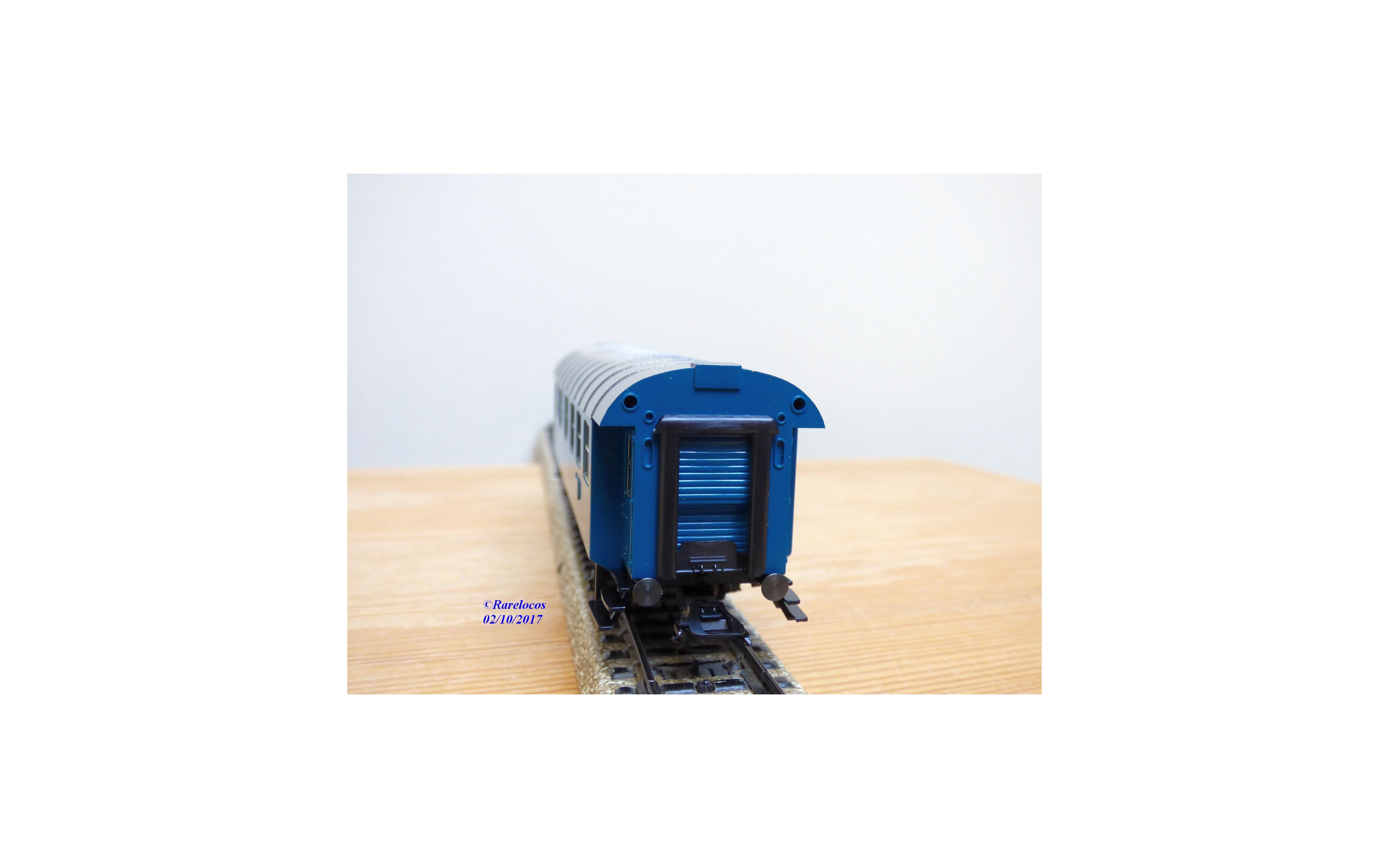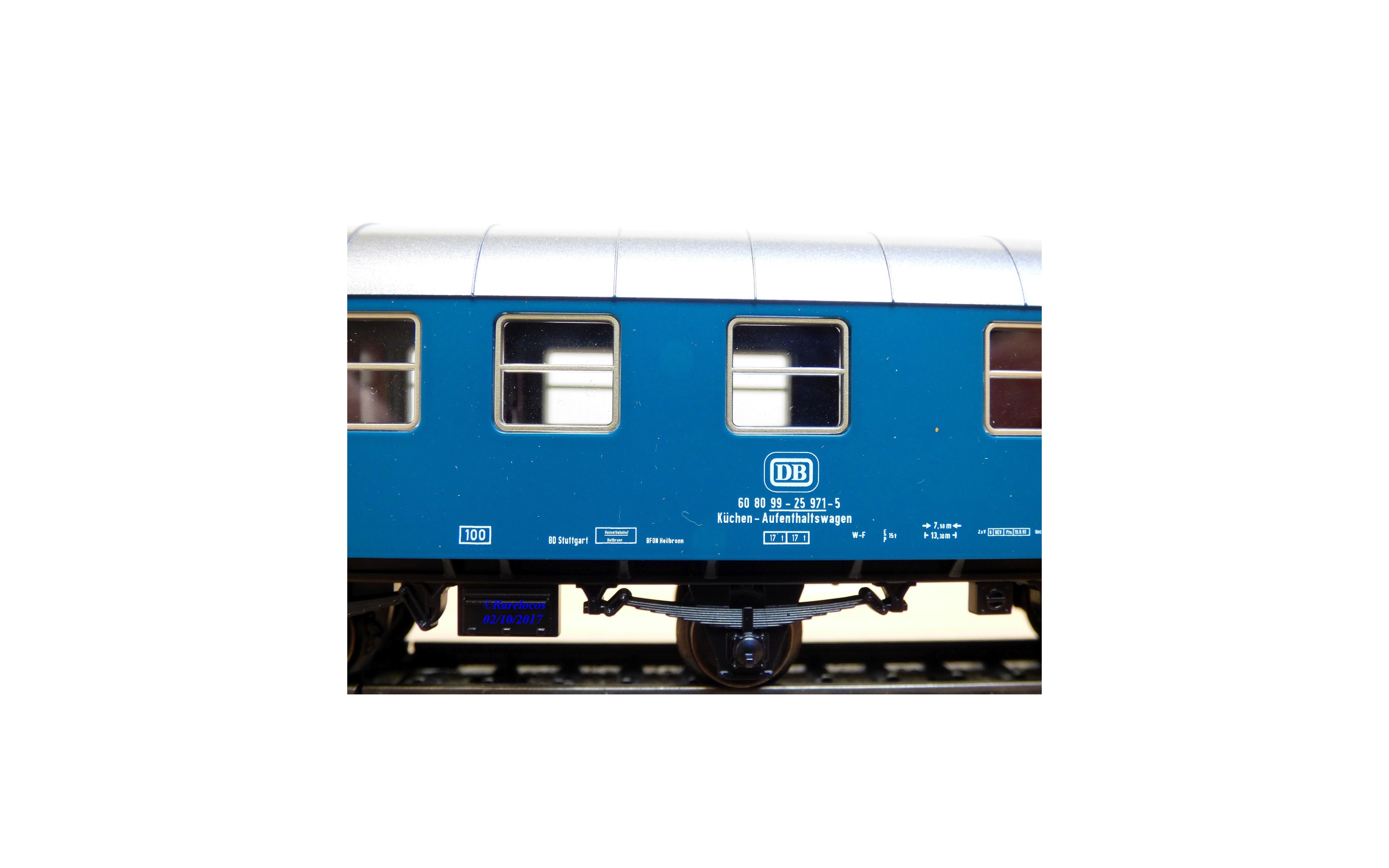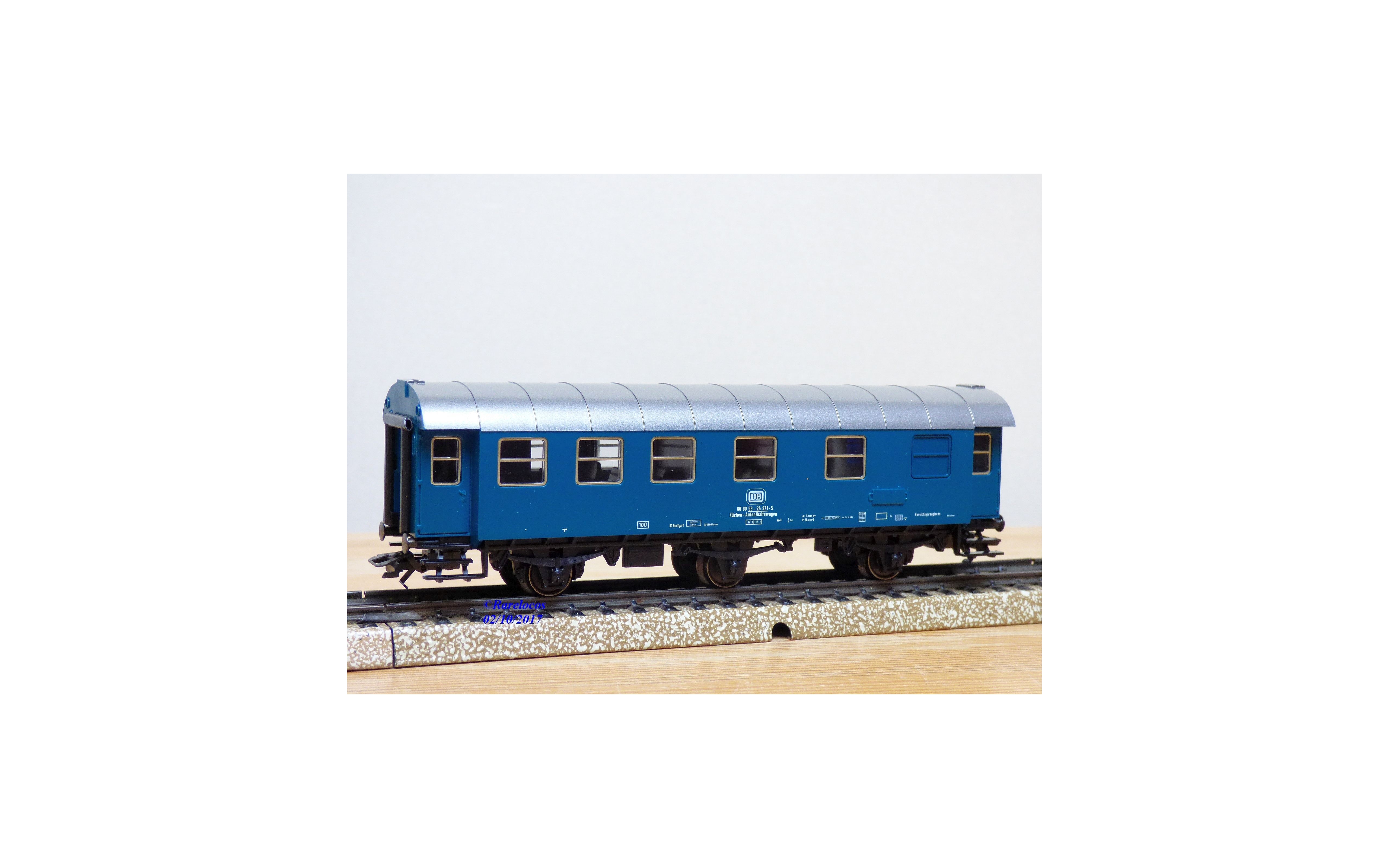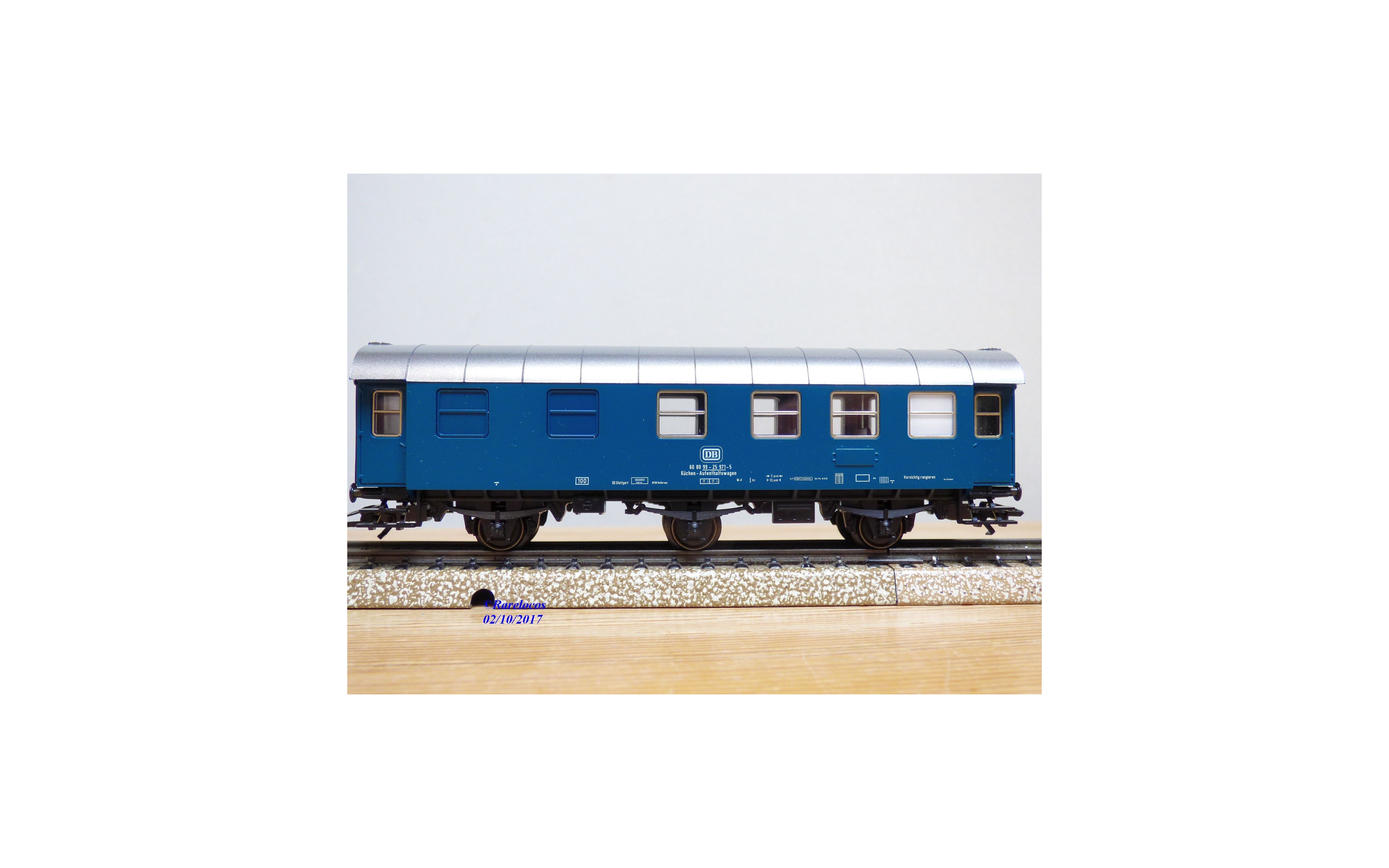 Voiture de service ( Bahndienstwagen ) à 3 essieux ( Umbauwagen ) type AB3yge 756 ( Donnerbuchsen ) des chemins de fer allemands ( DB ), livrée bleu roi à toit gris argent, boîte d'origine en état neuf .
