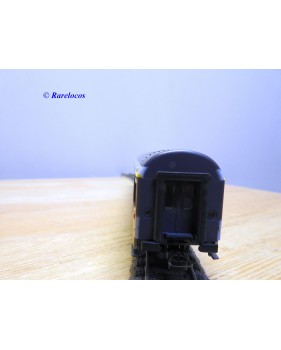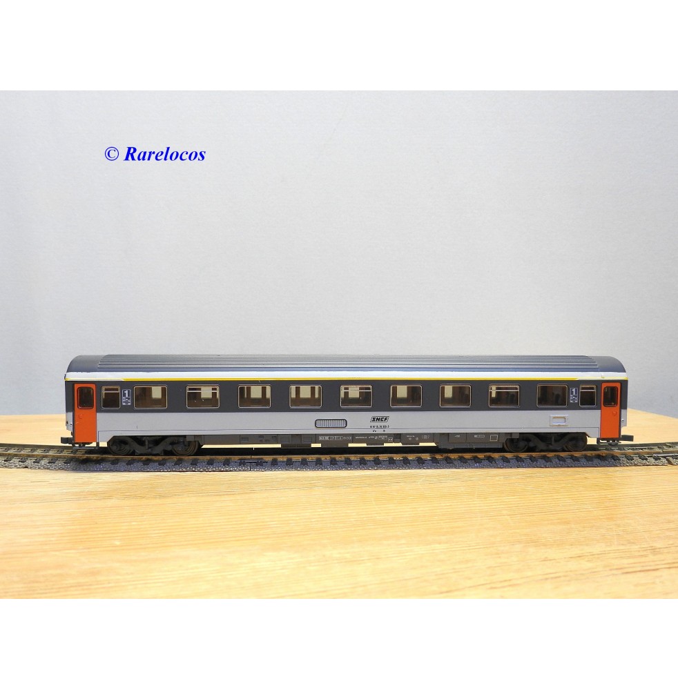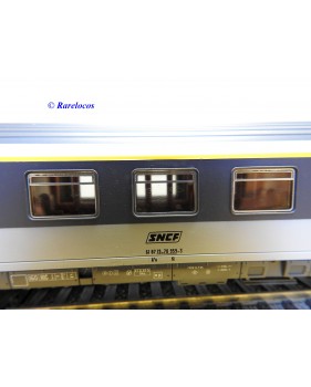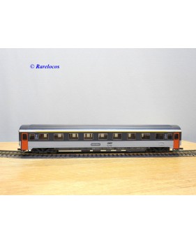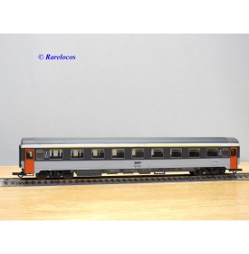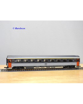 Voiture grande lignes à bogies UIC type A 9 u dite Corail de 1 ère classe des chemins de fer français (SNCF), livrée grise à portes oranges, aménagements intérieurs, attelages à élongation, pièces de détaillage encore scellées, notice et plaques d' itinéraires présentes, immatriculation :61 87 19-70 959-3, boîte d'origine en bon état.