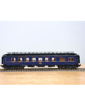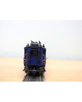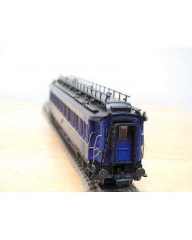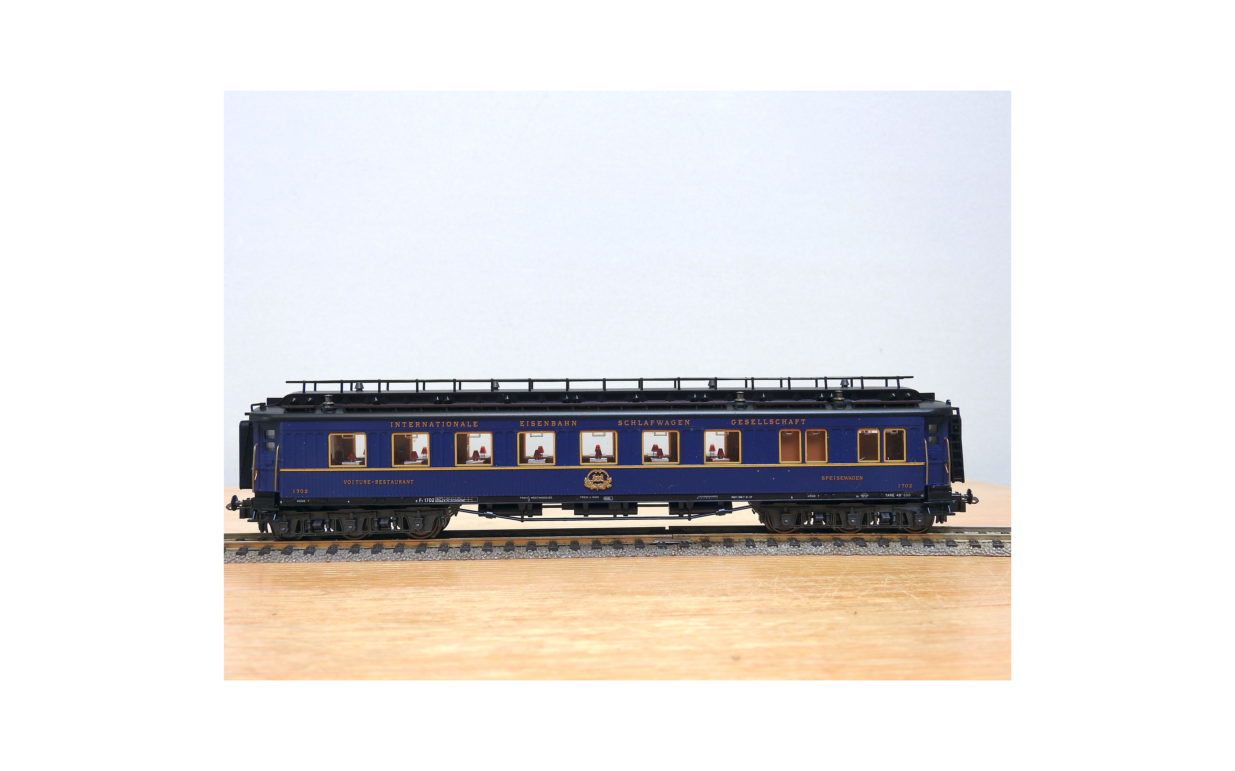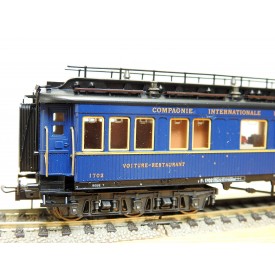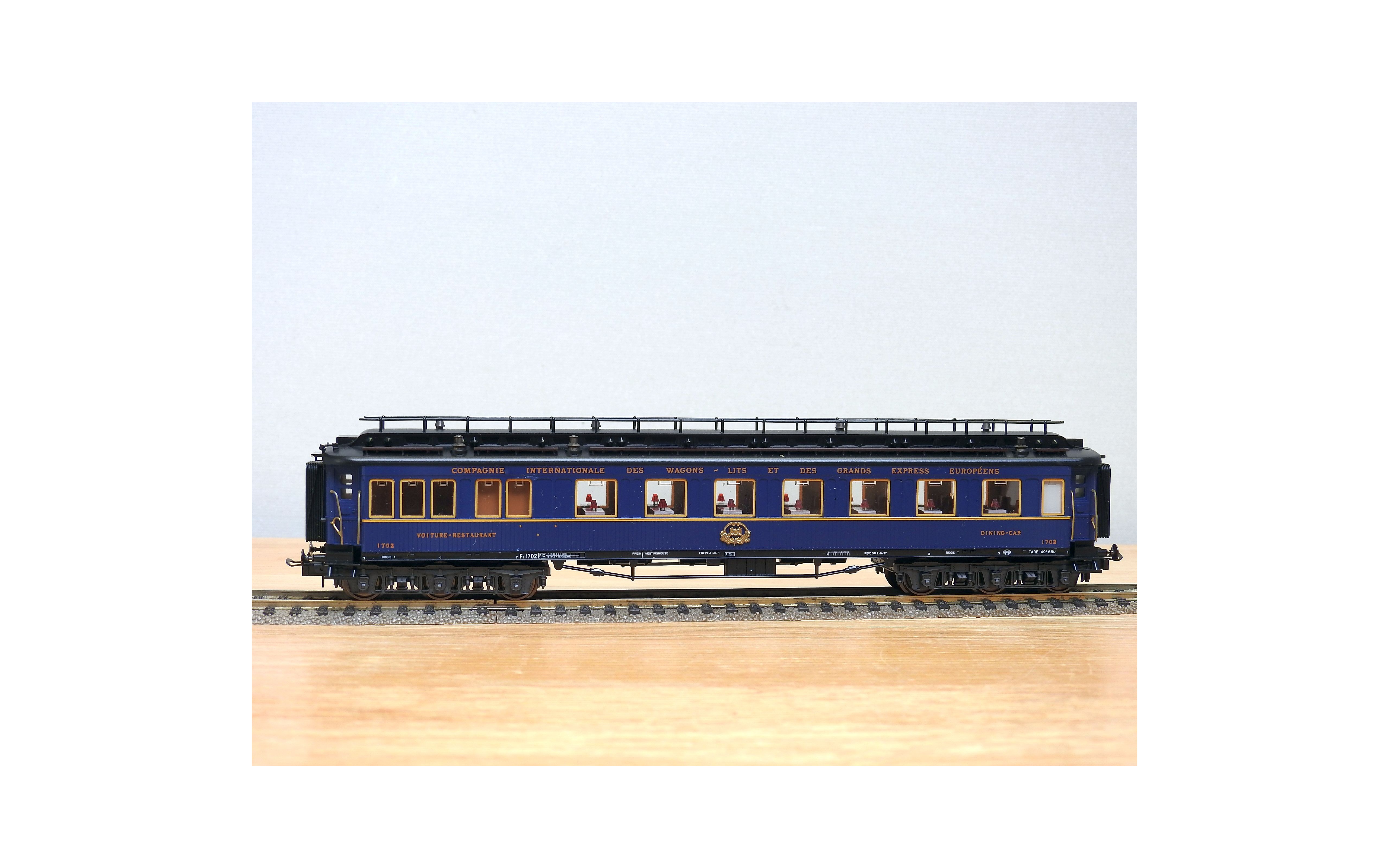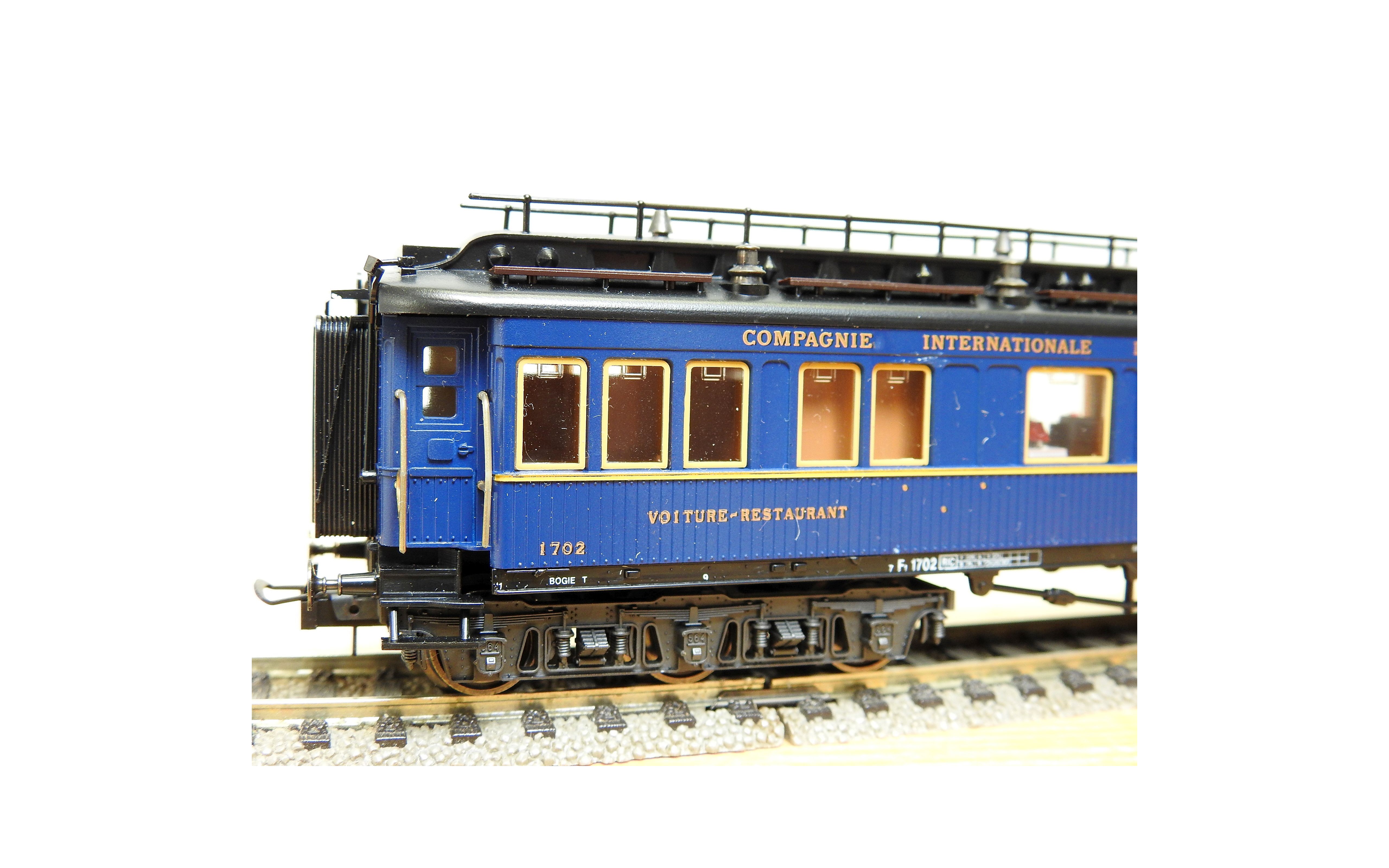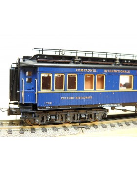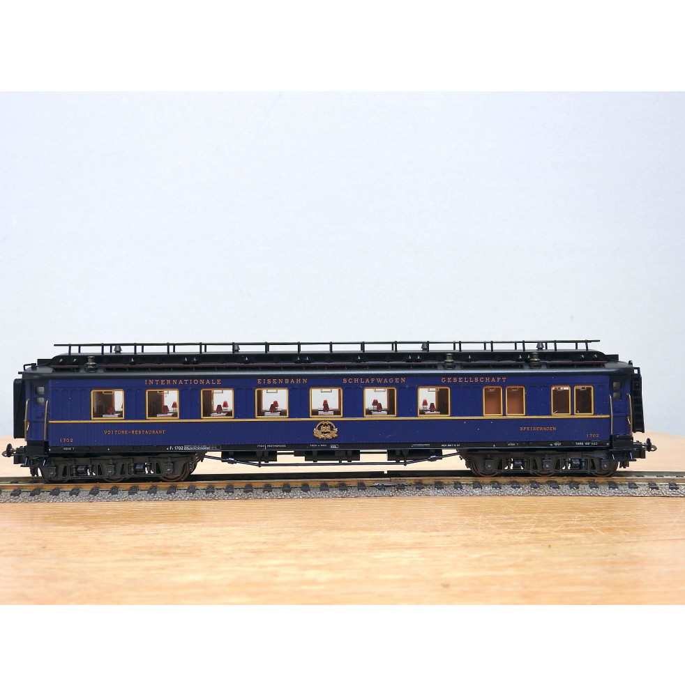 Très jolie voiture restaurant en teck à 2 bogies de 3 essieux de la CIWL, élégante livrée bleue à toit noir, aménagements et éclairage intérieurs ( testé partiellement OK ), immatriculation : 1702, boîte d'origine en bon état.