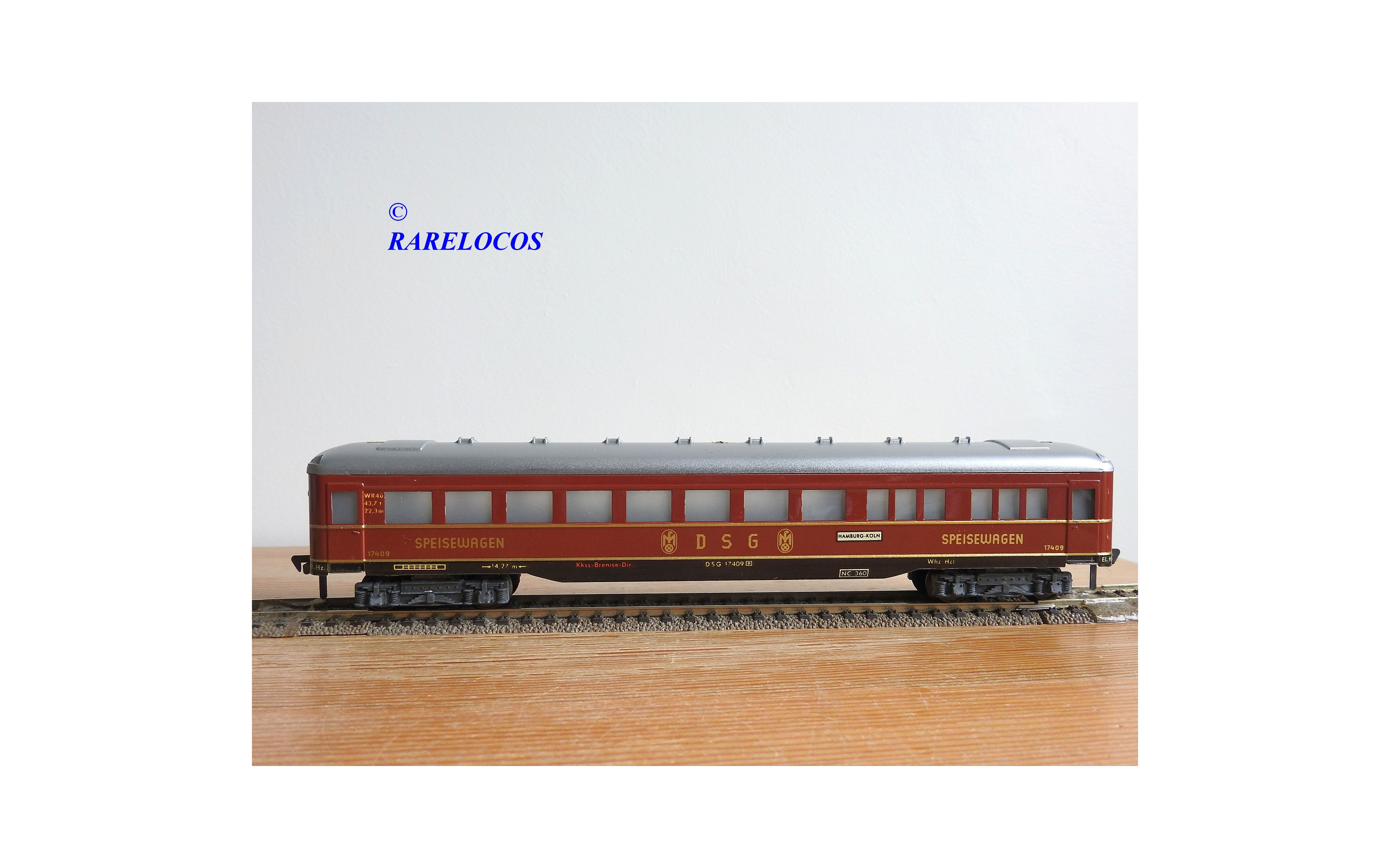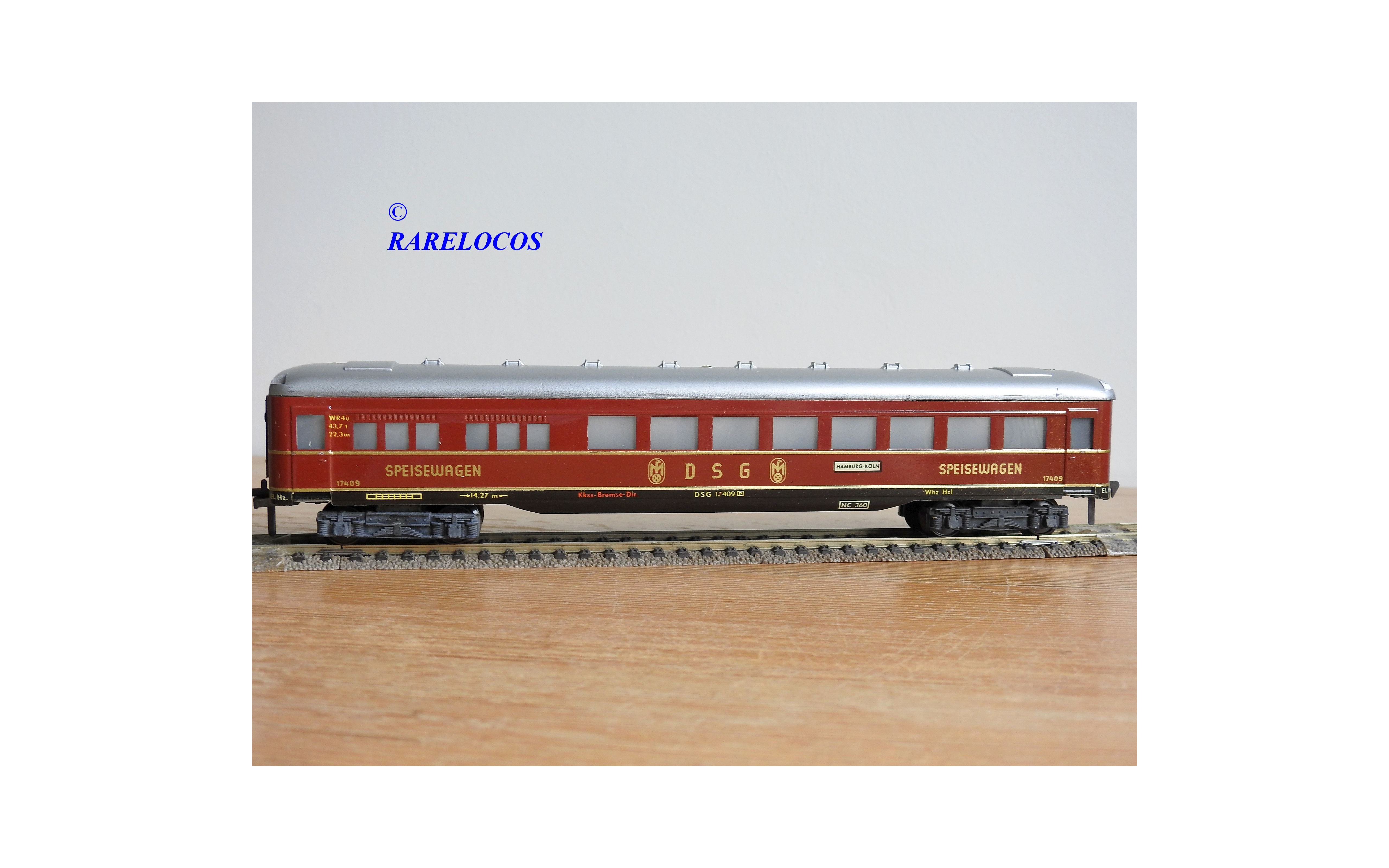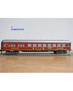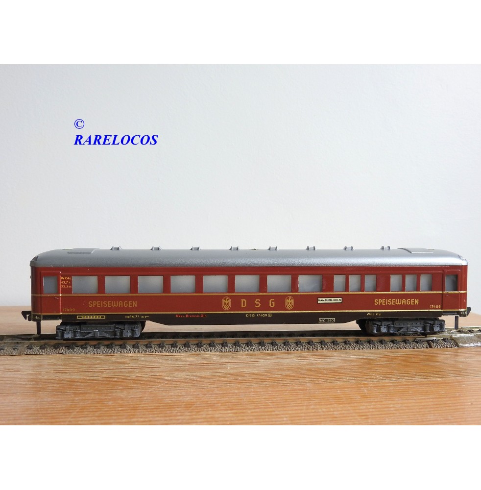 Voiture restaurant des chemins de fer allemands ( DSG ), caisse en tôle, toit en plastique, livrée lie de vin, boîte d'origine en très bon état.