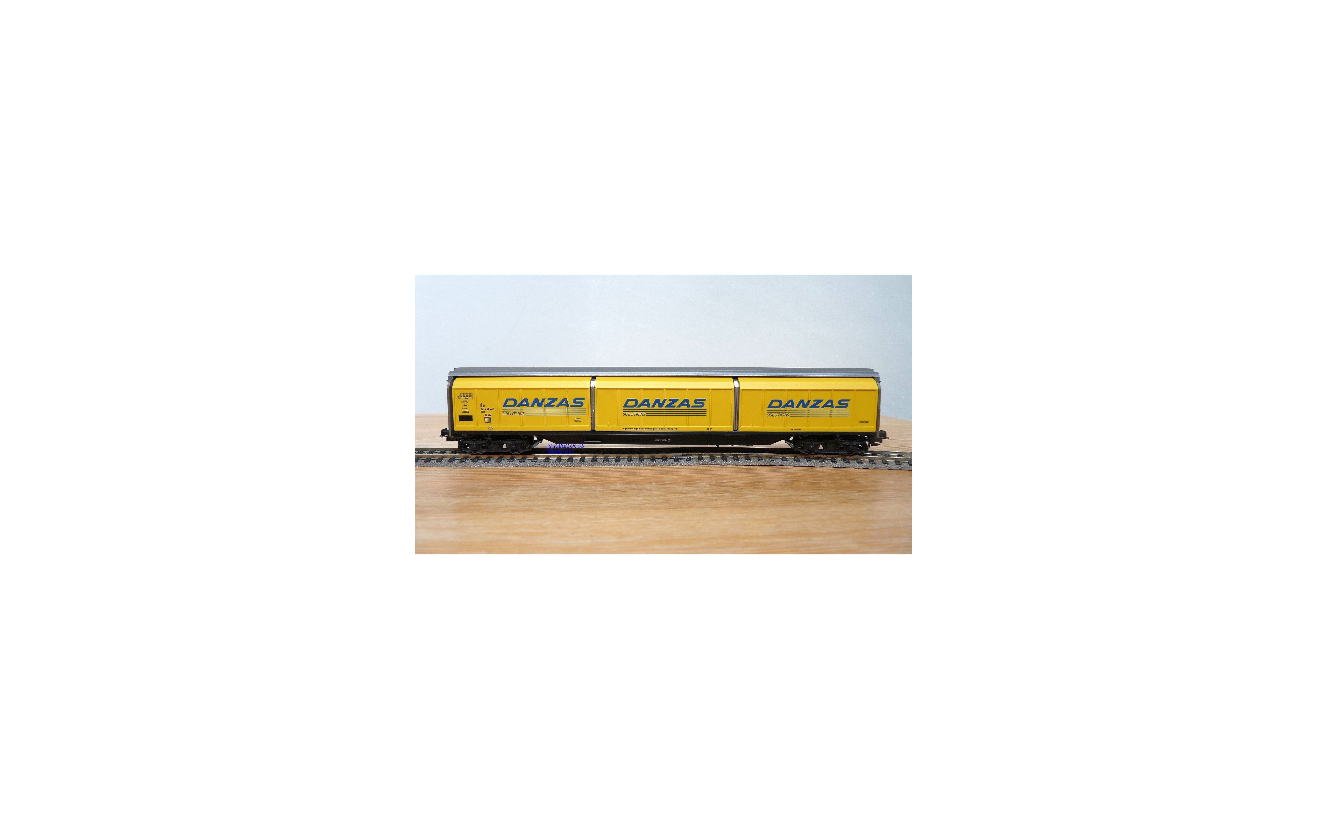 Wagon couvert à parois coulissantes à 2 bogies type Habis des chemins de fer allemands ( DB ), livrée jaune à toit gris argent avec marquages DANZAS, 6 portes coulissantes fonctionnelles, attelages à élongation, boîte d'origine en très bon état.