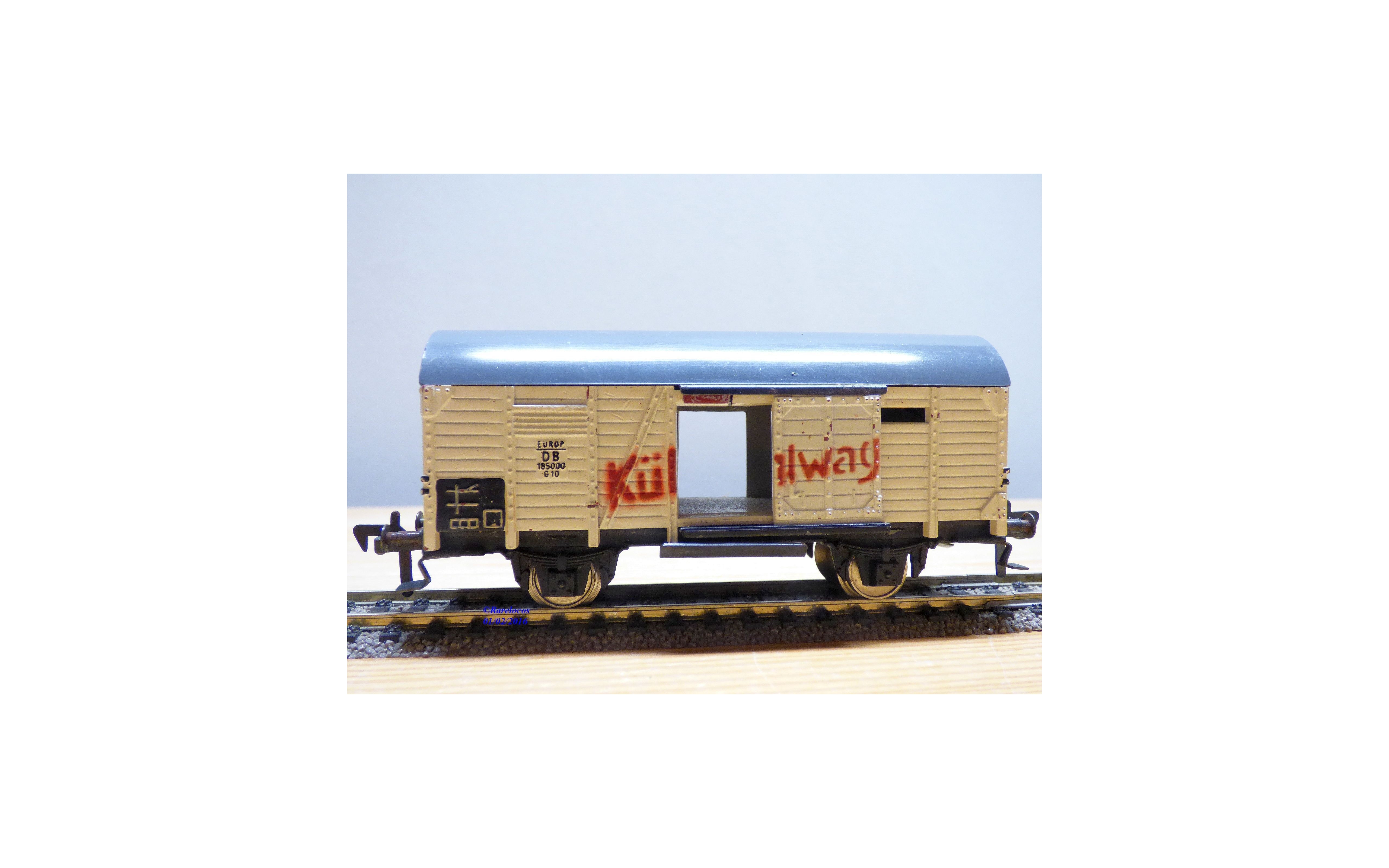 Wagon couvert réfrigérant type G 10 des chemins de fer allemands ( DB ), livrée blanche à toit gris avec marquages Kühlwagen, portes coulissantes fonctionnelles, immatriculation : Europ 185000, pas de boîte d'origine.