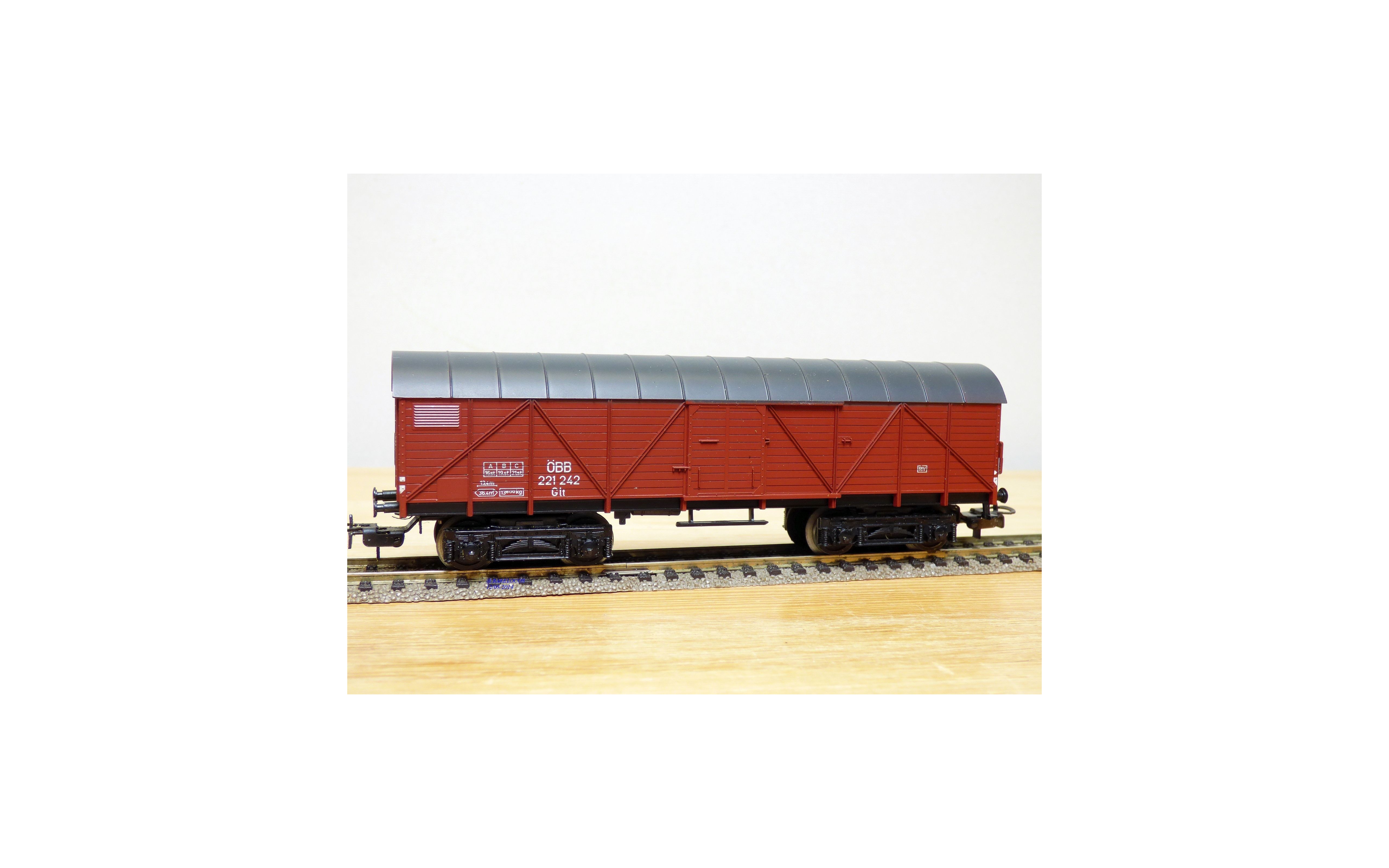 Rare wagon couvert à chargement latéral et frontal type Glt à 2 essieux des chemins de fer autrichiens ( ÖBB ), livrée marron à toit gris, emballage d'origine en excellent état .