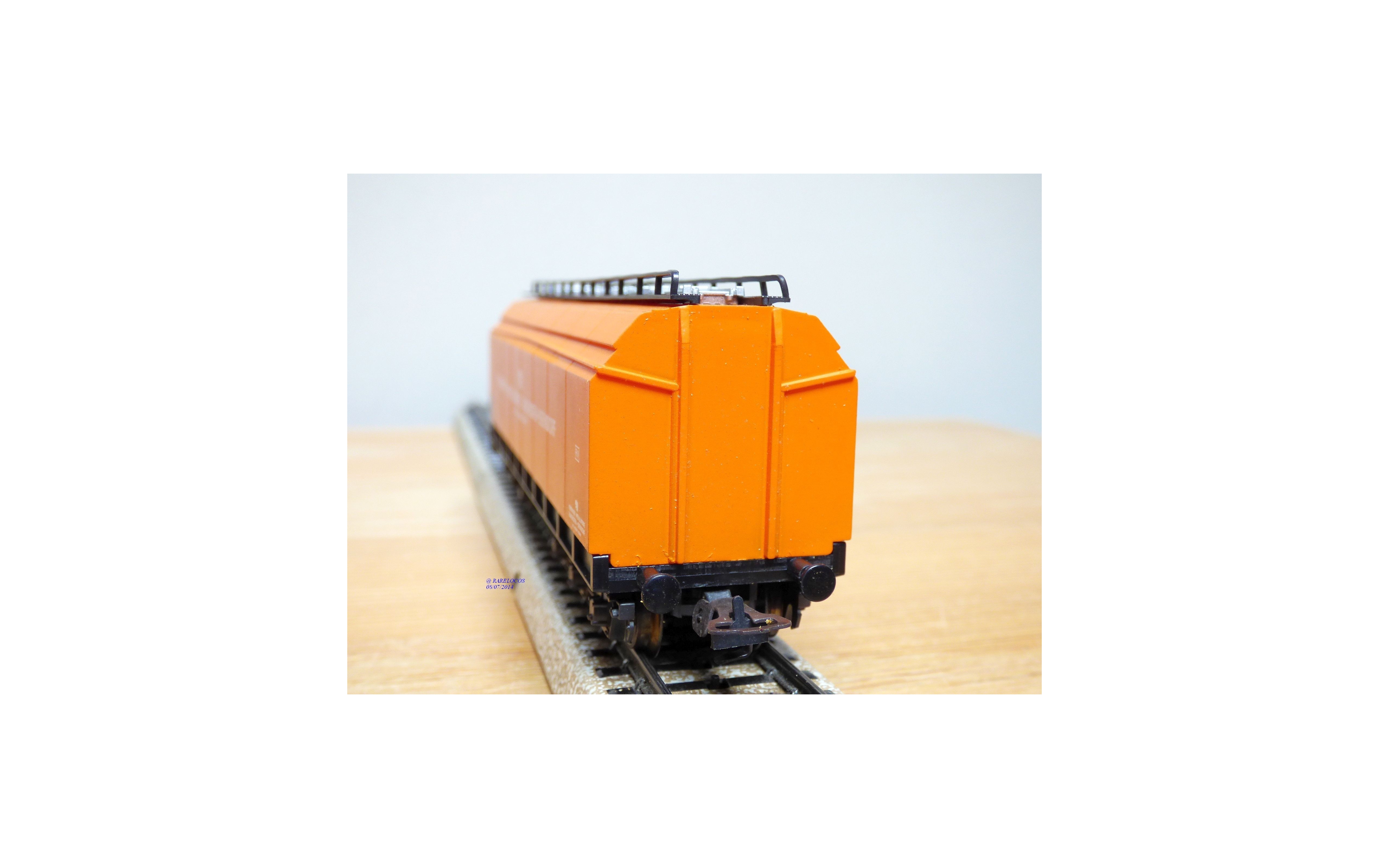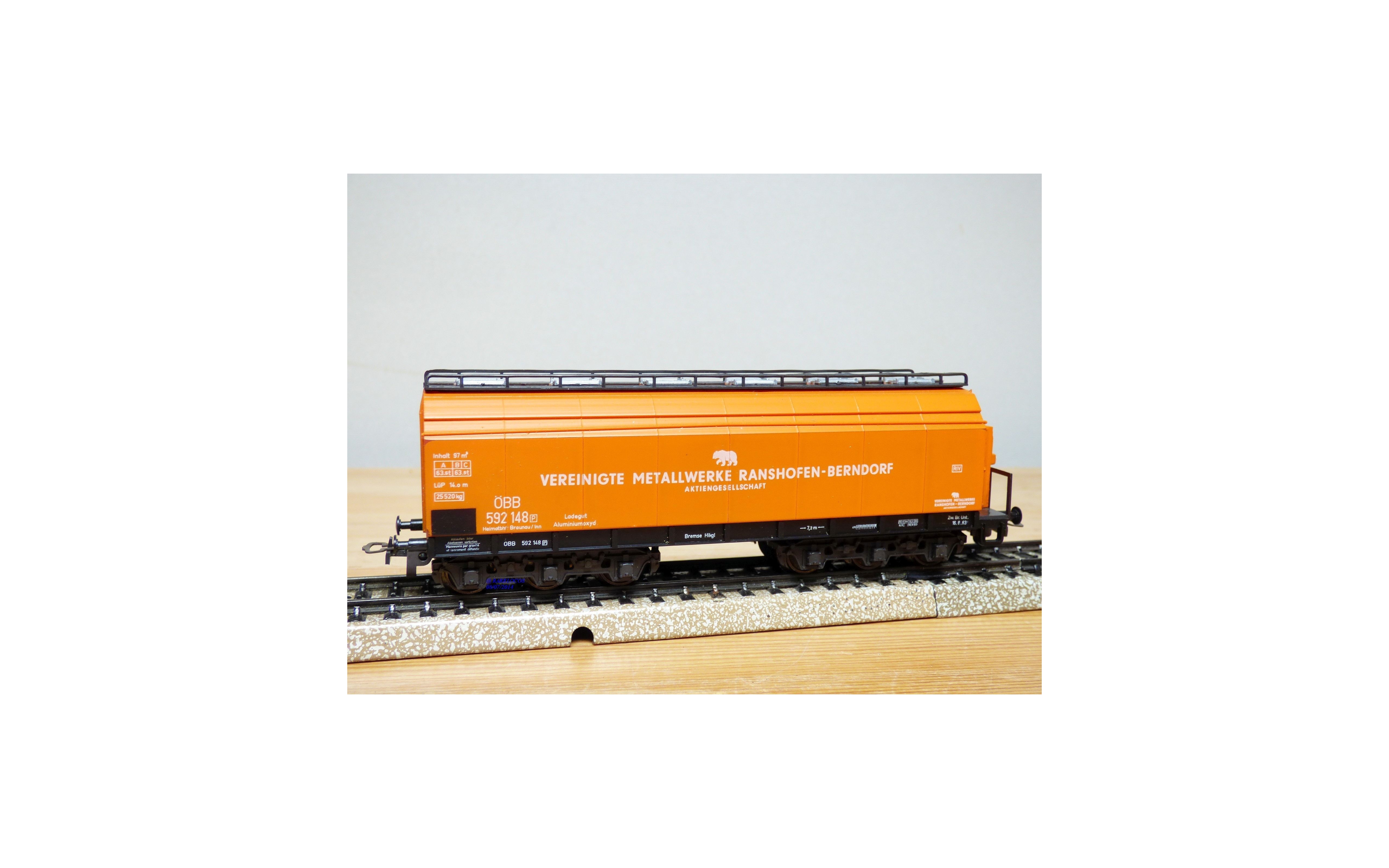 Wagon trémie spécial pour le transport d'oxyde d'aluminium à guérite de serre freins à 2 bogies de 3 essieux des chemins de fer autrichiens ( ÖBB ), livré orange avec marquages Vereinigte Metallwerke Ranshofen- Berndorf AG, emballage d'origine en très bon état, mousse HS.