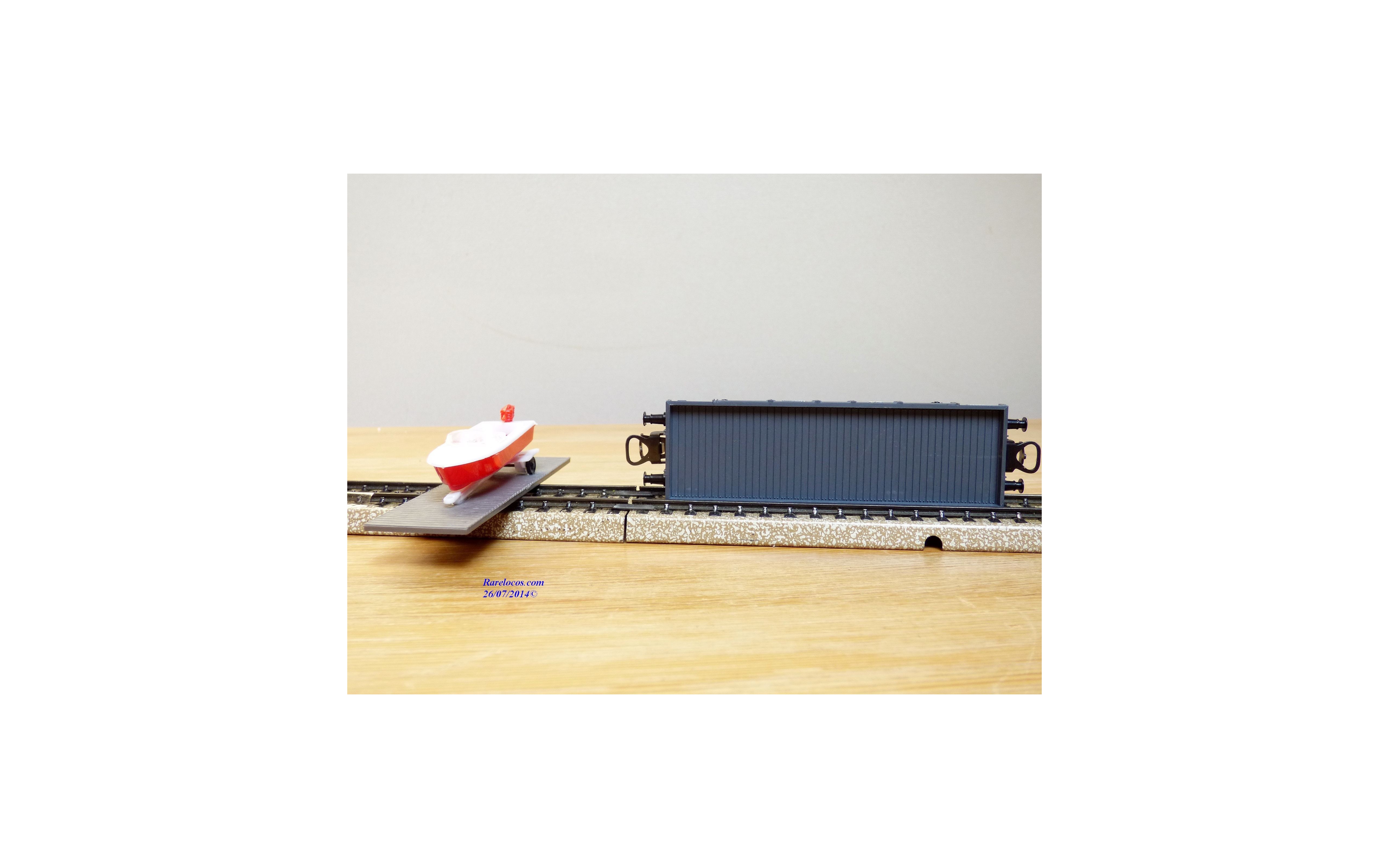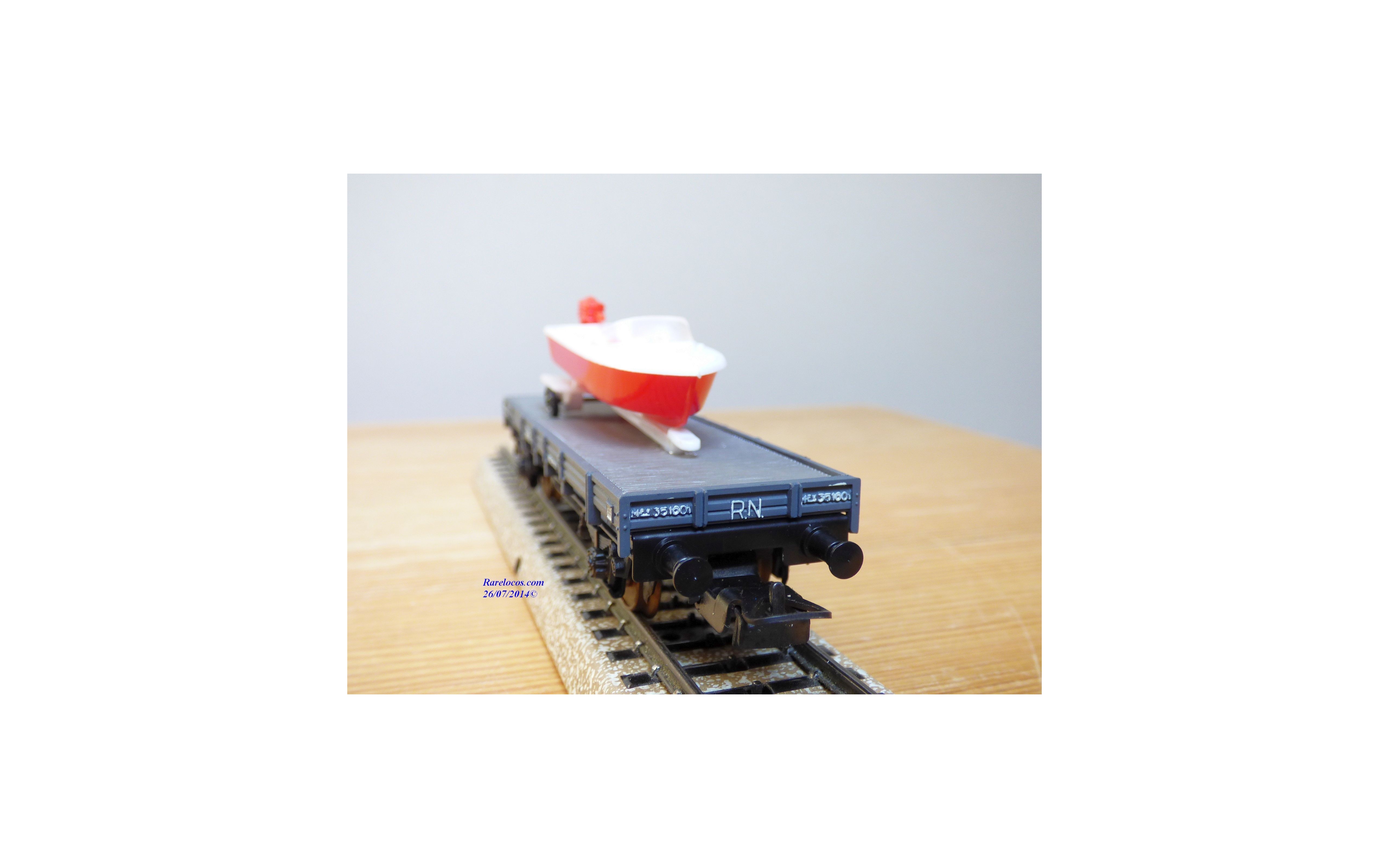 Classique wagon plat à 2 essieux des chemins de fer espagnols ( RENFE), livrée grise , chargé d'un canot hors bord sur sa remorque, boîte d'origine en très bon état .