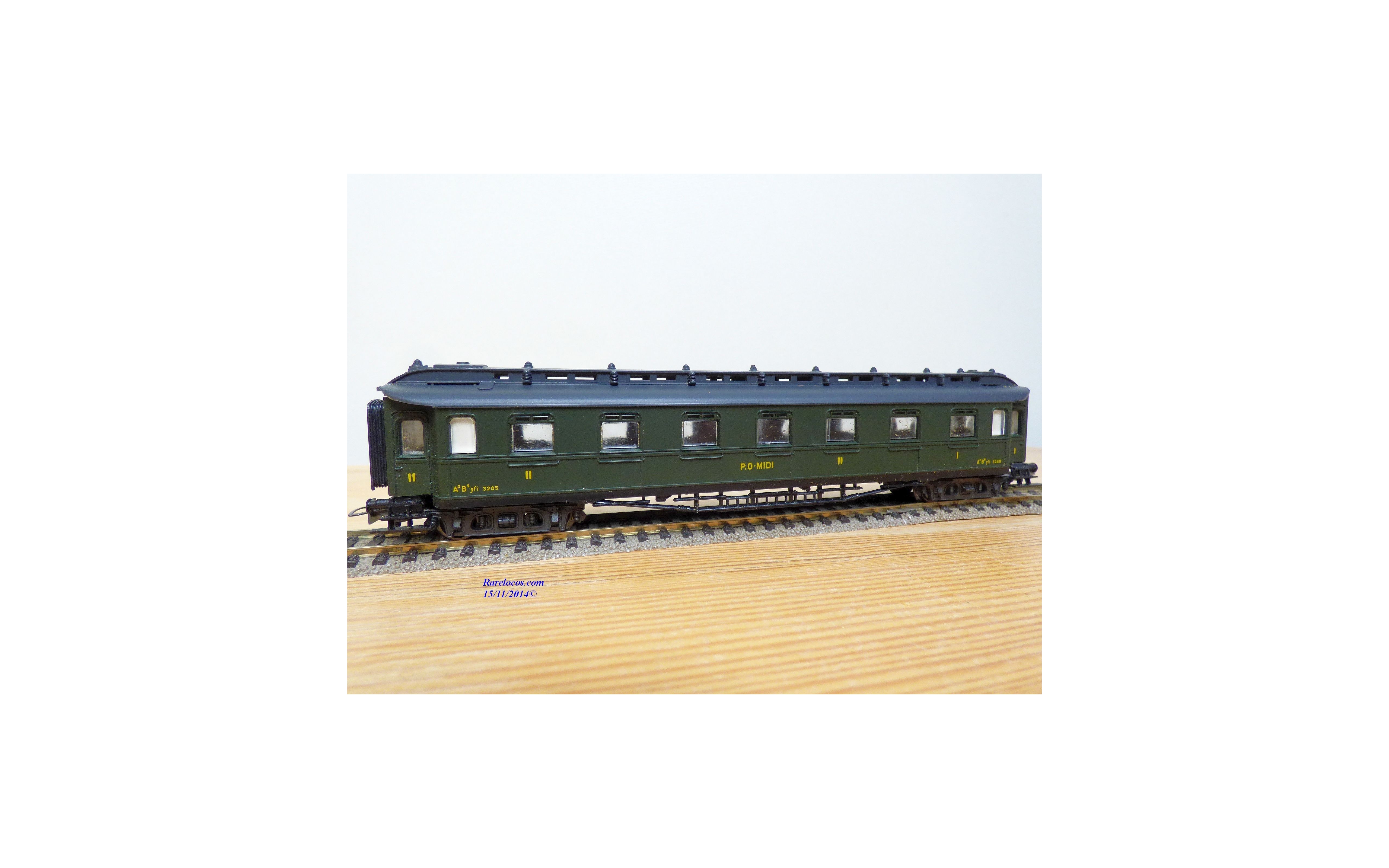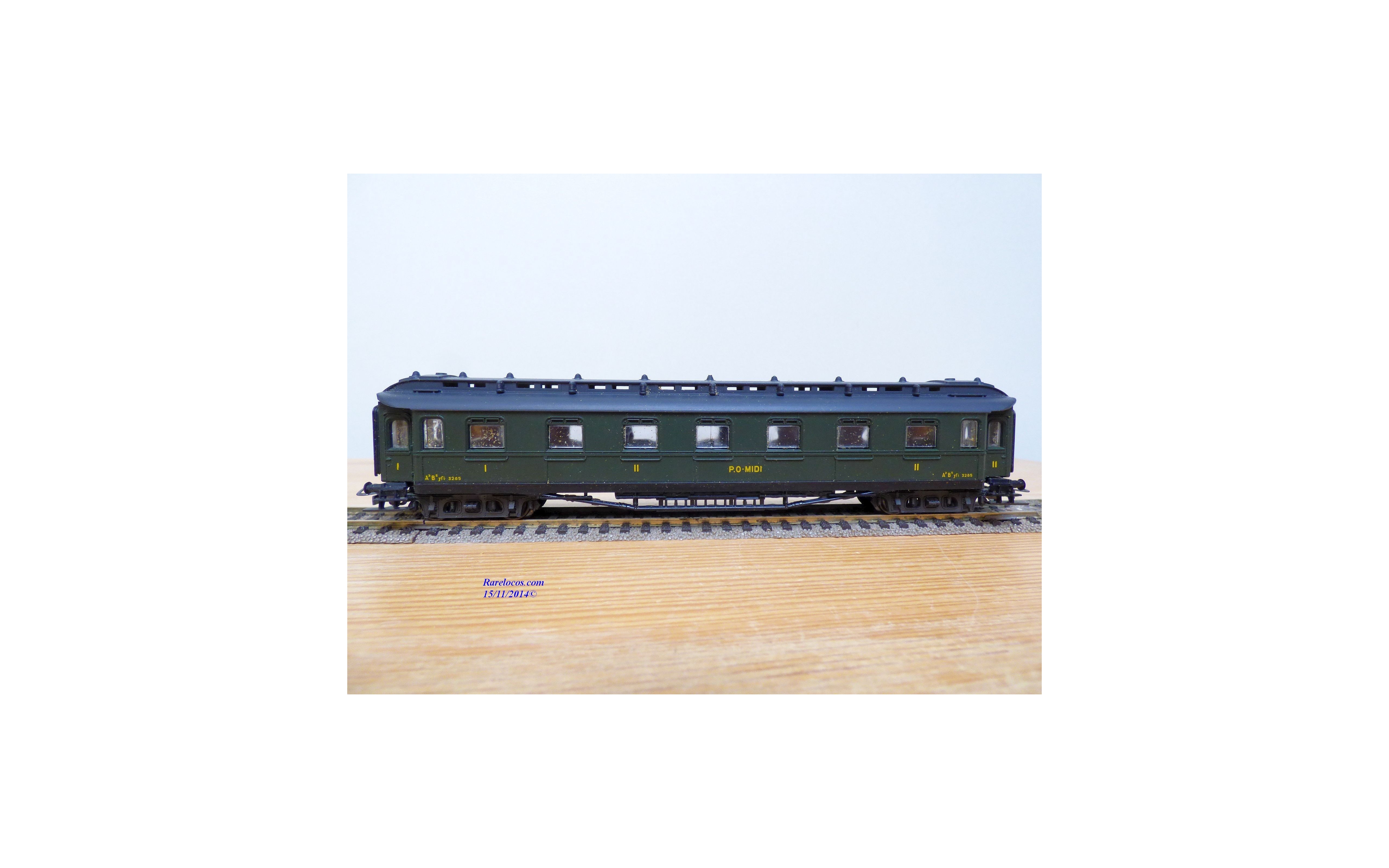 Voiture grandes lignes ex DR à 2 bogies mixte de 1 ère et 2 ème classe type A2B5 des chemins de fer français ( PO-MIDI ), livrée vert SNCF à toit gris, immatriculation : A2B5 yfi 3285, boîte d'origine en excellent état .