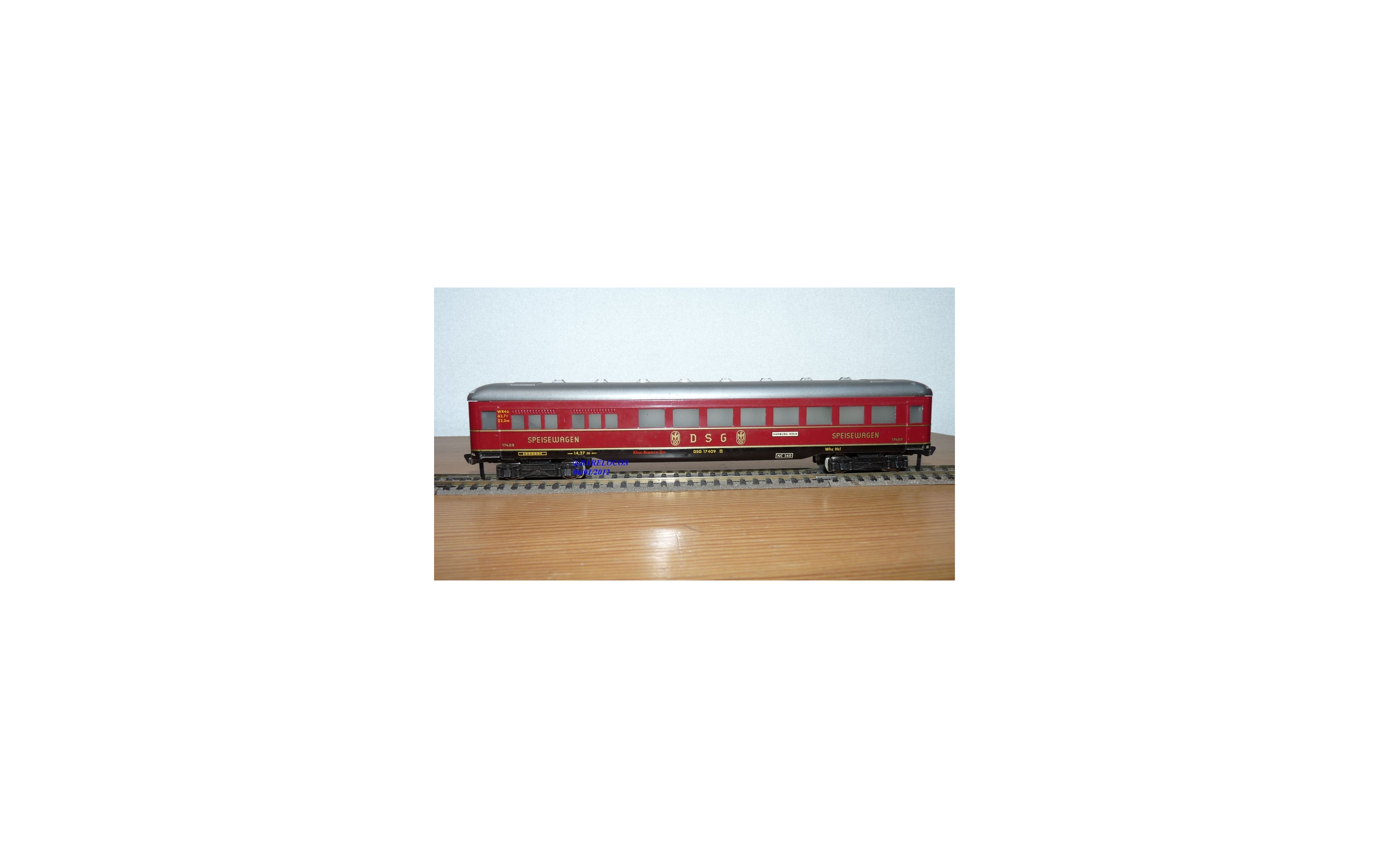 Voiture restaurant des chemins de fer allemands ( DSG ), caisse en tôle, toit en plastique, livrée lie de vin , éclairage intérieur ( testé OK ), boîte d'origine en état moyen mais complète.