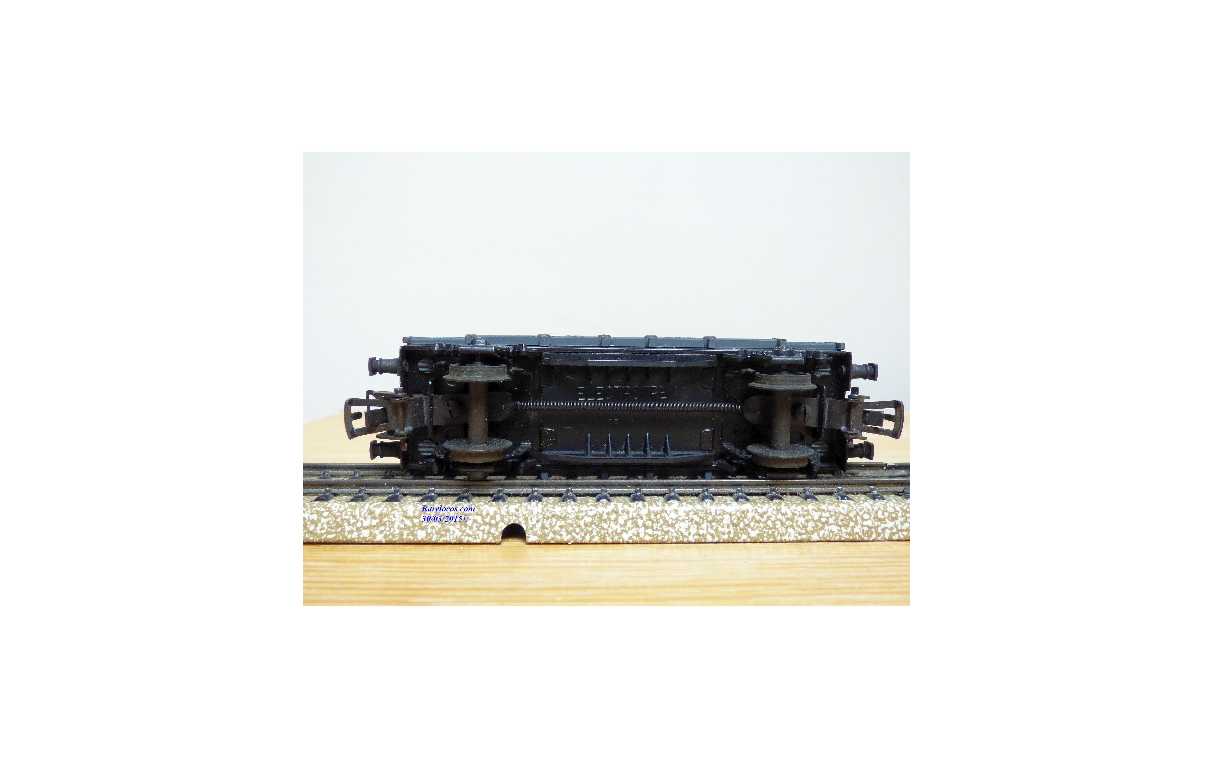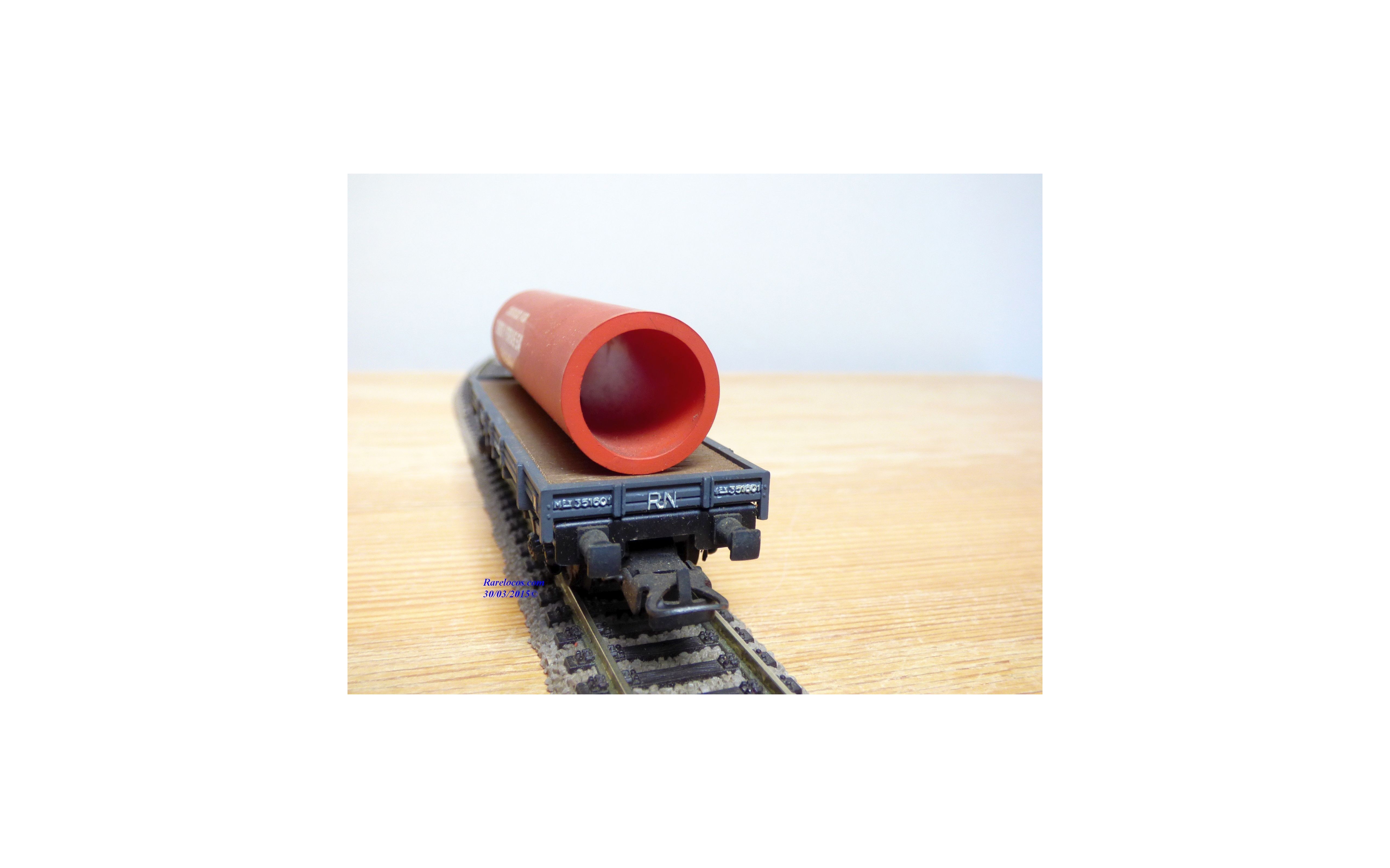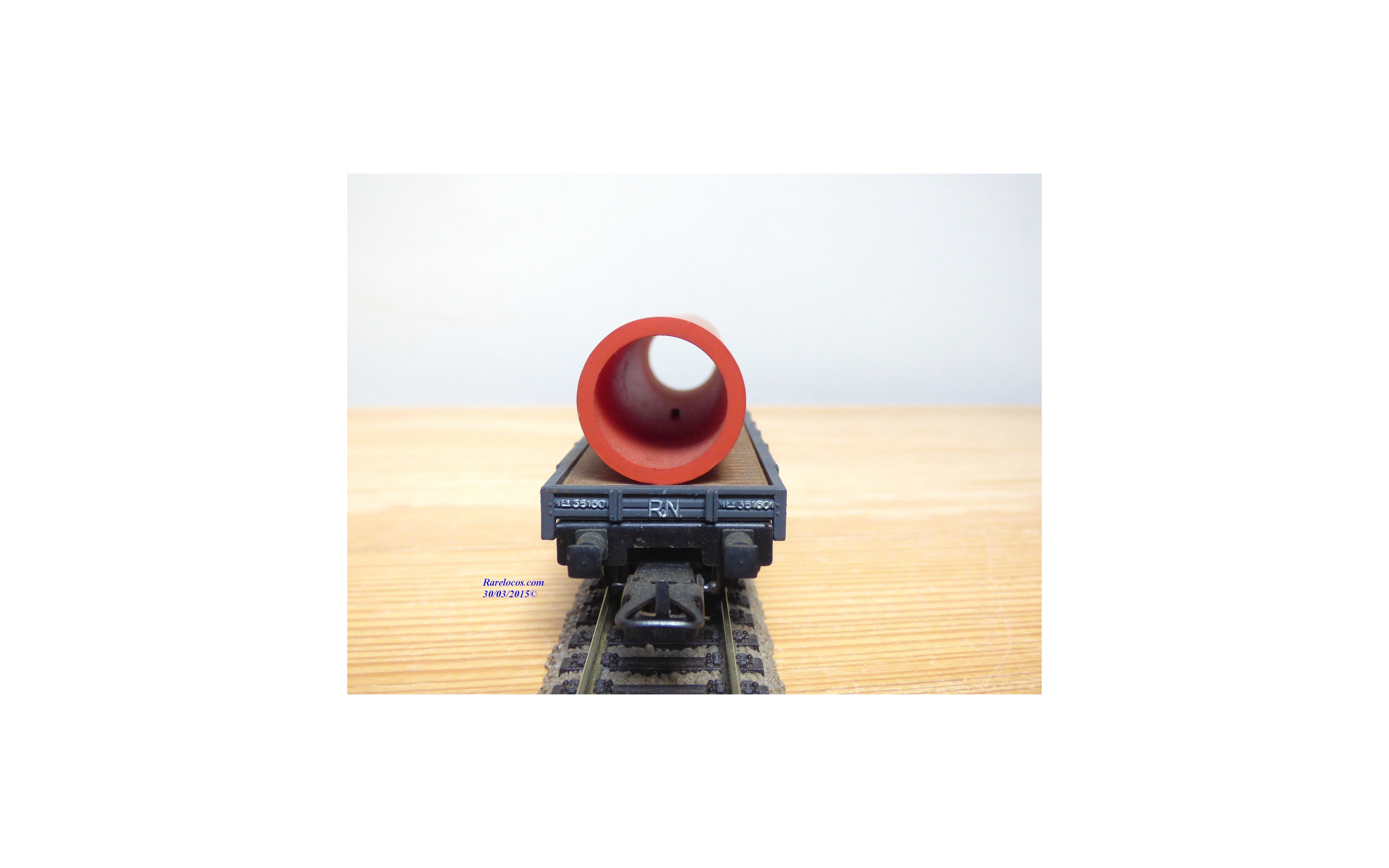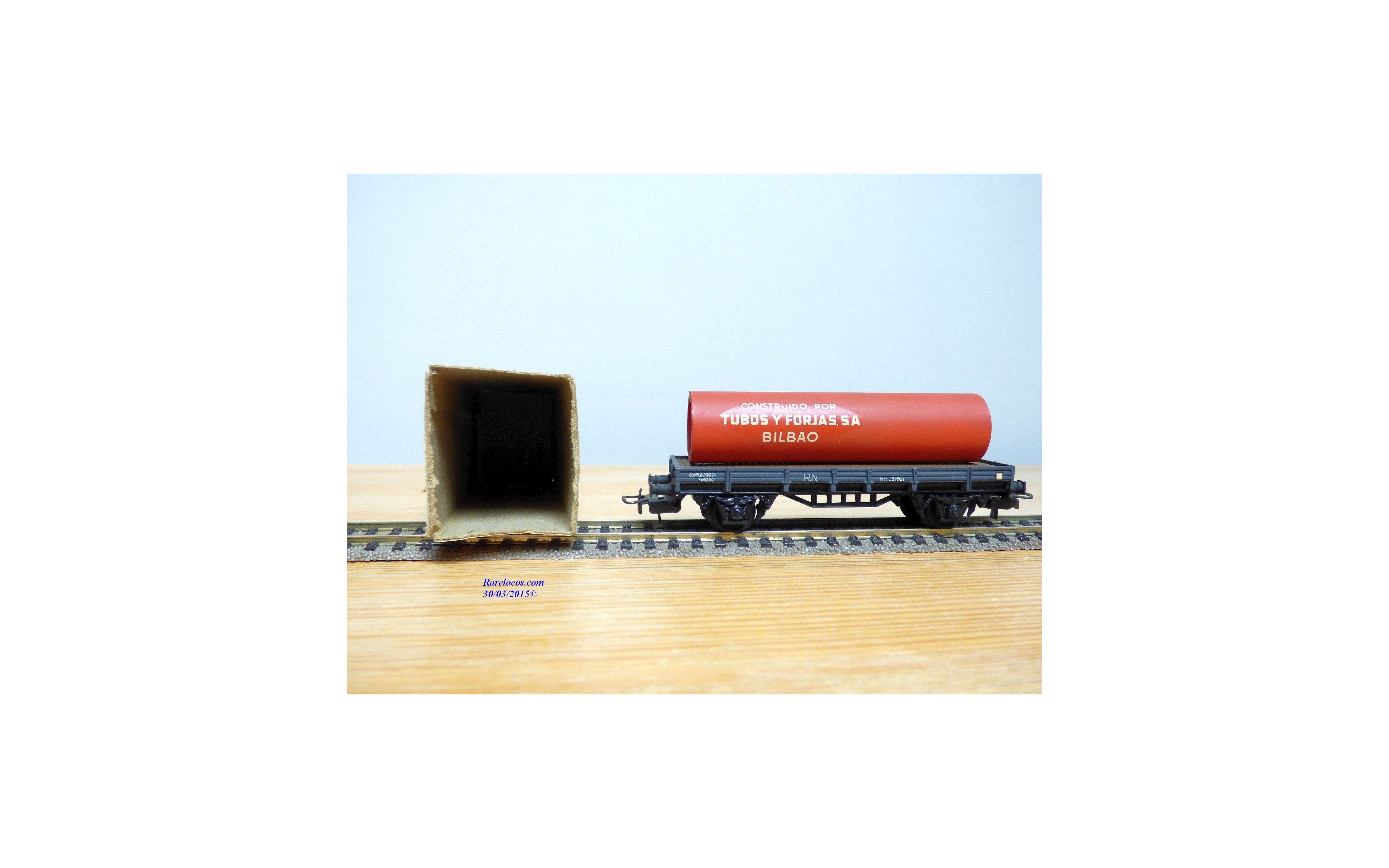 Classique wagon plat à 2 essieux des chemins de fer espagnols ( RENFE), livrée grise , chargé d'un tube amovible de grand diamètre avec marquages TUBOS Y FORJAS BILBAO , boîte d'origine incomplète en état moyen.