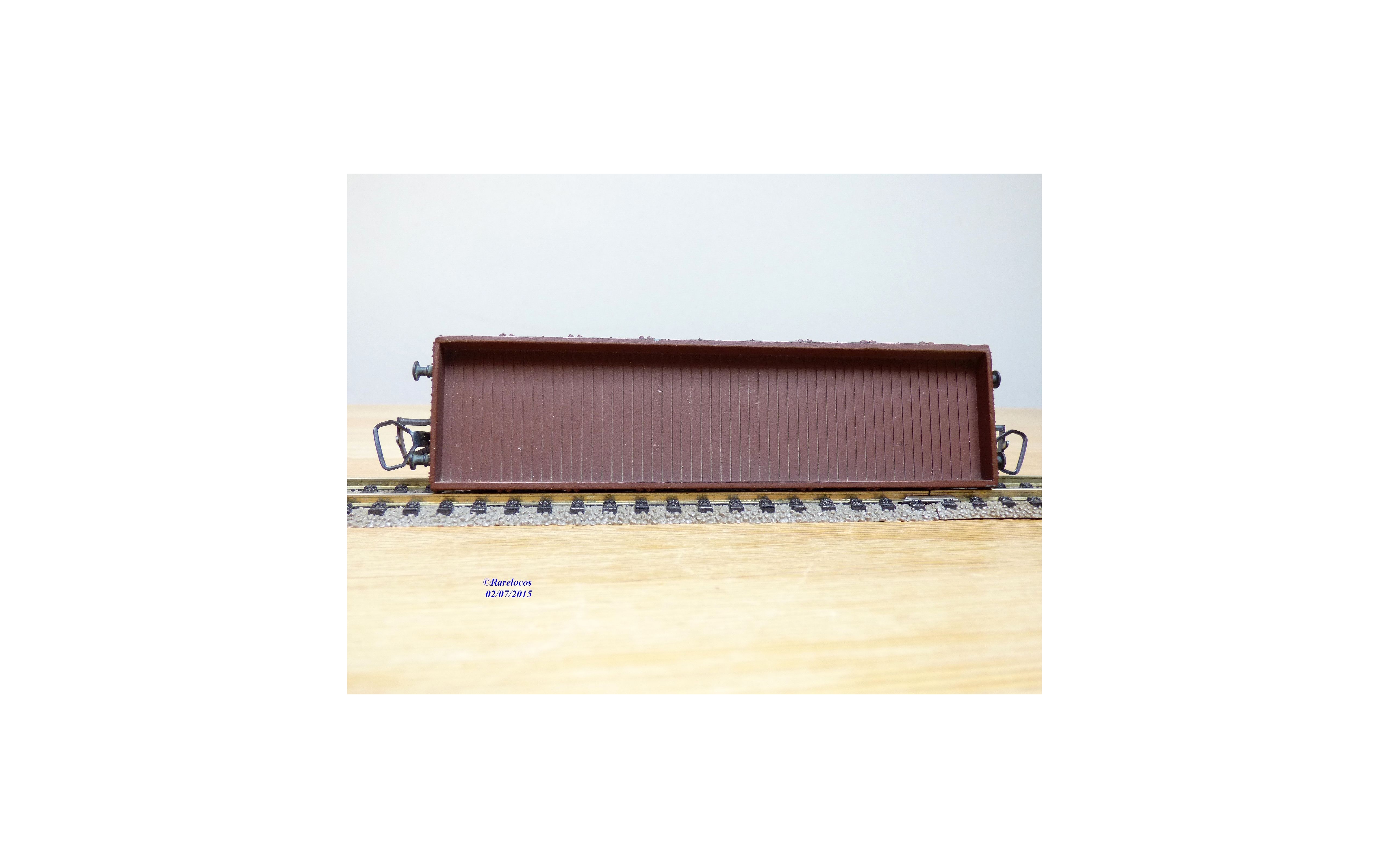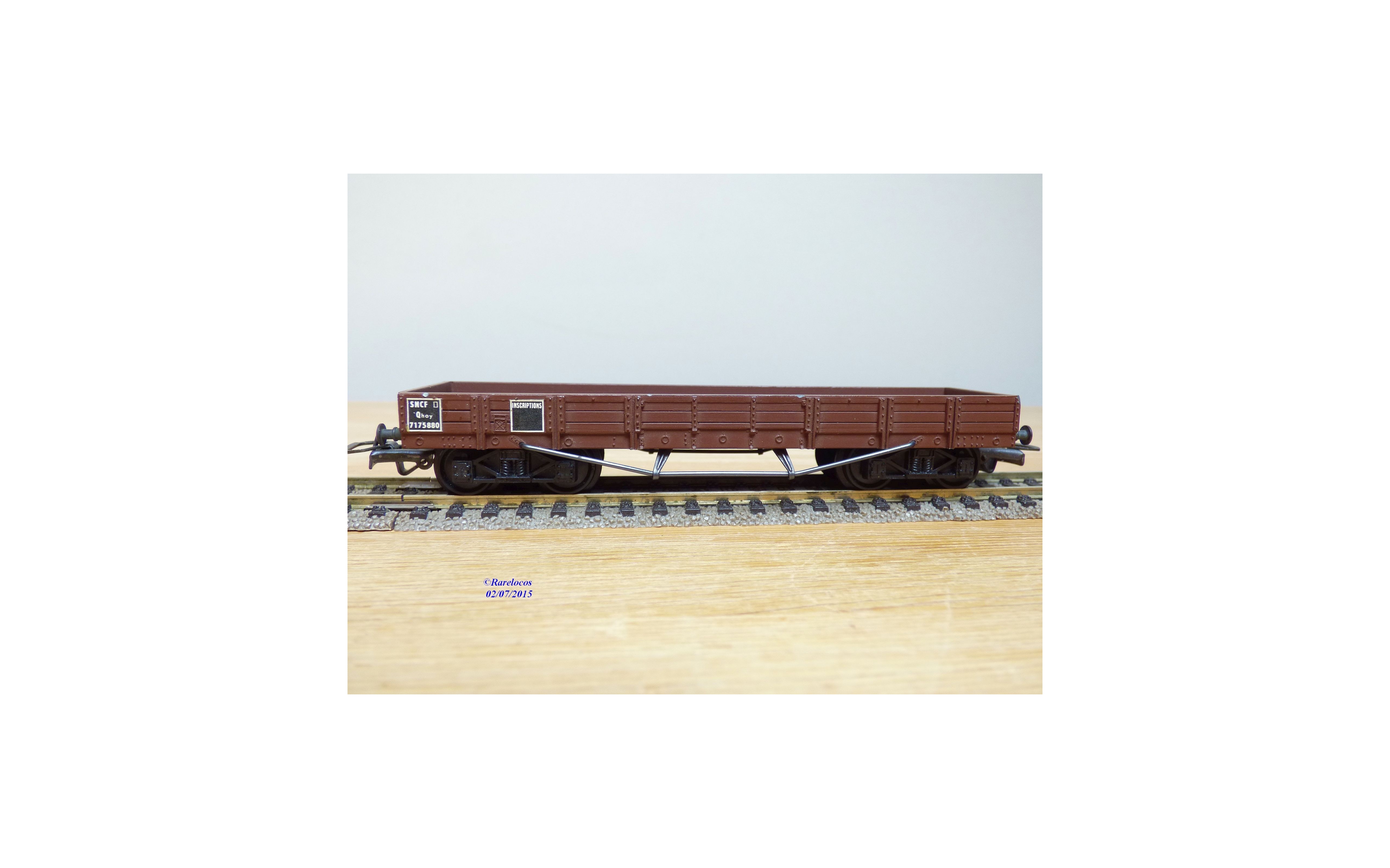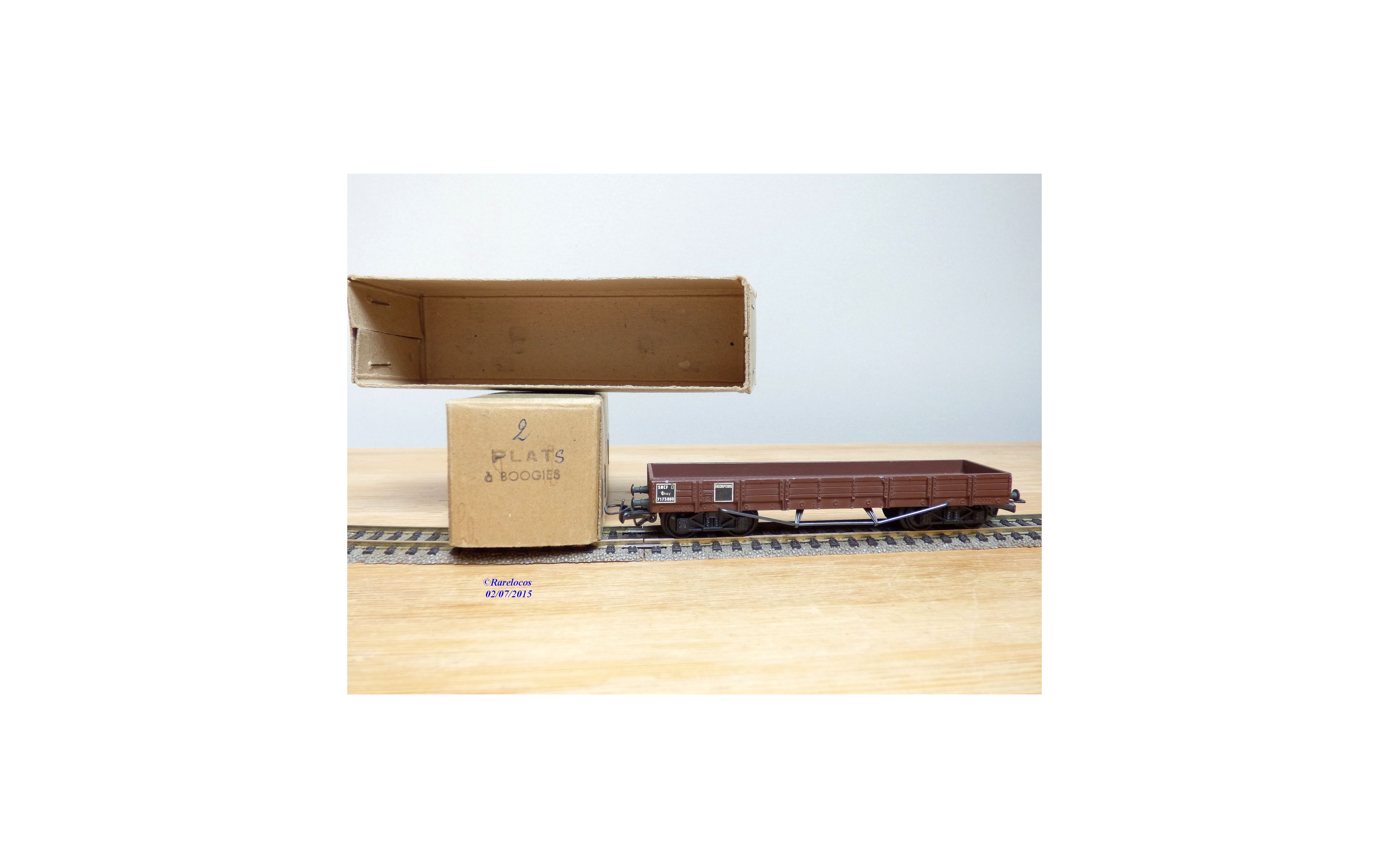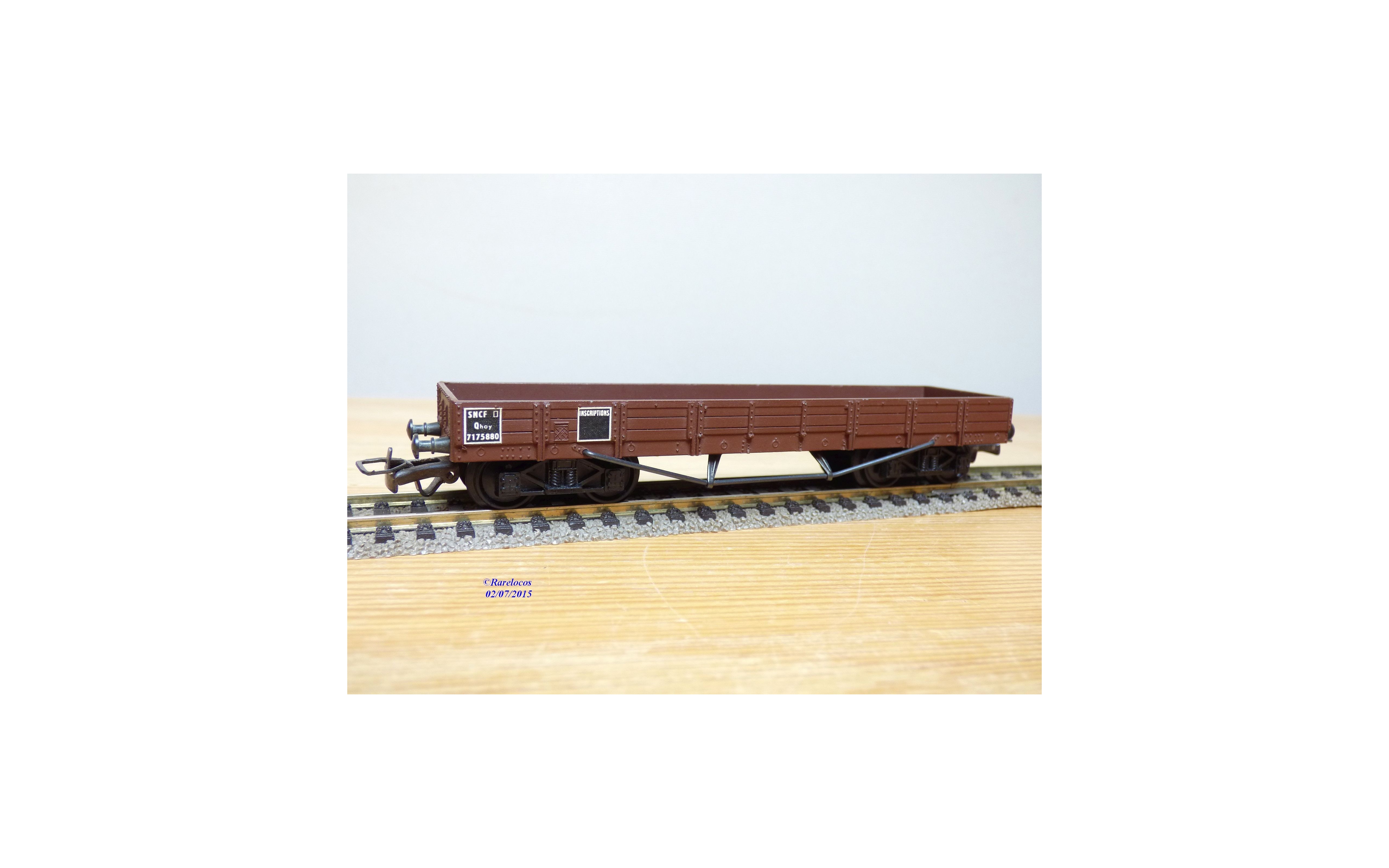 Wagon plat à 2 bogies type Qhoy des chemins de fer français ( SNCF ), tout en métal, livrée marron, immatriculation : Qhoy 7175880, pas de boîte d'origine.