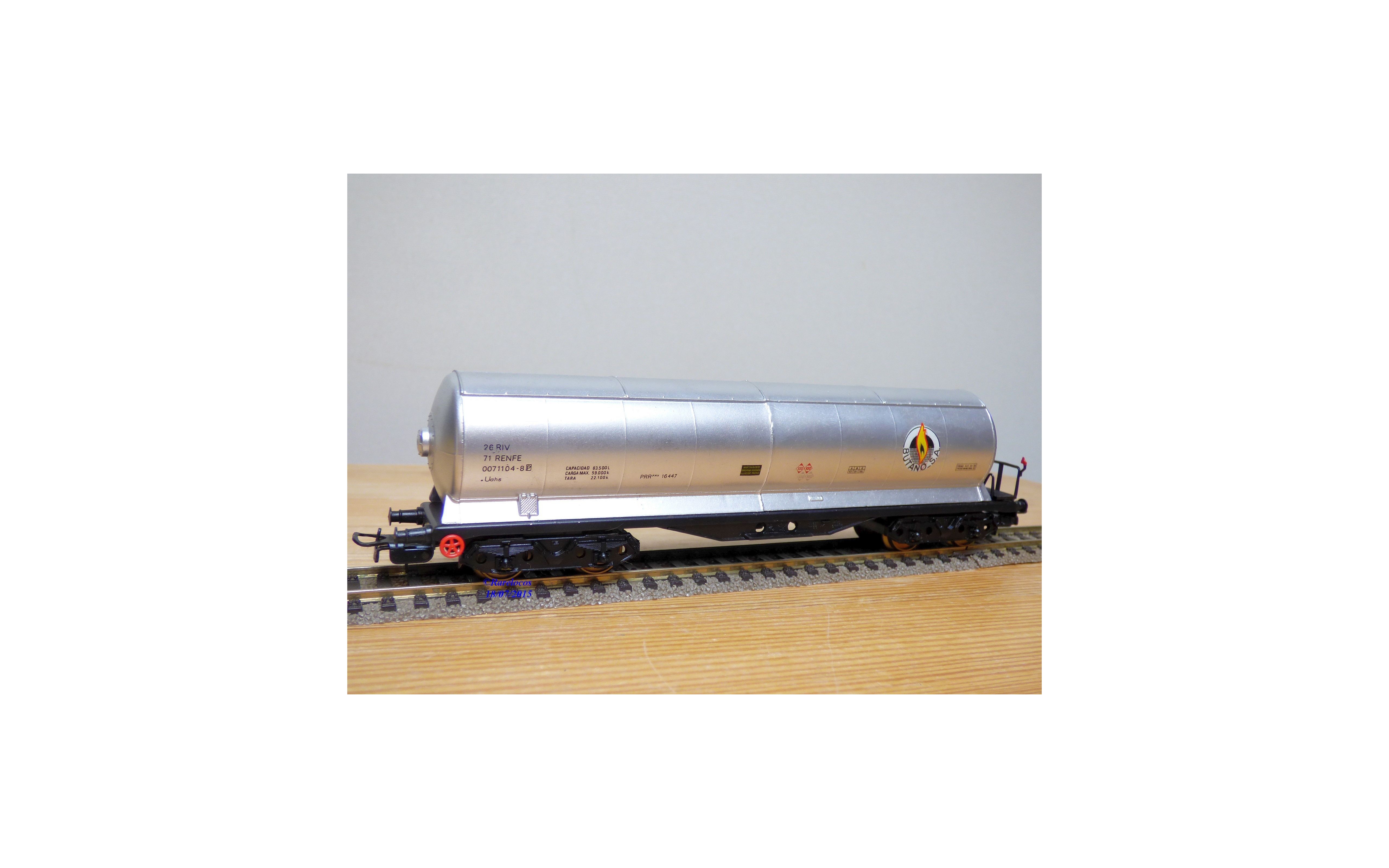 Wagon citerne à 2 bogies pour le transport de gaz liquéfié ( butane) des chemins de fer espagnols ( RENFE), livrée grise avec marquages BUTANOS SA, boîte d'origine en bon état.