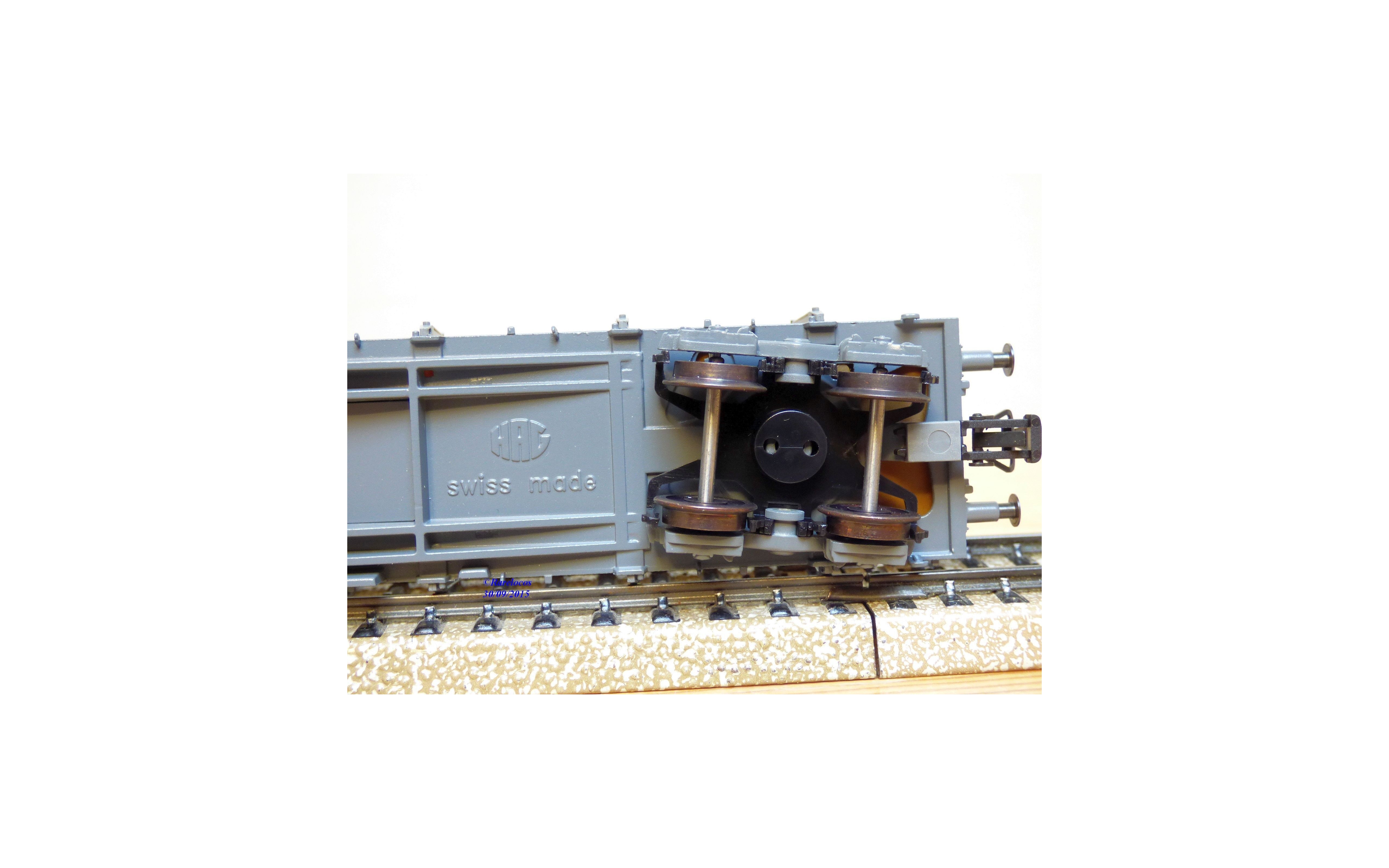 Wagon plat à ranchers à 2 bogies type Rs des chemins de fer suisses ( SBB/CFF/FFS) chargé de tuyaux, wagon en métal, tuyaux en plastique, livrée grise, attelages à élongation, immatriculation : 11 85 390 0 295-6, notice présente, boîte d'origine en état neuf.