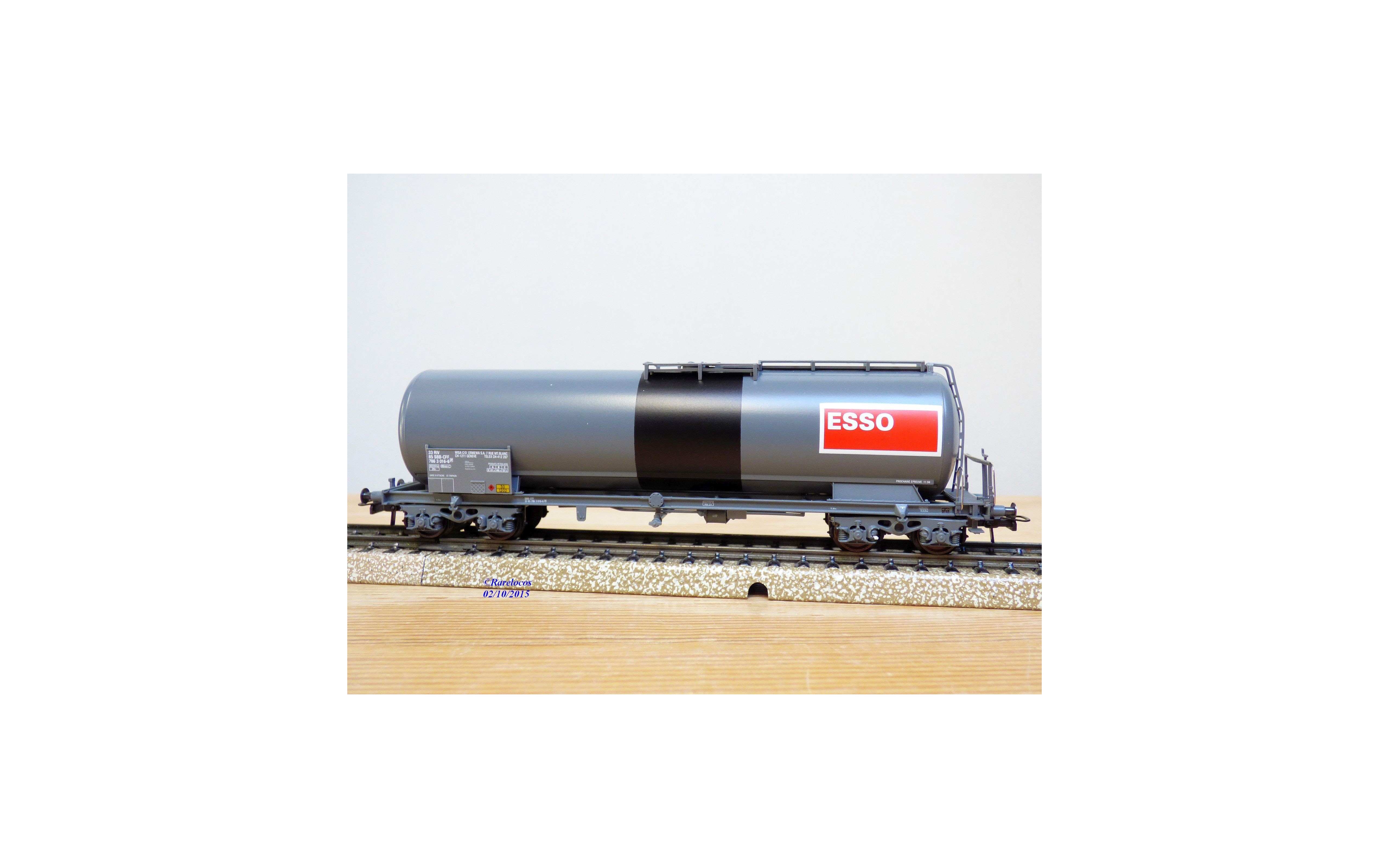 Wagon citerne à 2 bogies type Uahs des chemins de fer suisses ( SBB/CFF/FFS) , chassis et mains montoires en métal, citerne en plastique, livrée grise avec marquages ESSO, attelages à élongation, immatriculation : 33 85 786 3 016-6, notice présente, boîte d'origine en état neuf.